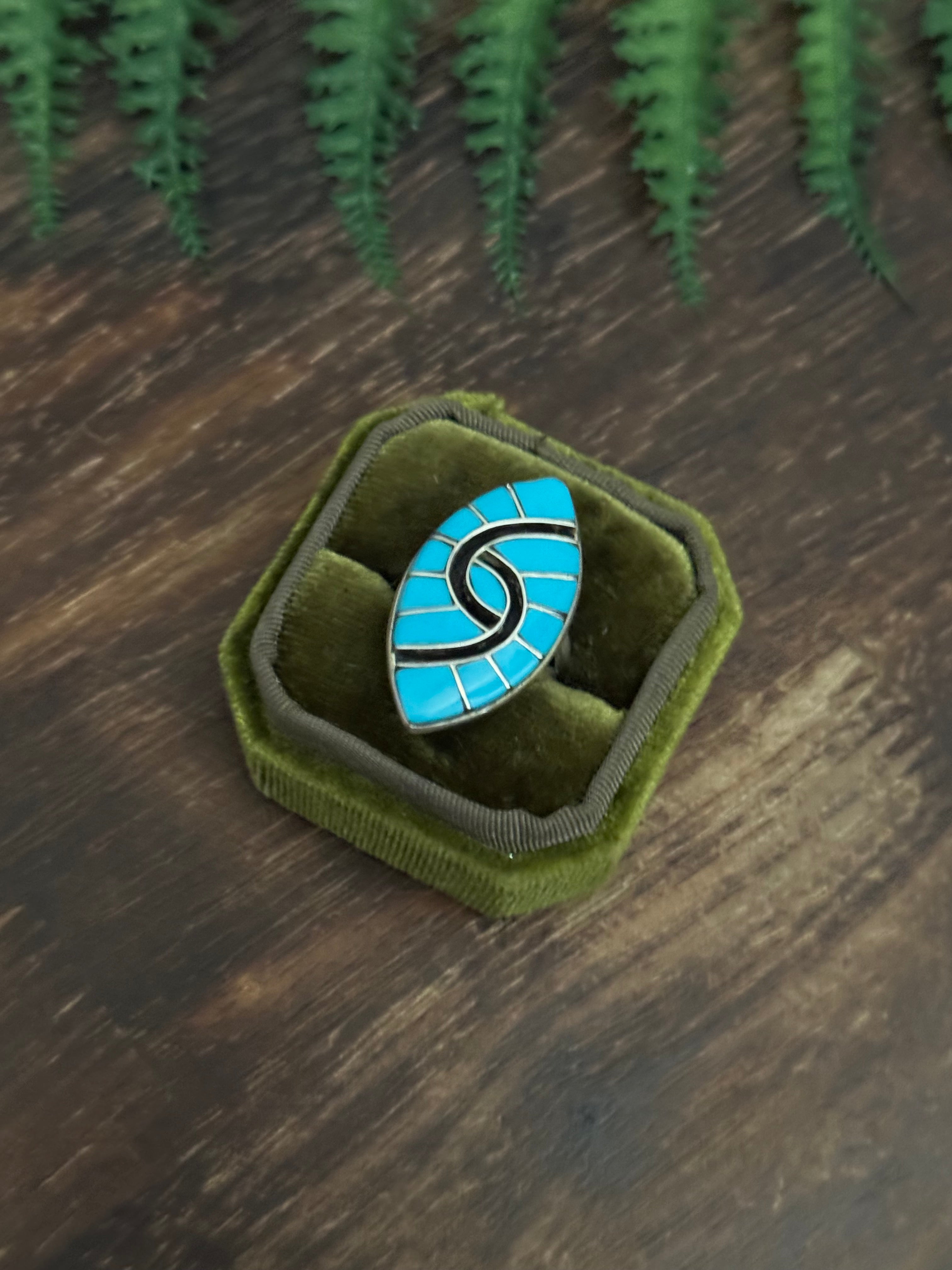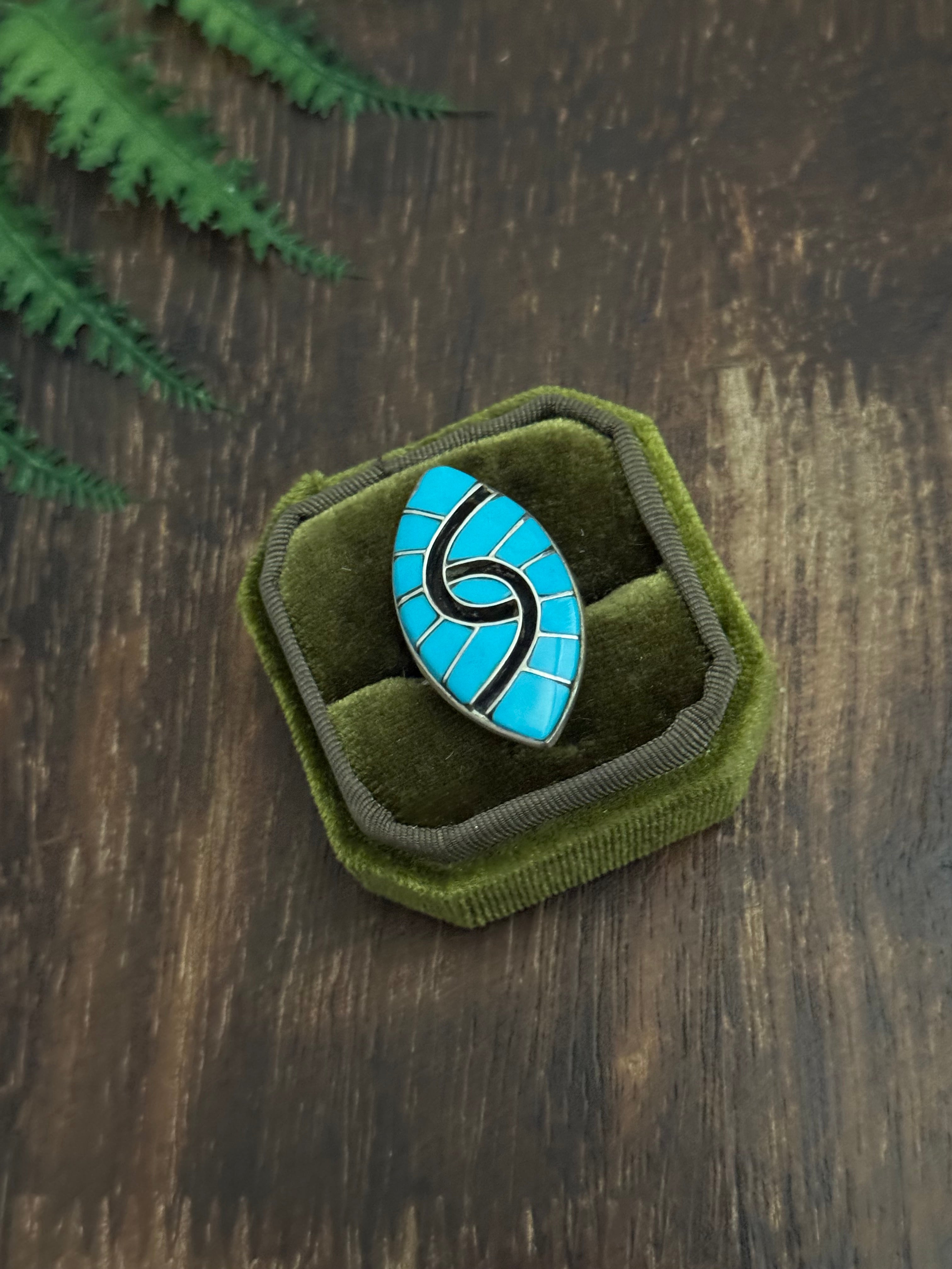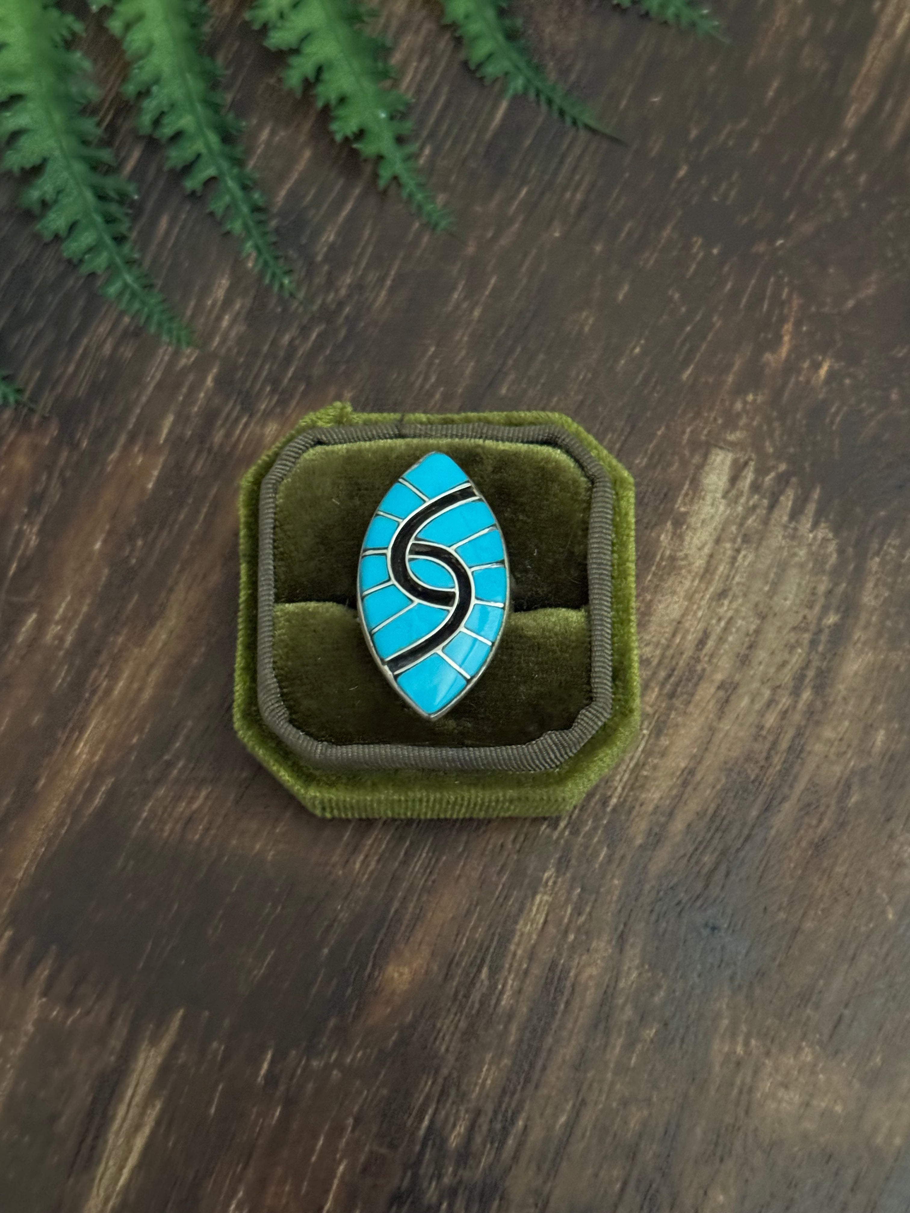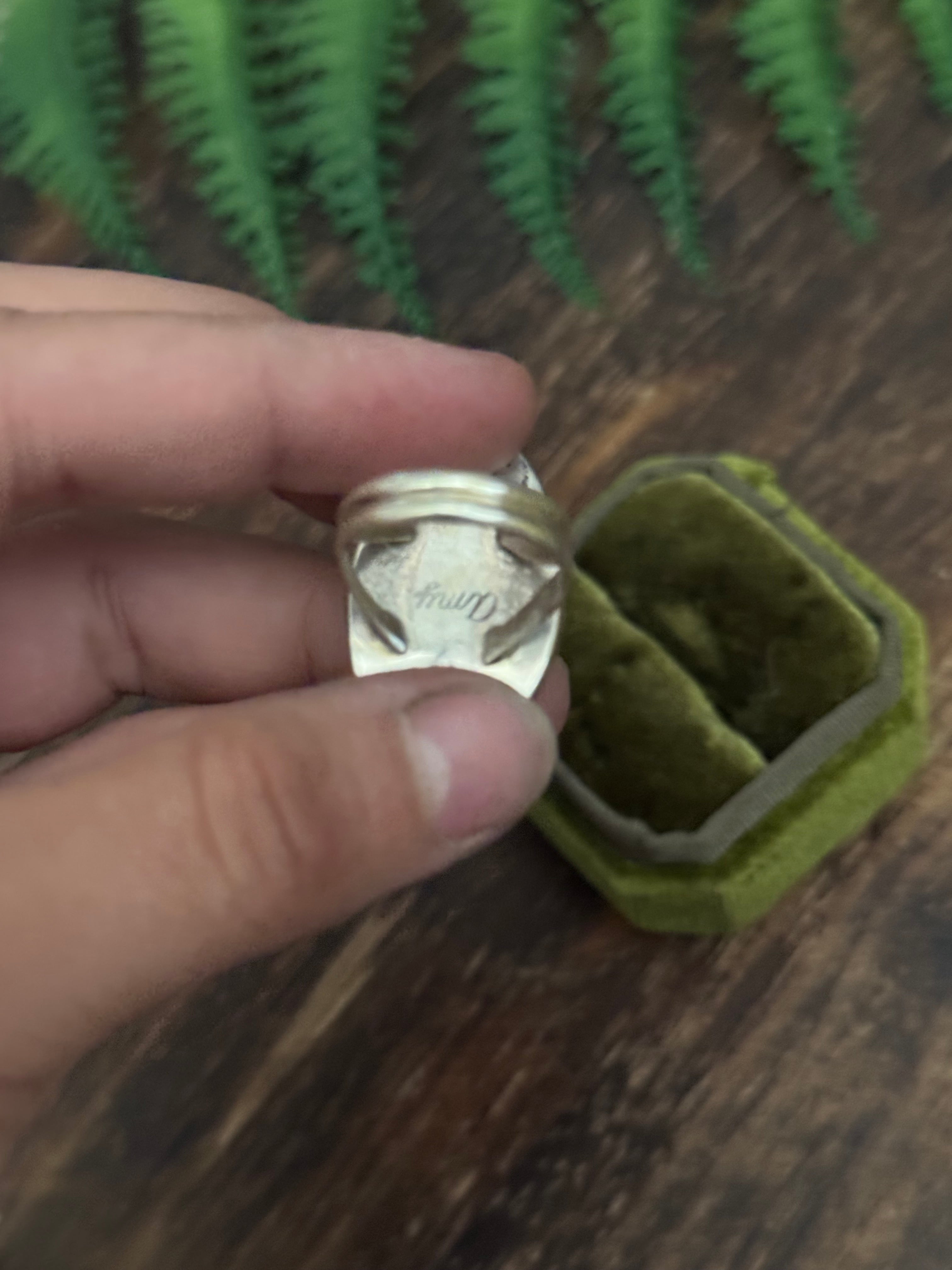 Amy Locaspino Multi Stone & Sterling Silver Inlay Ring Size 6.5. It measures 1 3/8 inches long and 3/4 of an inch wide. Signed by the artist and stamped sterling silver.