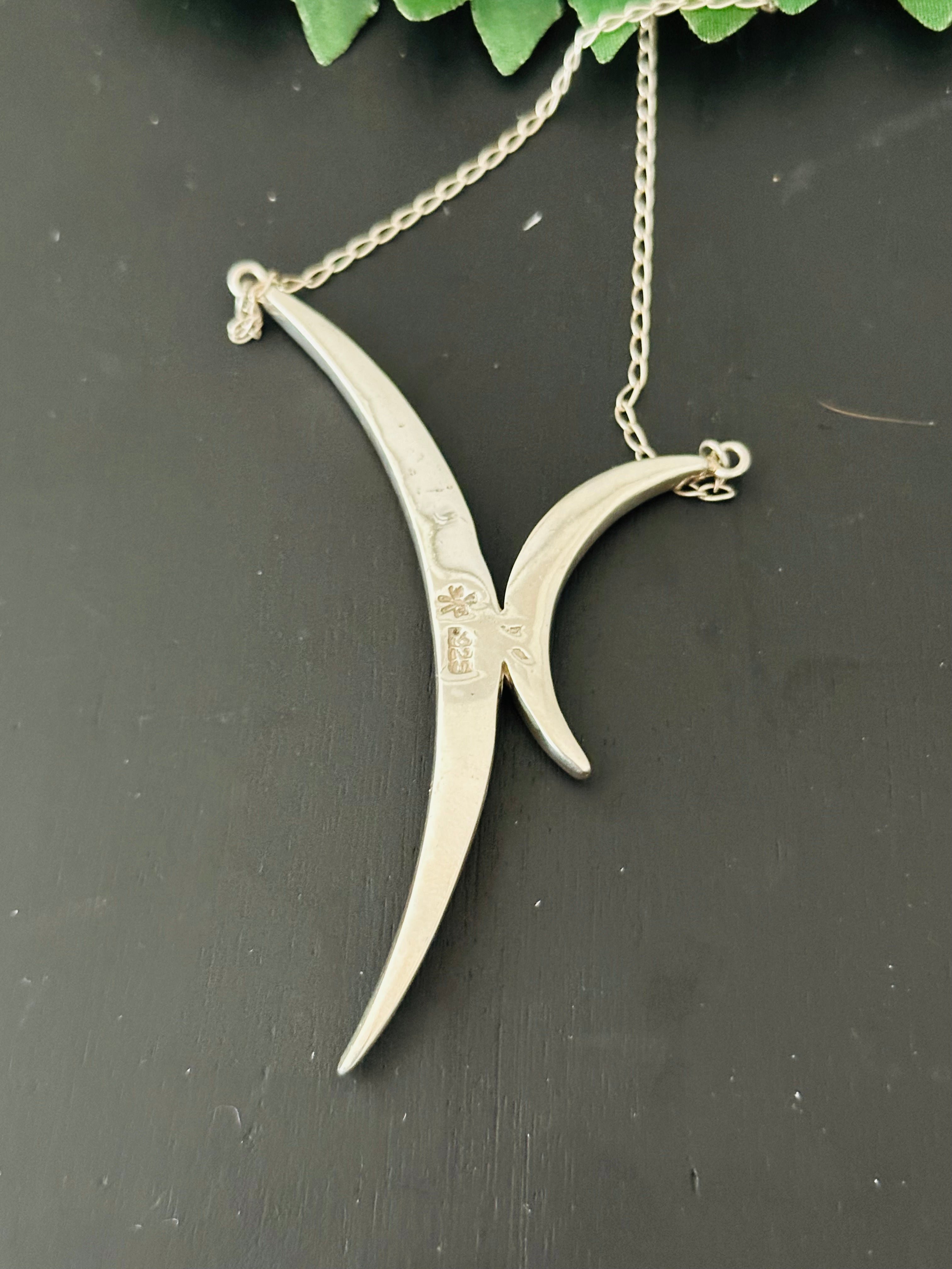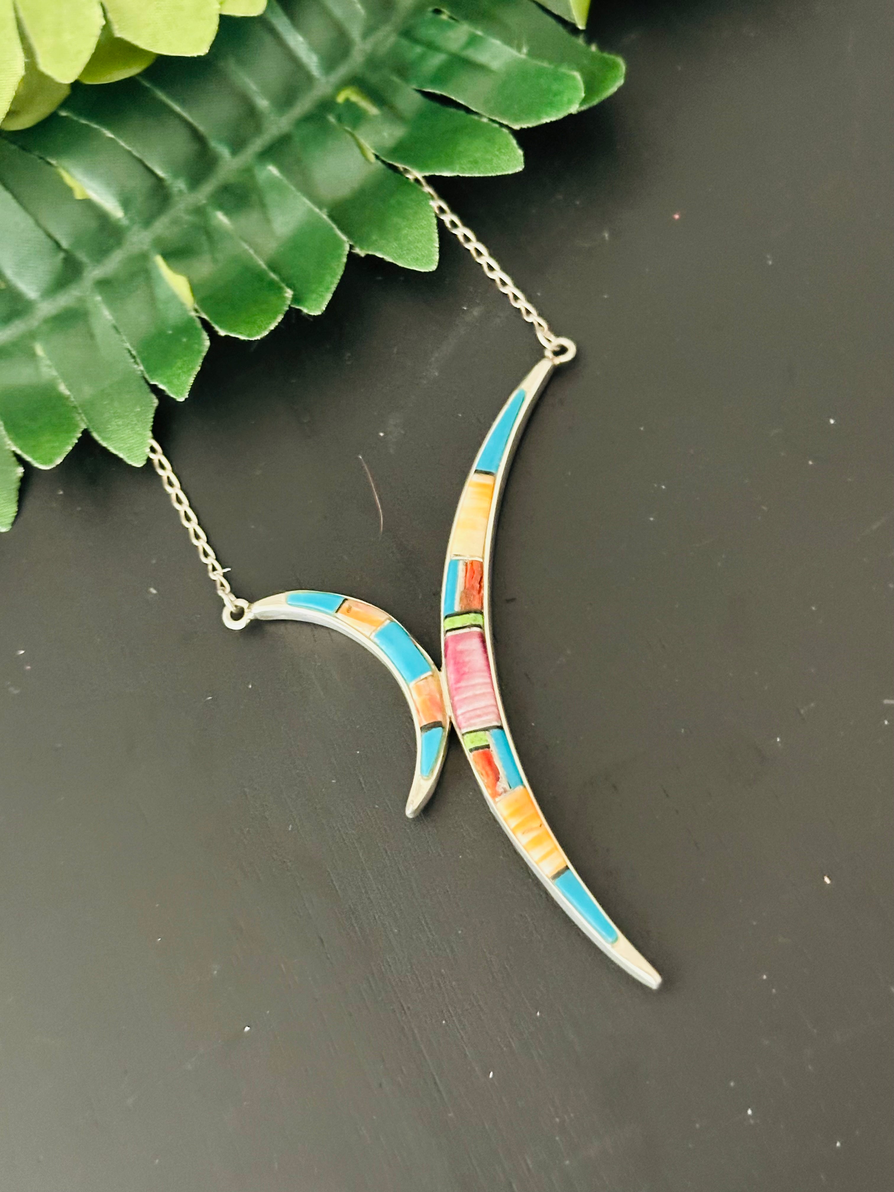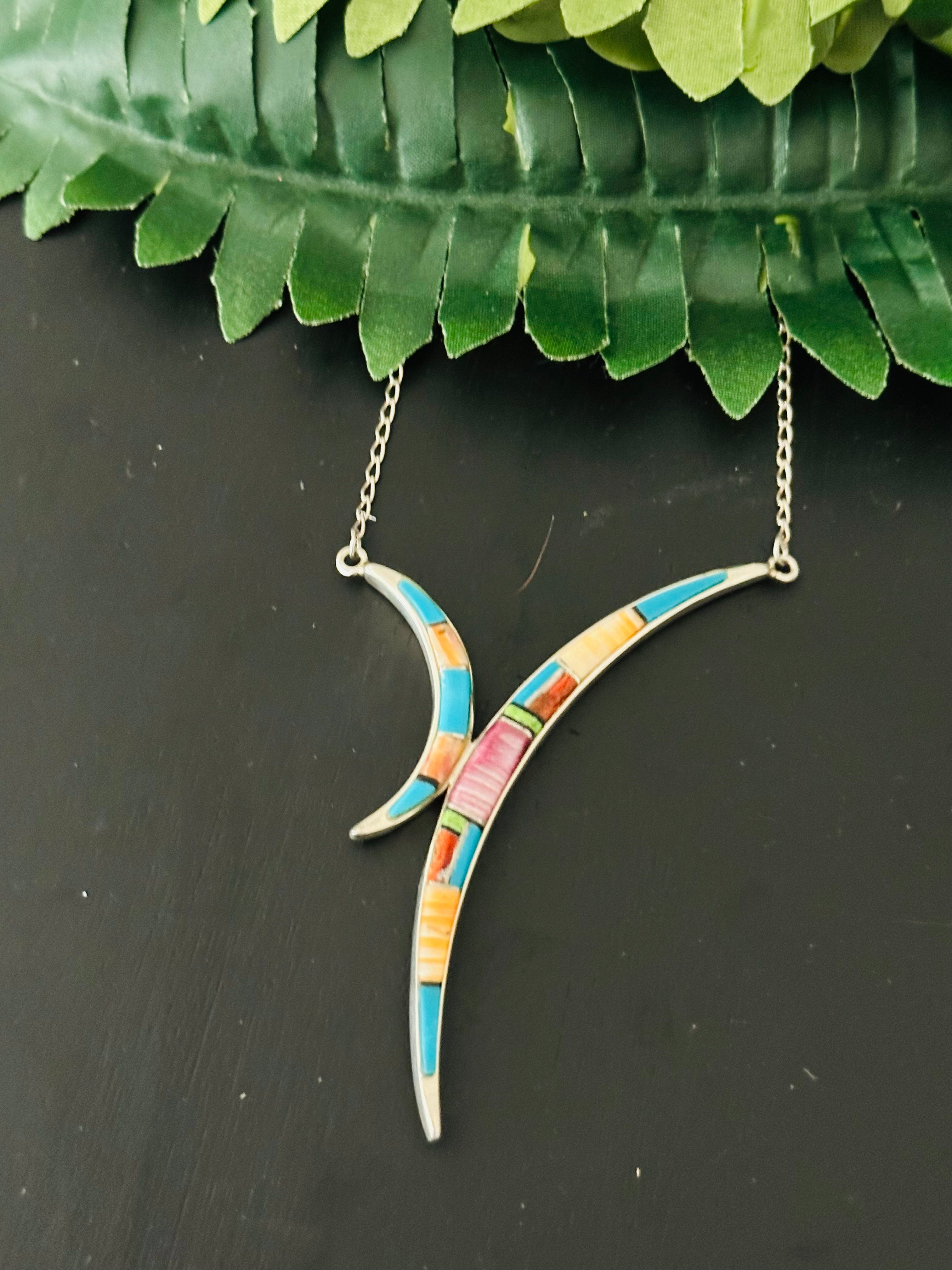 Navajo Made Multi Stone & Sterling Silver Inlay Necklace. It measures 22 inches long with hang while the chain by itself measures 16 inches long. Signed by the artist and stamped sterling silver.