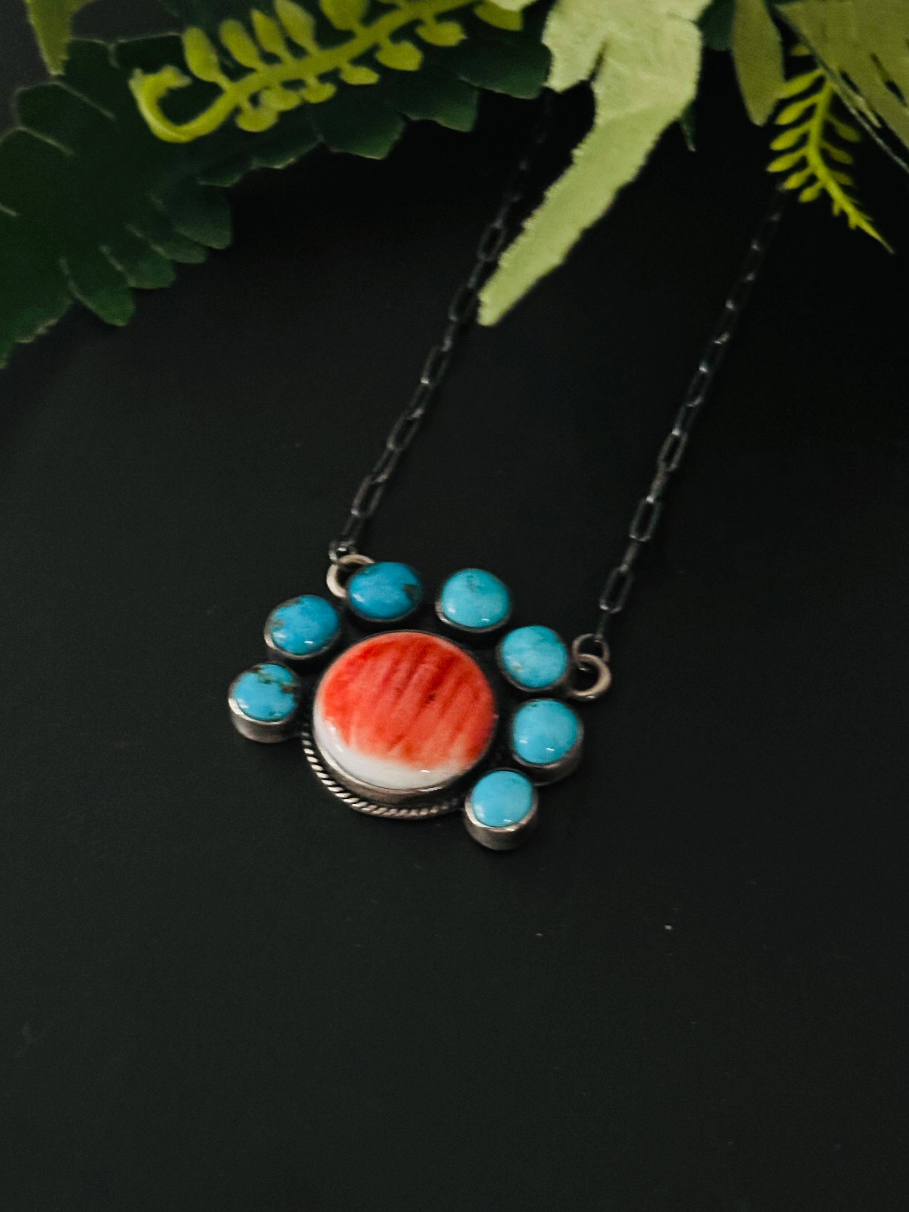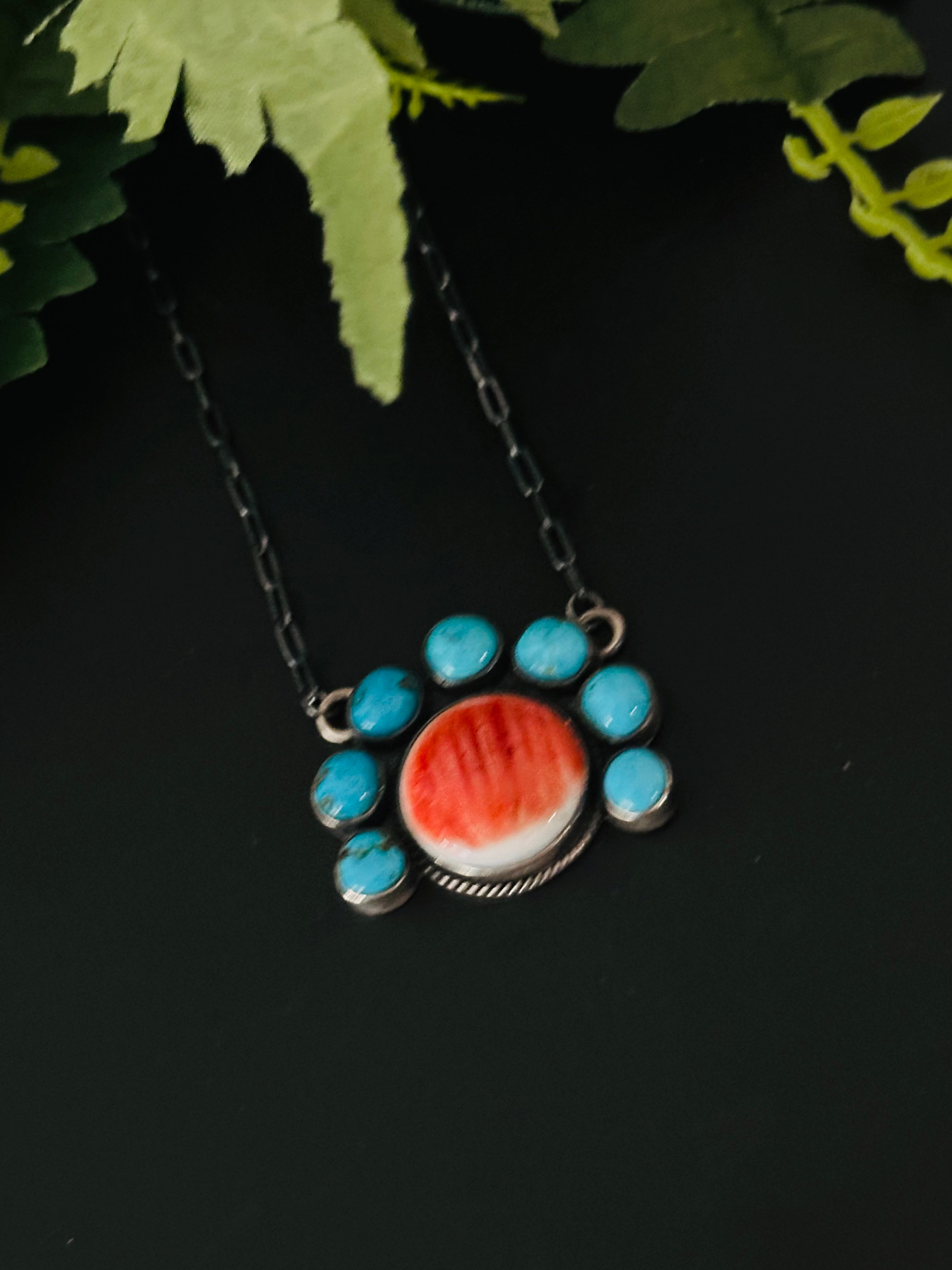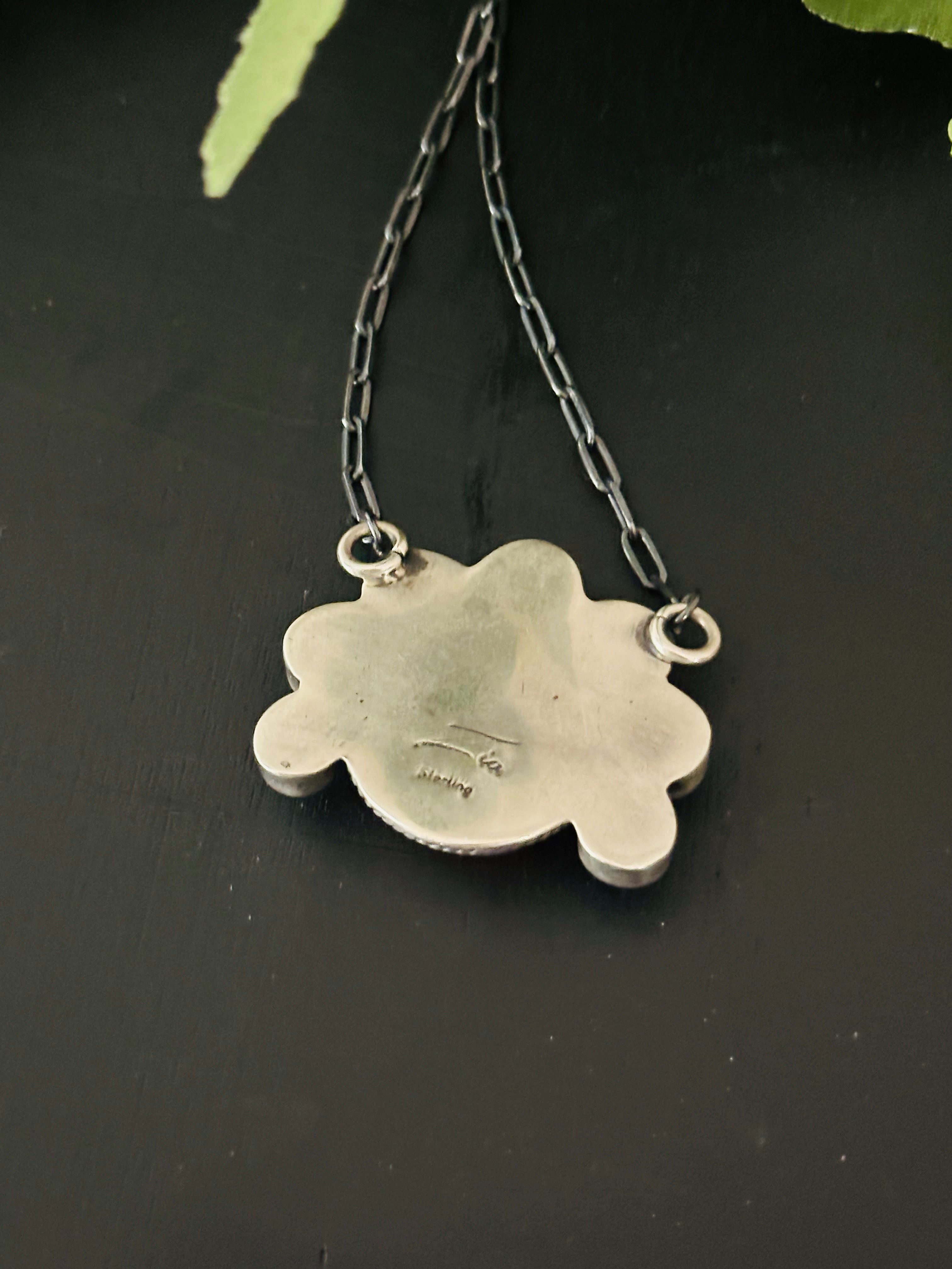 Navajo Made Multi Stone & Sterling Silver Necklace. It measures just over 21 inches long with hang while the chain by itself measures 19 inches long. Signed by the artist and stamped sterling silver.
