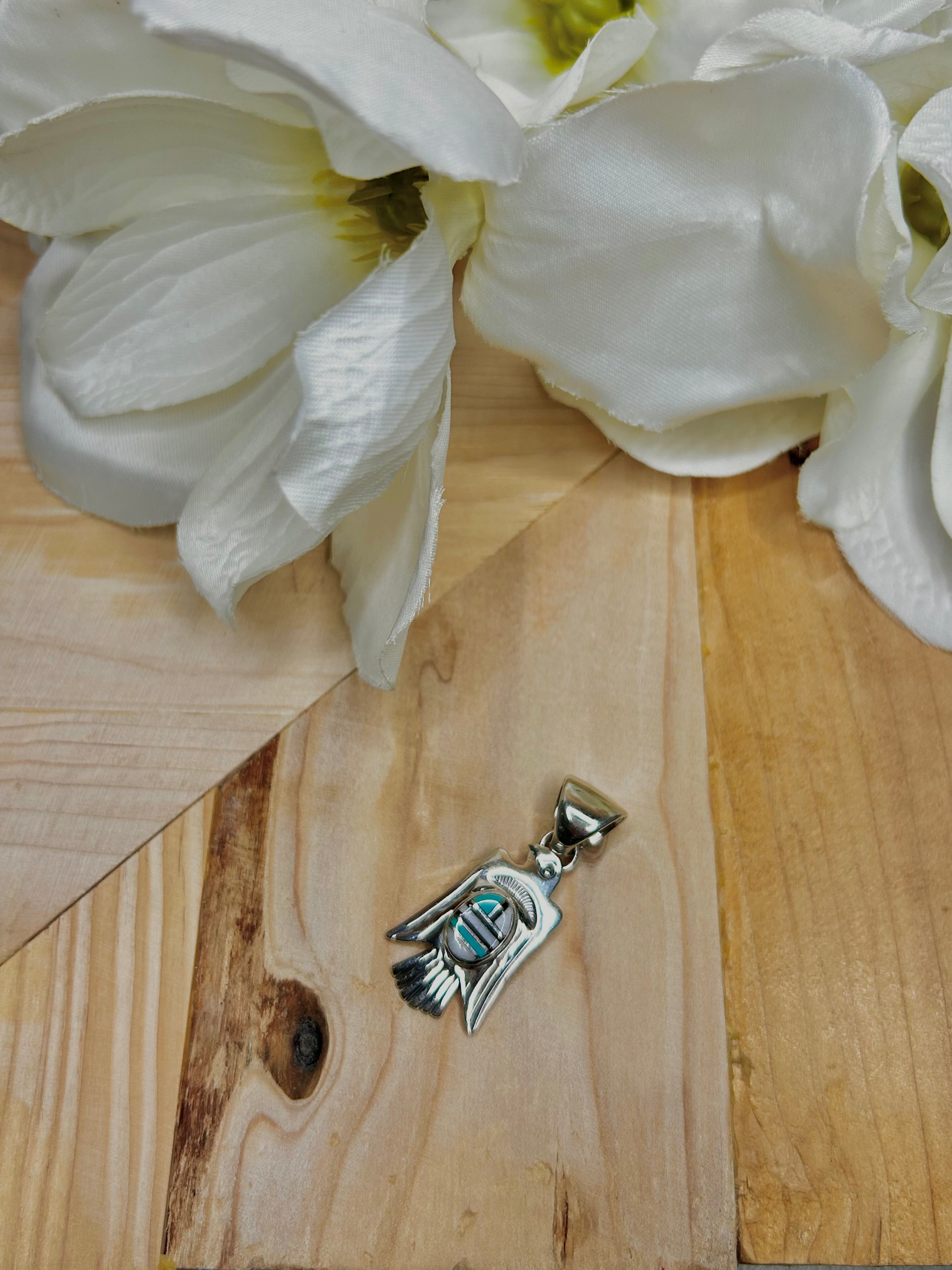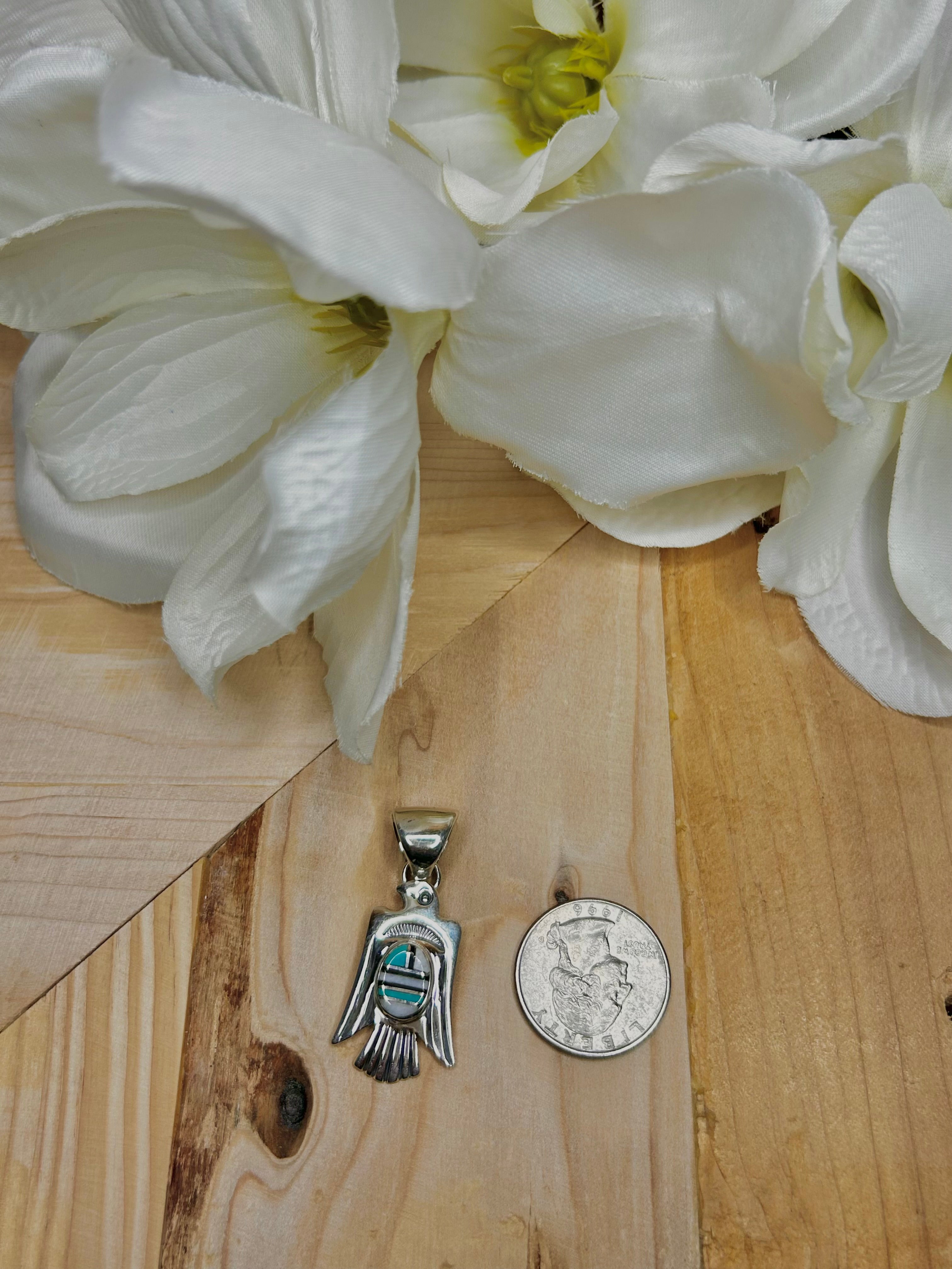 Navajo Made Multi Stone & Sterling Silver Pendant. It measures 1 3/4 inch long and 3/4 of an inch wide. Pendant Only. Signed by the artist and stamped sterling silver.
