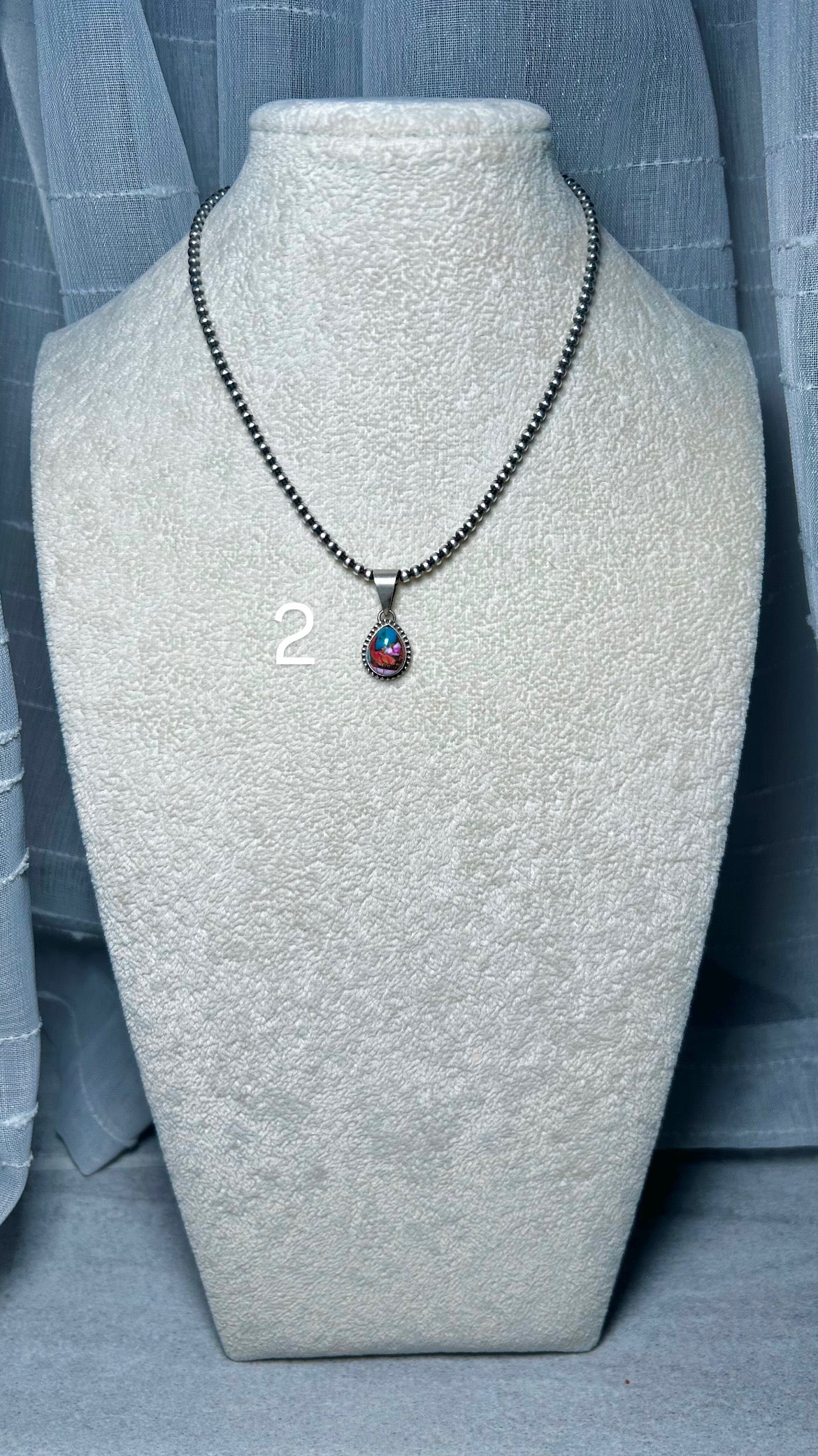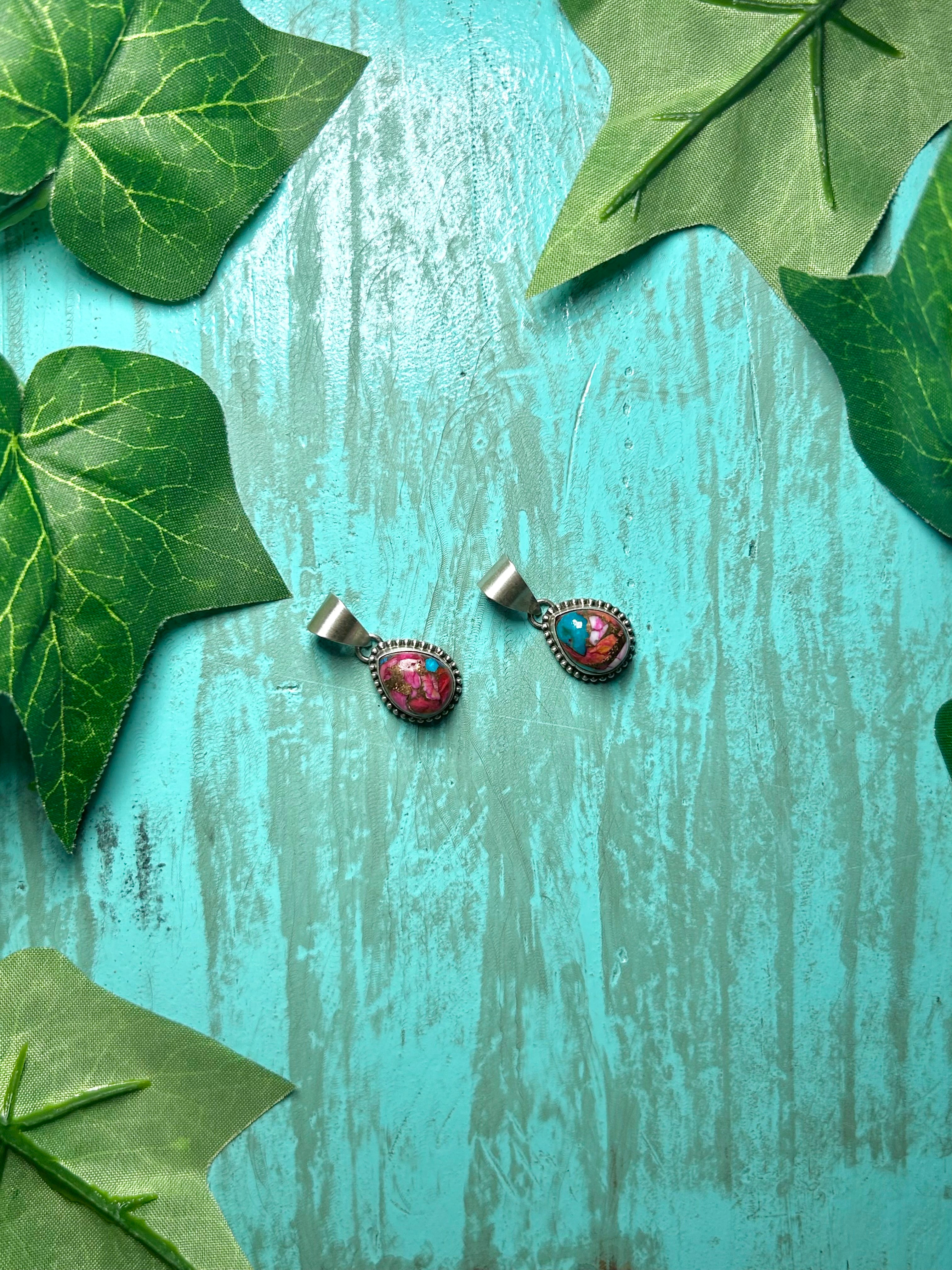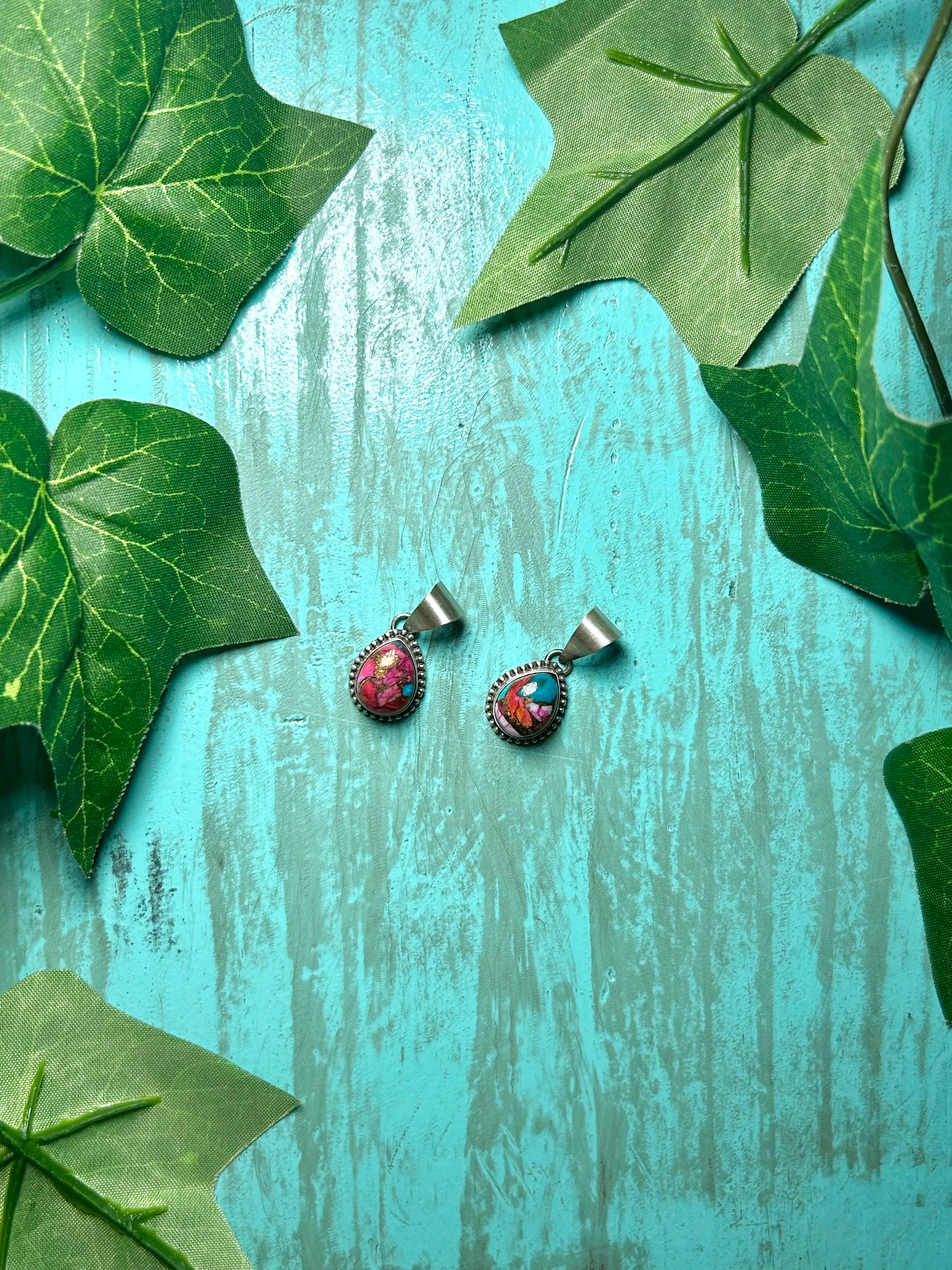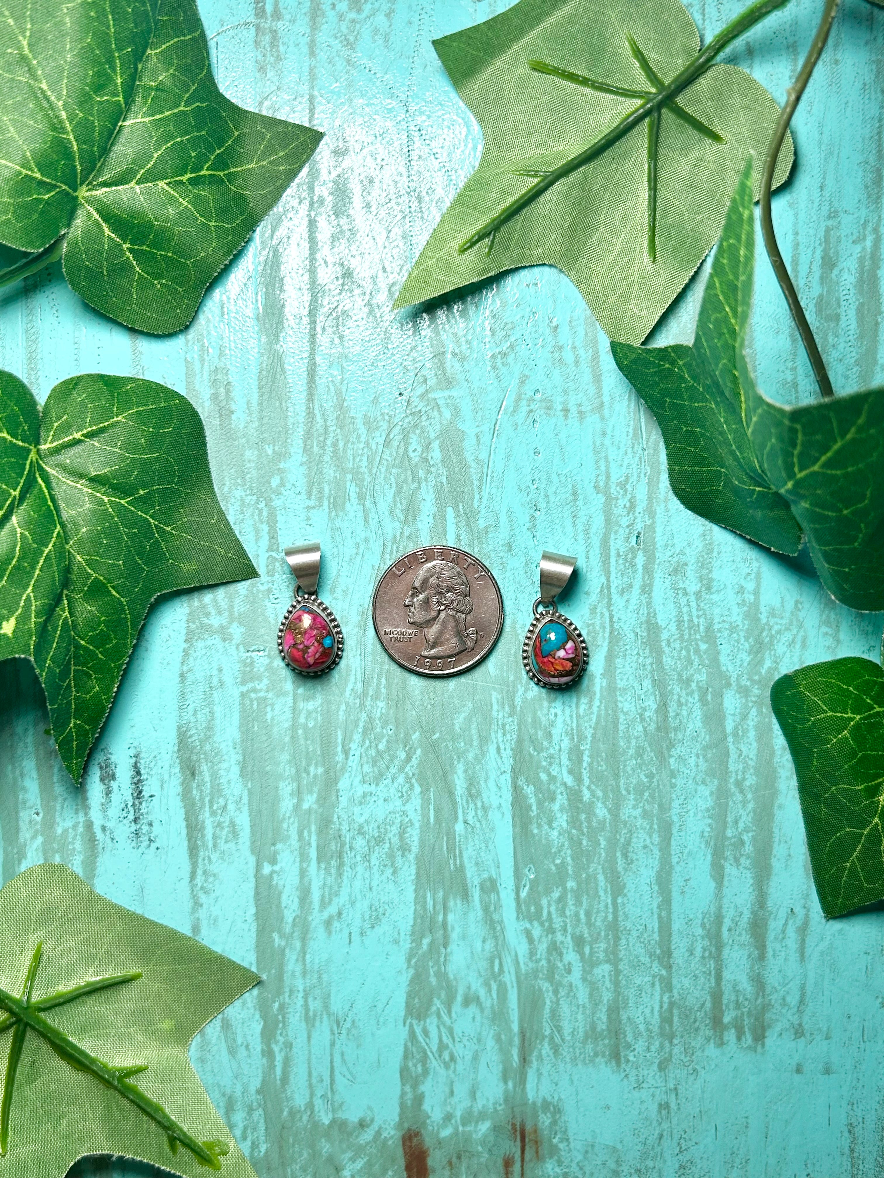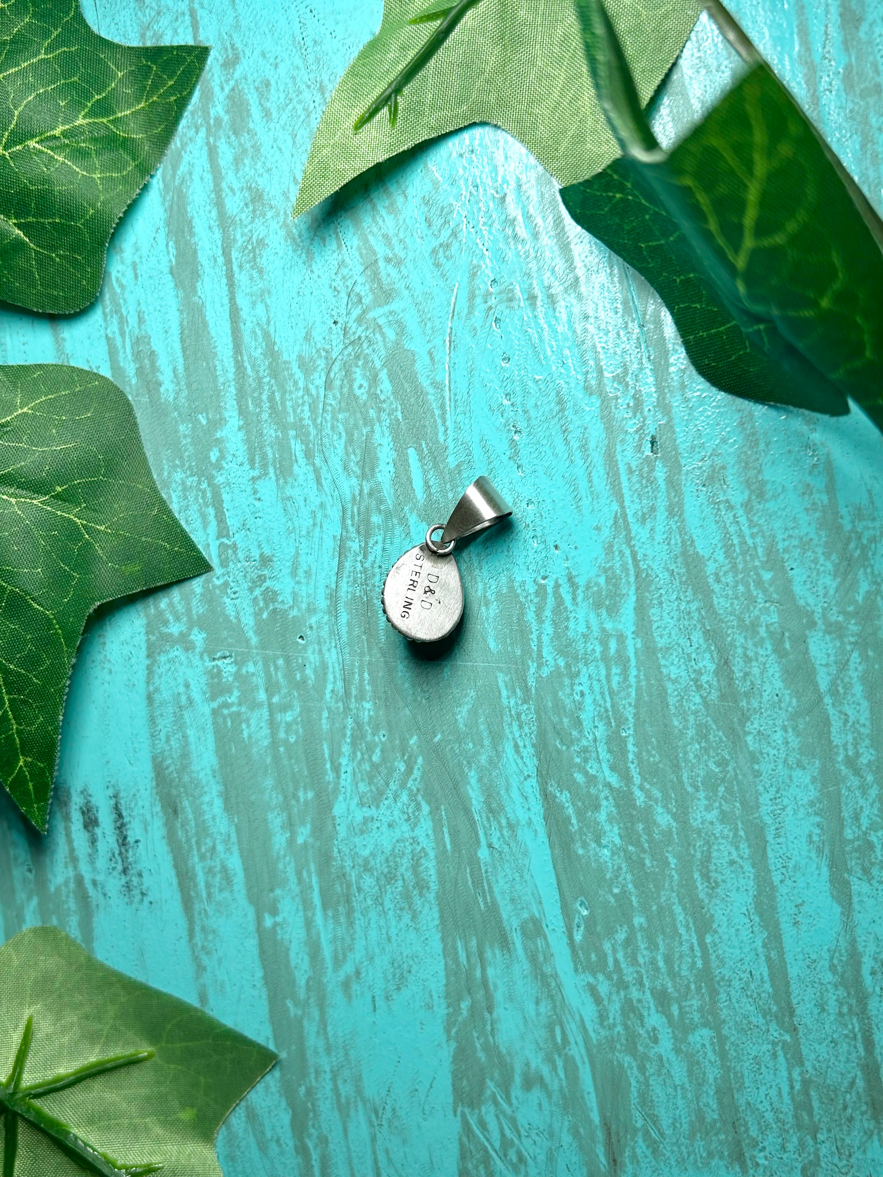 Navajo Made Mohave Turquoise & Sterling Silver Pendant. It measures 1 inch long and 1/2 of an inch wide. Signed by artist and stamped sterling silver. Pendant Only!!!
