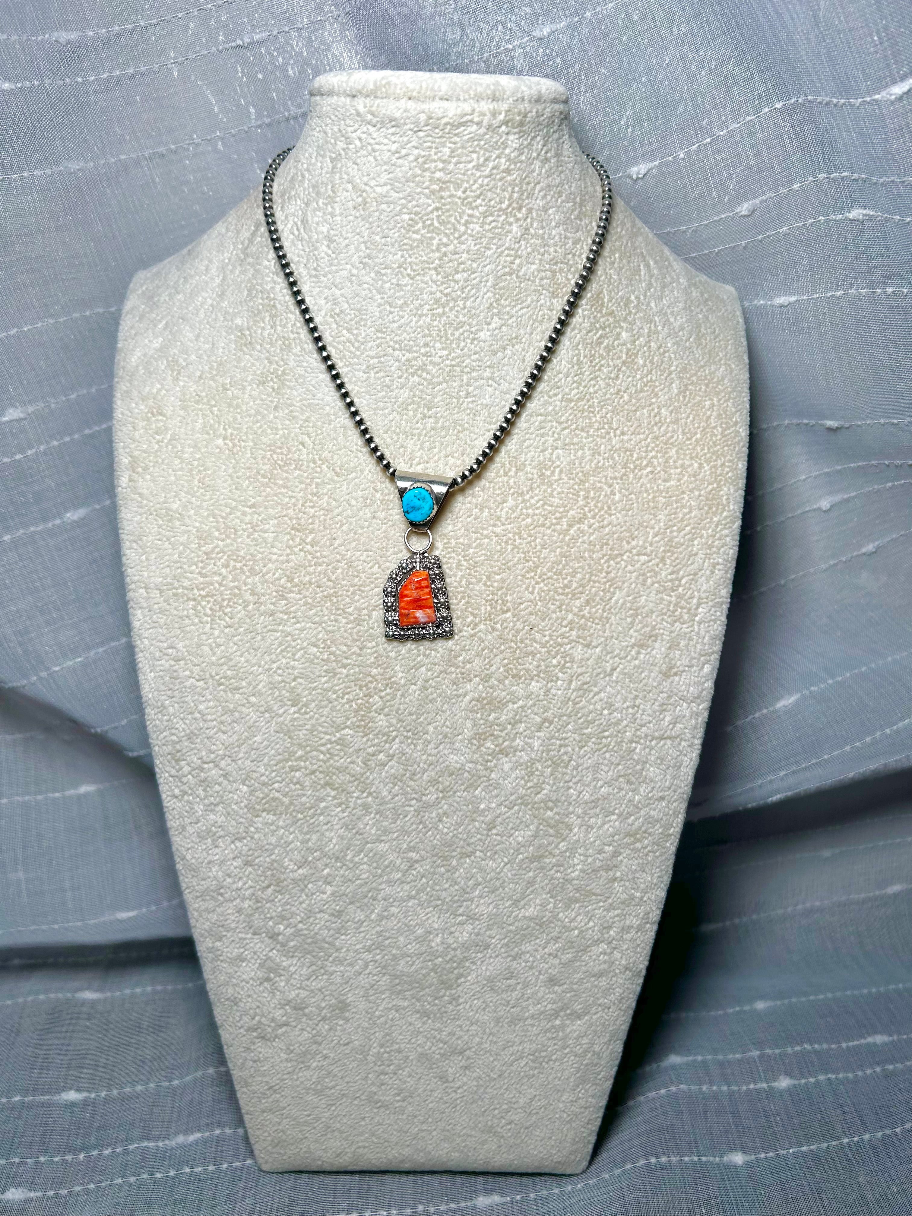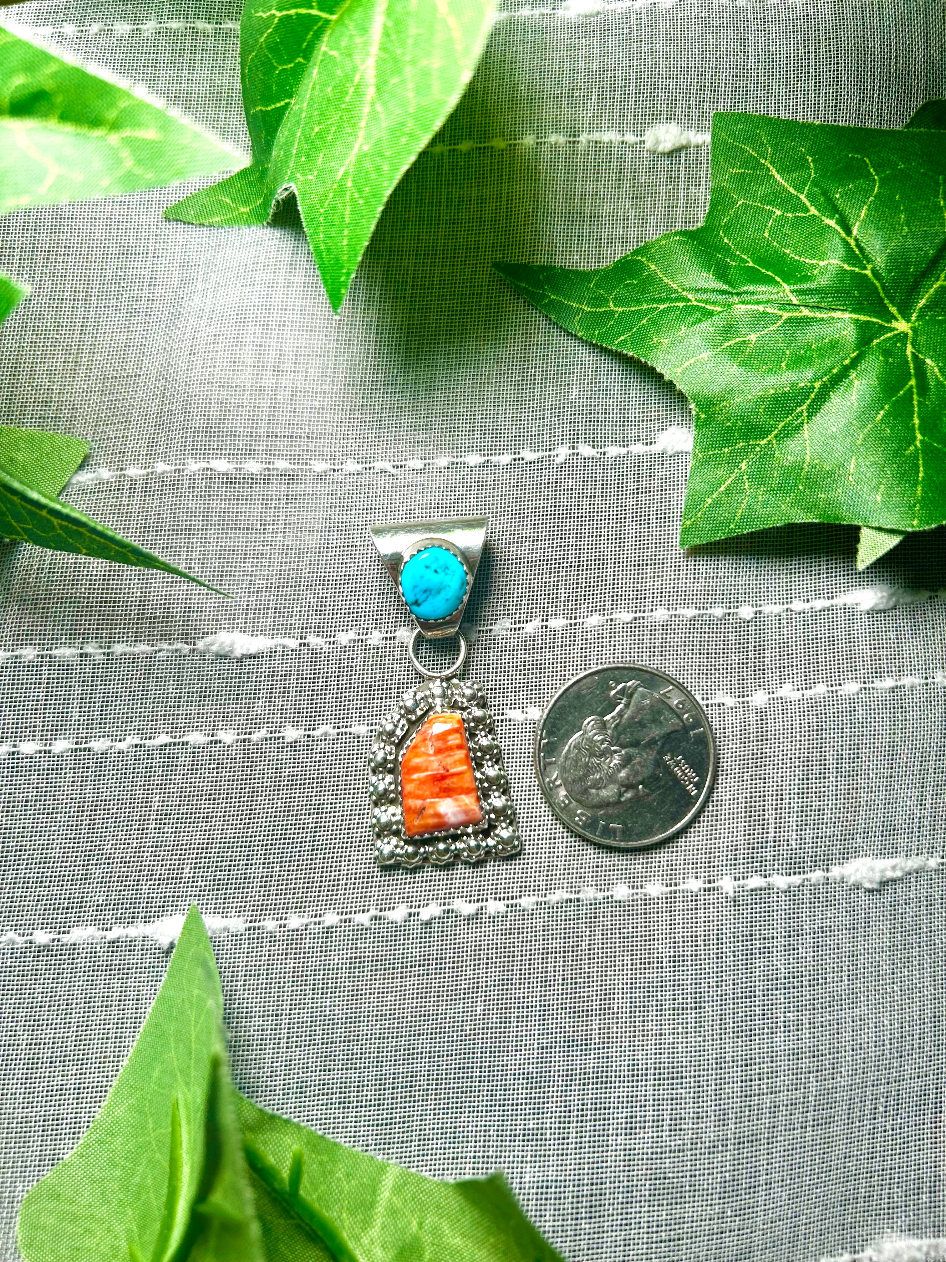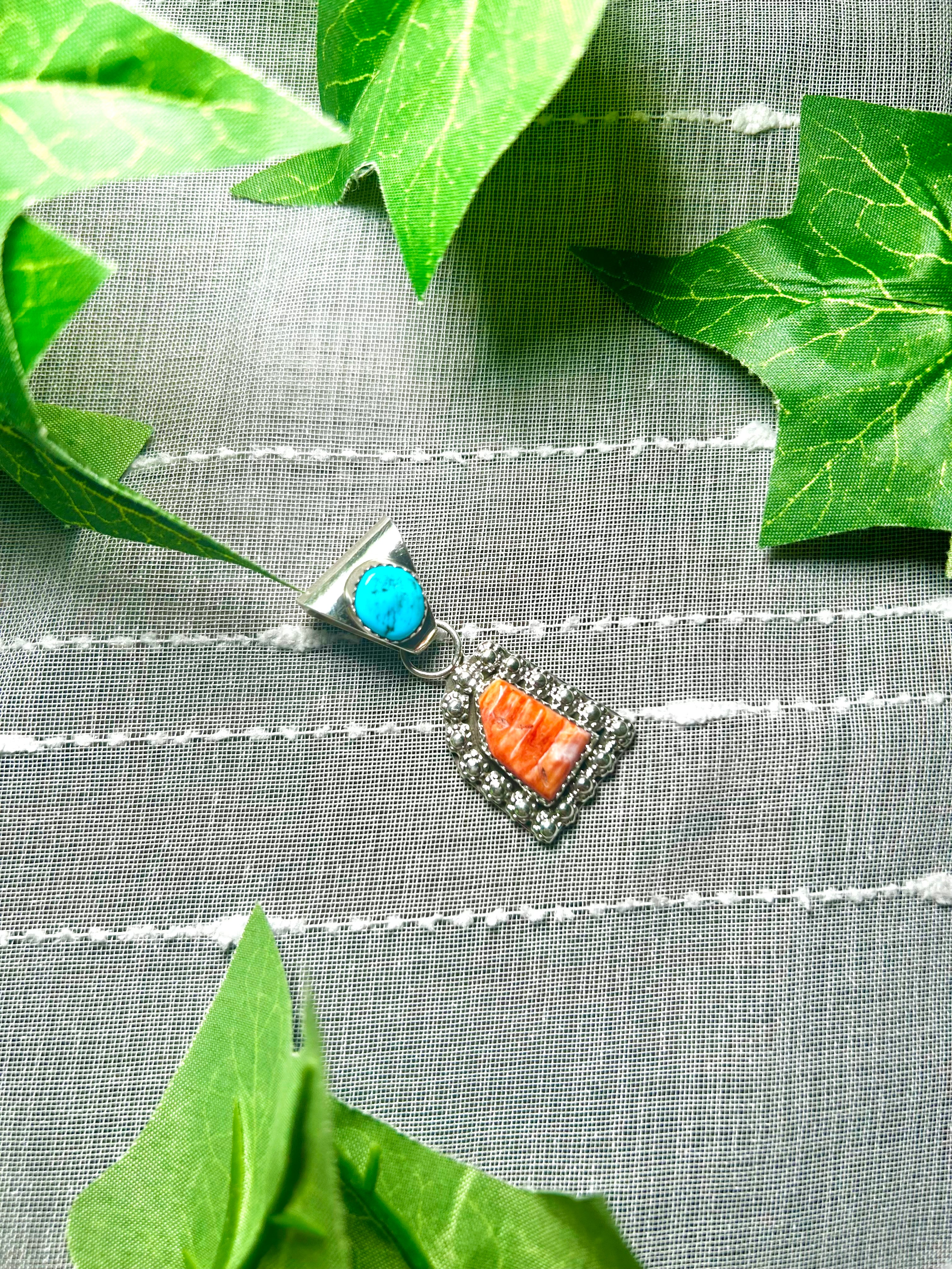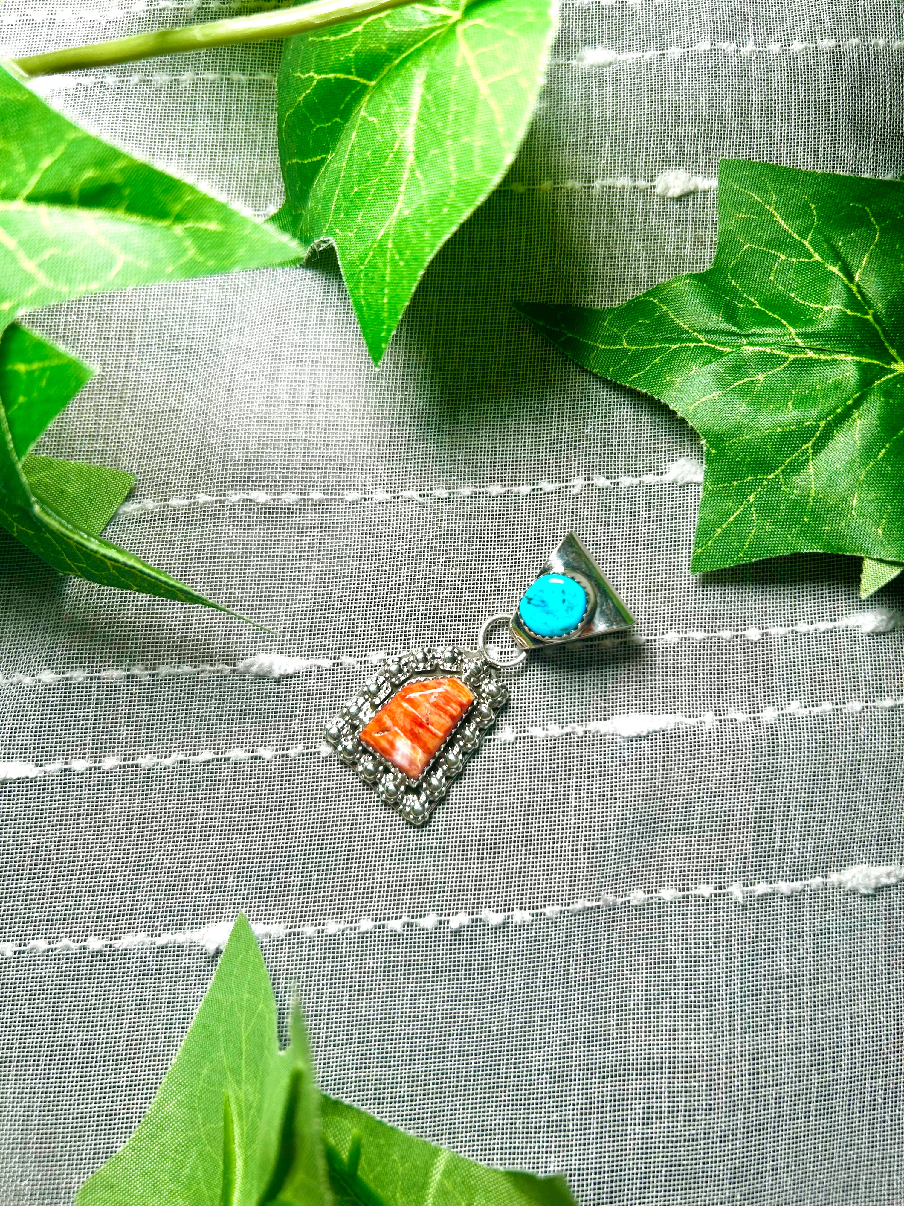 Navajo Made Multi Stone & Sterling Silver Pendant. It measures 1 3/4 inches long and 3/4 of an inch wide. Pendant Only! Signed by the artist and stamped sterling silver.