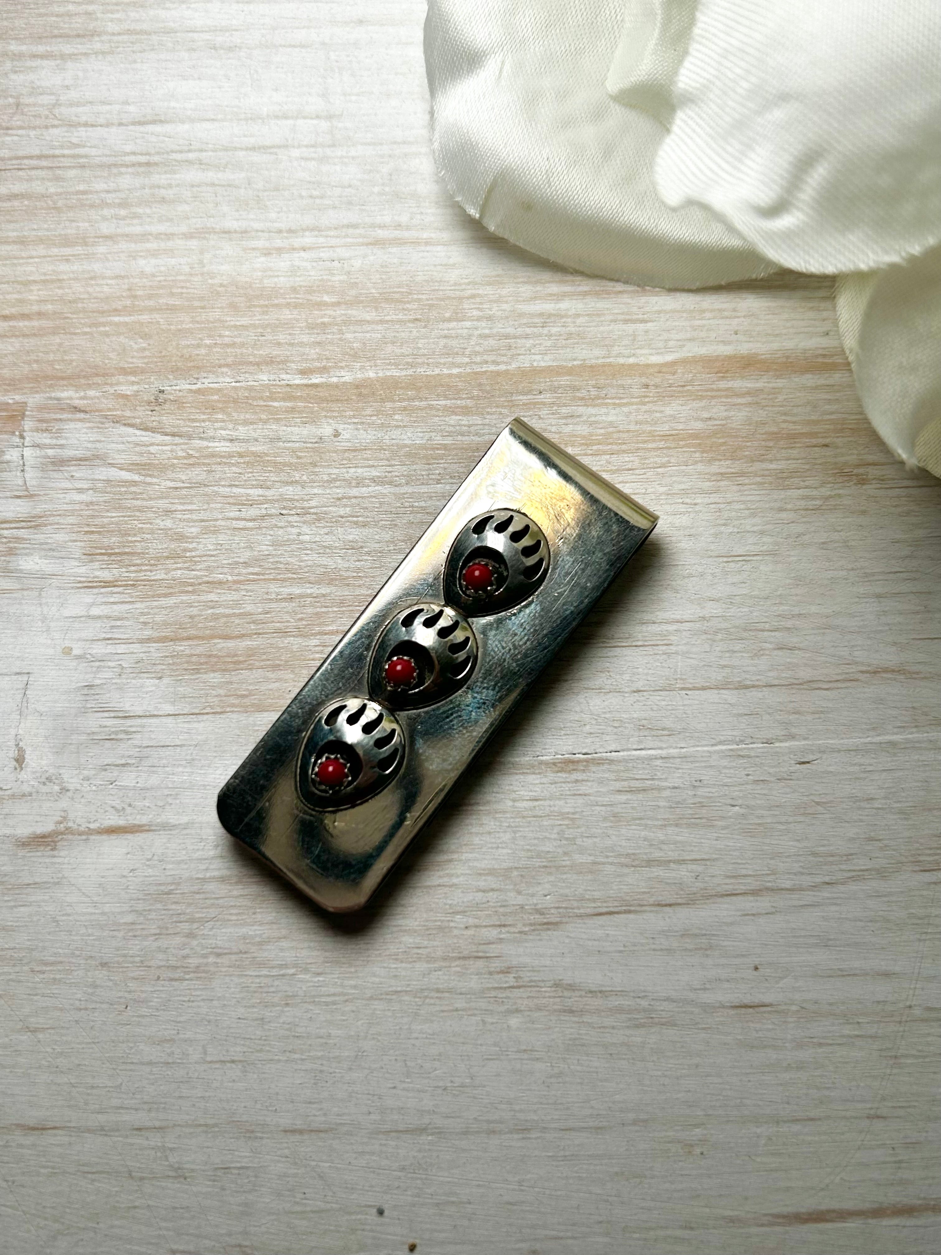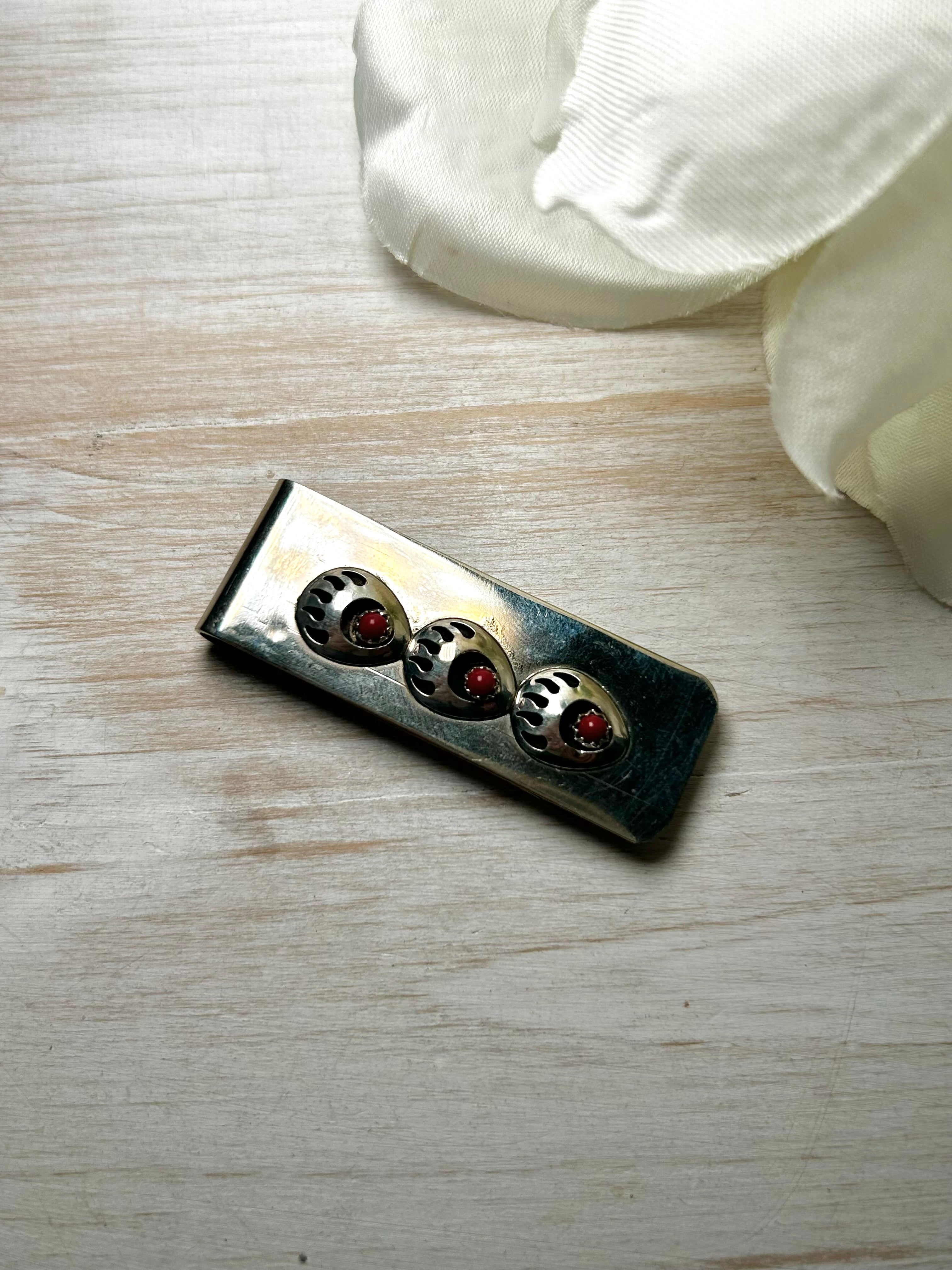 Navajo Made Coral & Sterling Silver Money Clip. It measures 7/8 of an inch long and 1 1/8 inches wide. Signed by the artist and stamped sterling silver.