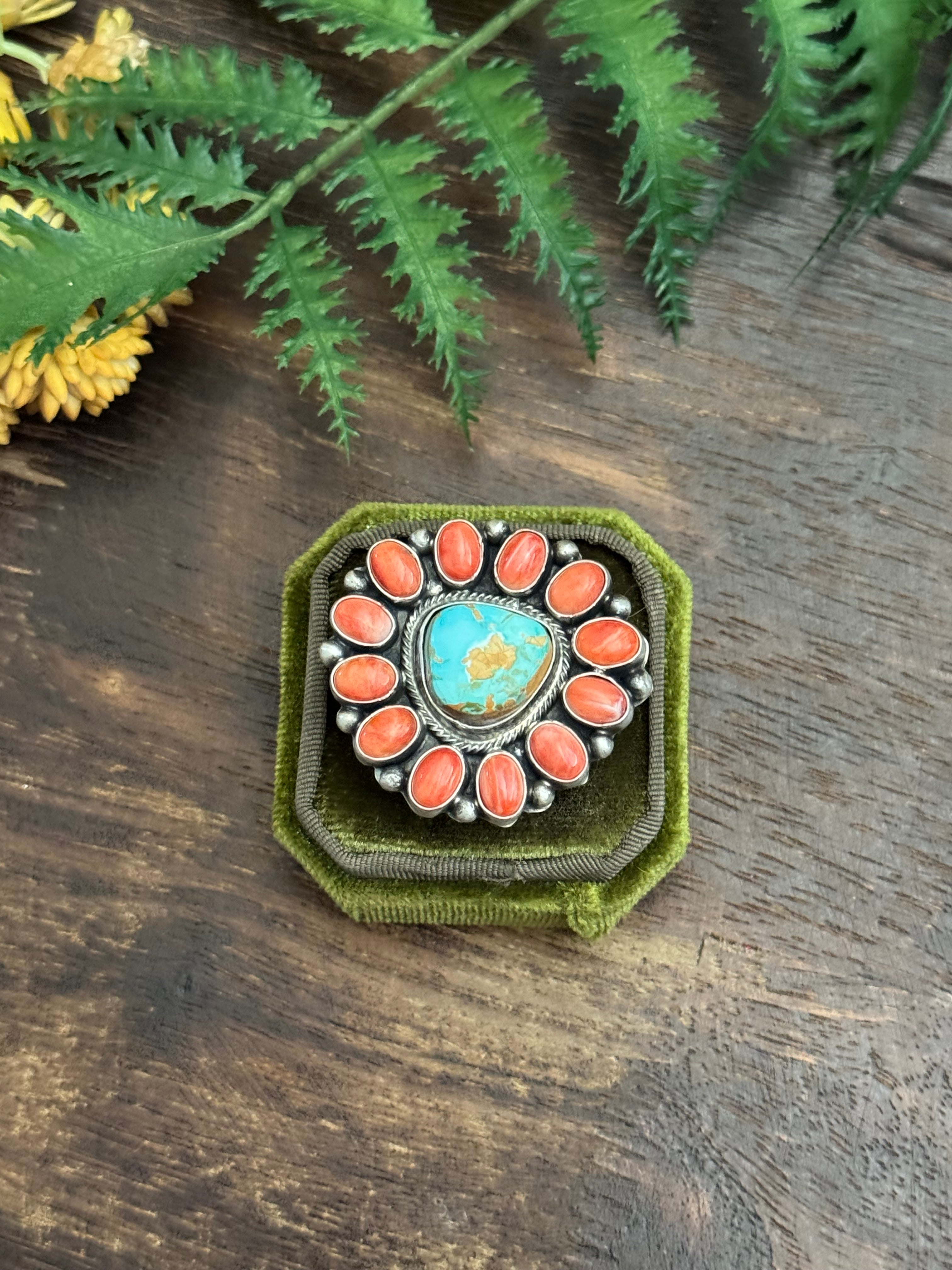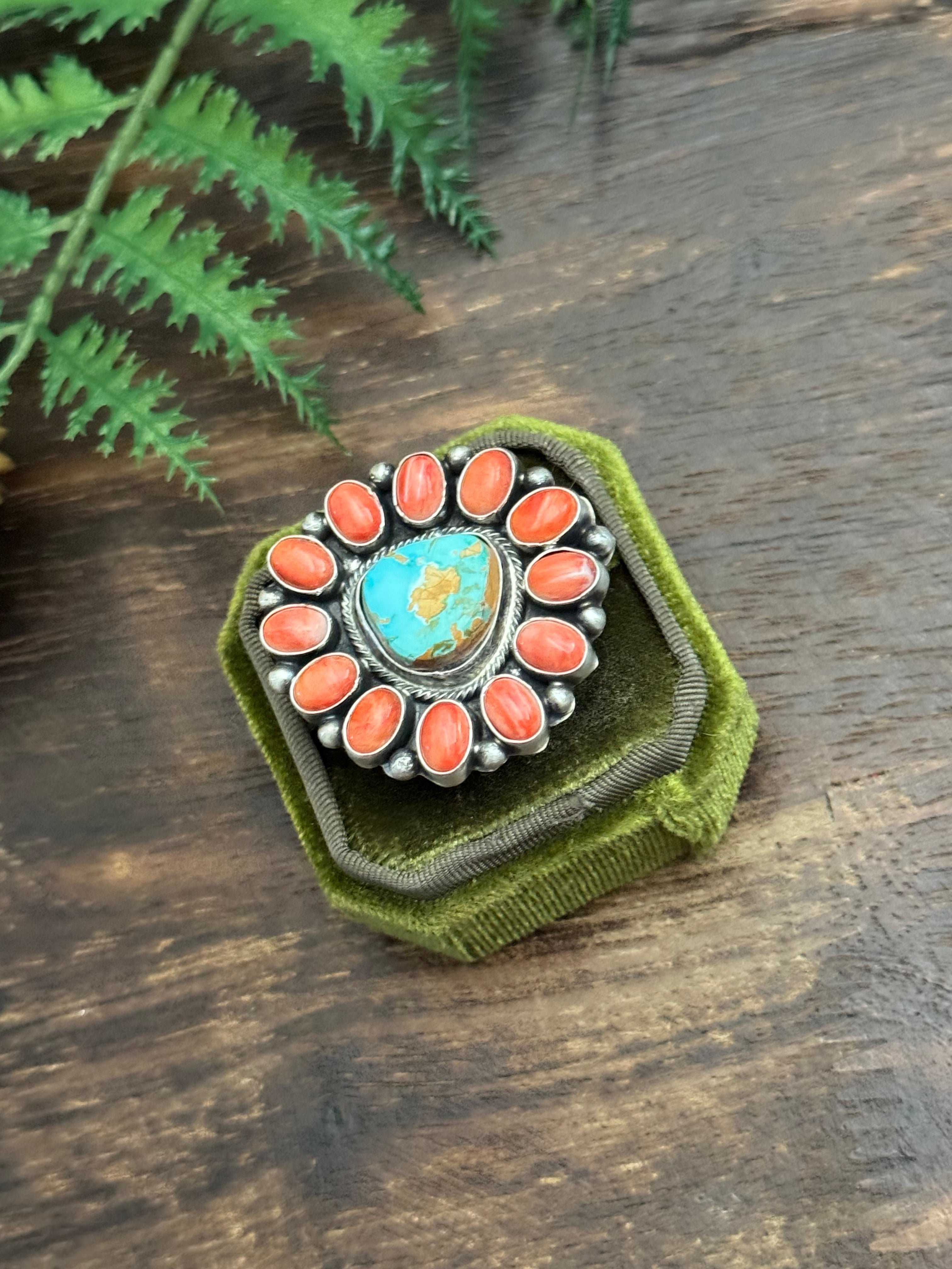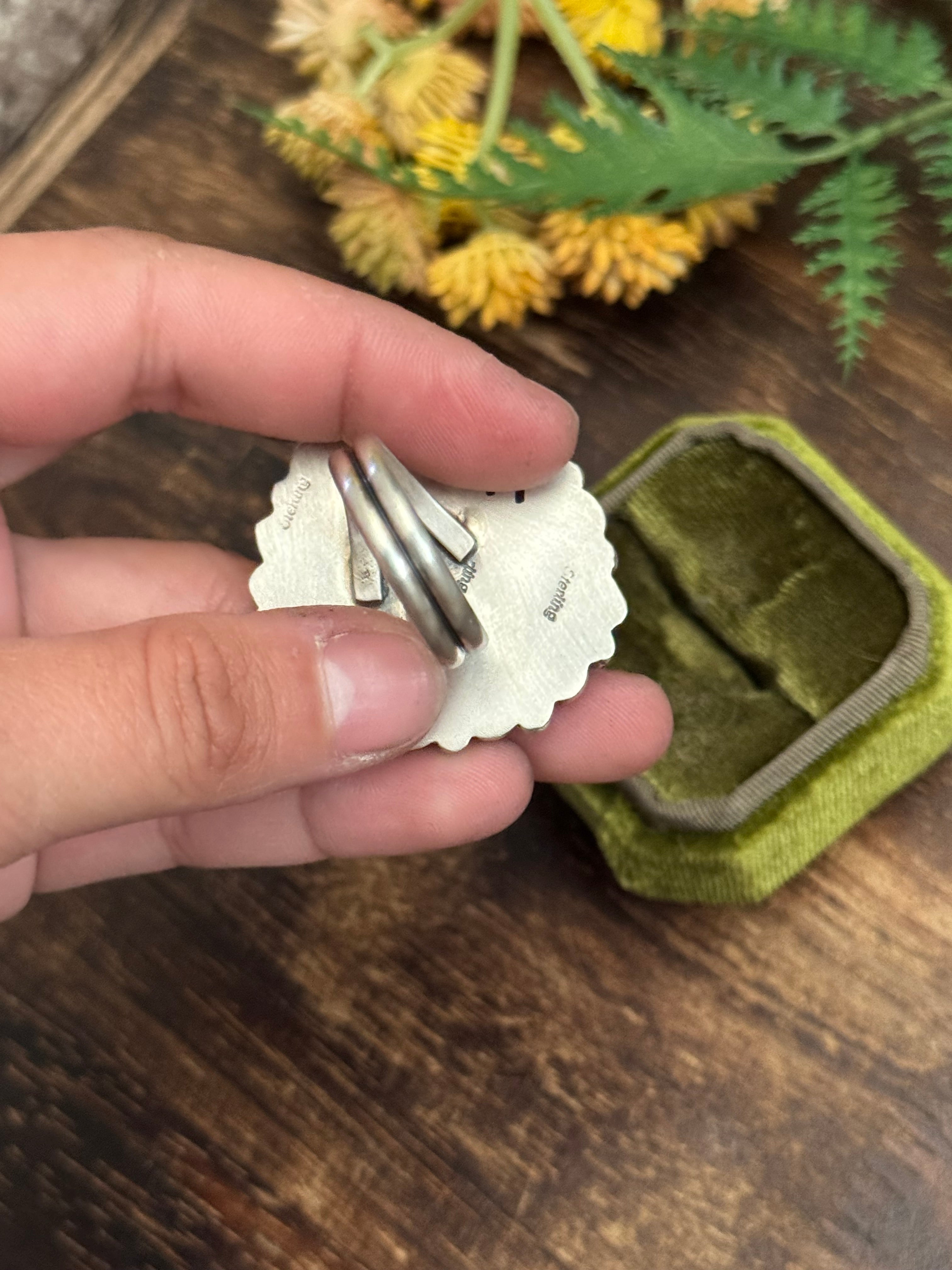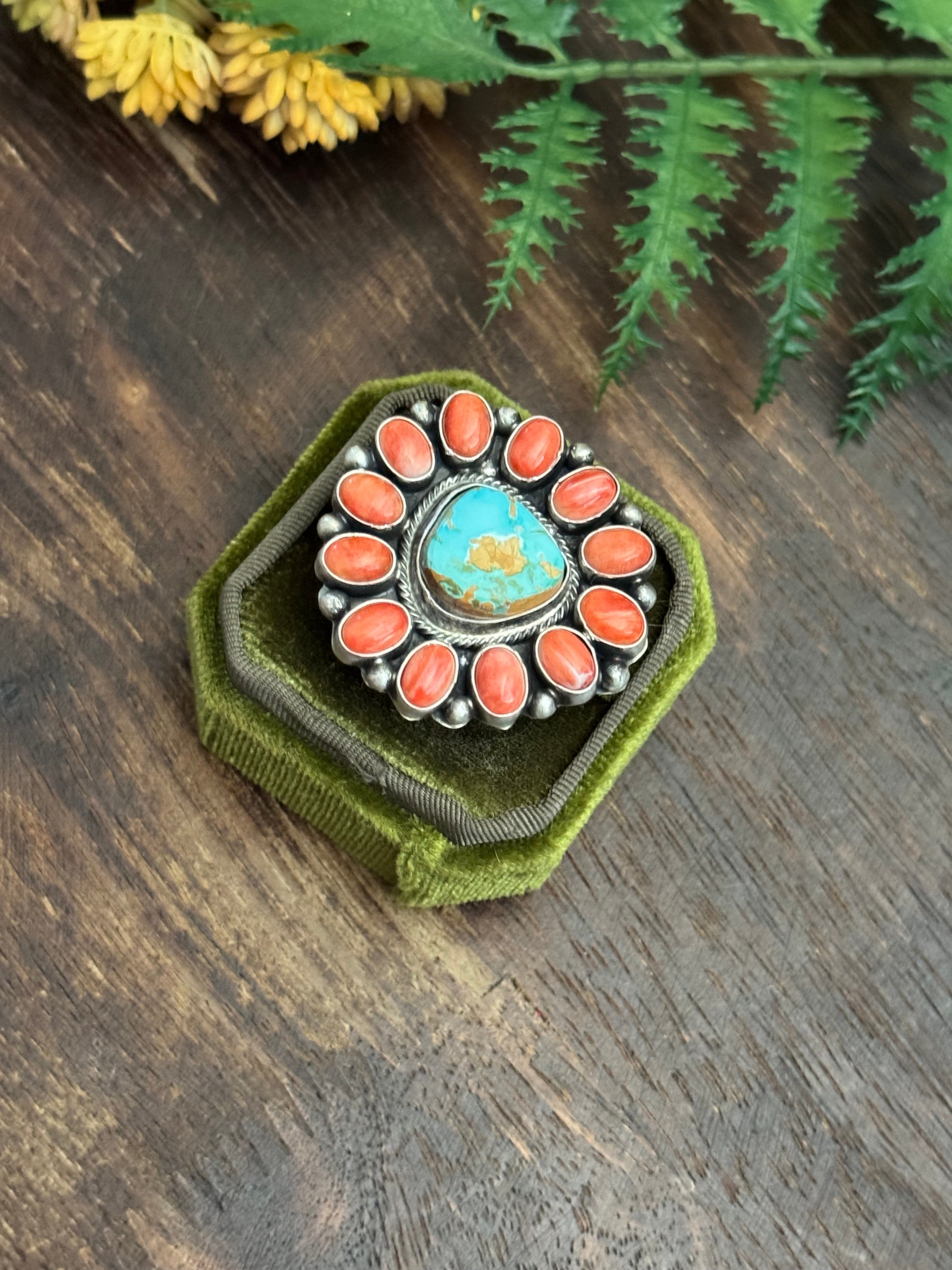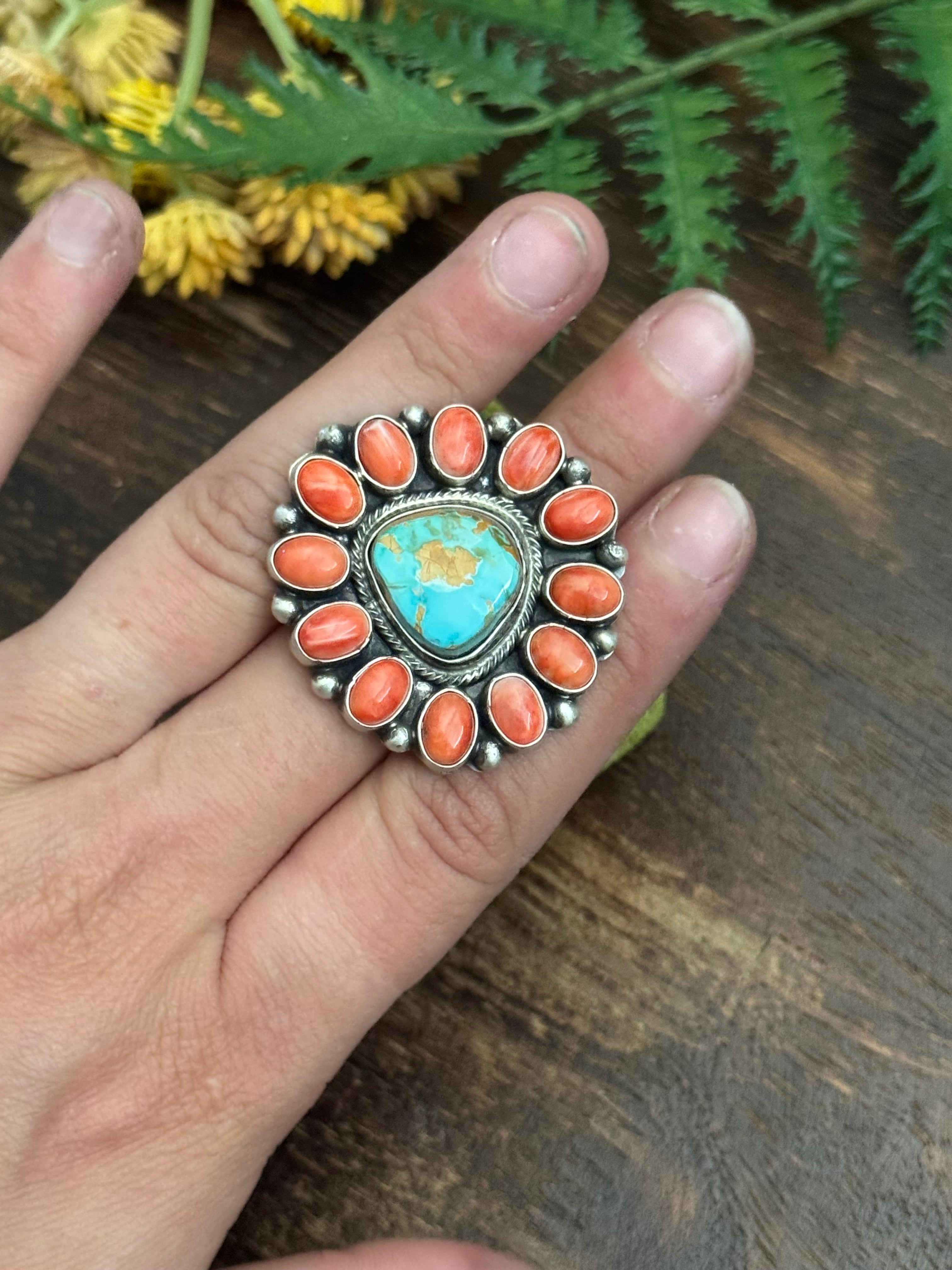 Navajo Made Multi Stone & Sterling Silver Adjustable Ring. It measures 1 3/8 inches long and 1 1/2 inches wide. Signed by the artist and stamped sterling silver.