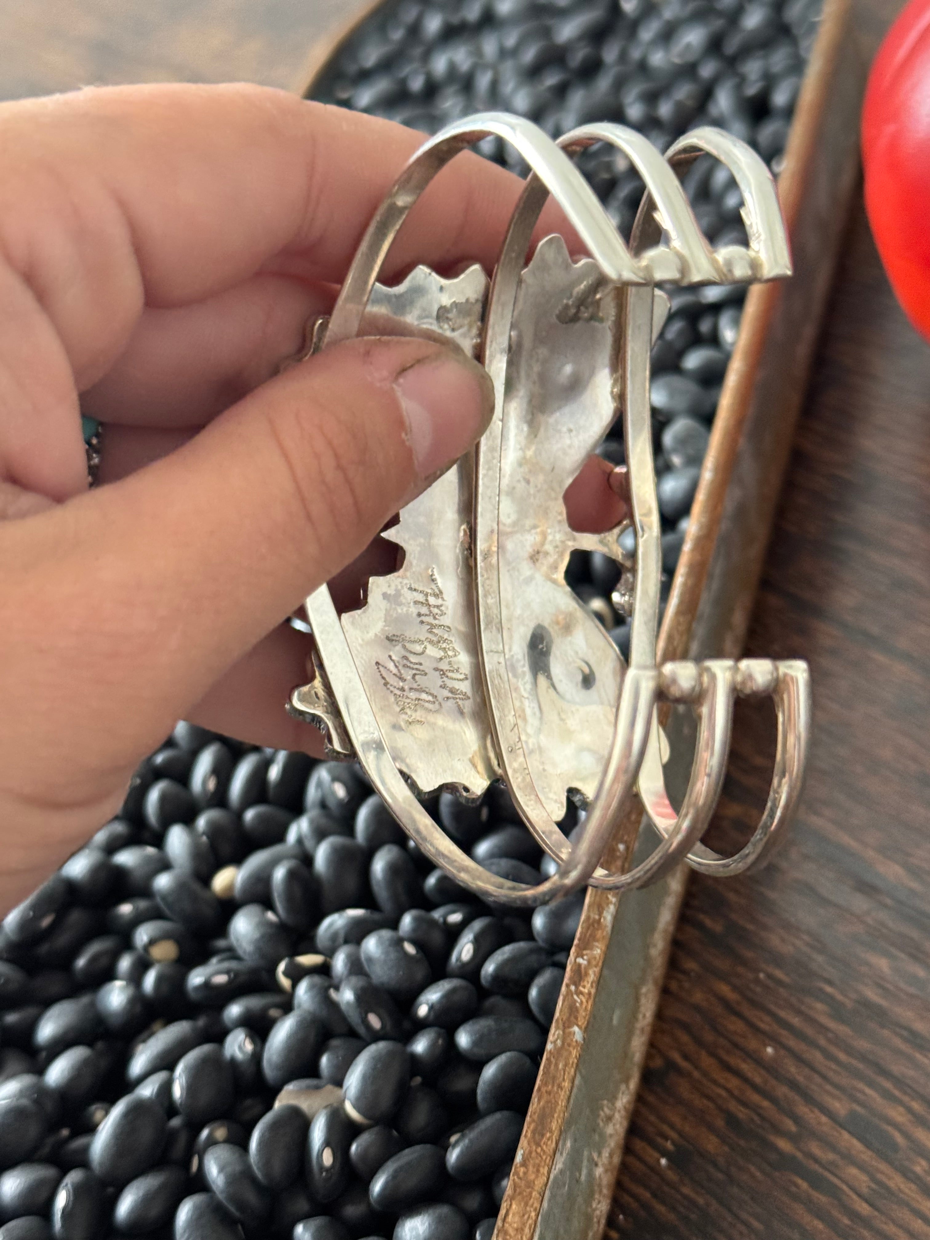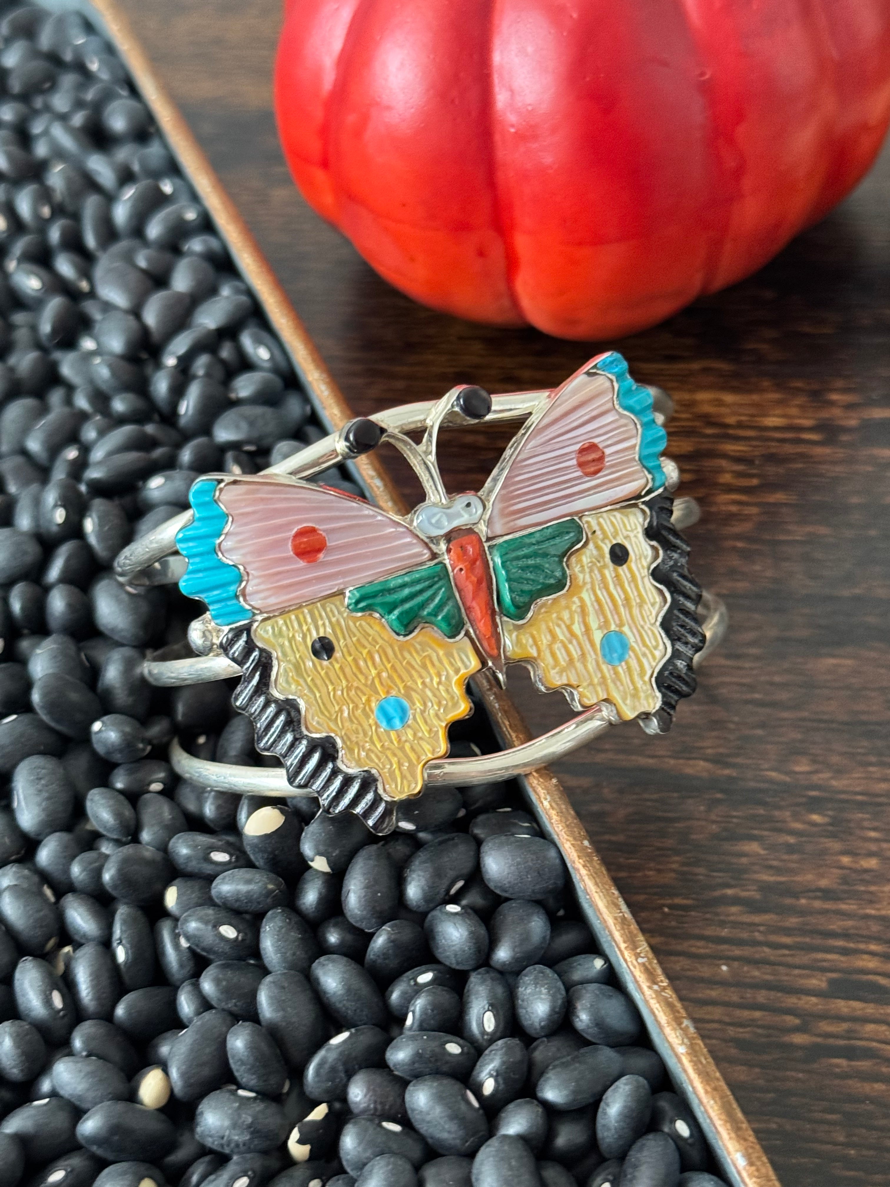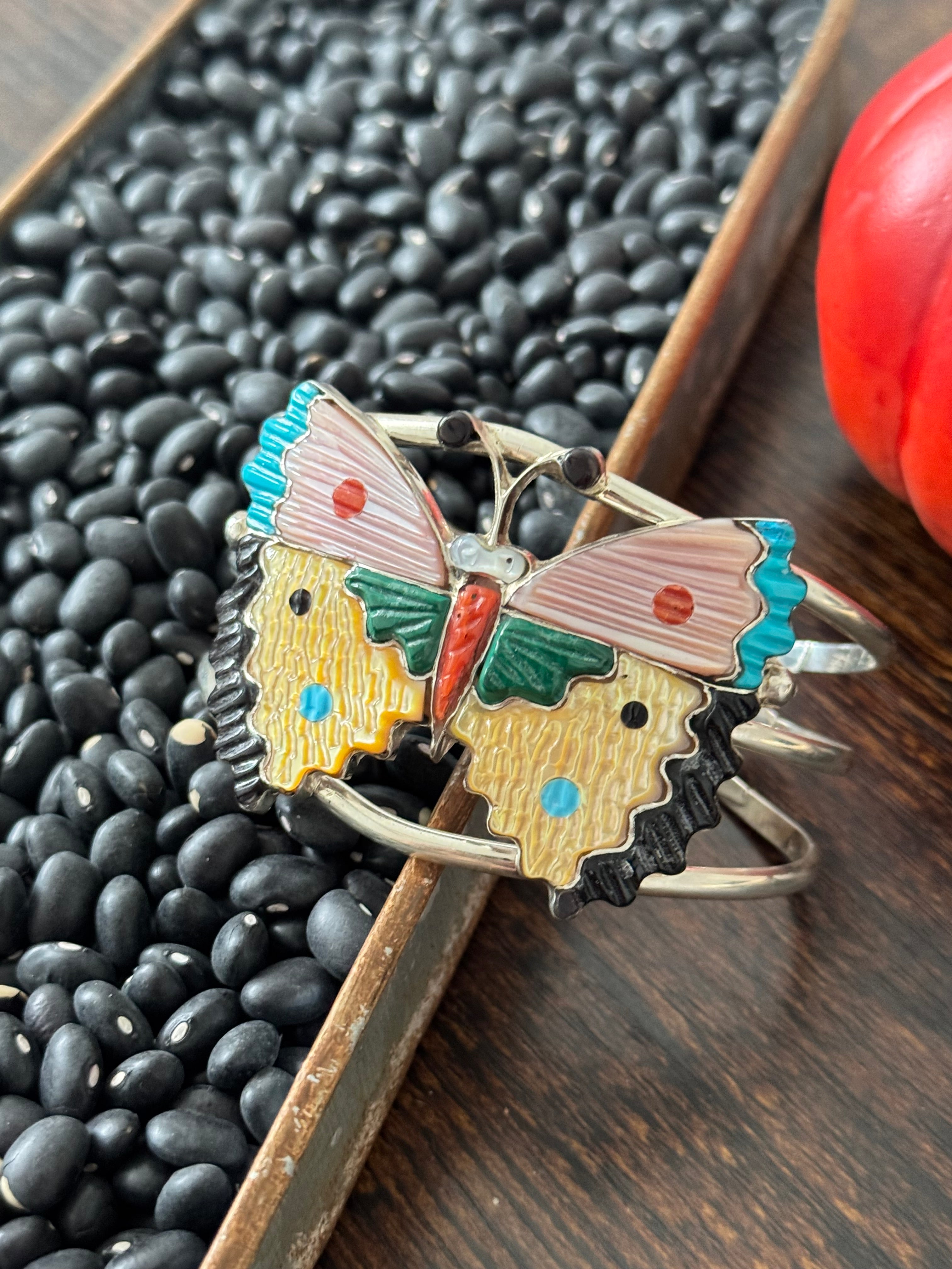 Tamara Pinto Multi Stone & Sterling Silver Butterfly Inlay Cuff Bracelet. It measures 1 3/4 inches wide with an inside circumference of 5 3/4 inches and a gap of 1 1/4 inches. Signed by the artist and stamped sterling silver.