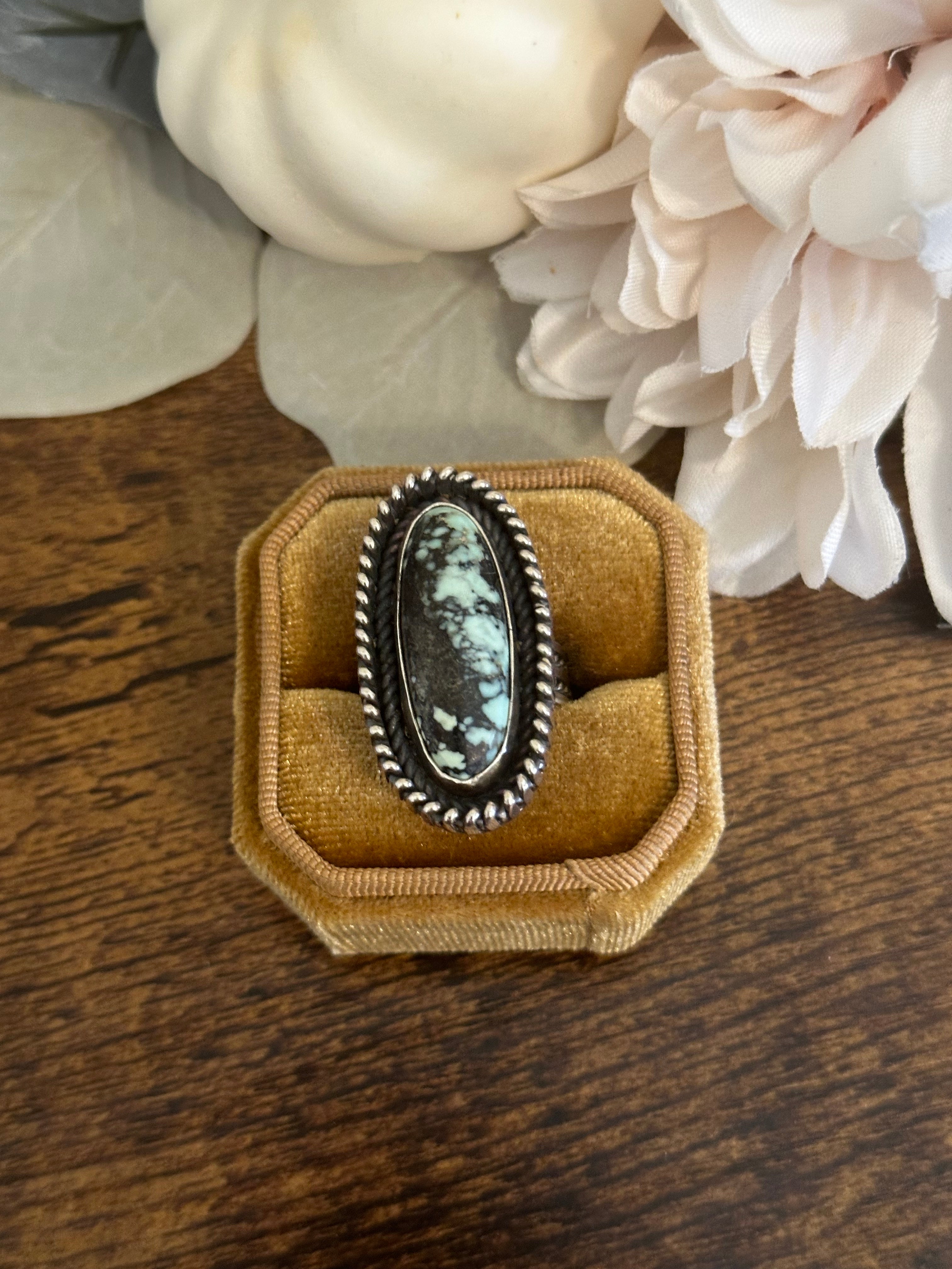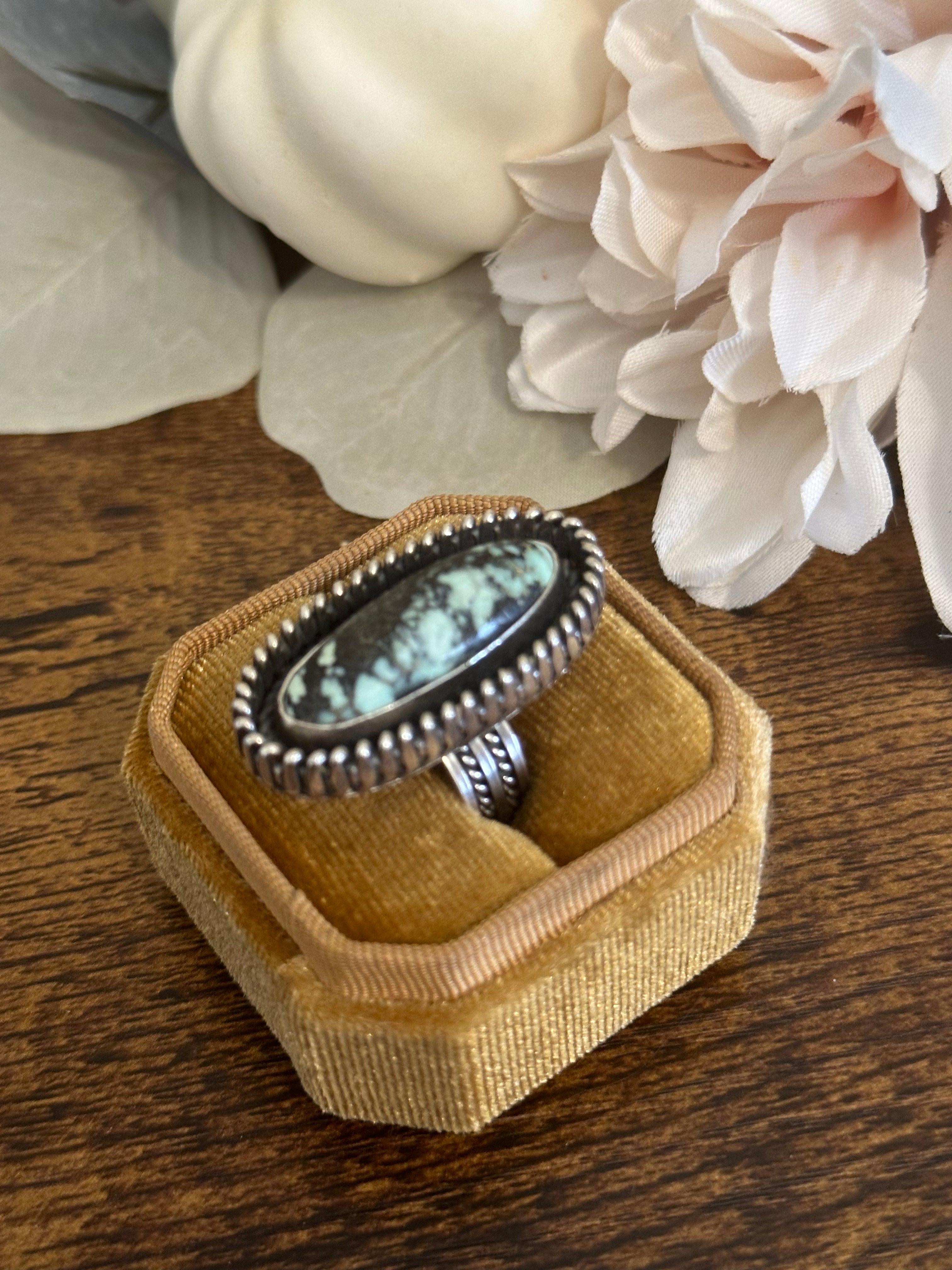 Beautiful ring. Navajo Made New Lander Varicsite & Sterling Silver Ring Size 7.25. It measures 1 1/2 inches long and 3/4 of an inch wide. Signed by the artist and stamped sterling silver.