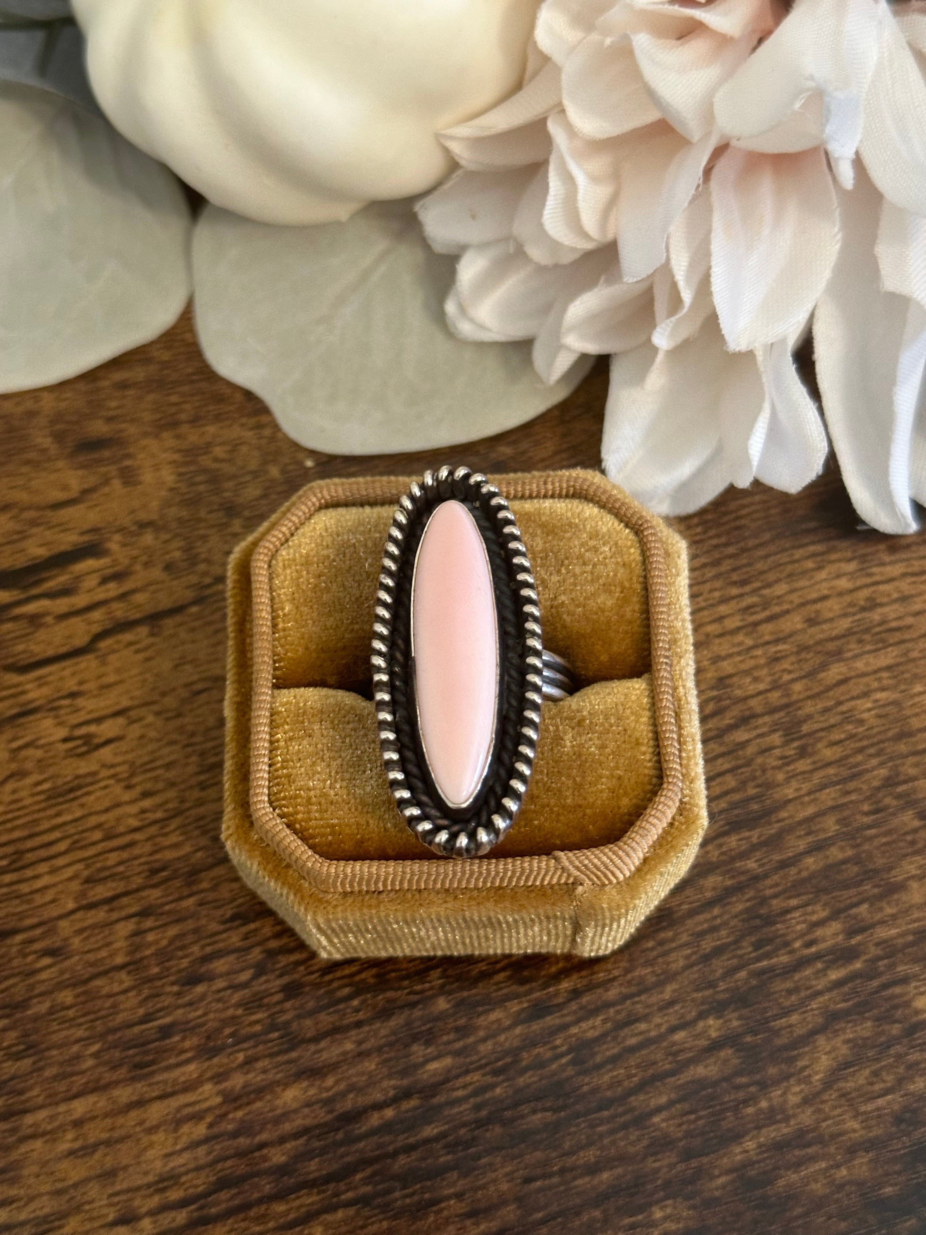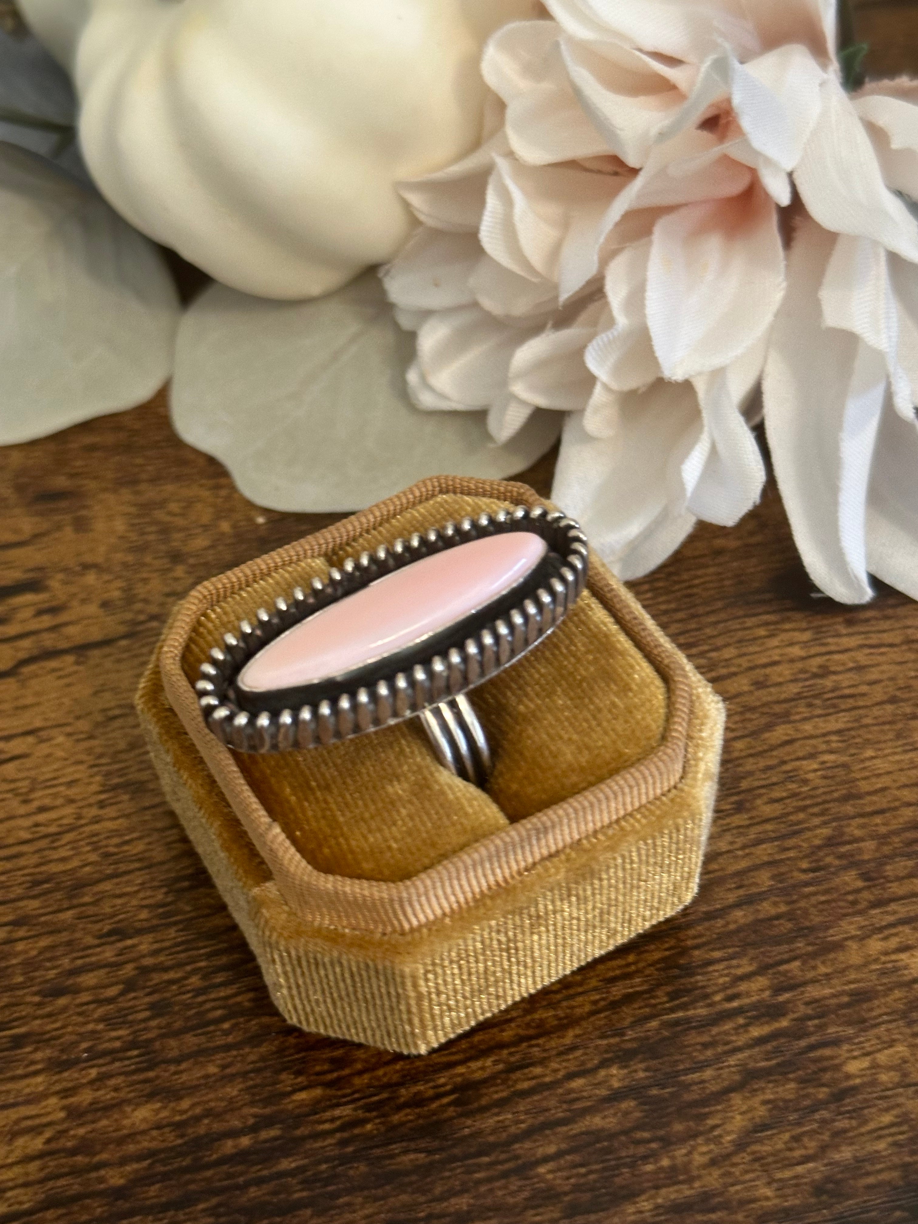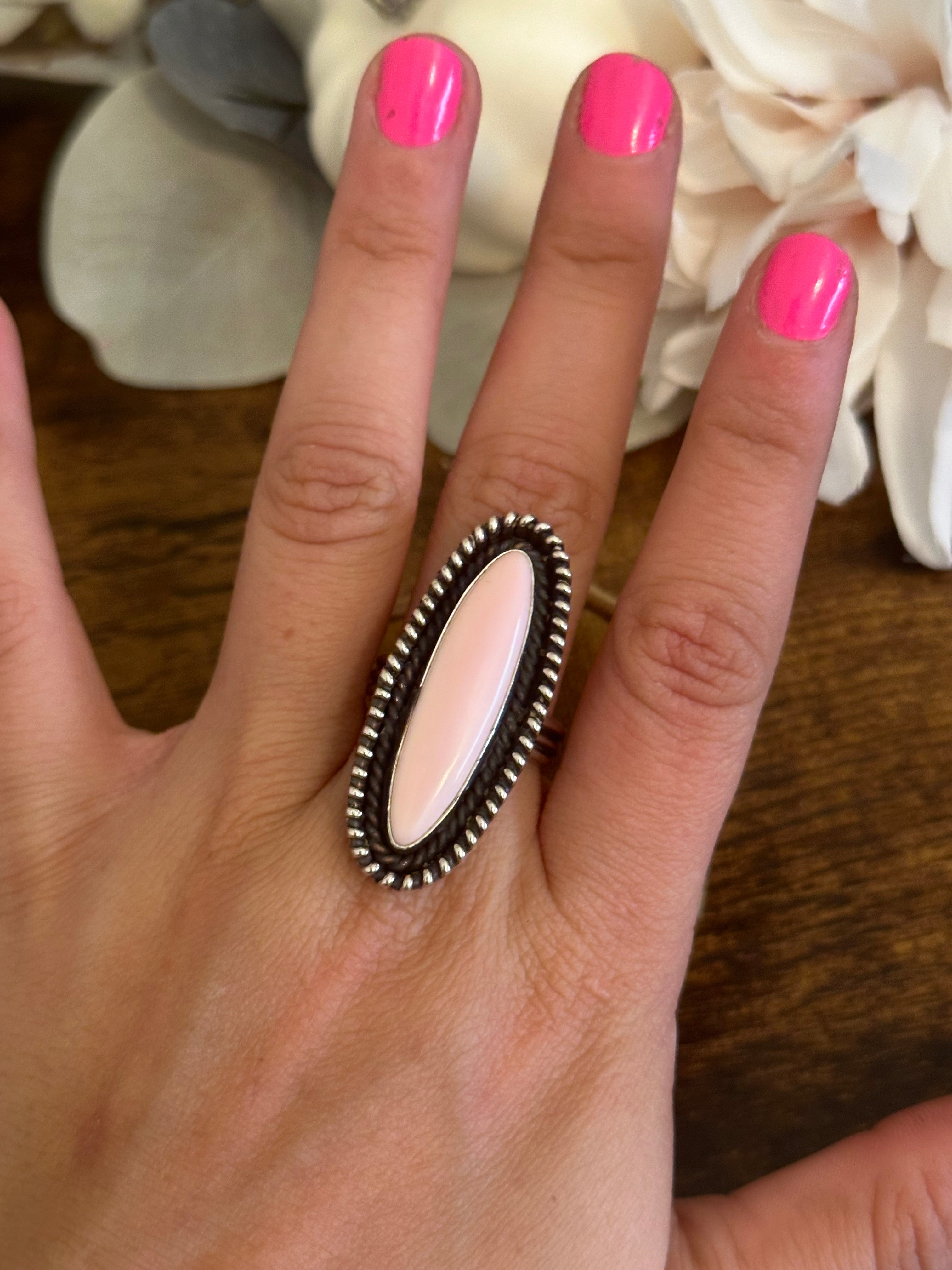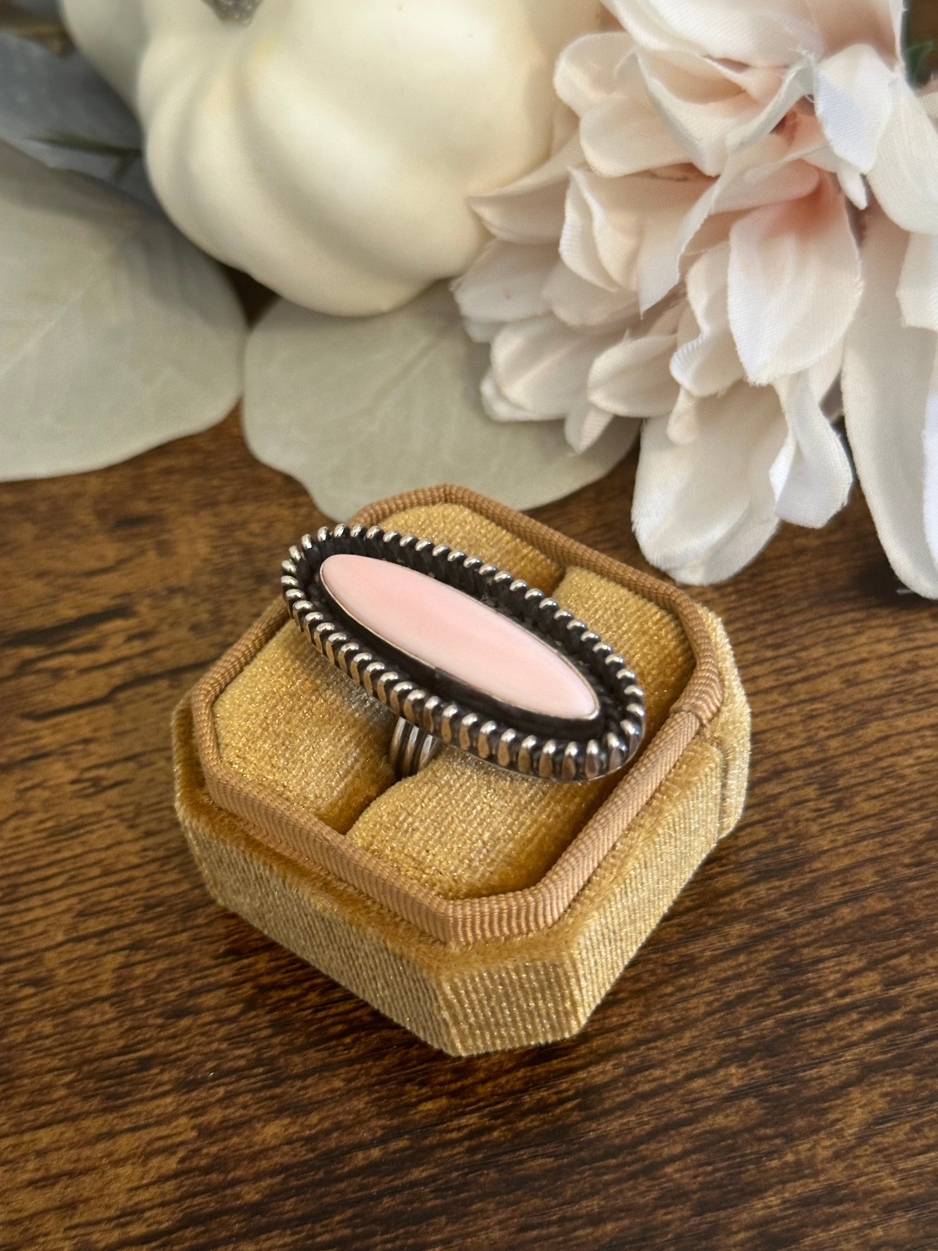 Beautiful ring. Navajo Made Pink Conch & Sterling Silver Ring. It measures 1 1/2 inches long and 3/4 of an inch wide. Signed by the artist and stamped sterling silver.