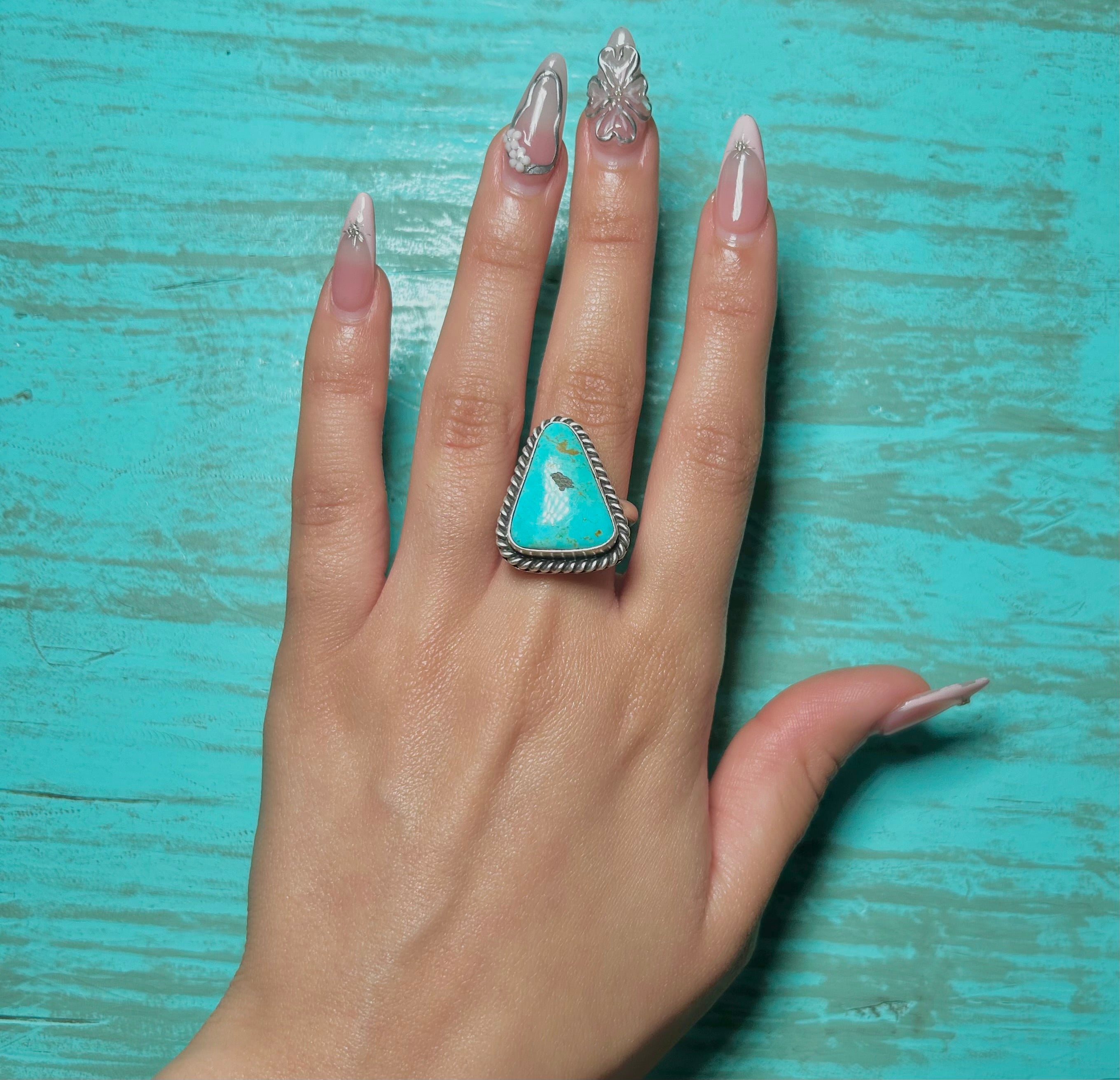 Johnny Dixon Kingman Turquoise & Sterling Silver Adjustable Size. It measures 1 inch long and 7/8 of an inch wide. Signed by the artist and stamped sterling silver.