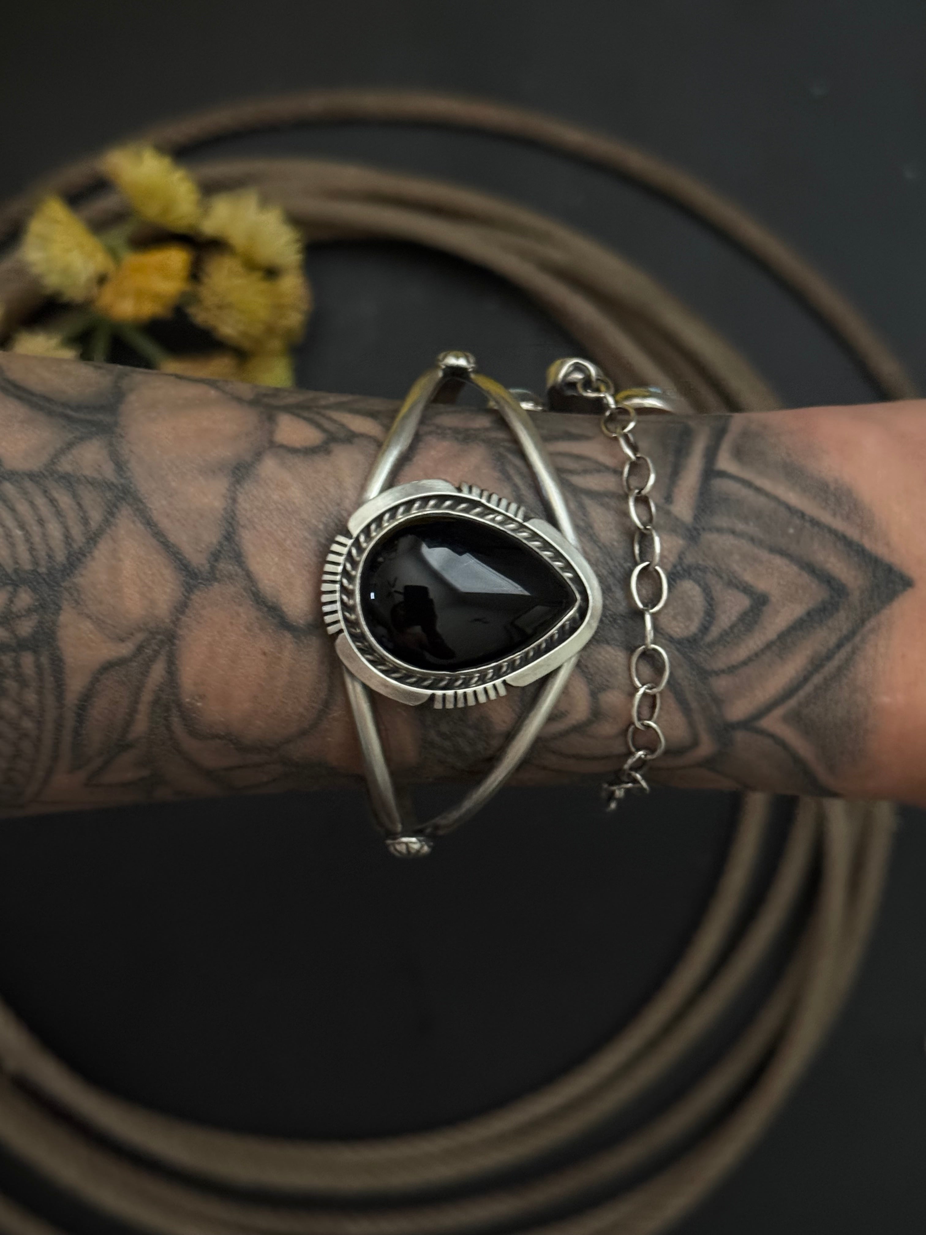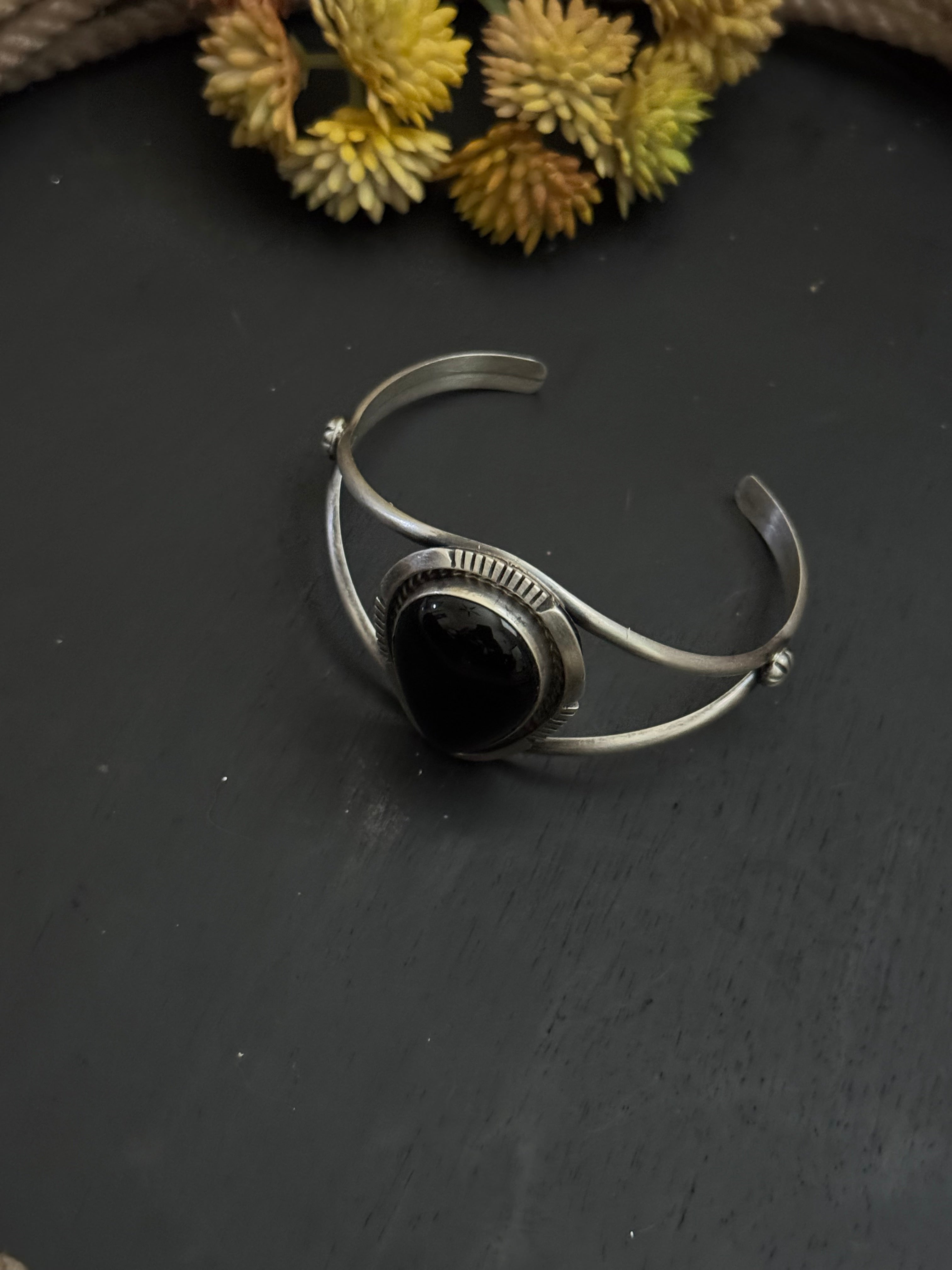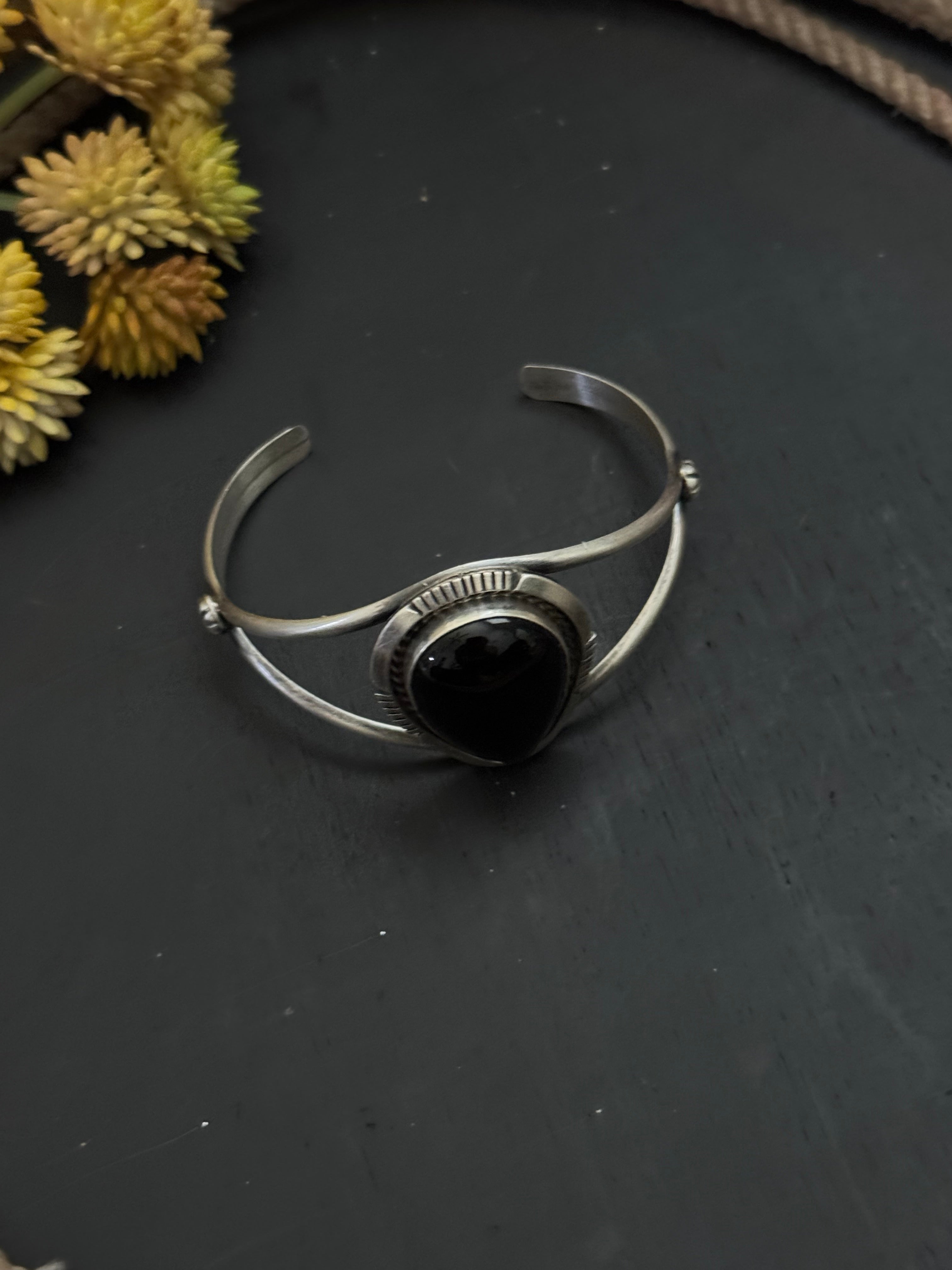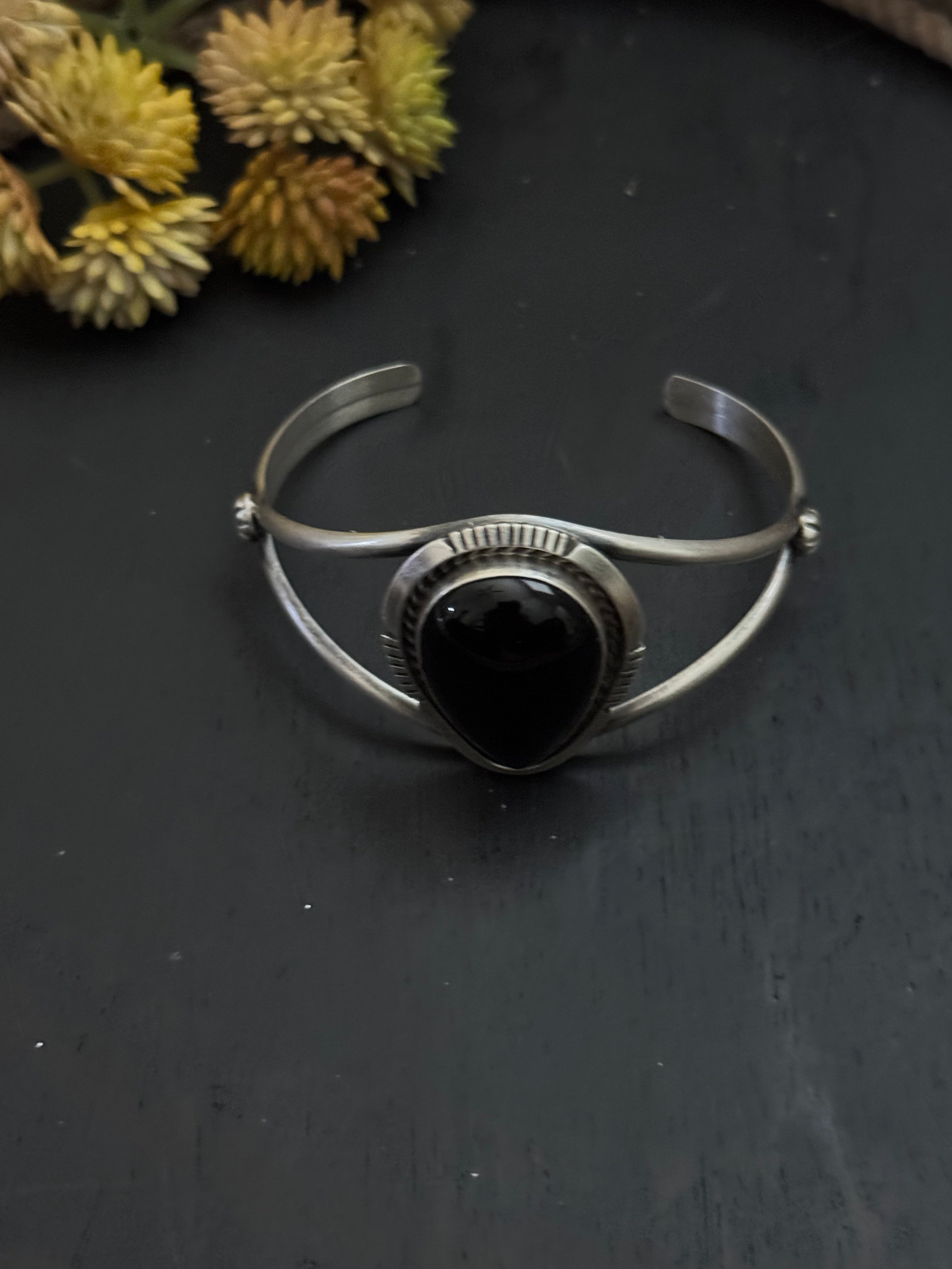 Alfred Martinez Onyx & Sterling Silver Cuff Bracelet. It measures 1 1/4 inches wide with an inside circumference of 5 3/8 inches and a gap 1 1/8 inches. stamped sterling silver.