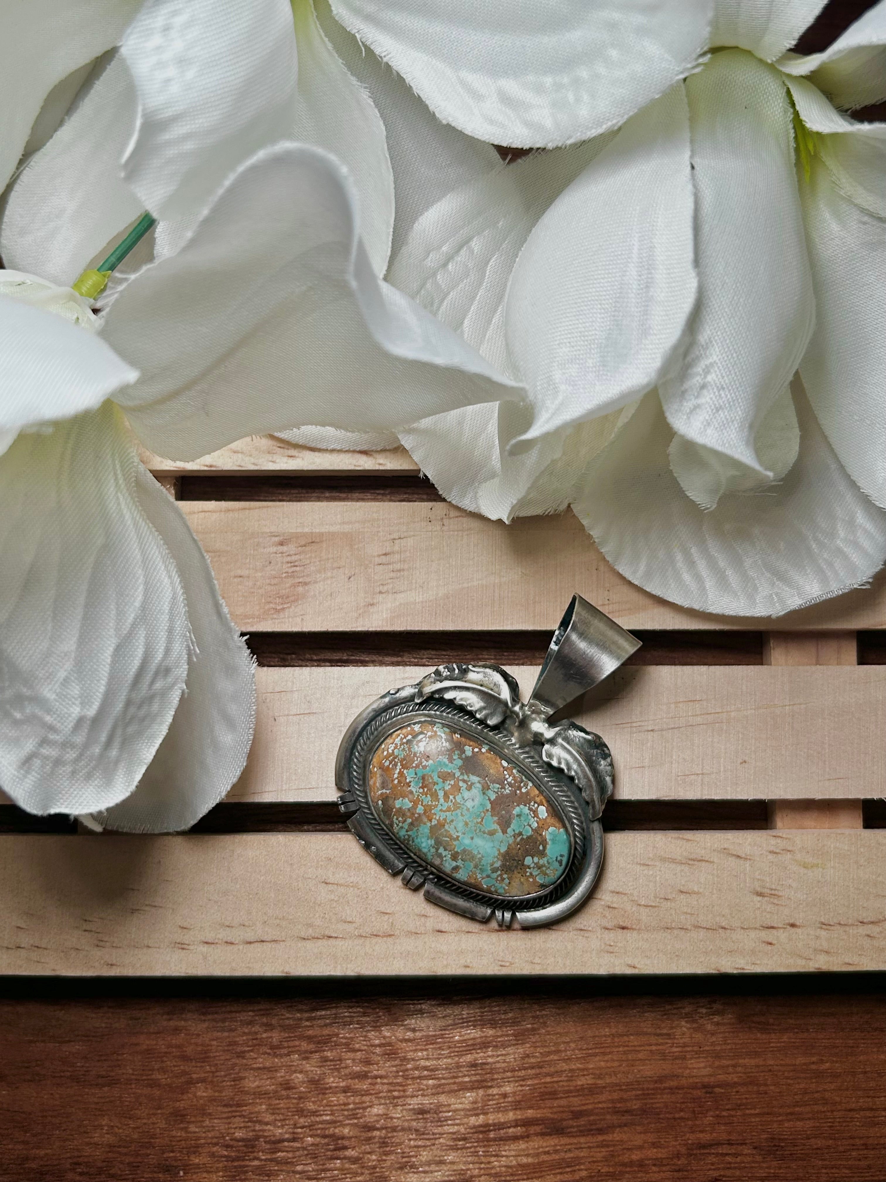 Navajo Made Royston Turquoise & Sterling Silver Pendant. It measures 2 inches long and 1 3/4 inches wide. Pendant Only!! Signed by the artist and stamped sterling silver.
