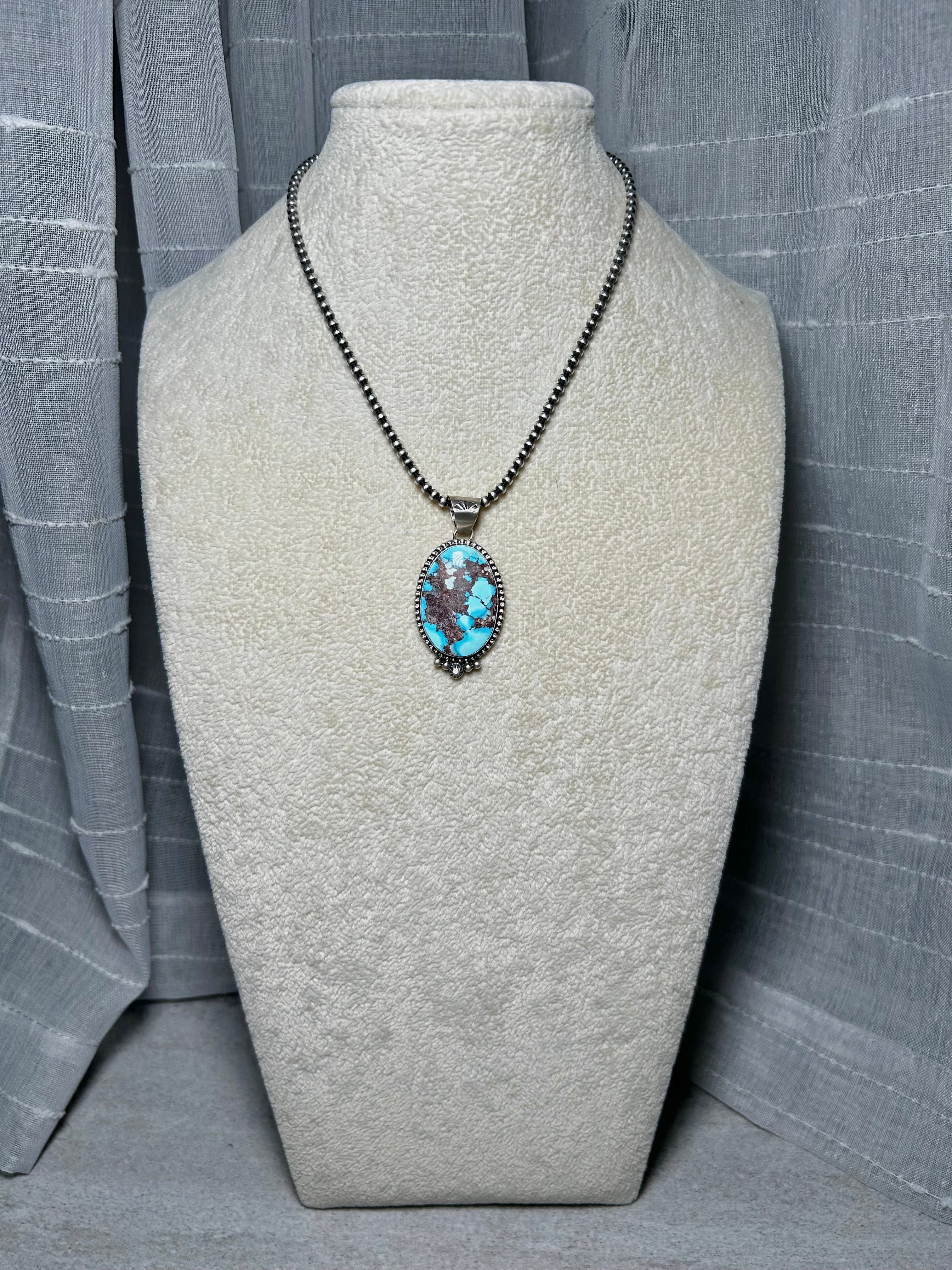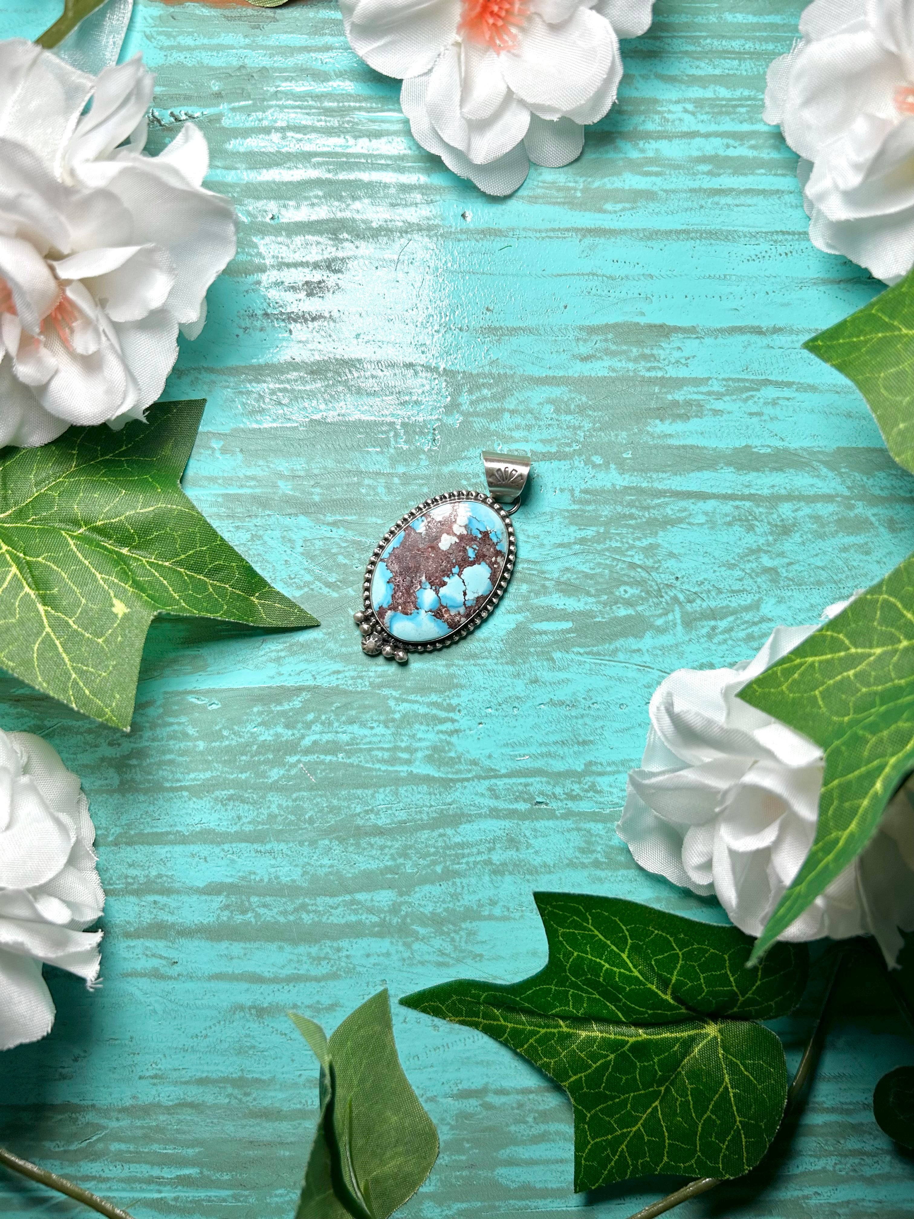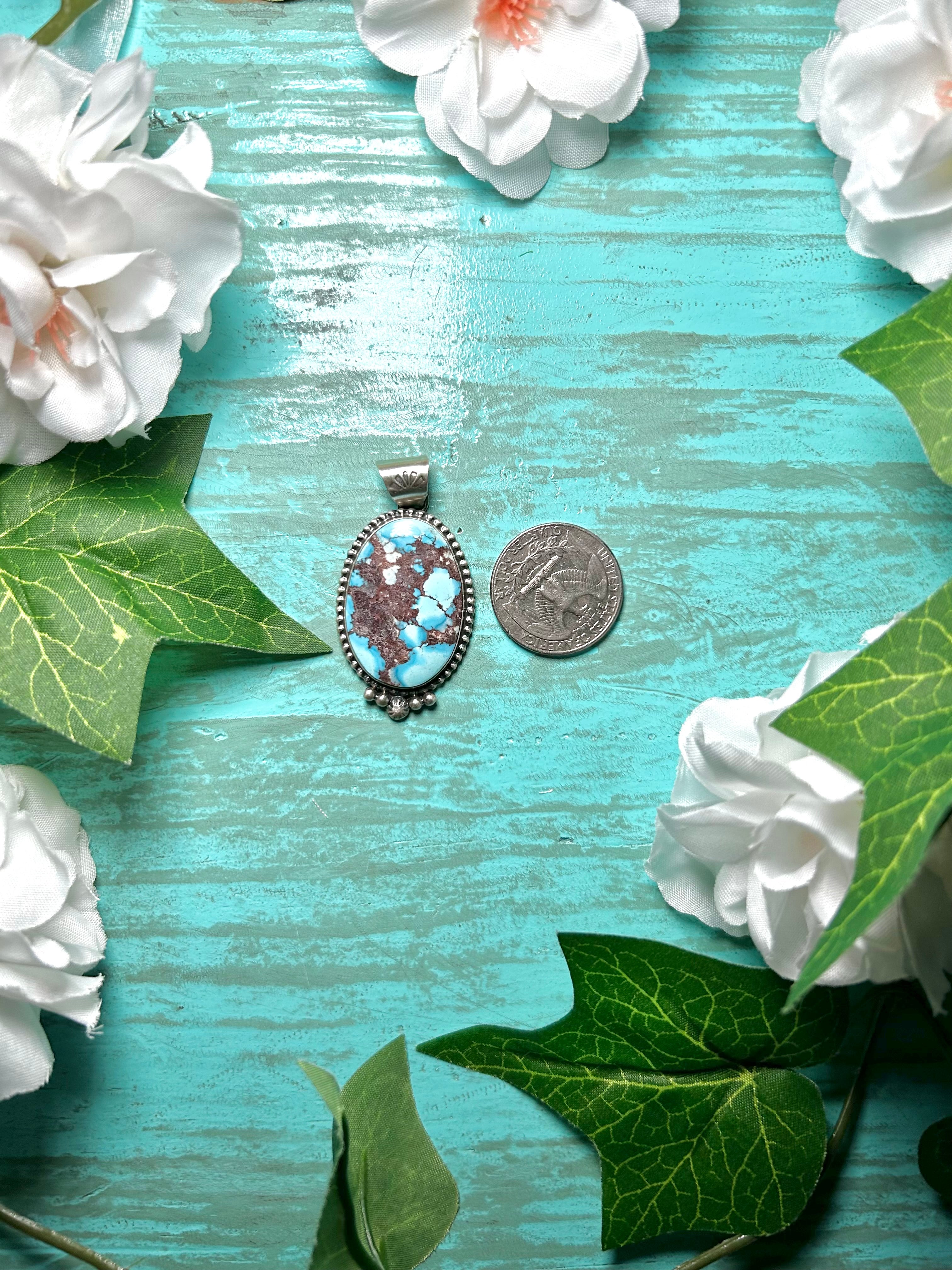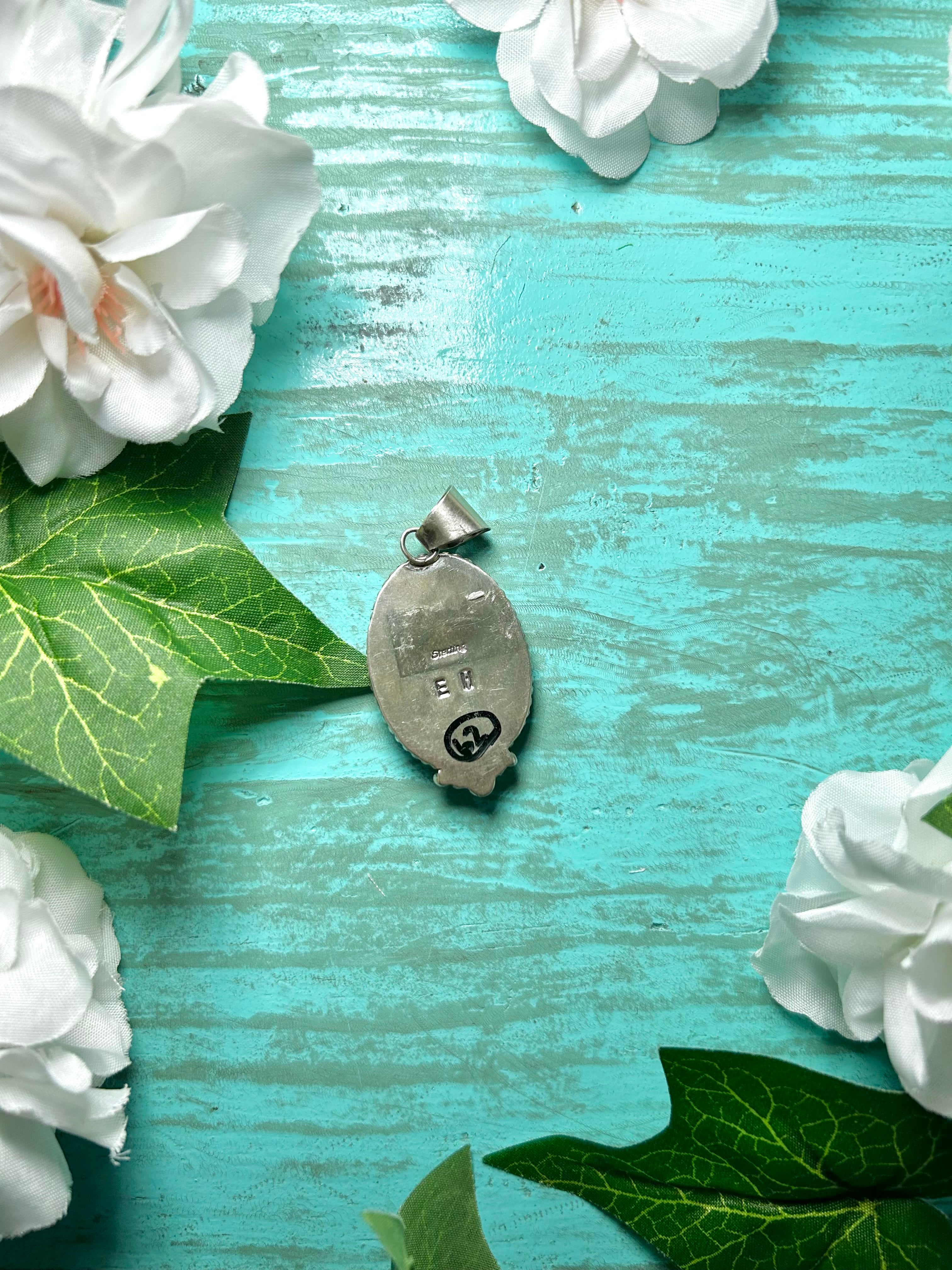 Navajo Made Golden Hill Turquoise & Sterling Silver Pendant. It measures 1 7/8 inches long and 1 inch wide. Pendant Only! Signed by the artist and stamped sterling silver.