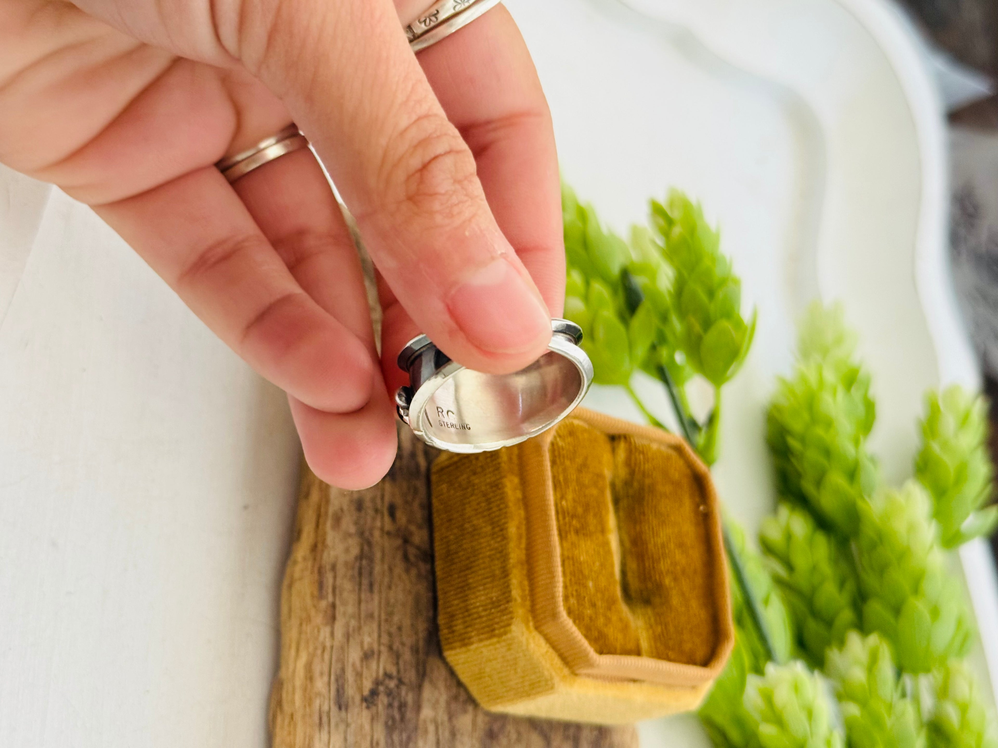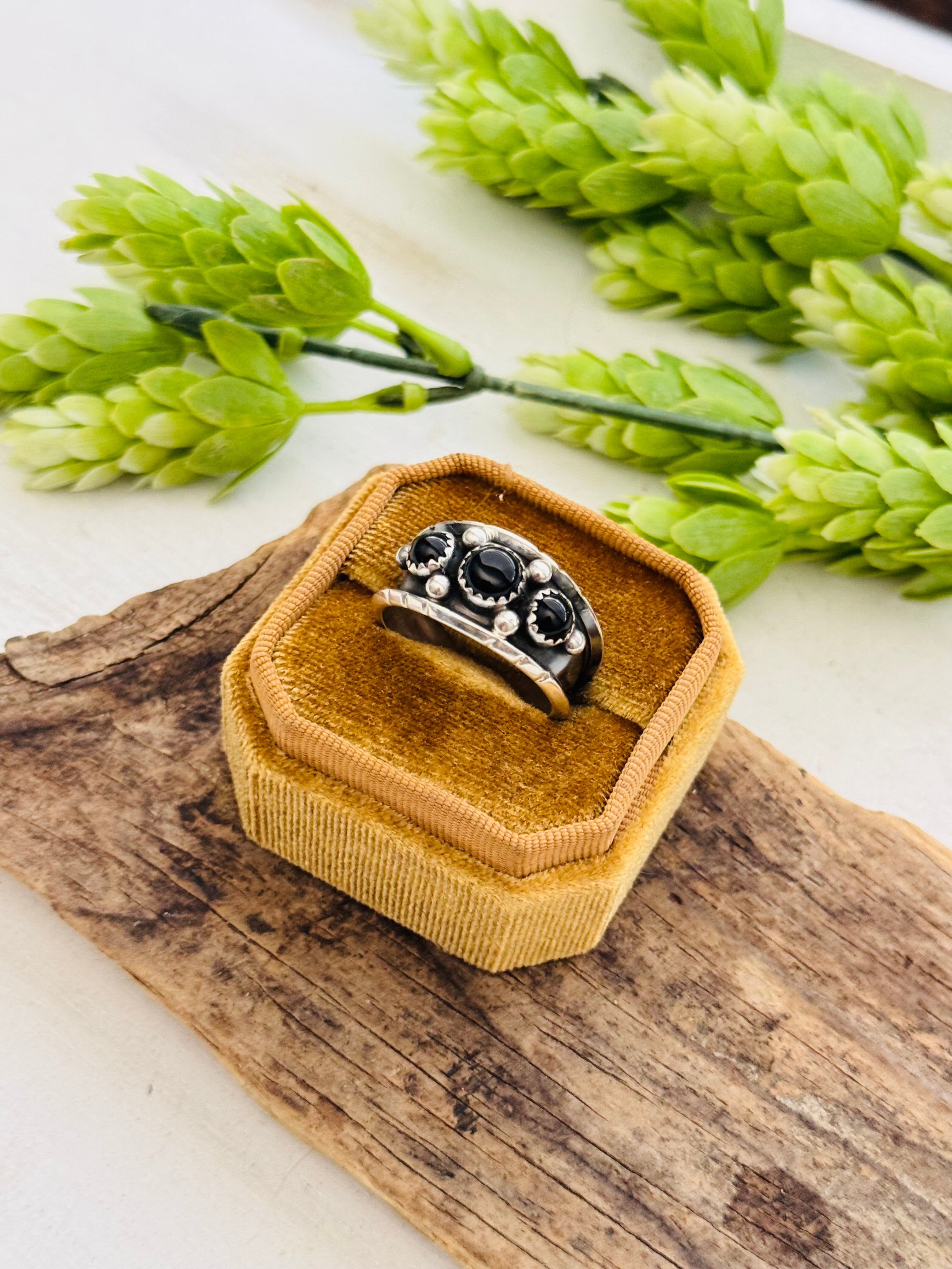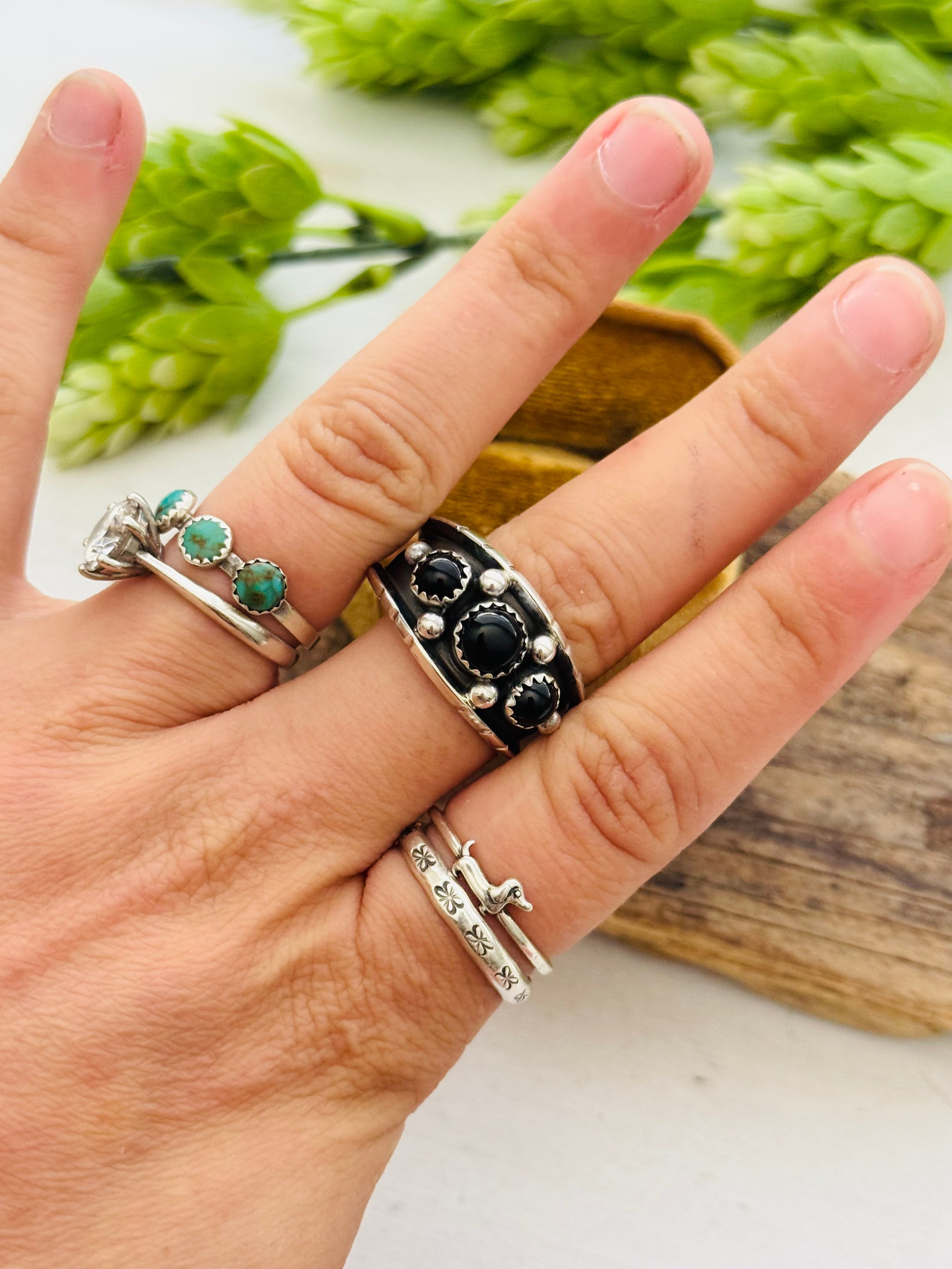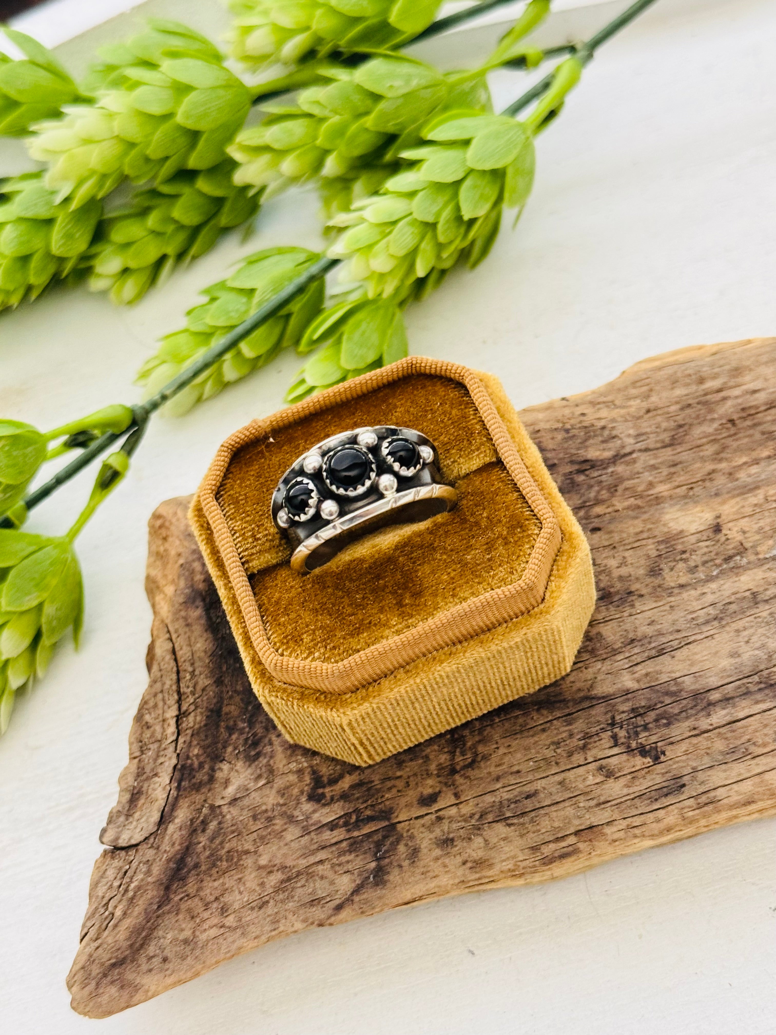 A beautiful Ring. Navajo Made Onyx & Sterling Silver Ring. It measures 1/2 of an inch long. Signed and stamped.