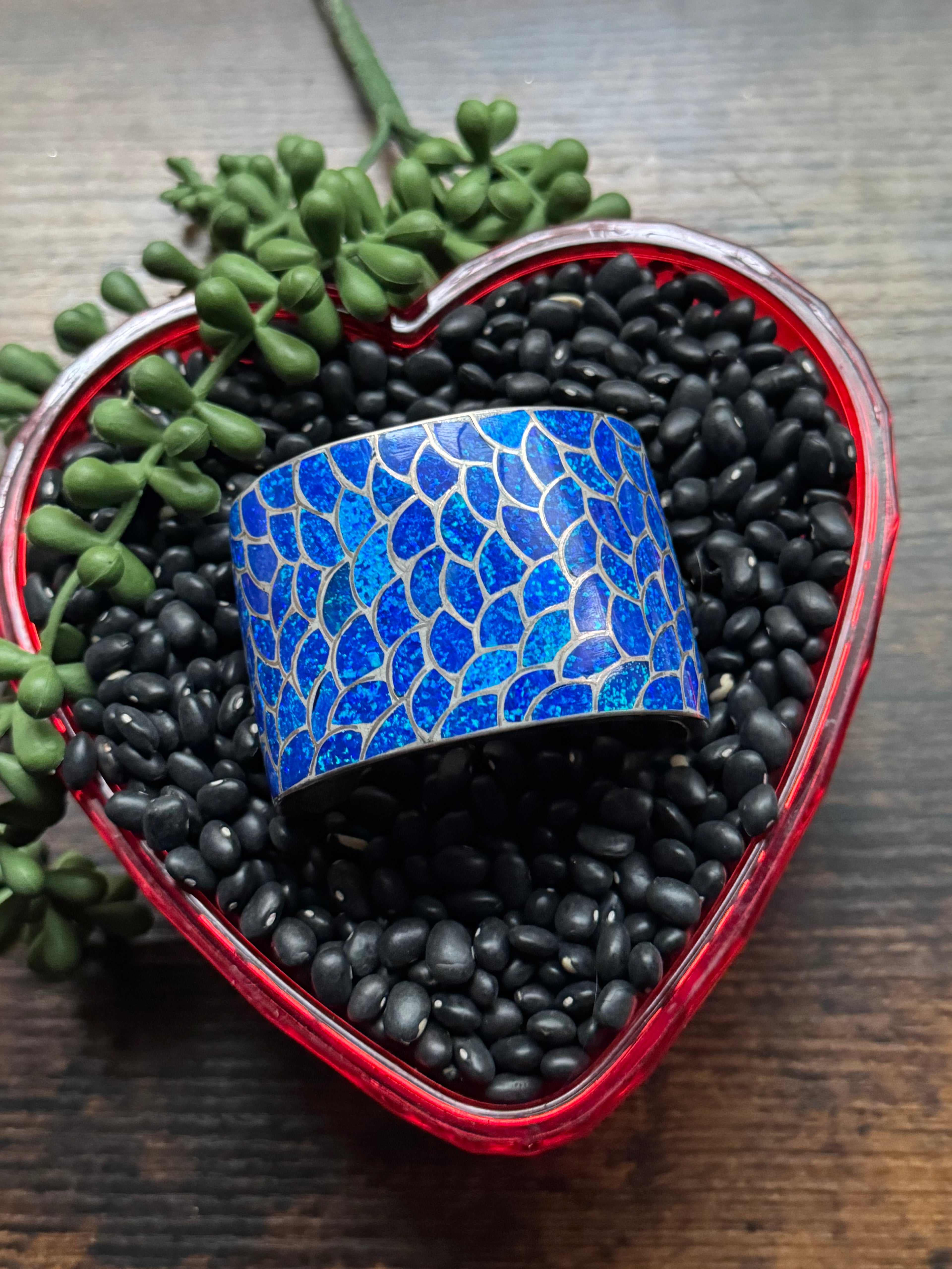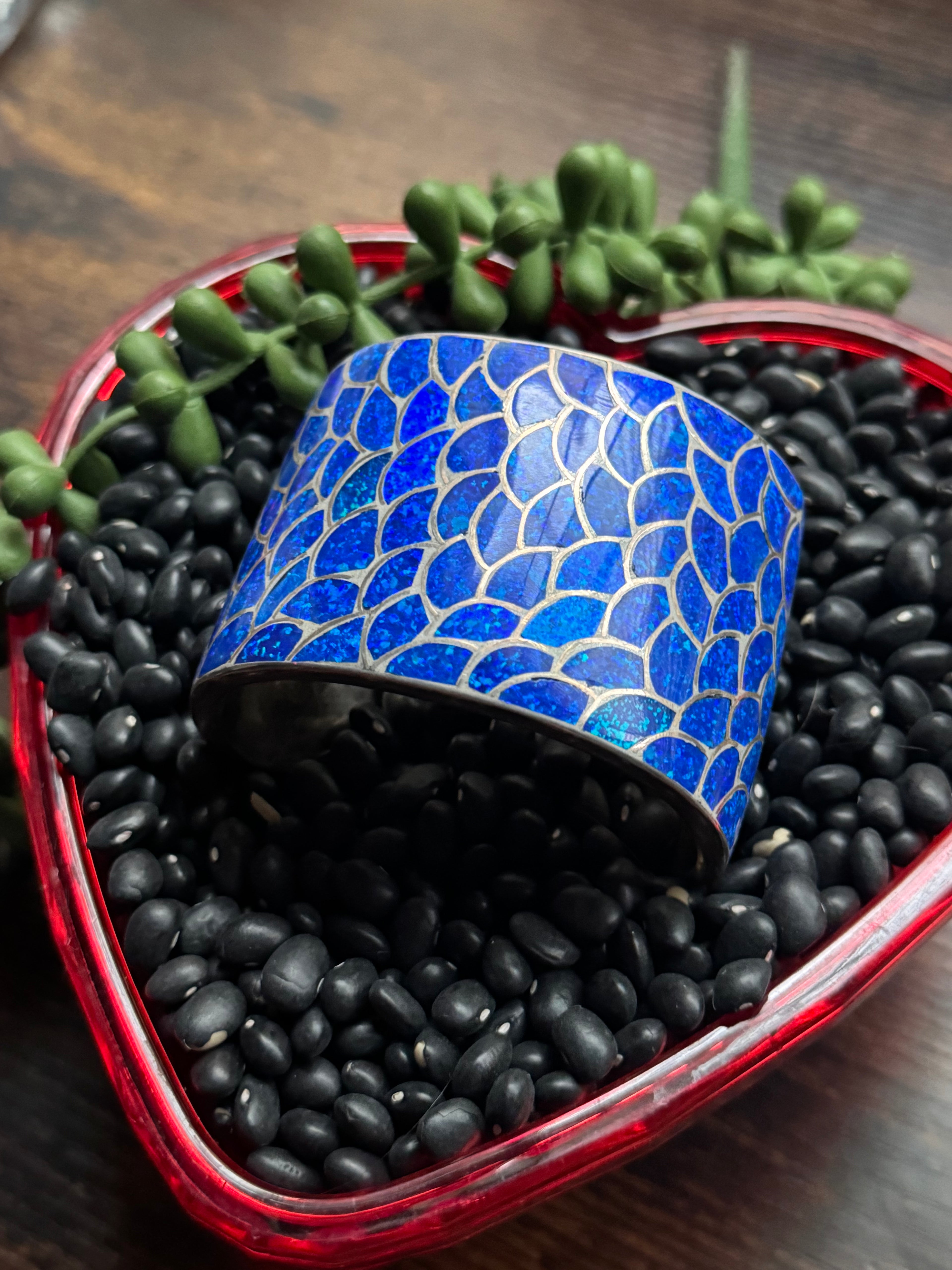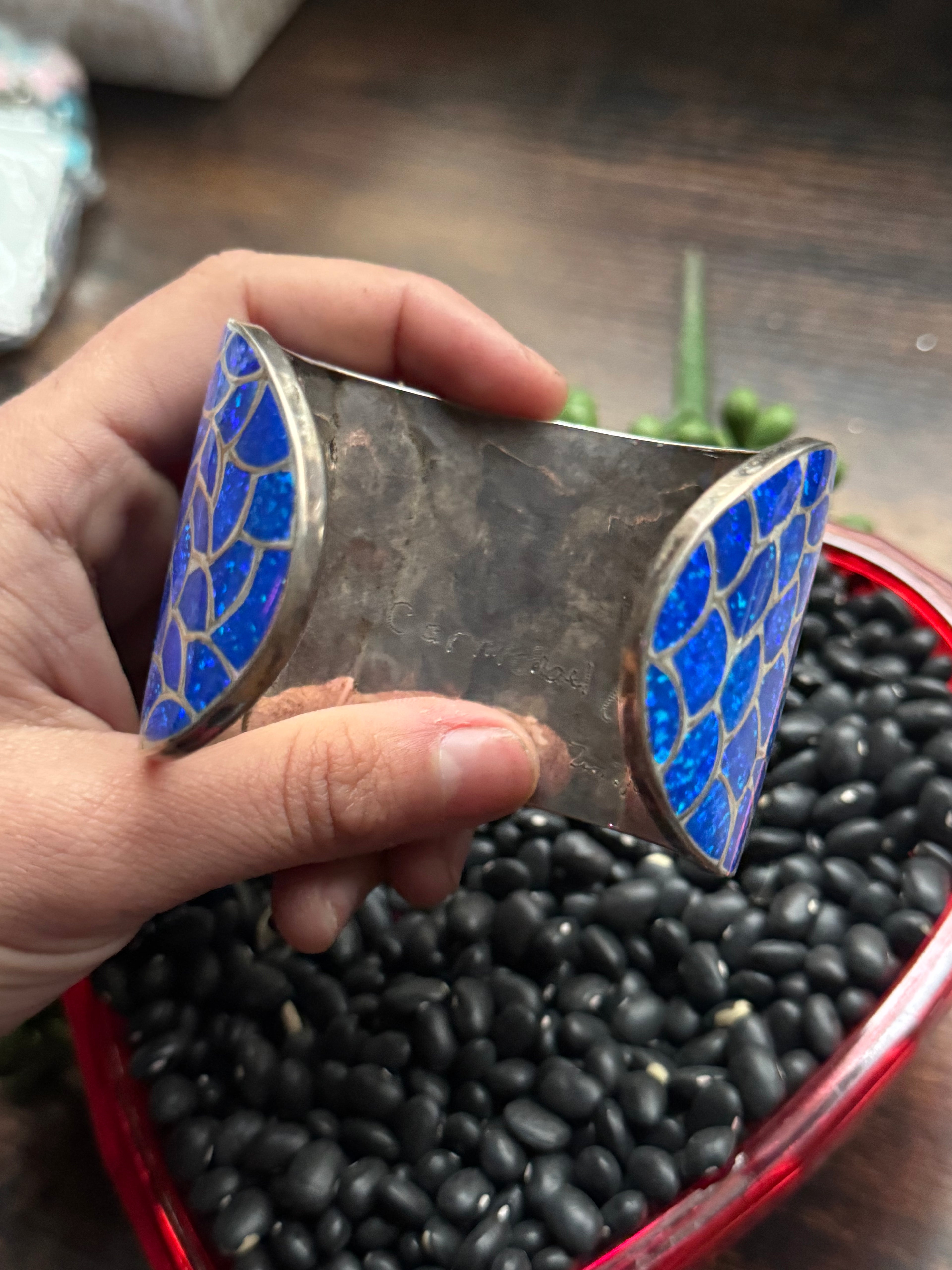 Carmichael Haloo Blue Opal (Man Made) & Sterling Silver Inlay Cuff Bracelet. It measures 1 7/8 inches wide with an inside circumference of 5 1/2 inches and a gap of 1 1/4 inches. Signed by artist and stamped sterling silver.