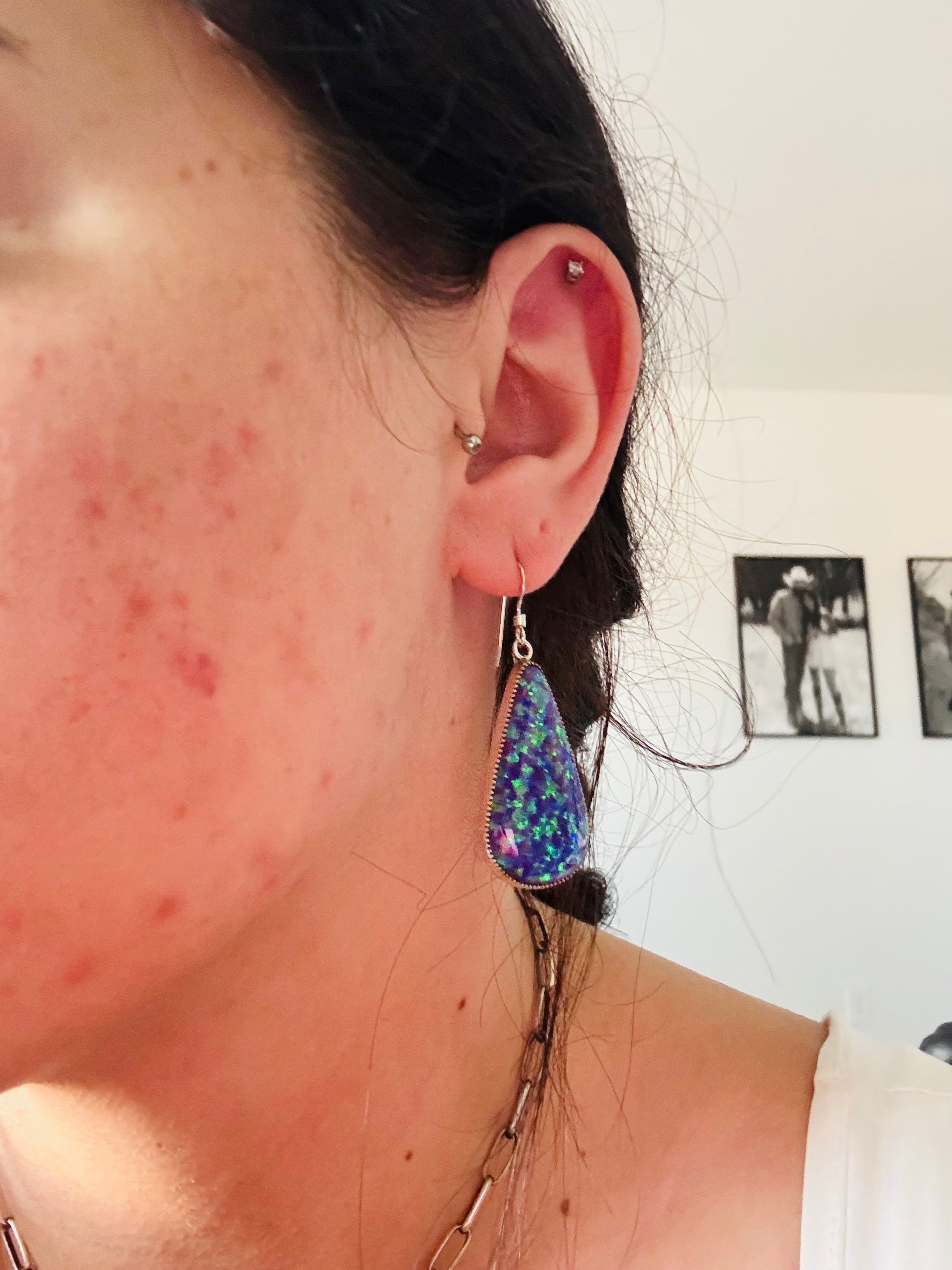 Navajo Made Opal (Man Made) & Sterling Silver Dangle Earrings. It measures 2 inches long and 3/4 of an inch wide. Stamped sterling silver.