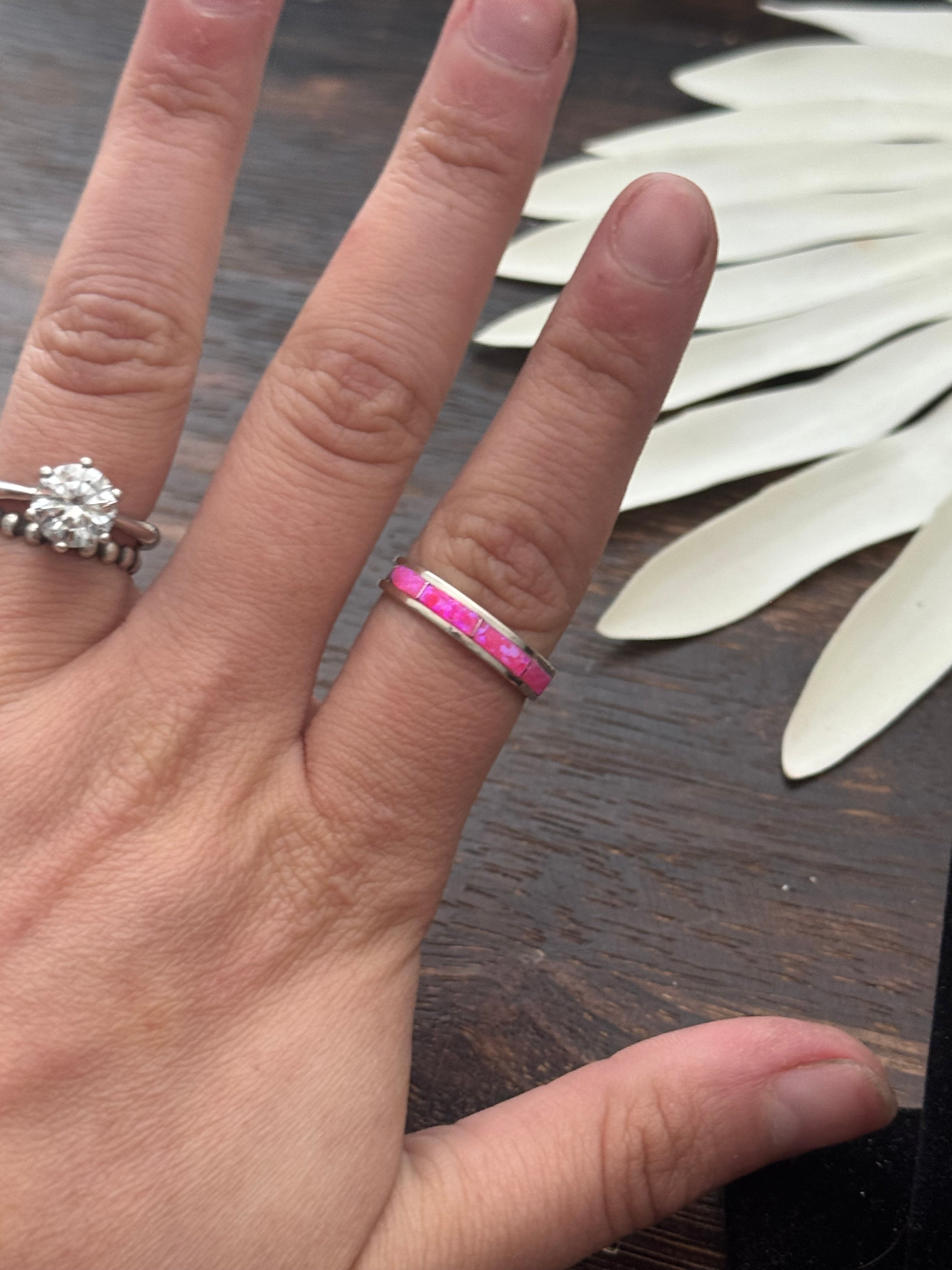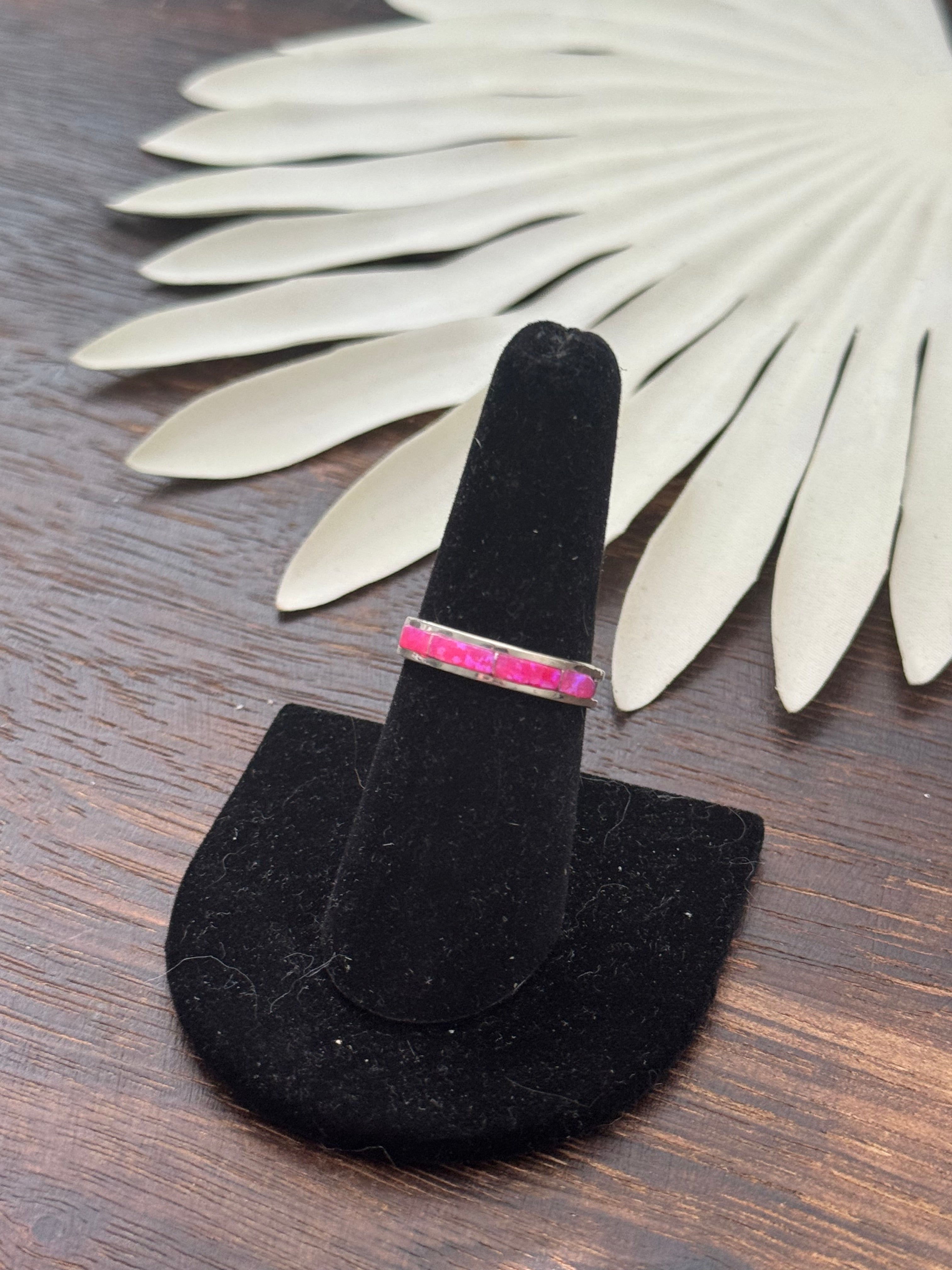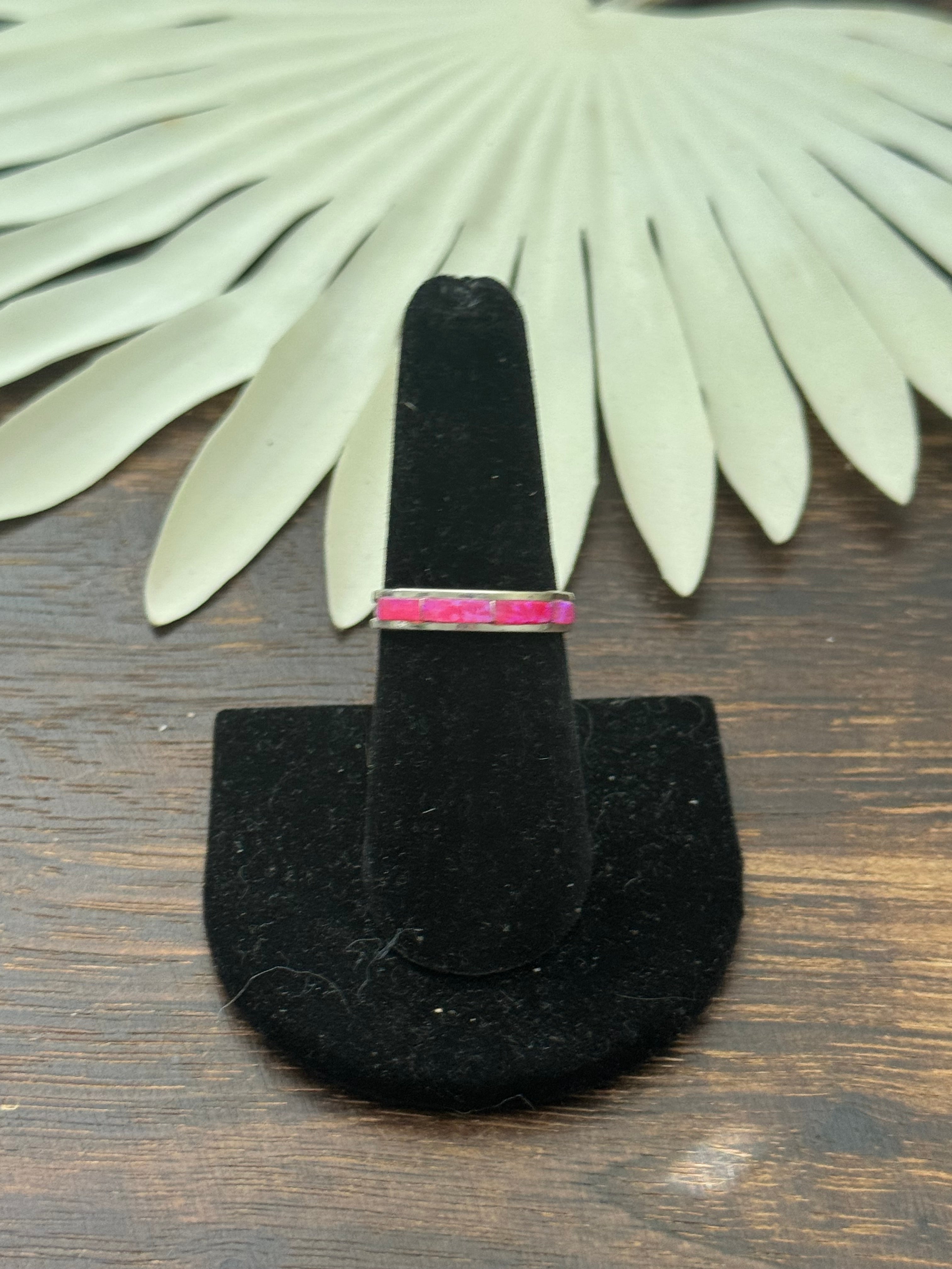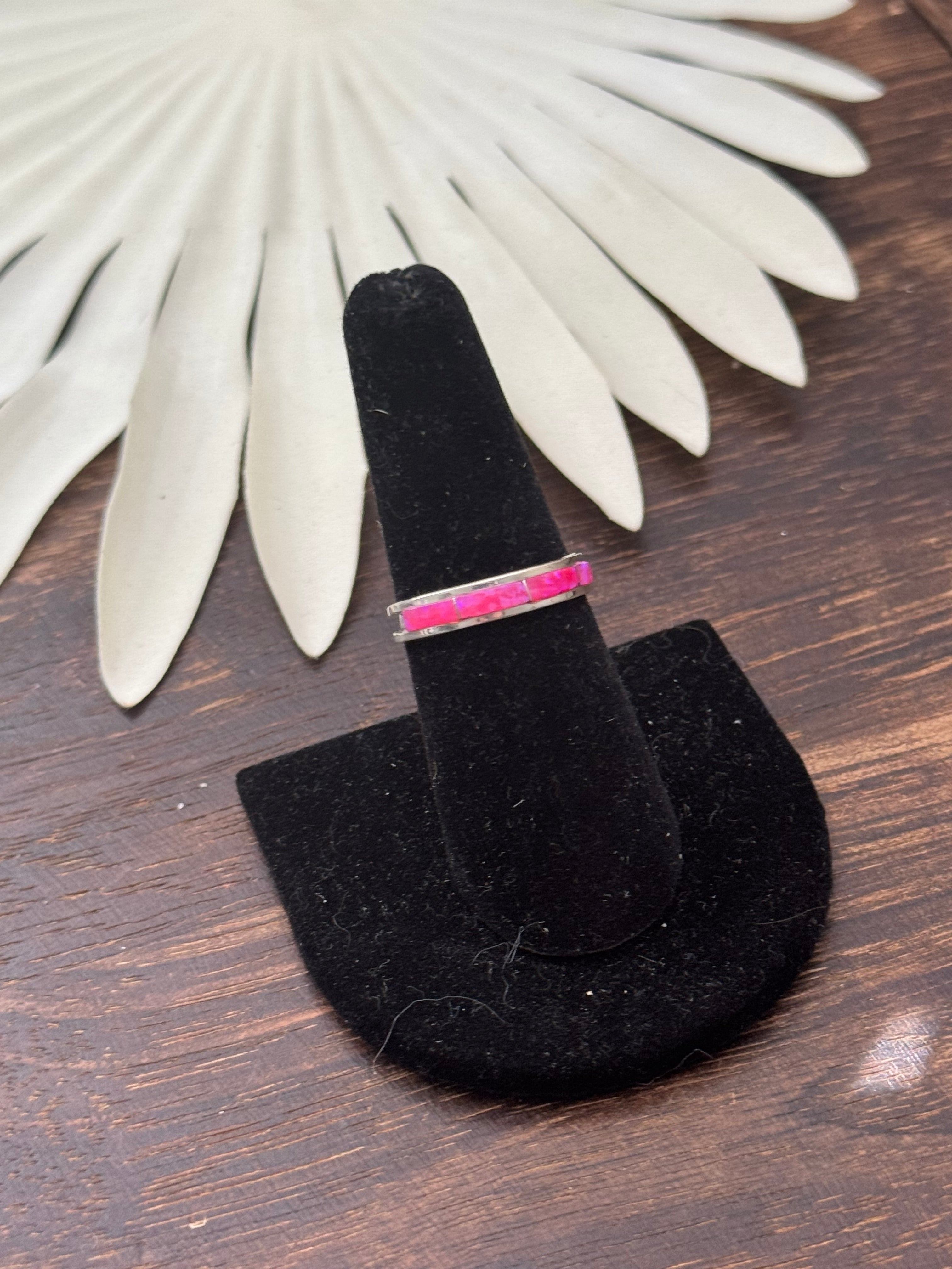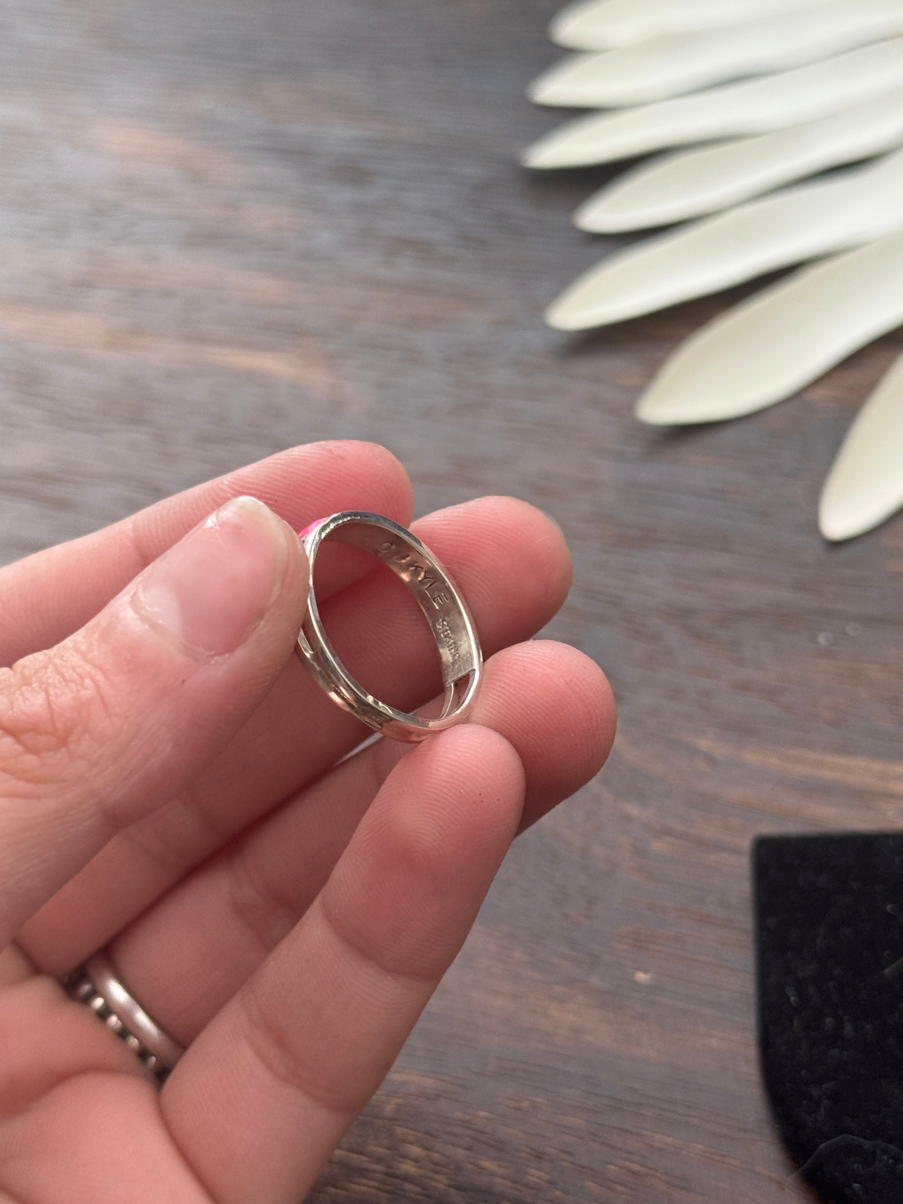Navajo Made Pink (Man-Made) & Sterling Silver Ring. It measures just under 1/4 of an inch long. Signed by the artist and stamped sterling silver.