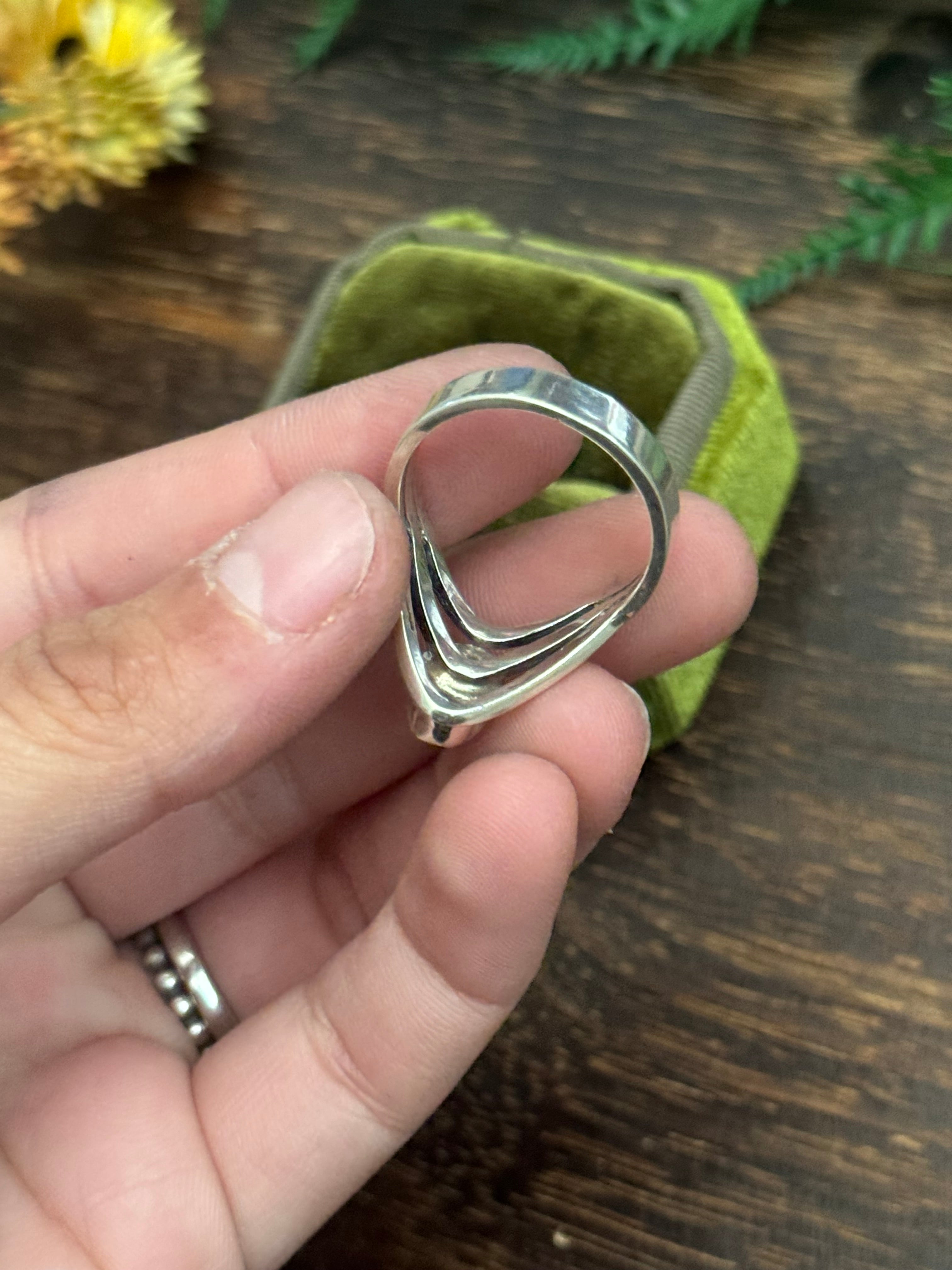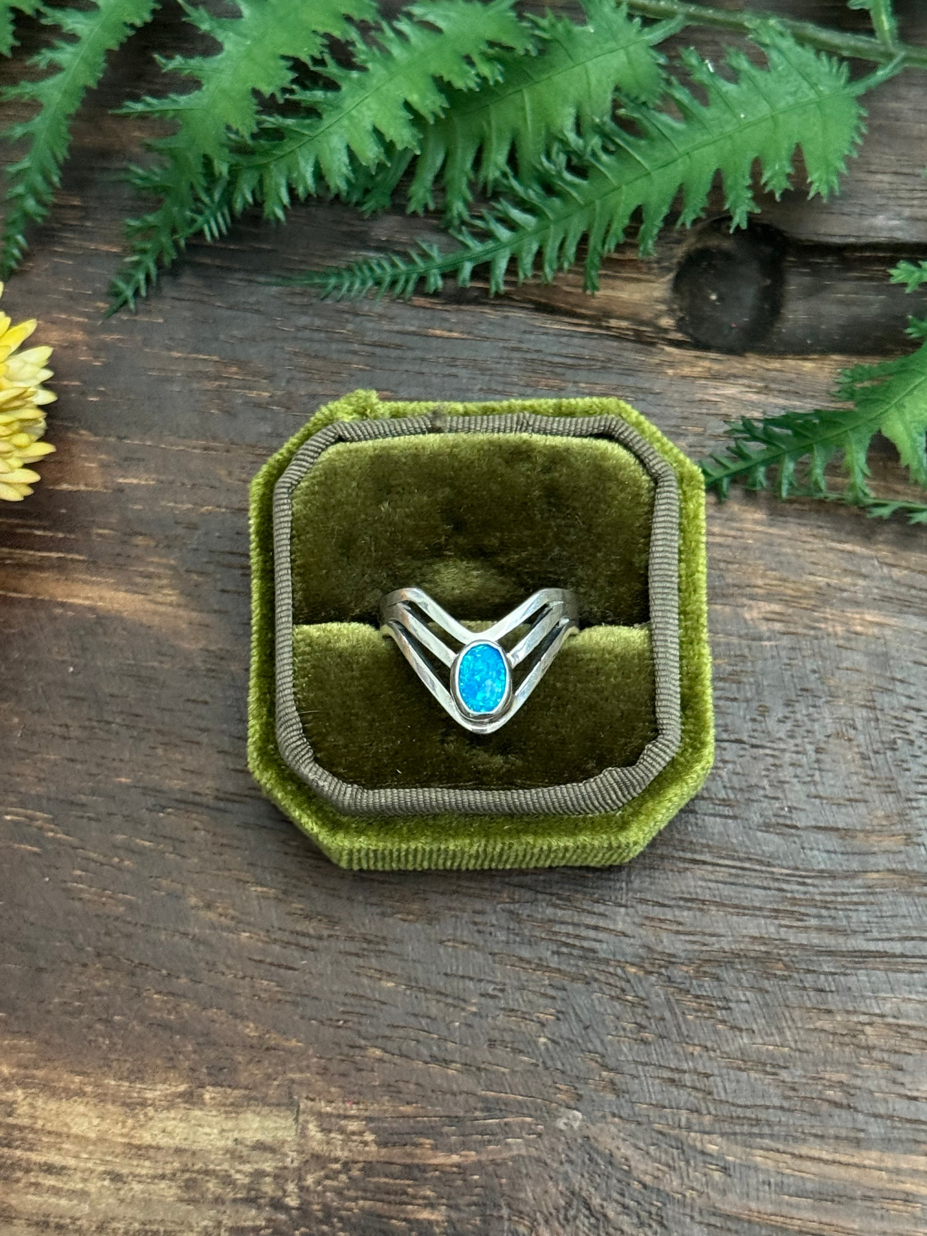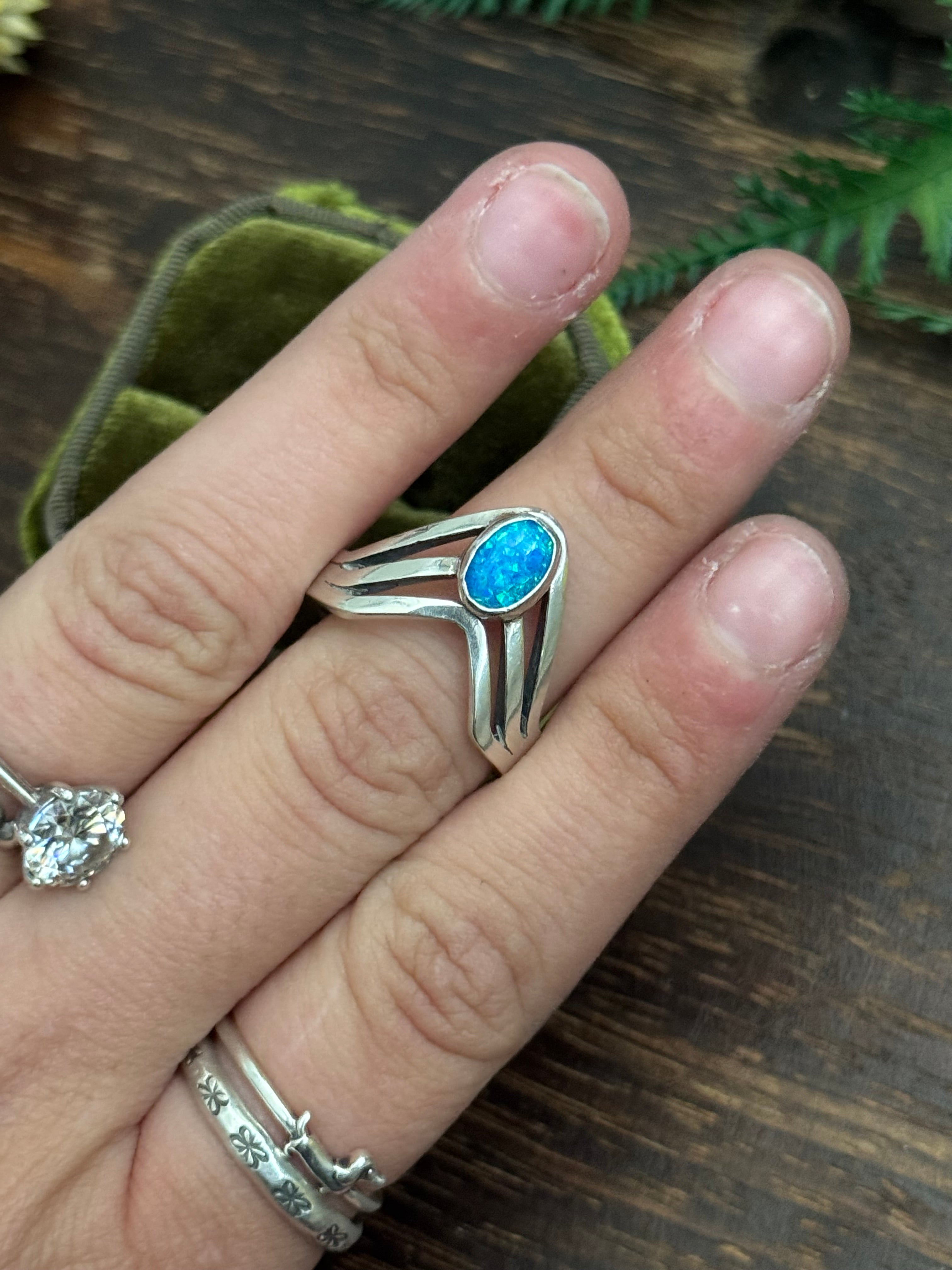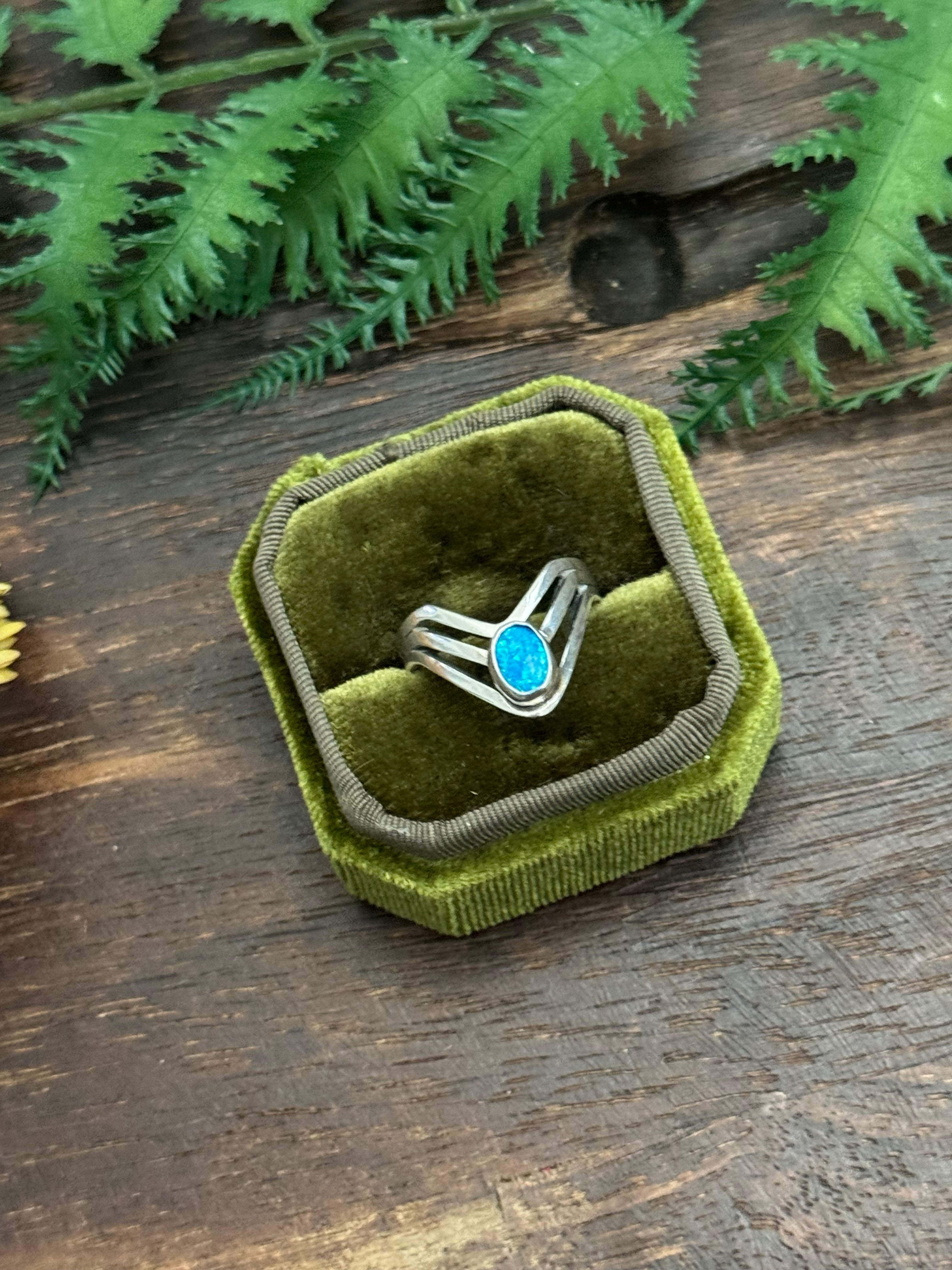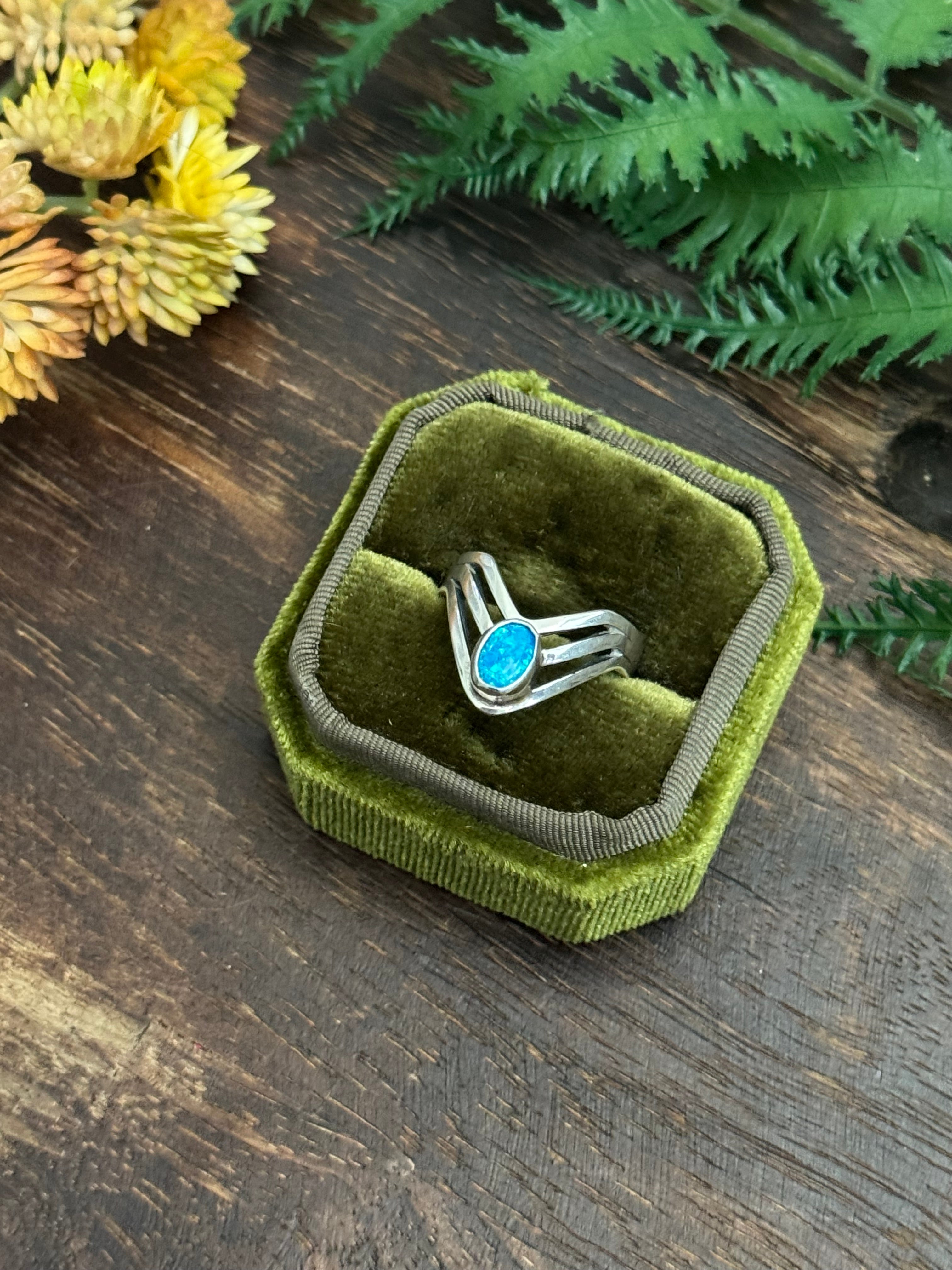 Ben Jimenez Blue Opal (Man-Made) & Sterling Silver Ring. It measures just under 1/2 of an inch long. Signed by artist and stamped sterling silver.