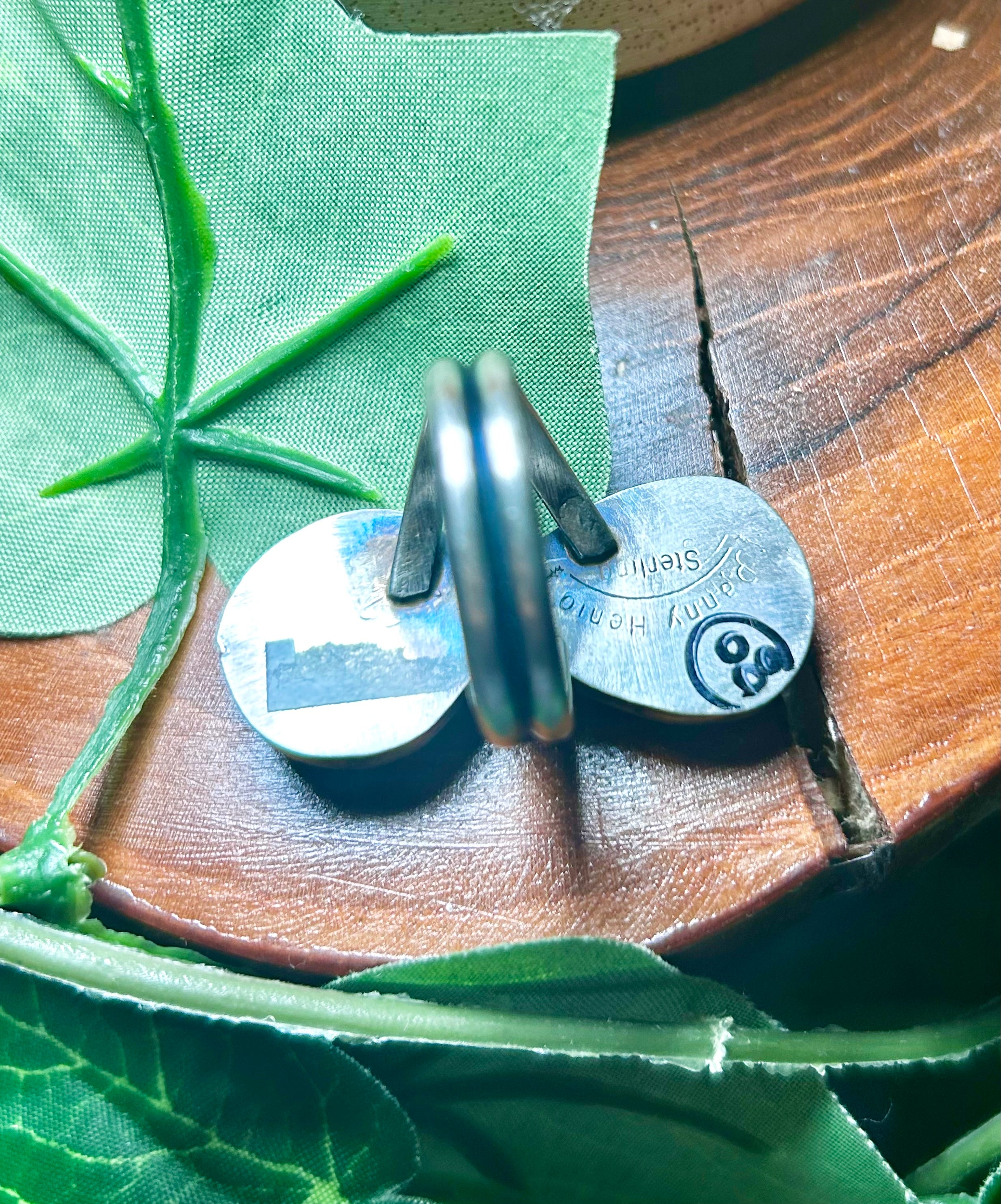 Danny Henio Blue Ridge & Sterling Silver Adjustable Ring. It measures 1 1/2 inches long and 5/8 of an inch wide. Signed by the artist and stamped sterling silver.