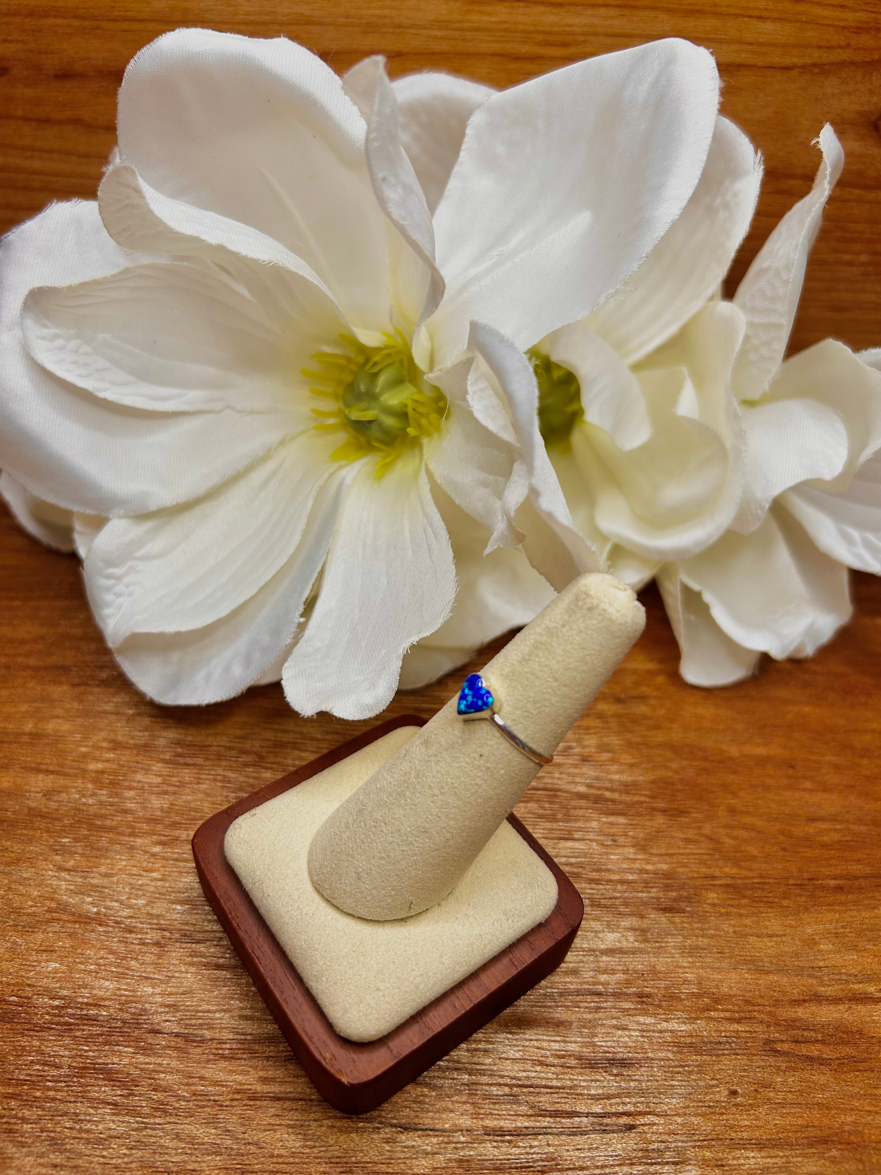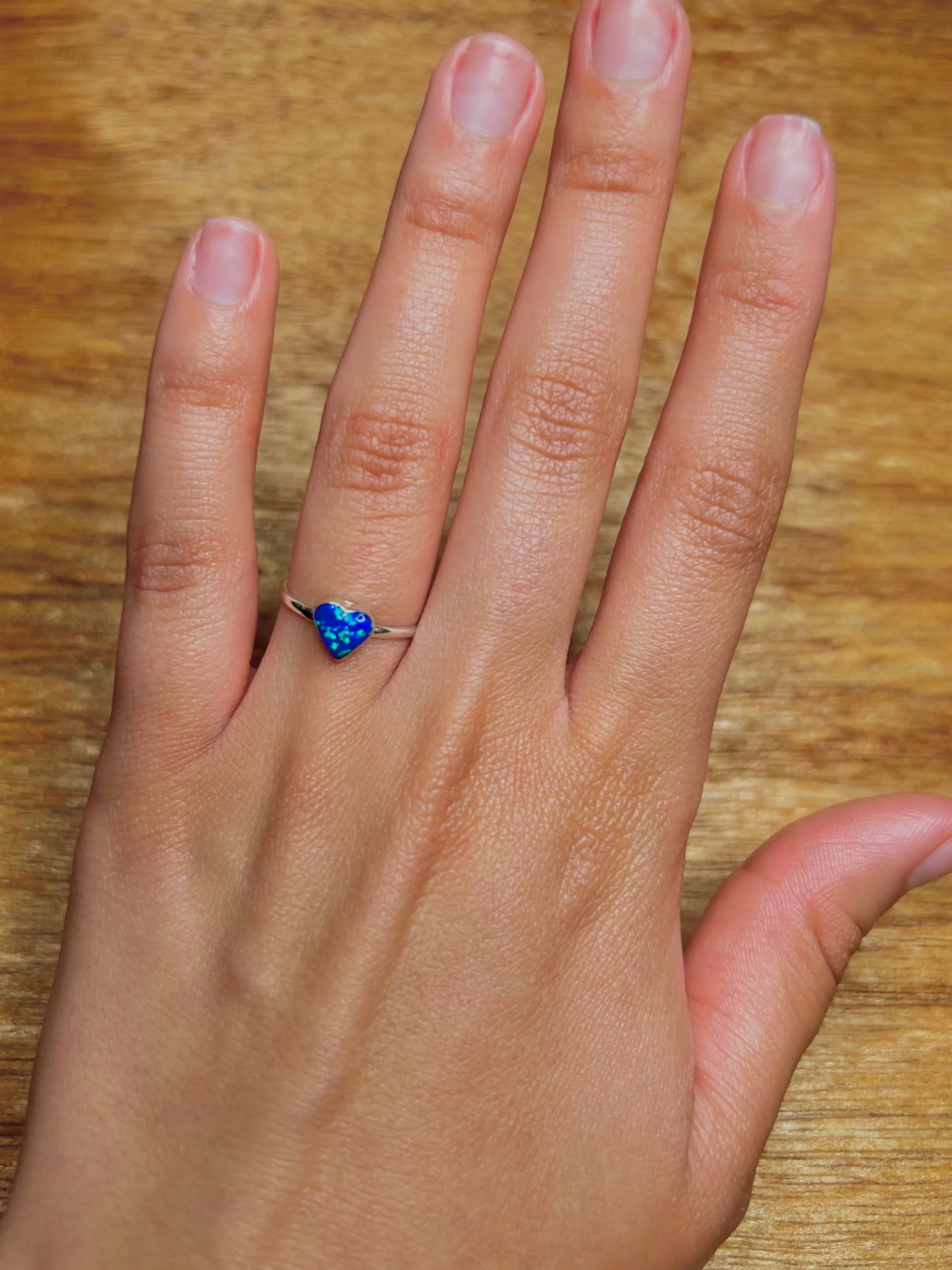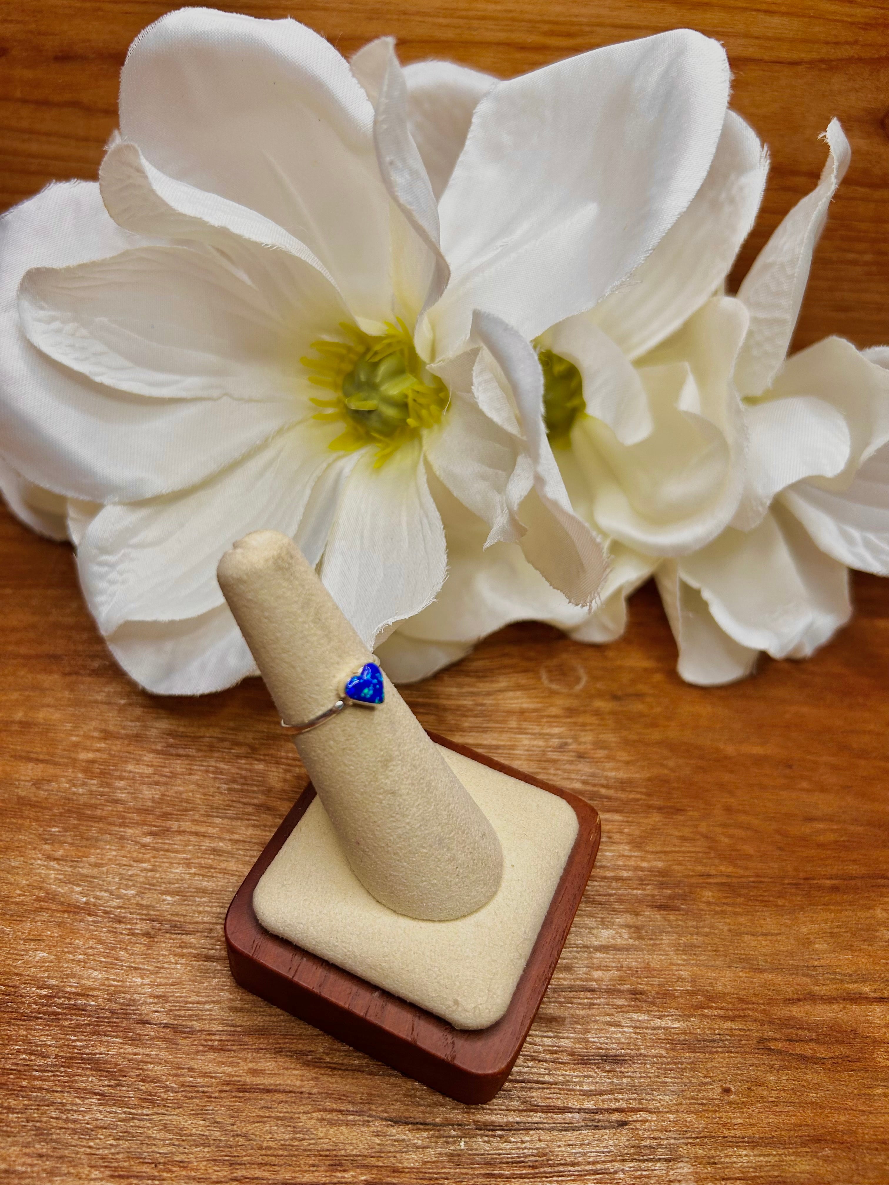 Navajo Made Opal (man-made) & Sterling Silver Heart Ring. It measures 3/8 of an inch long and 3/8 of an inch wide. Signed by the artist and stamped sterling silver. Stones will differ due to natural stones.
