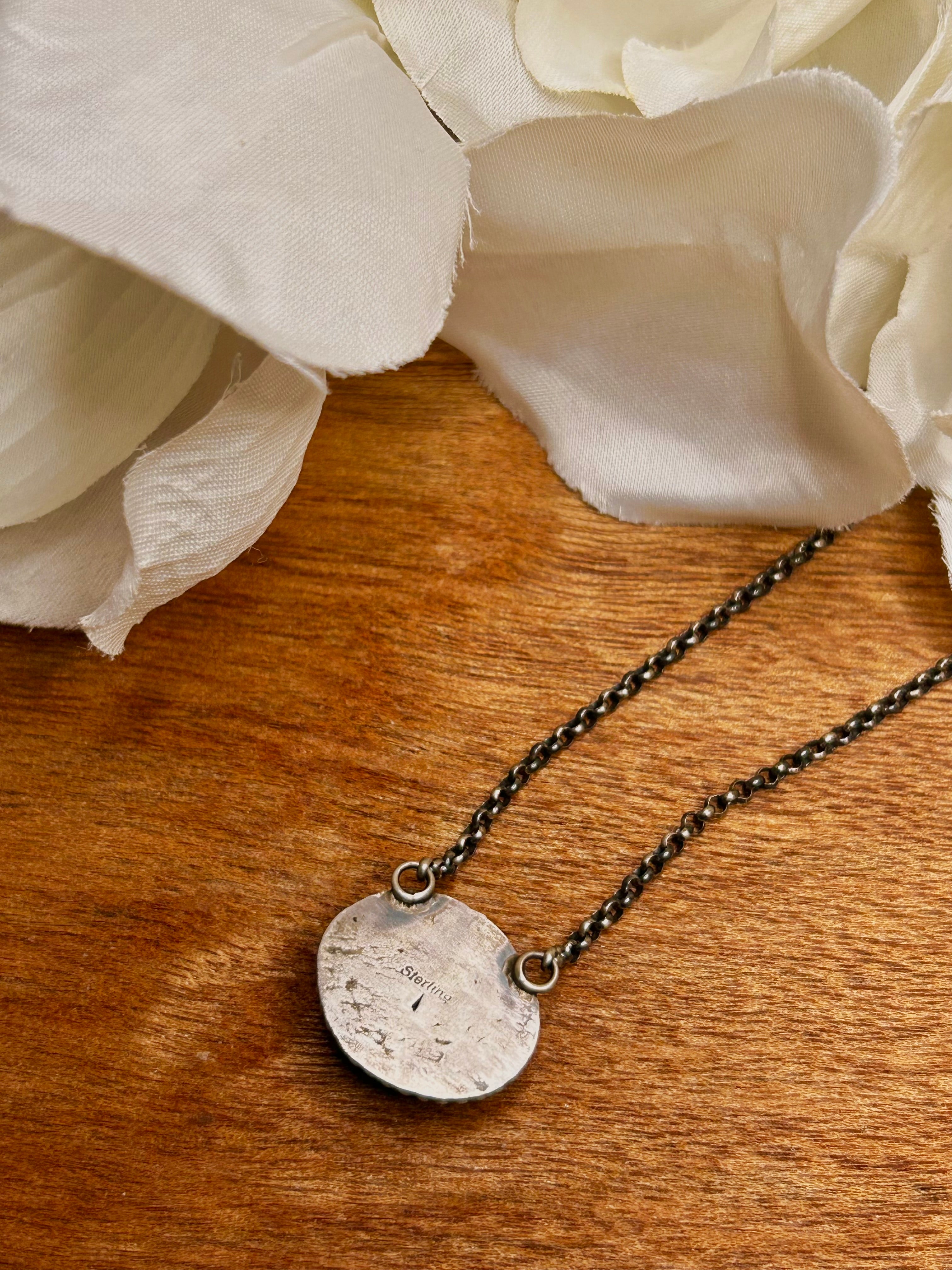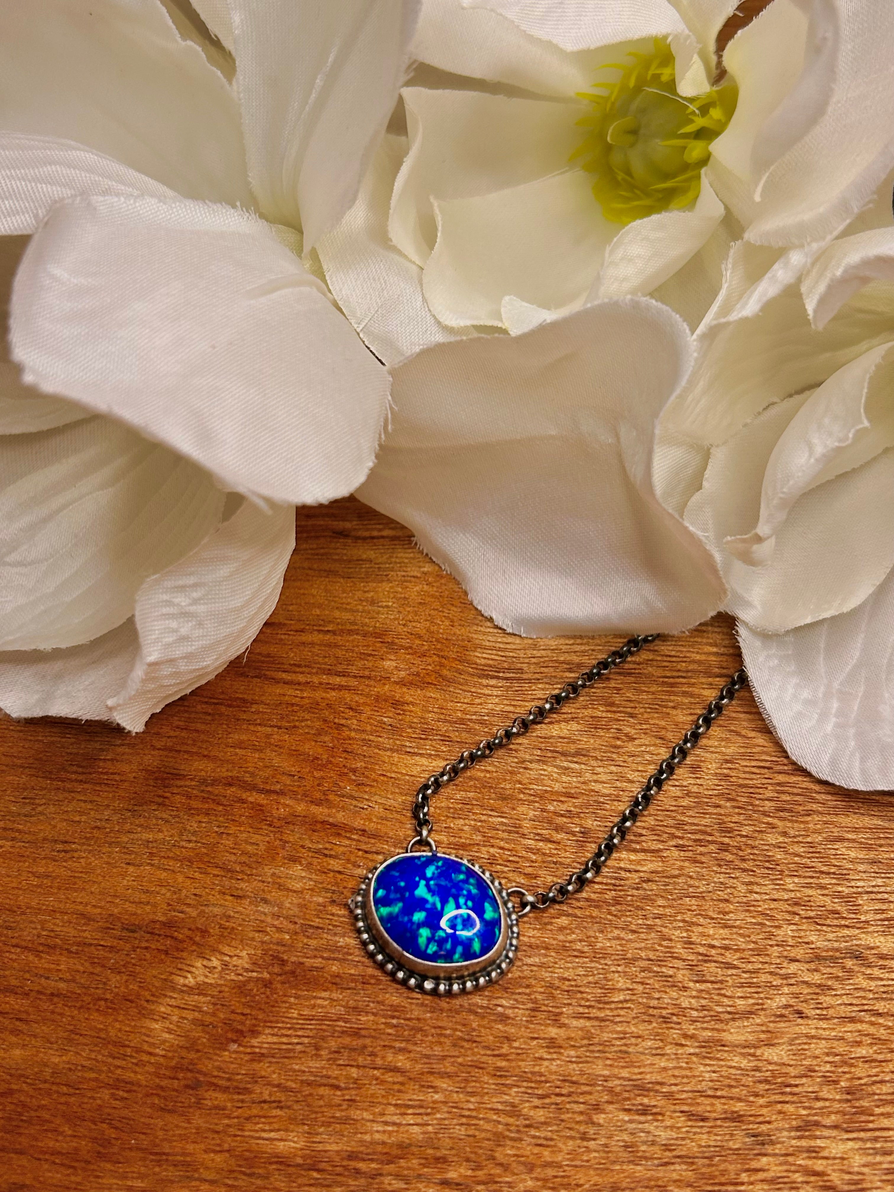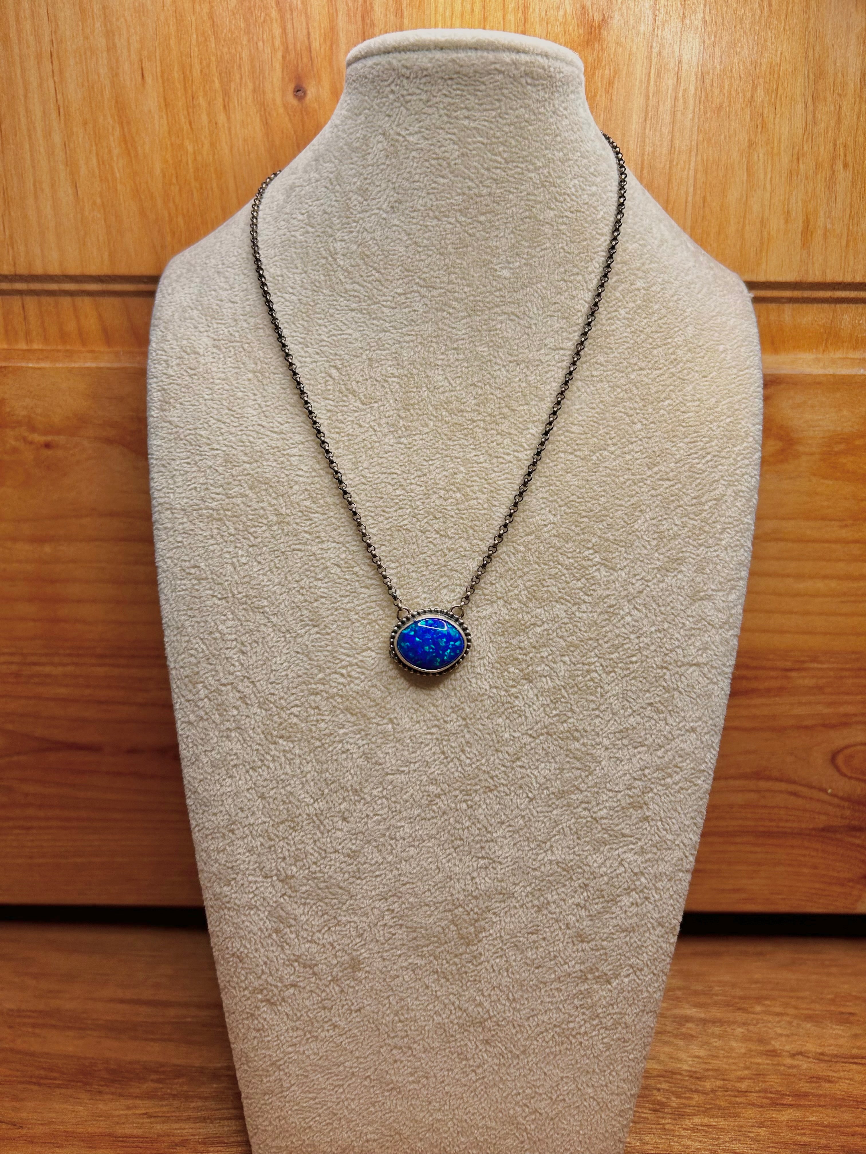Navajo Made Opal & Sterling Silver Necklace. It measures 19 1/4 inches long with hang while the chain measures 18 inches long. Signed by the artist and stamped sterling silver.