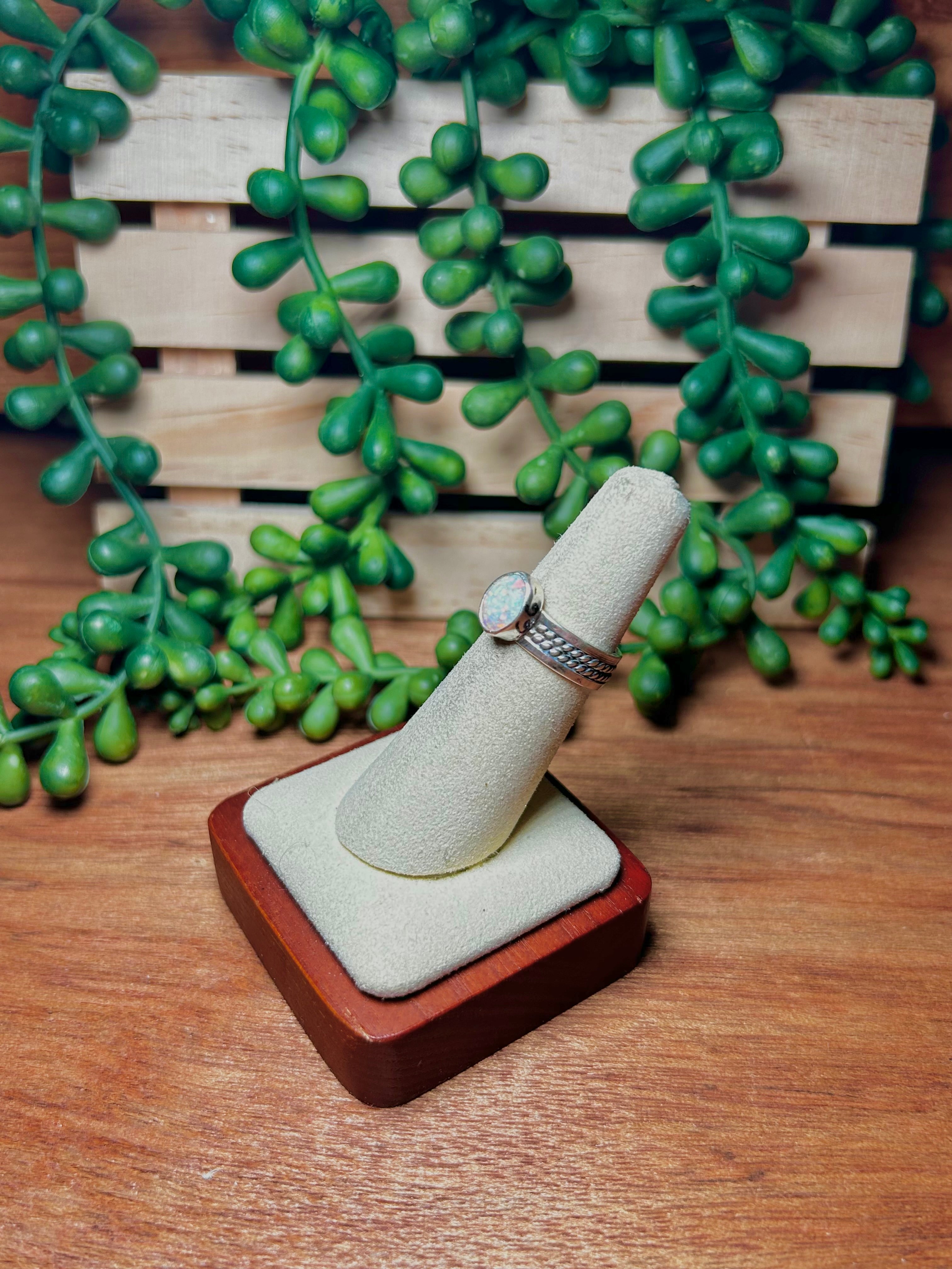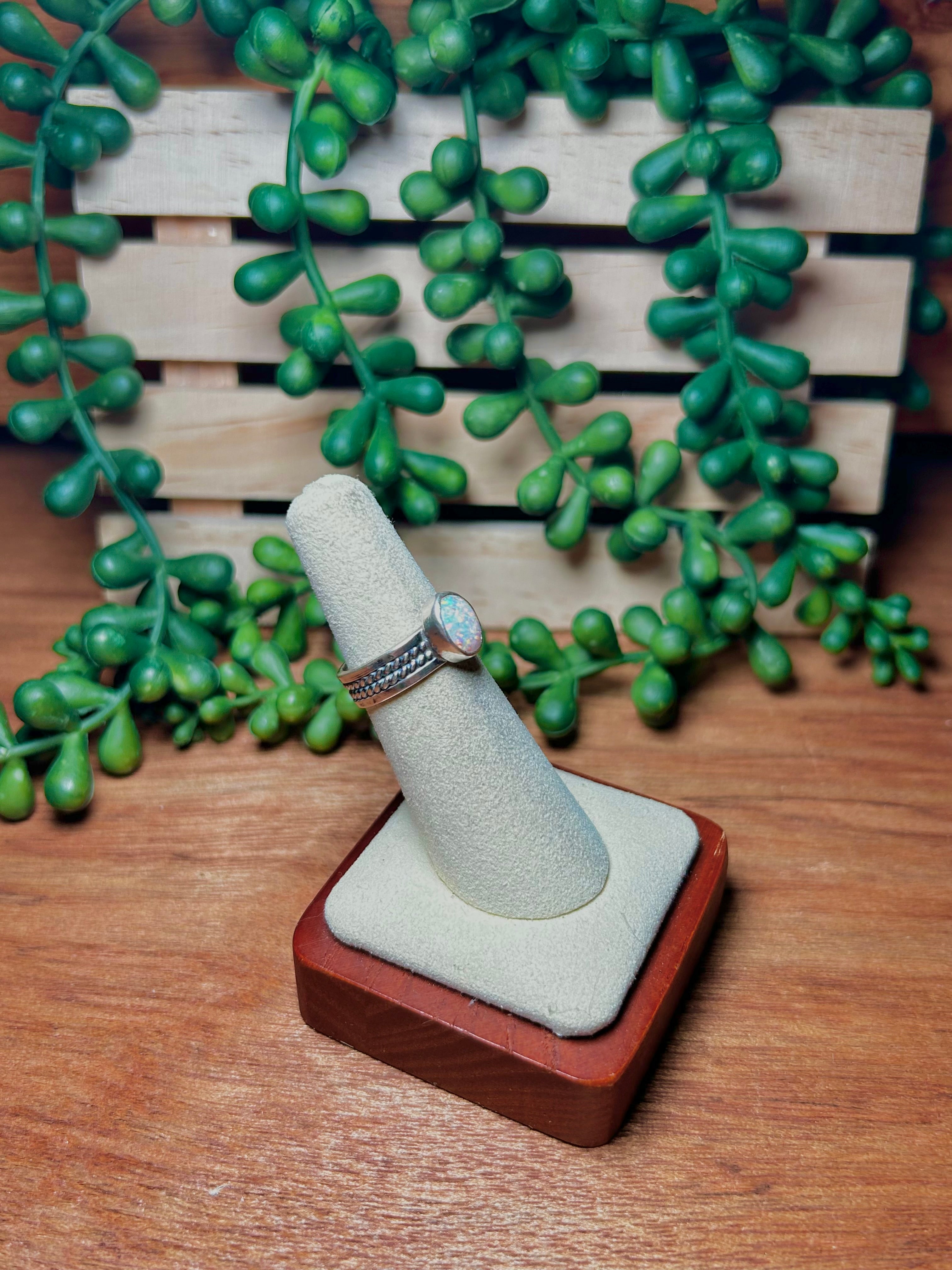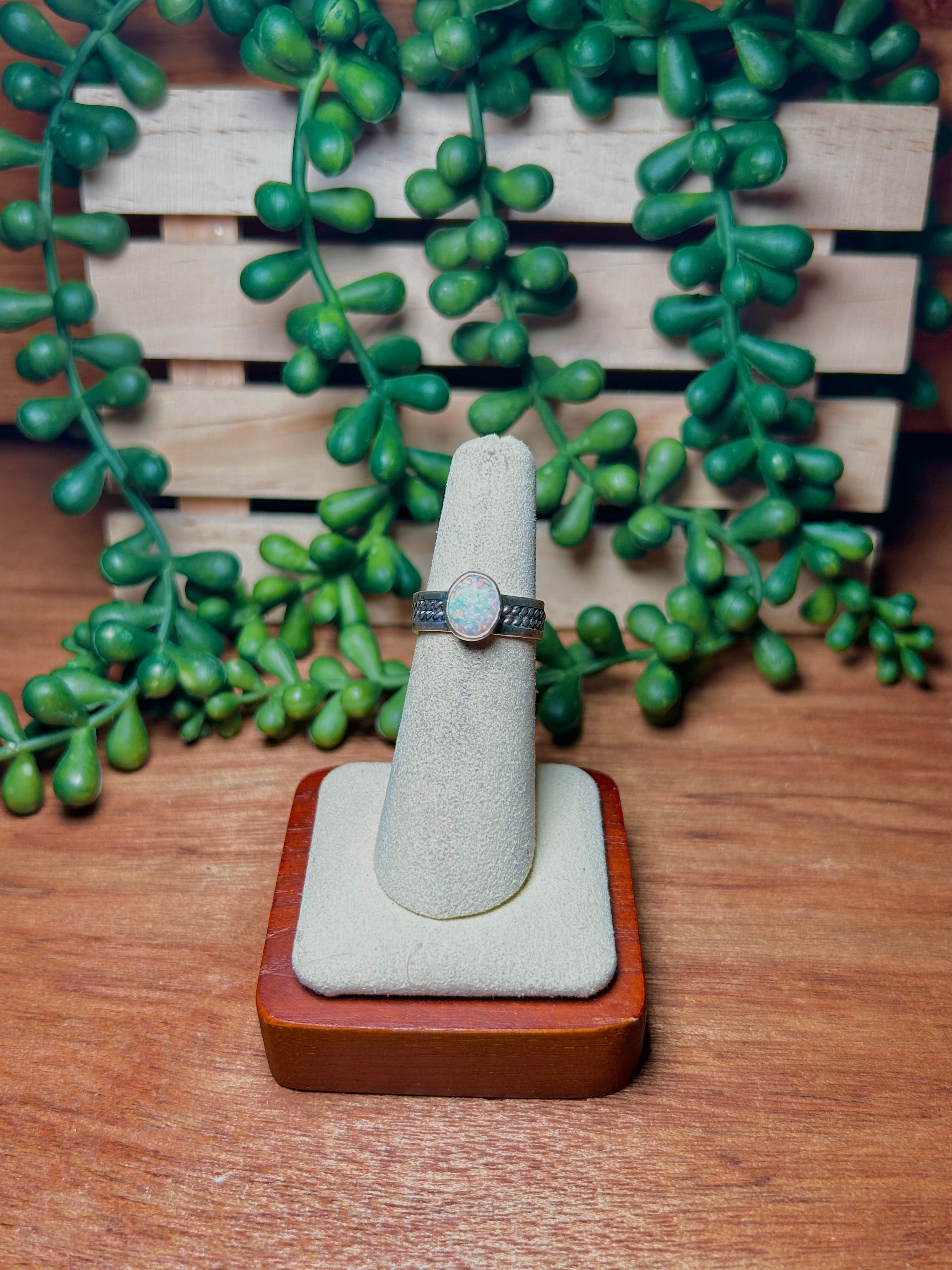 Navajo Made Opal & Sterling Silver Ring. It measures 3/8 of an inch long and 1/4 of an inch wide. Signed by the artist and stamped sterling silver.