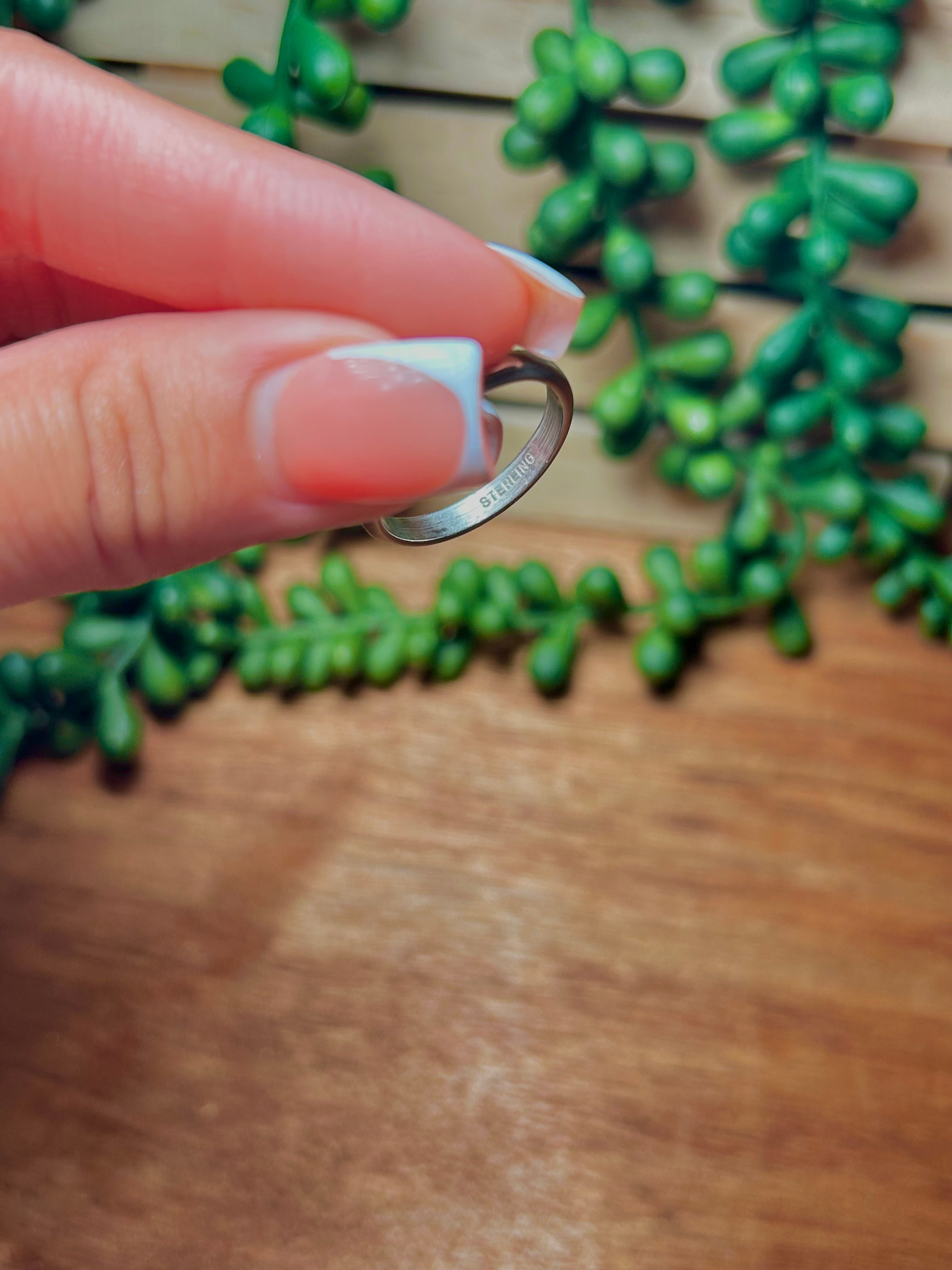 Navajo Made Pink Conch & Sterling Silver Ring Size 8.5. It measures a little over 3/8 of an inch long and 3/8 of an inch wide. Signed by the artist and stamped sterling silver.