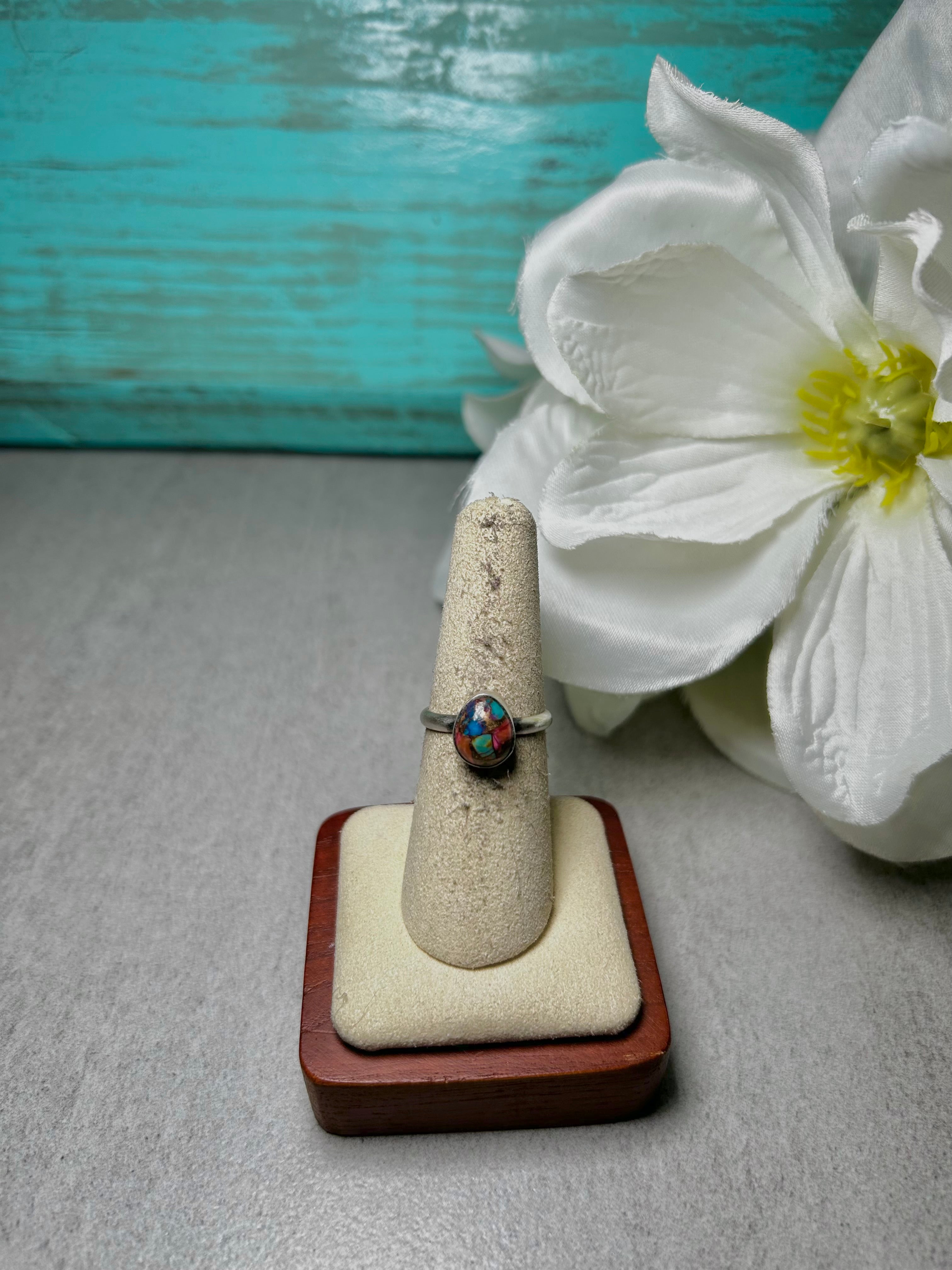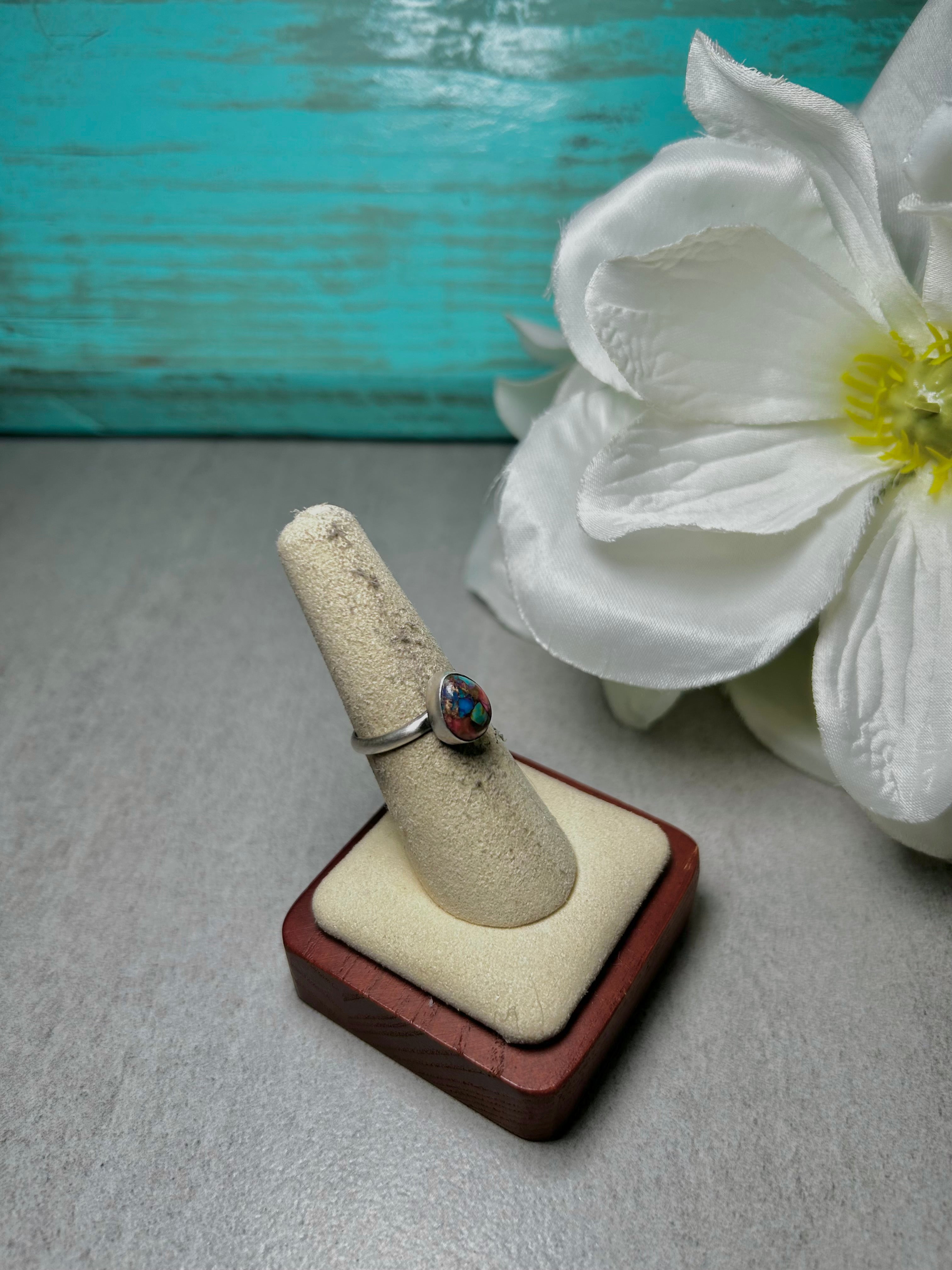 Navajo Made Mohave turquoise & Sterling Silver Ring Size 6.75. It measures 1/2 of an inch long and 3/8 of an inch wide. Signed by the artist and stamped sterling silver.