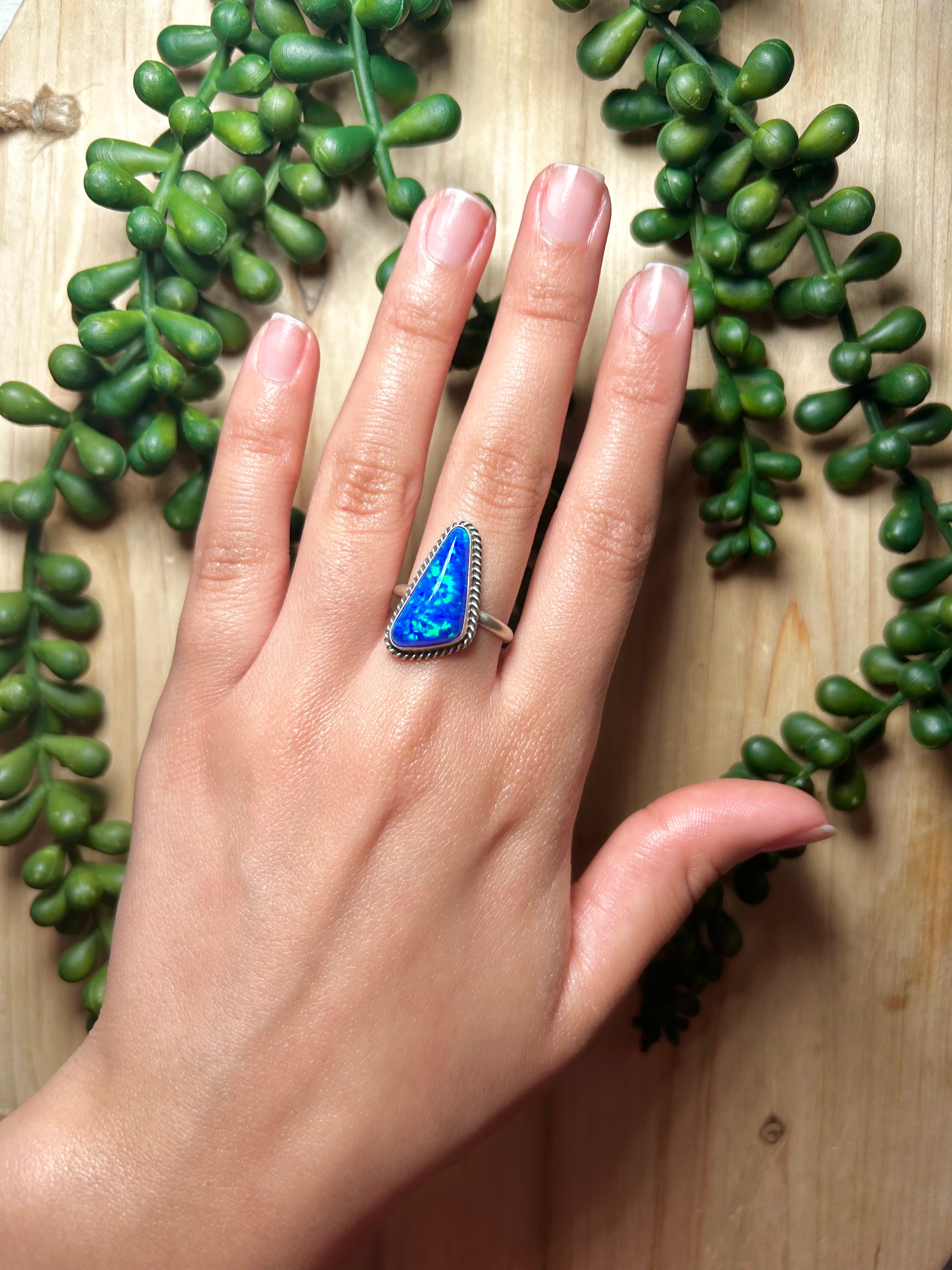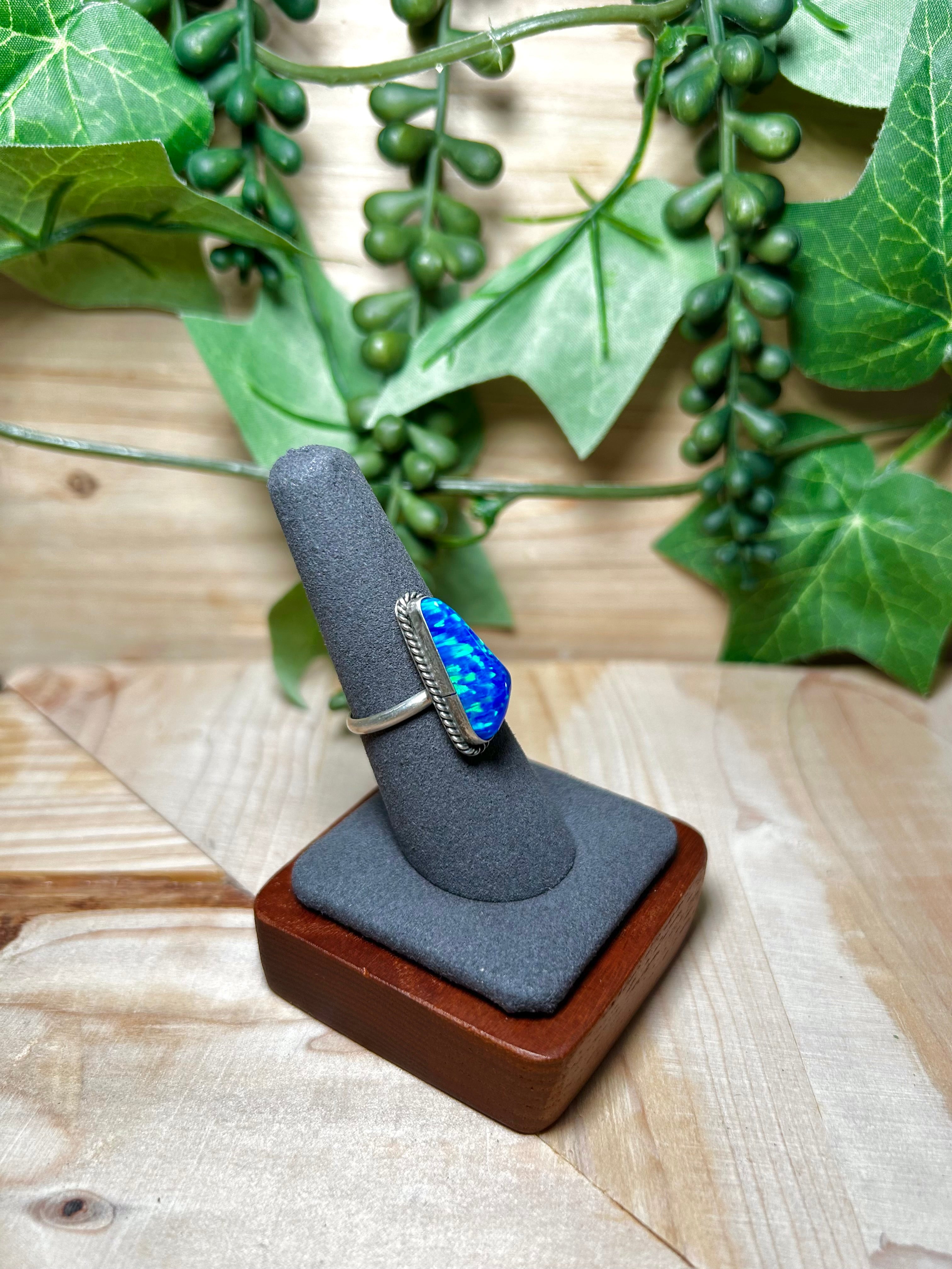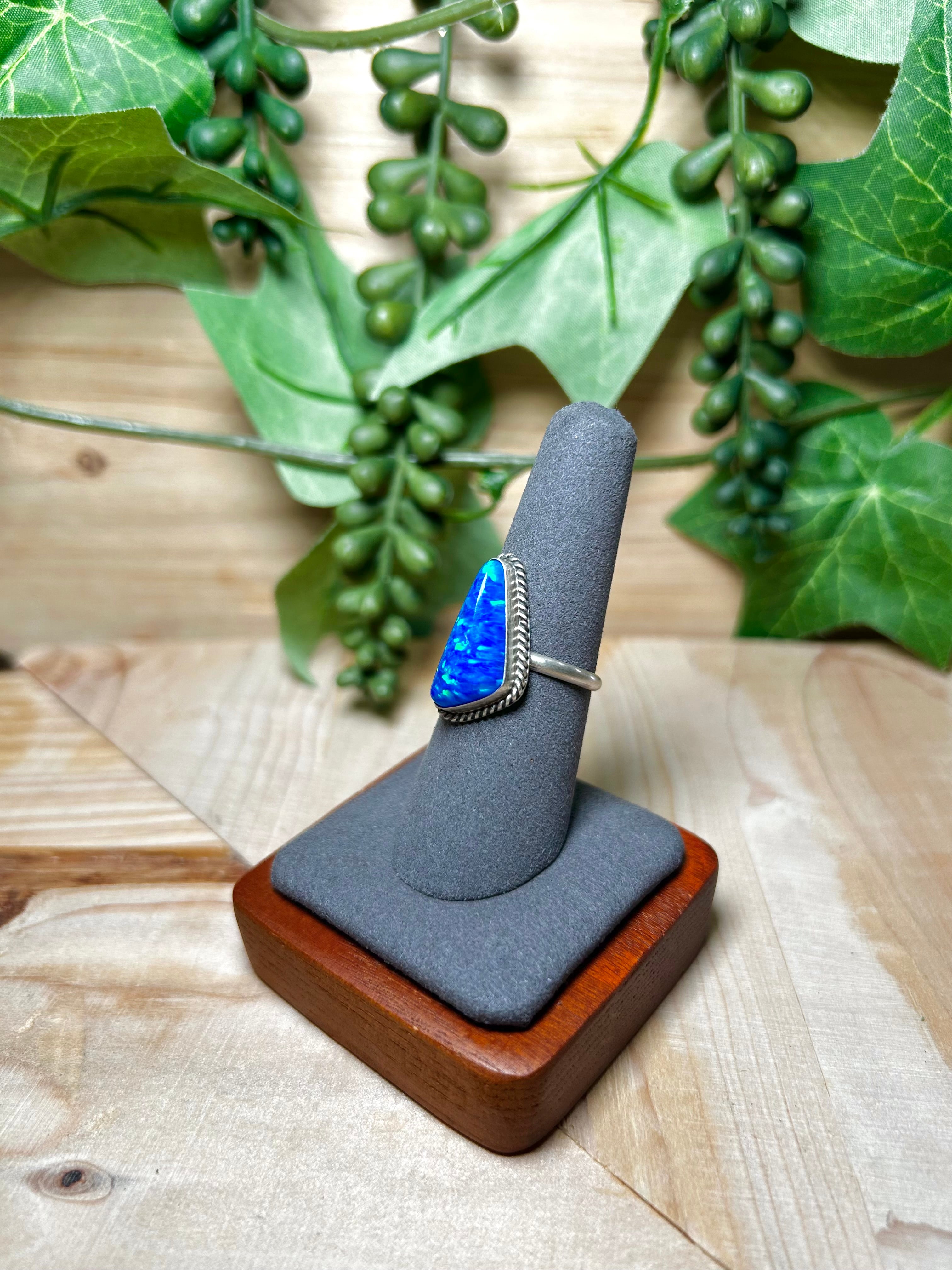 Navajo Man-Made Opal & Sterling Silver Ring Size 8. It measures 7/8 of an inch long and 1/2 of an inch wide. Signed by the artist and stamped sterling silver.