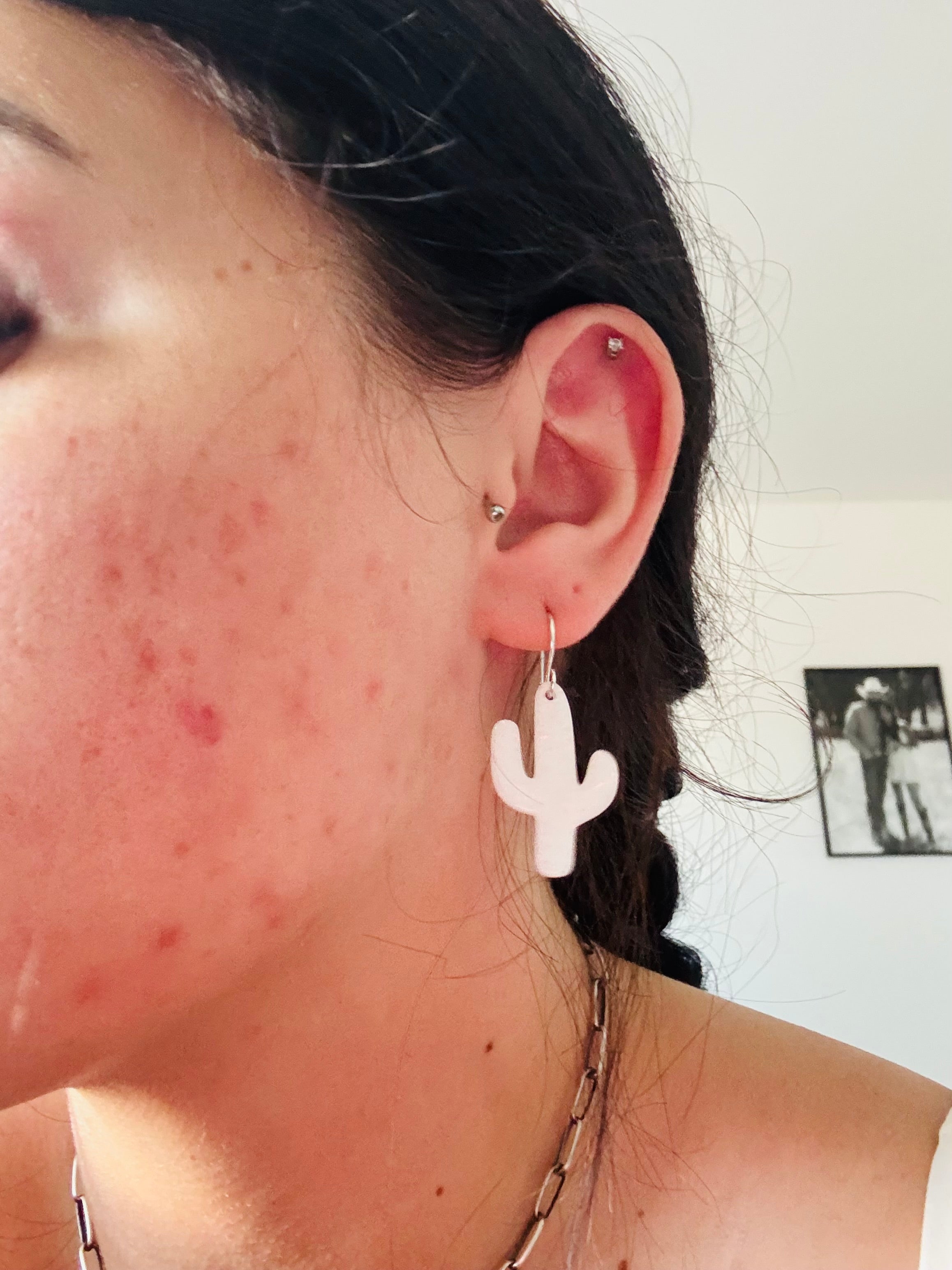 Navajo Made Opal & Sterling Silver Slab Cactus Dangle Earrings. It measures 1 5/8 inches long and 3/4 of an inch wide.