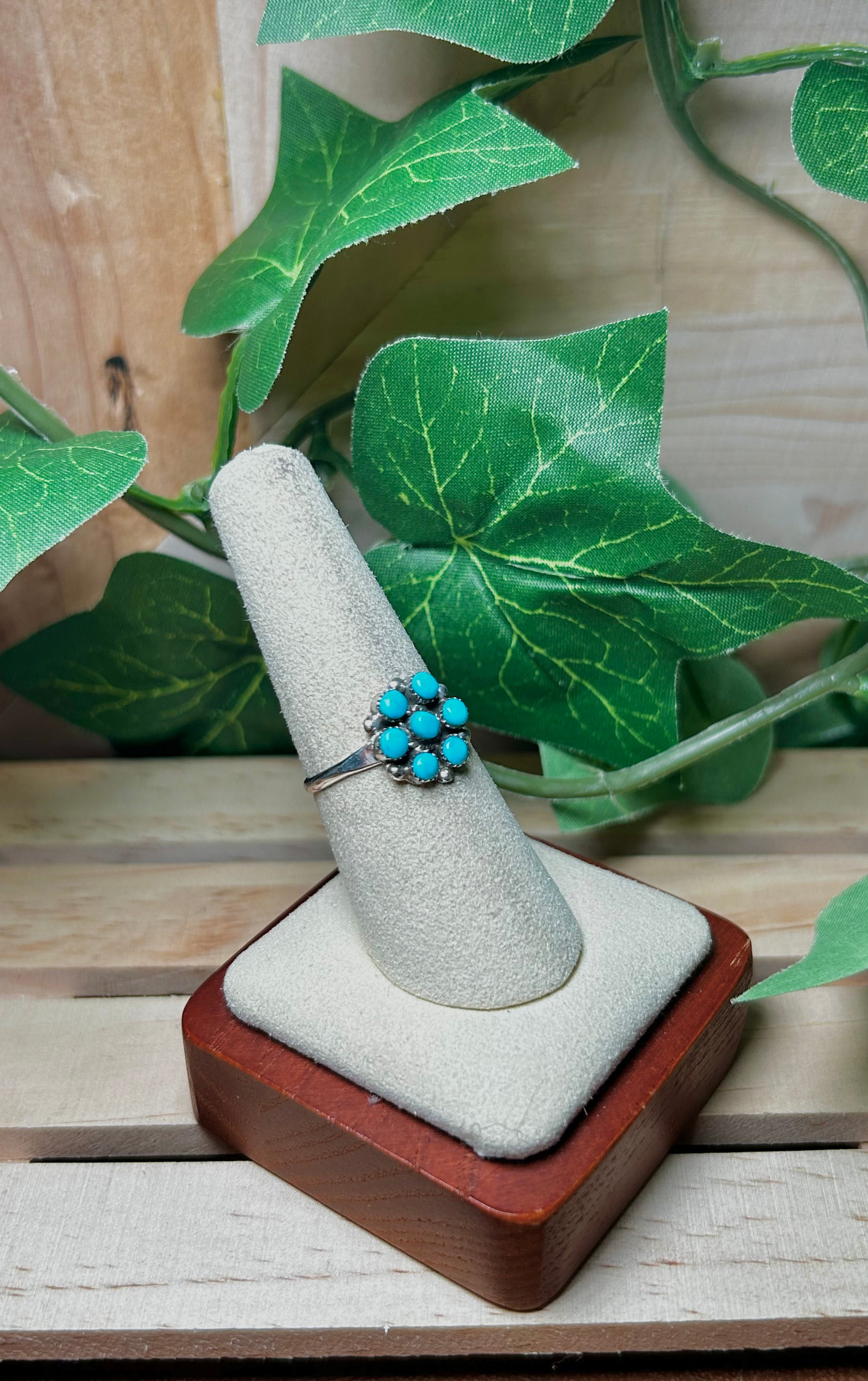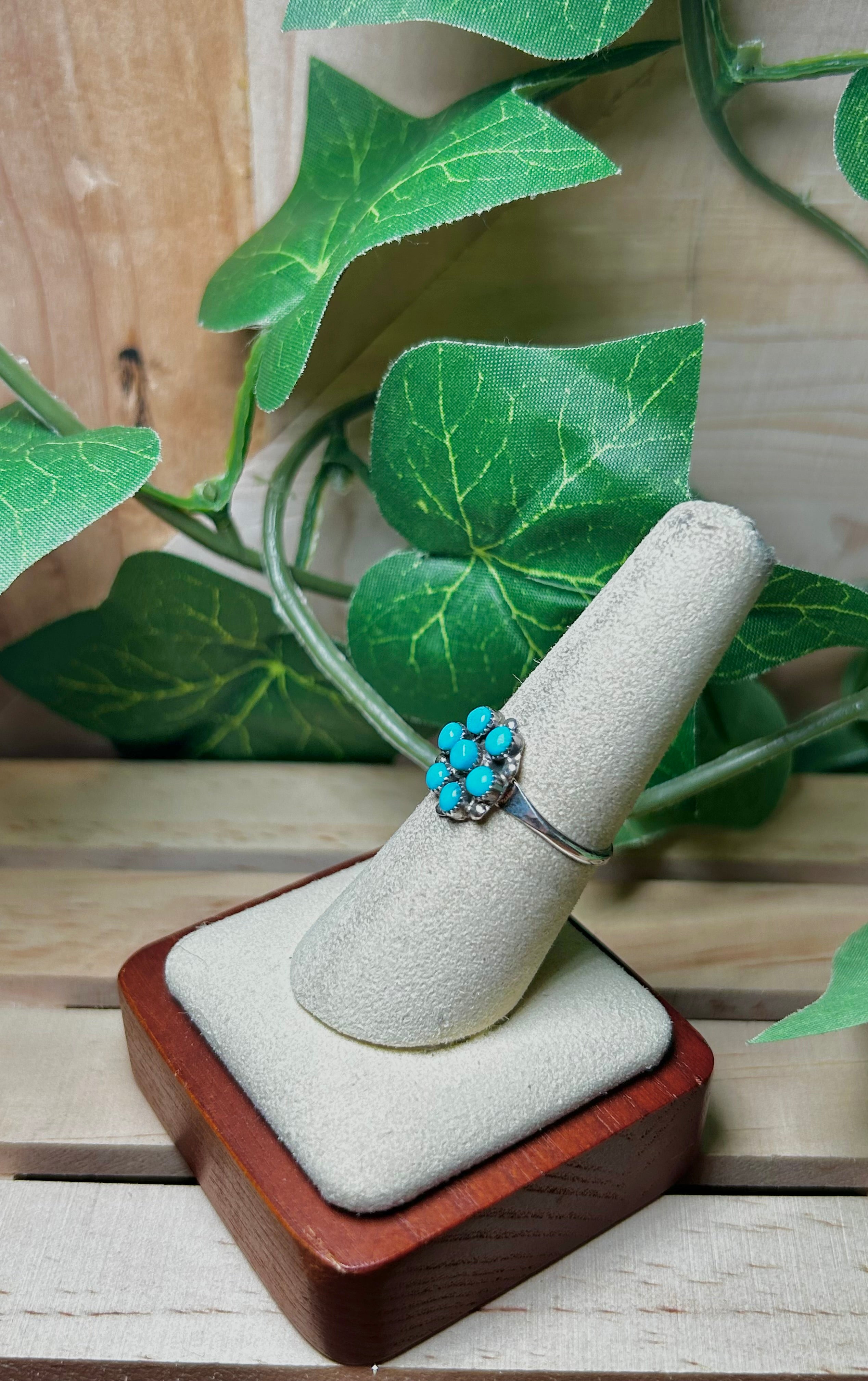 Zuni Made Kingman Turquoise & Sterling Sliver Cluster Ring. It measures 1/2 of an inch long and 1/2 of an inch wide. Signed by the artist and stamped sterling silver.