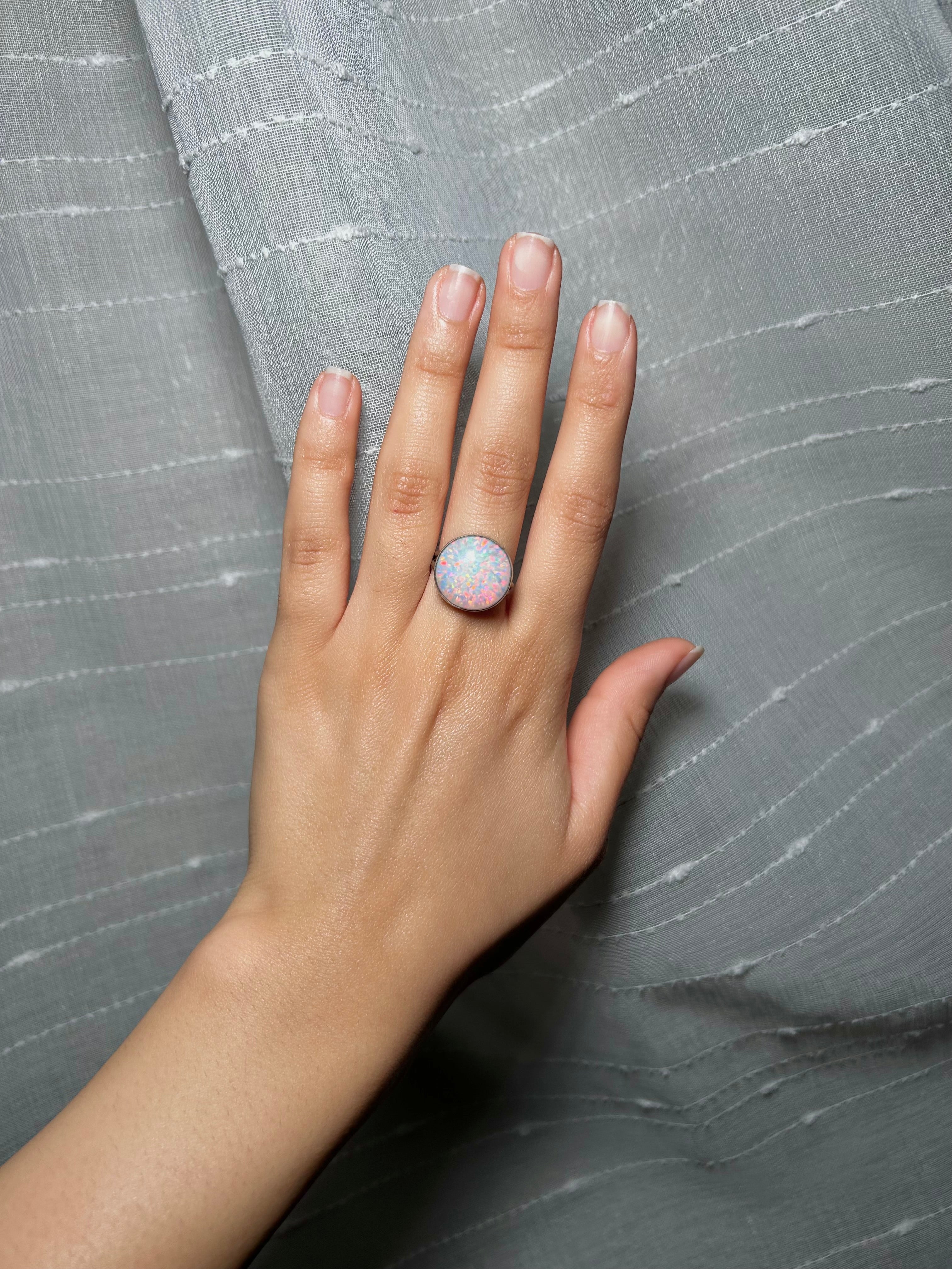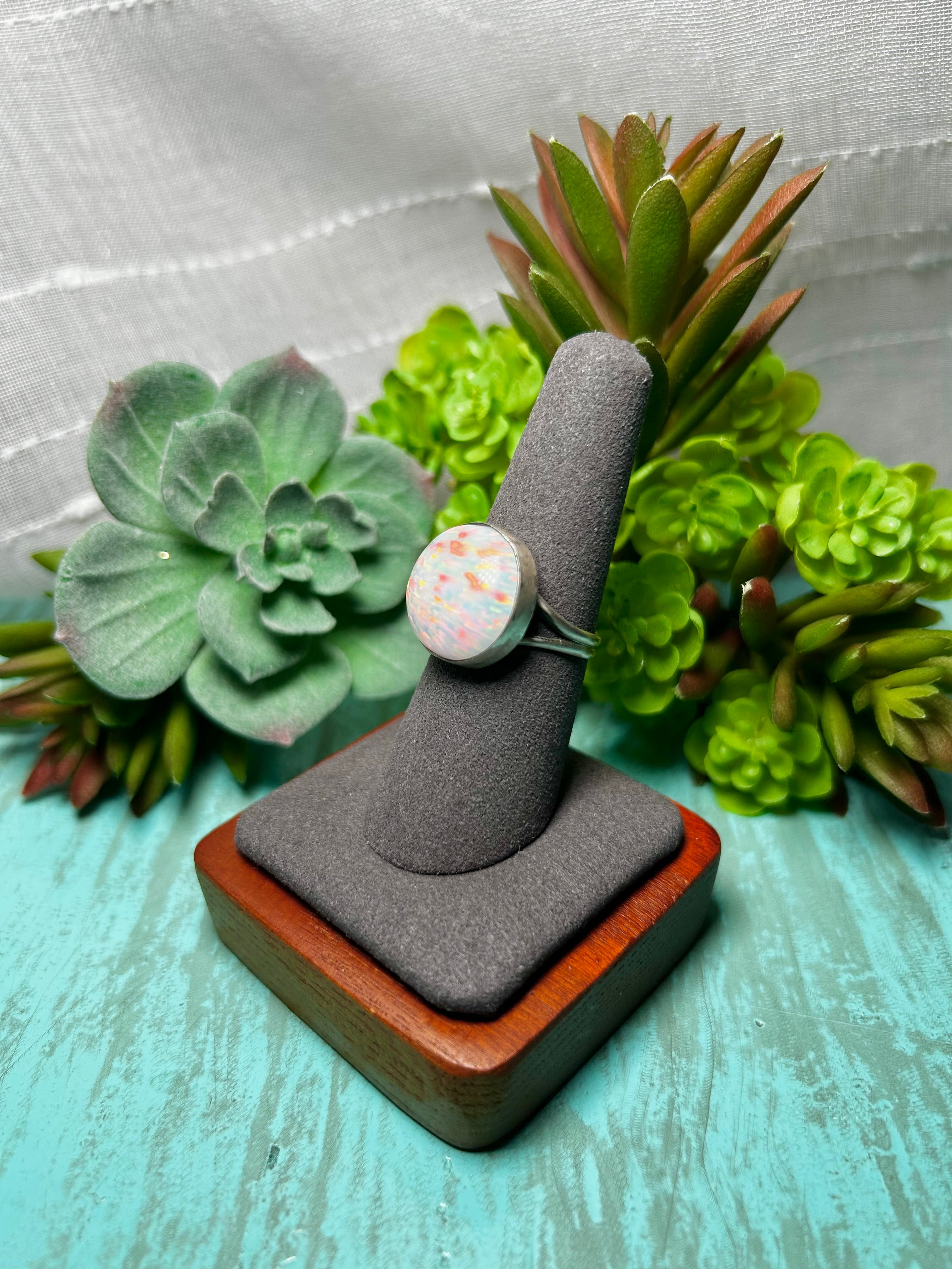 Navajo Man-Made Opal & Sterling Sliver Ring Size 7.75. It measures 5/8 of an inch long and 5/8 of an inch wide. Signed by the artist and stamped sterling silver.