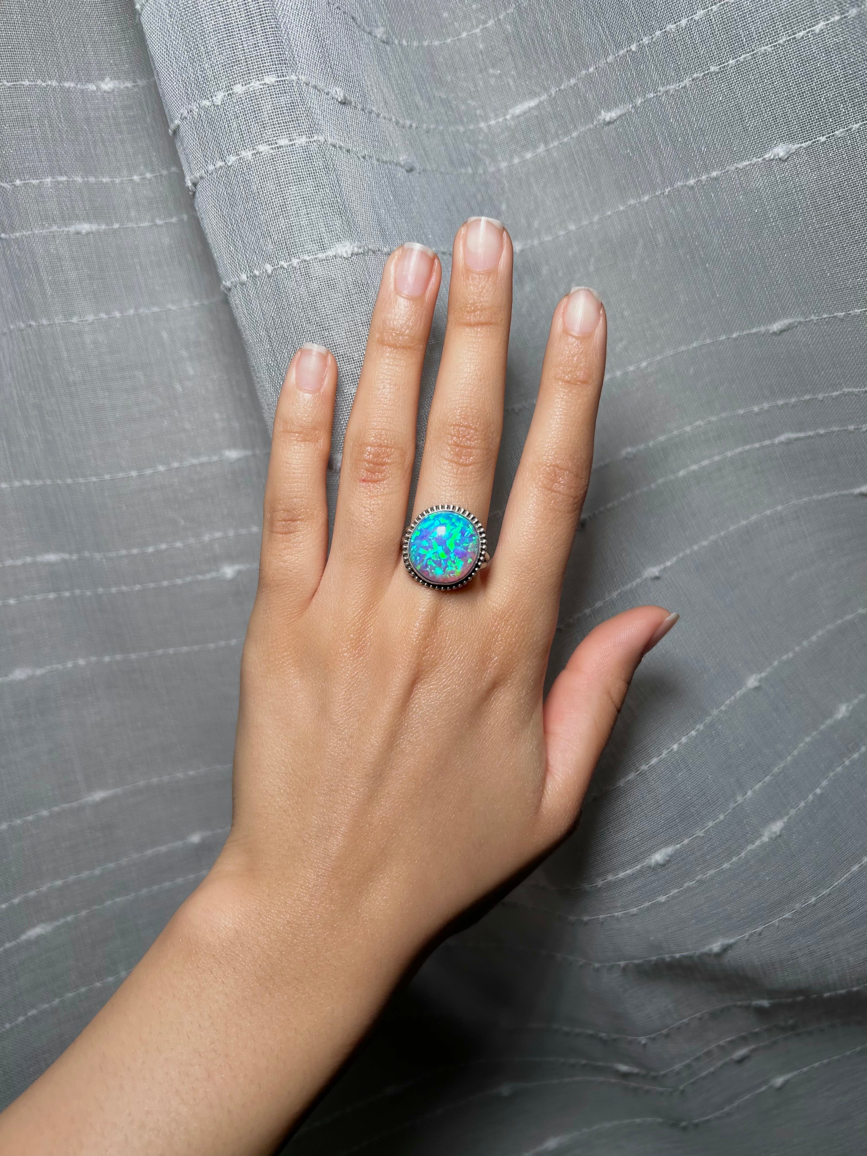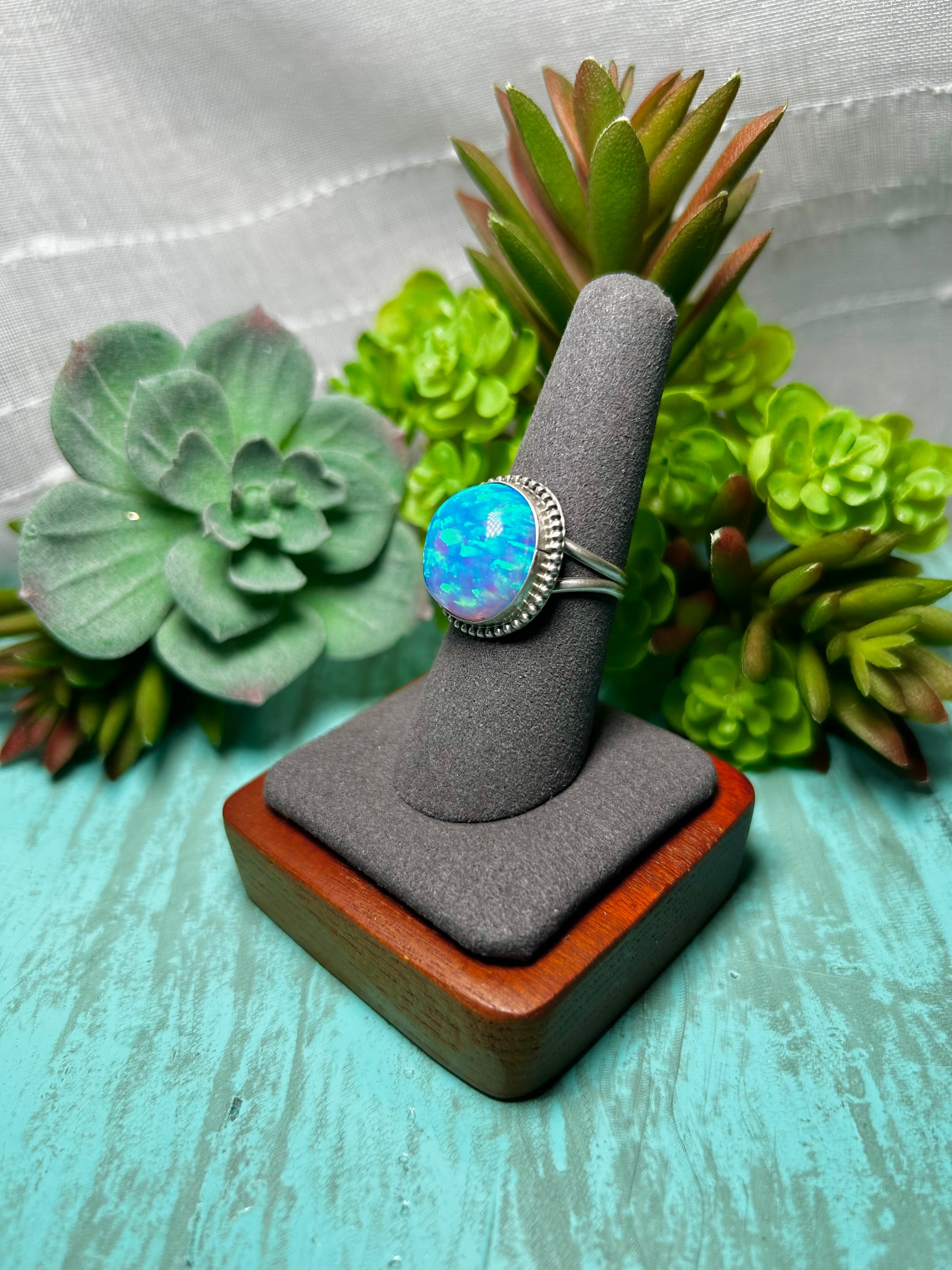 Navajo Man-Made Opal & Sterling Sliver Ring Size 9. It measures 5/8 of an inch long and 5/8 of an inch wide. Signed by the artist and stamped sterling silver.