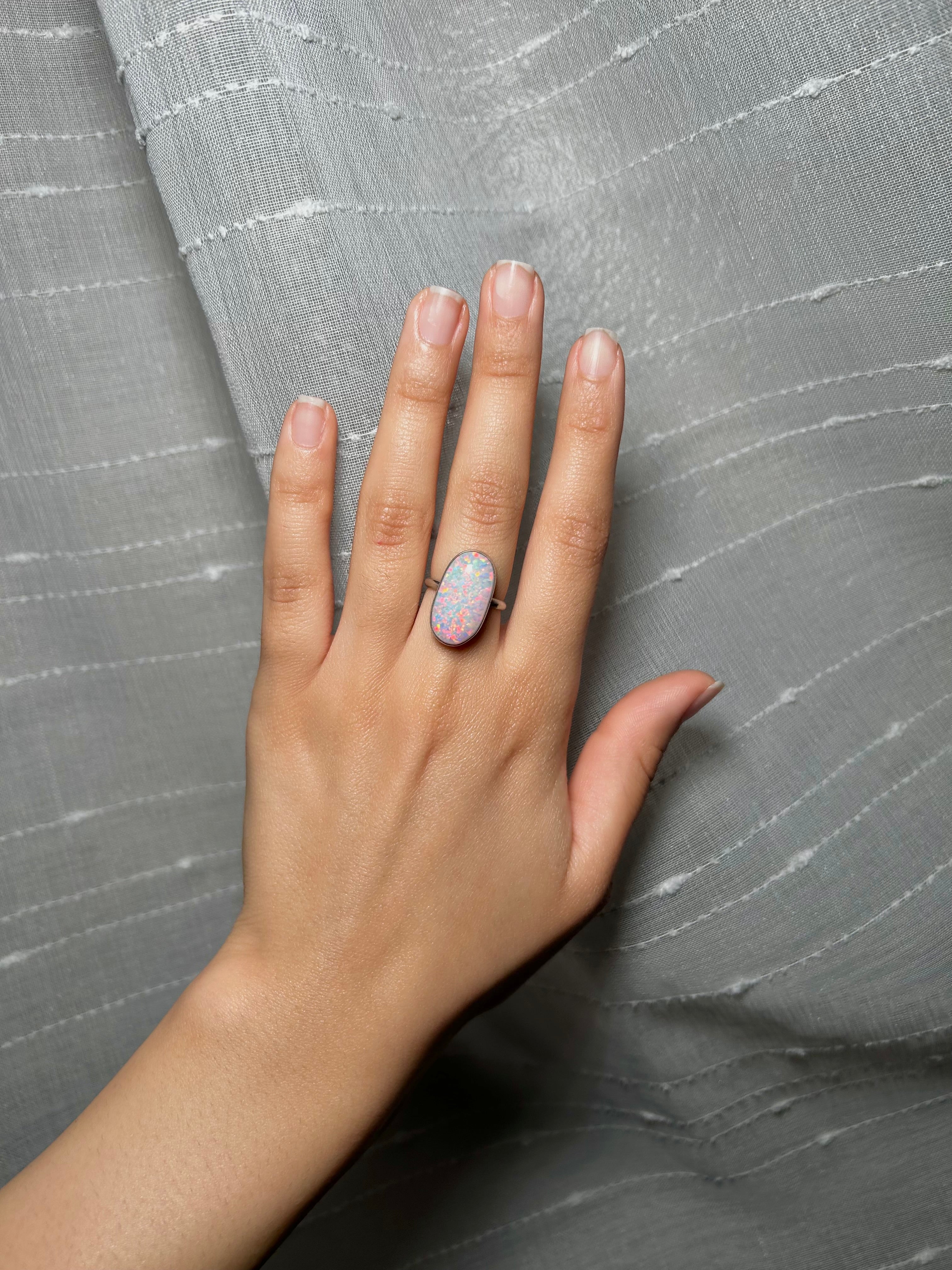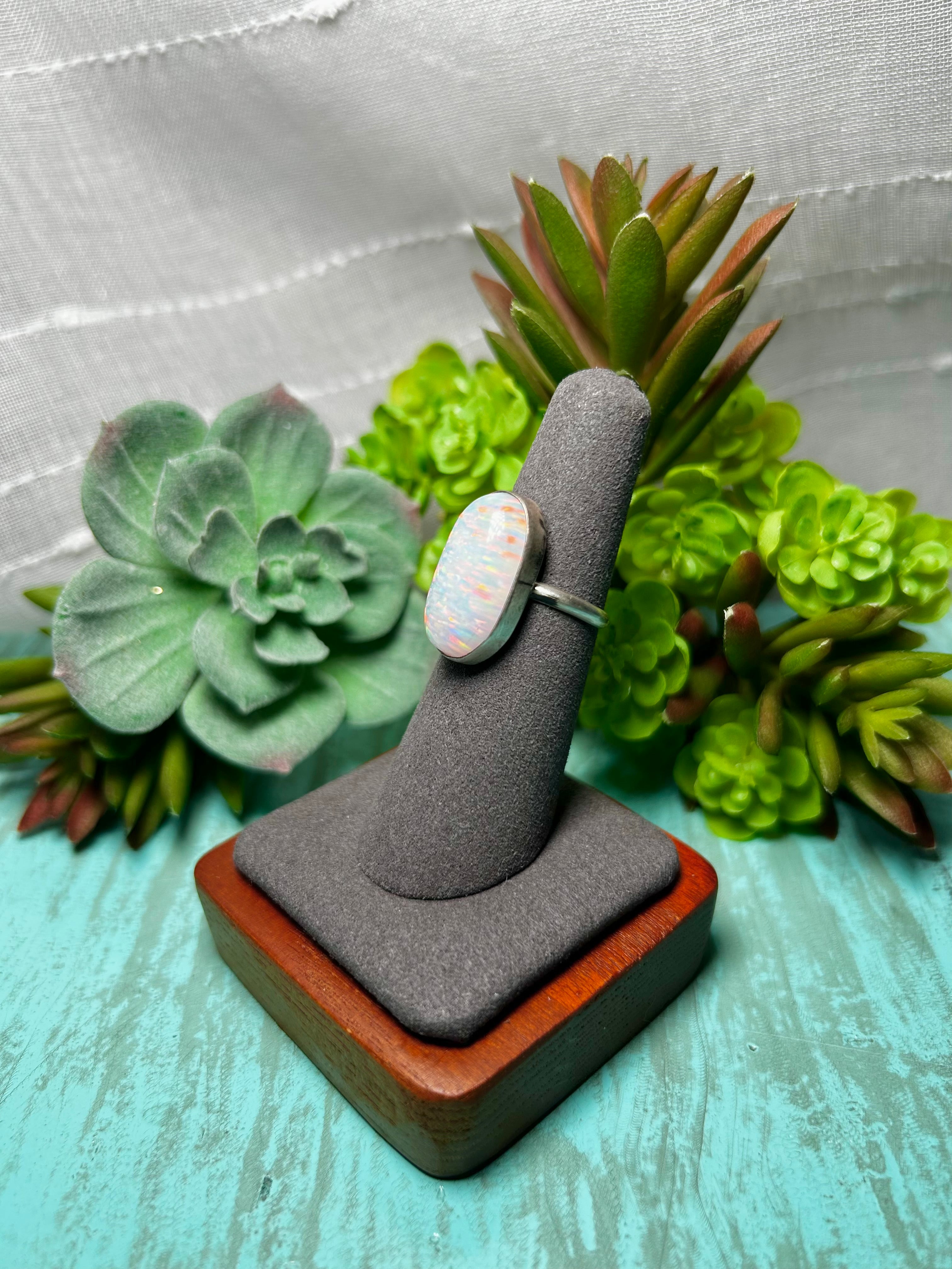 Navajo Man-Made Opal & Sterling Sliver Ring Size 6. It measures 7/8 of an inch long and 1/2 of an inch wide. Signed by the artist and stamped sterling silver.