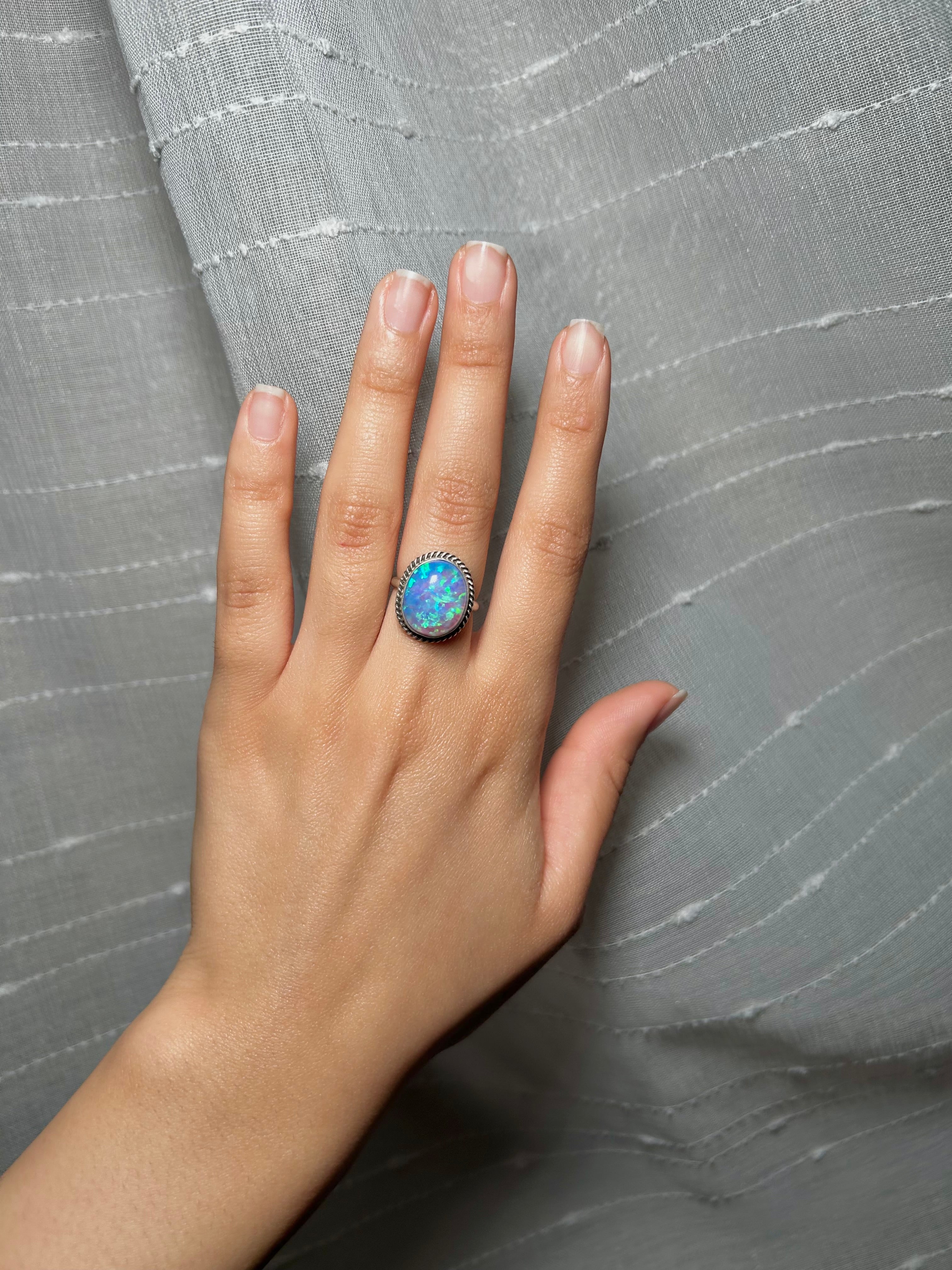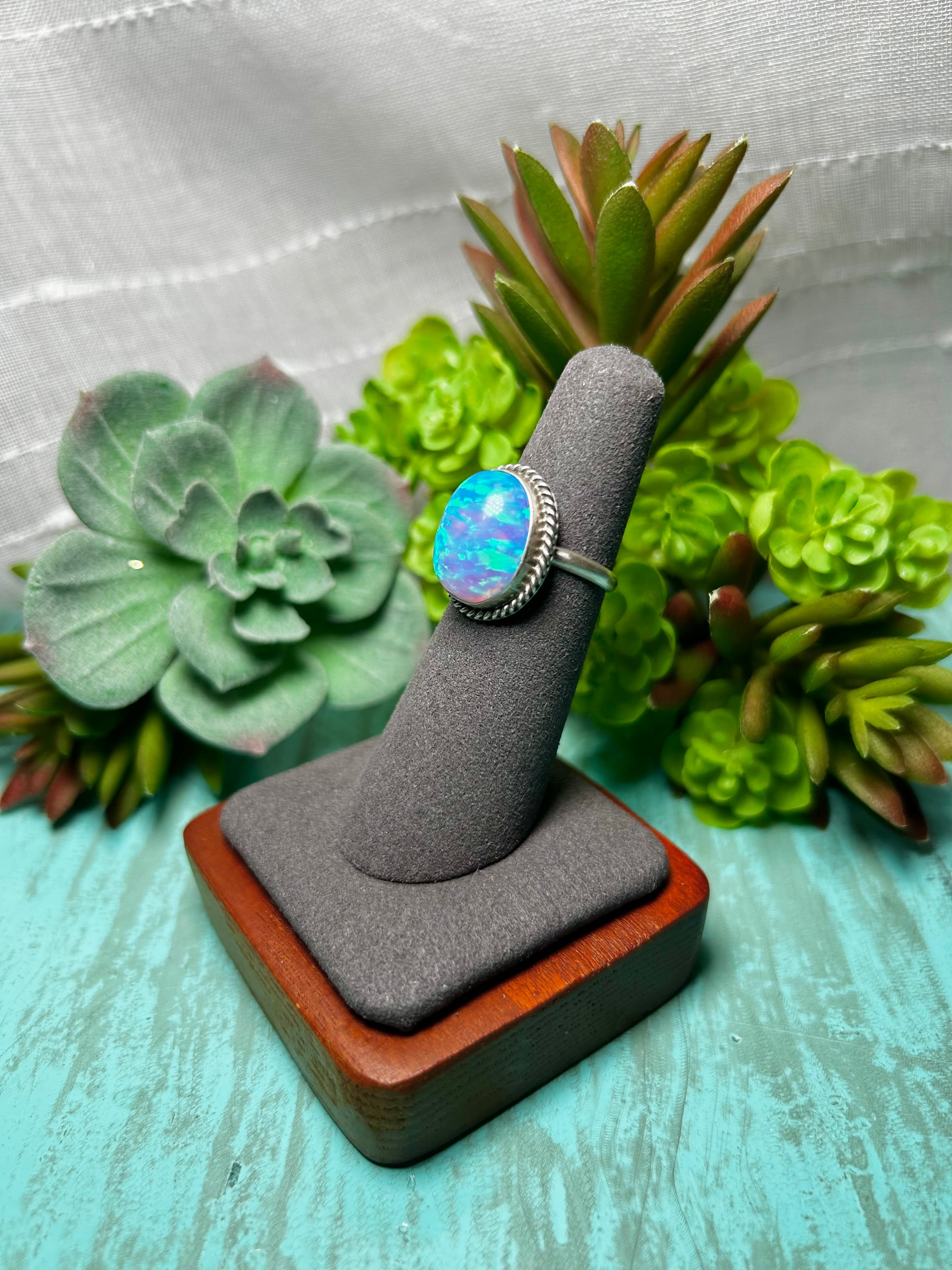 Navajo Man-Made Opal & Sterling Sliver Ring Size 5.75. It measures 7/8 of an inch long and 3/4 of an inch wide. Signed by the artist and stamped sterling silver.