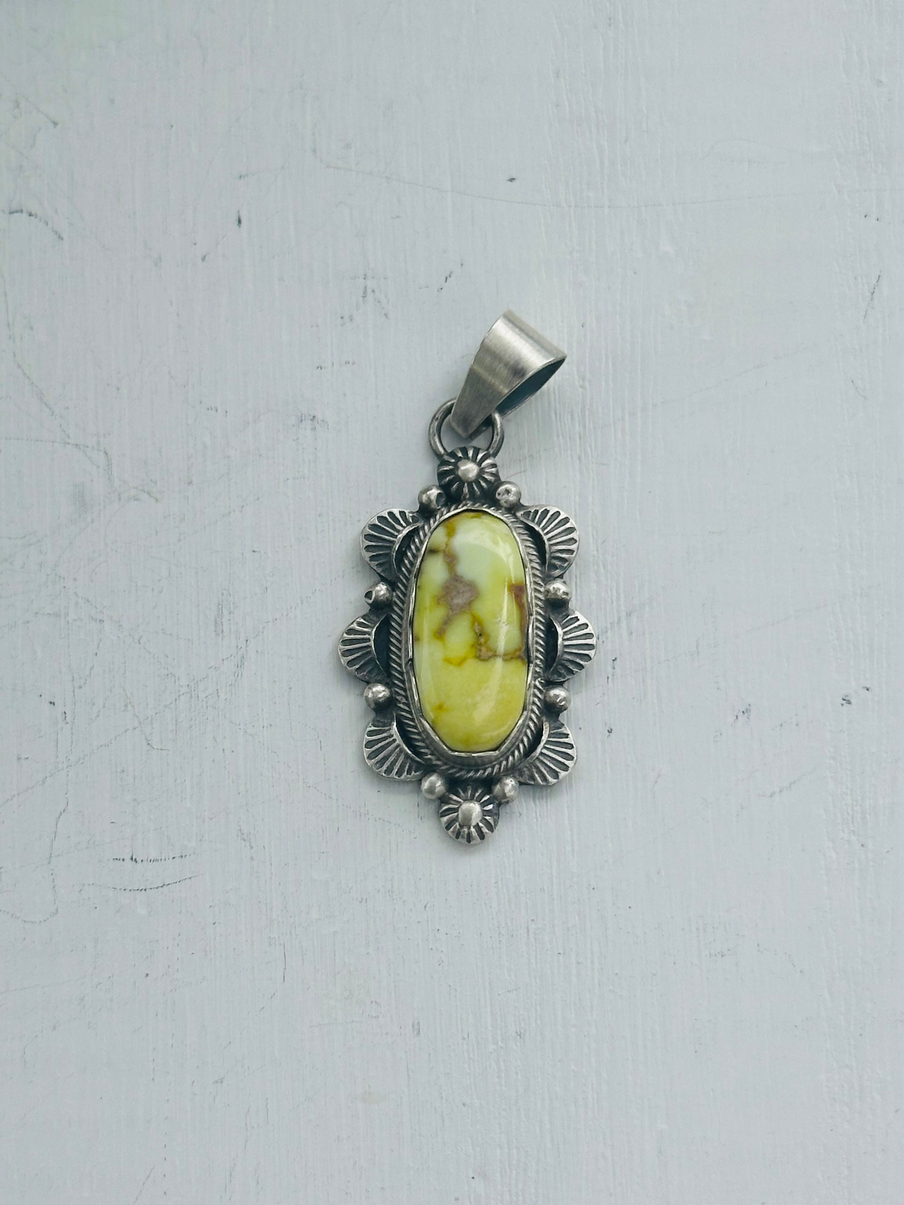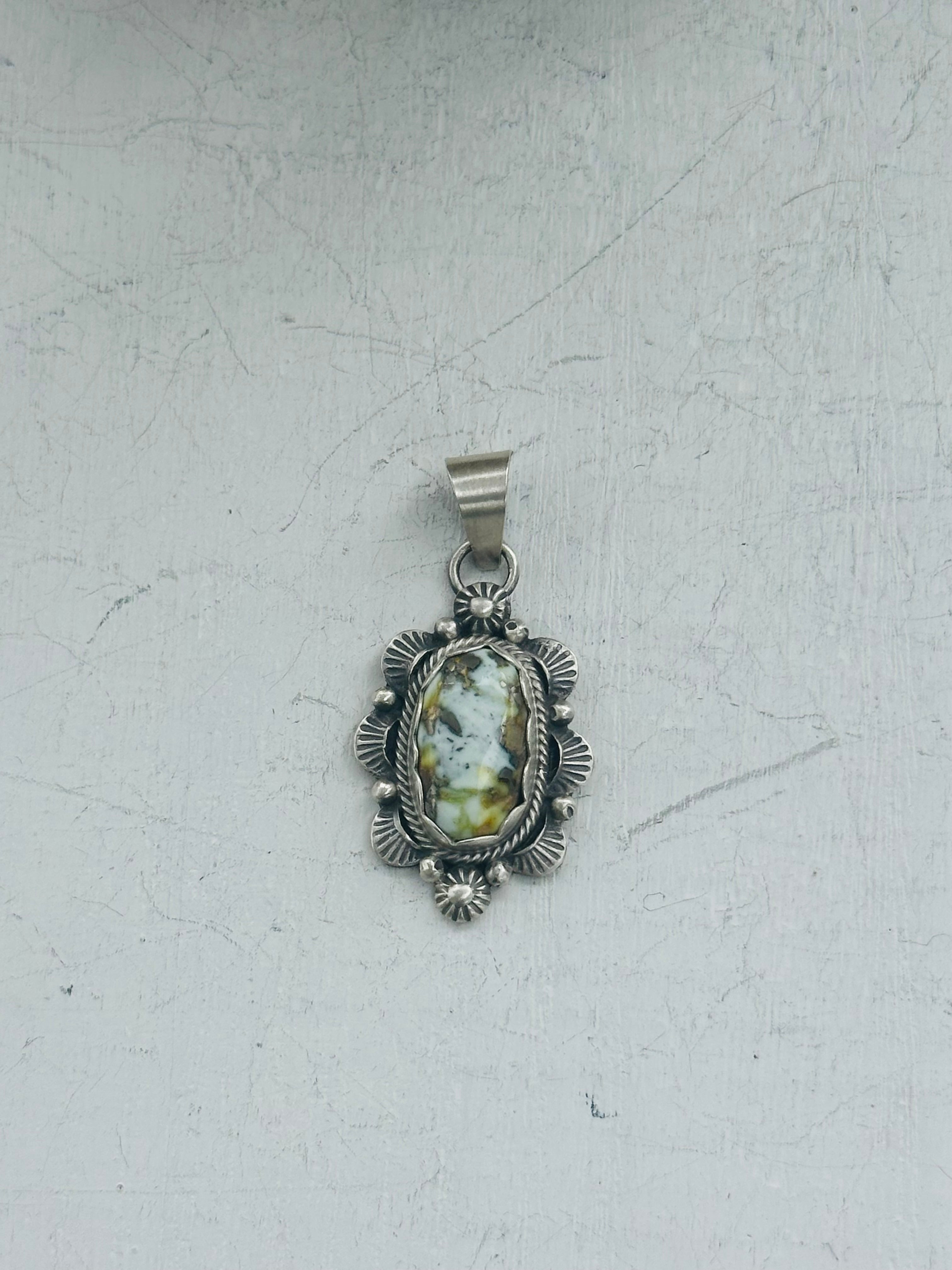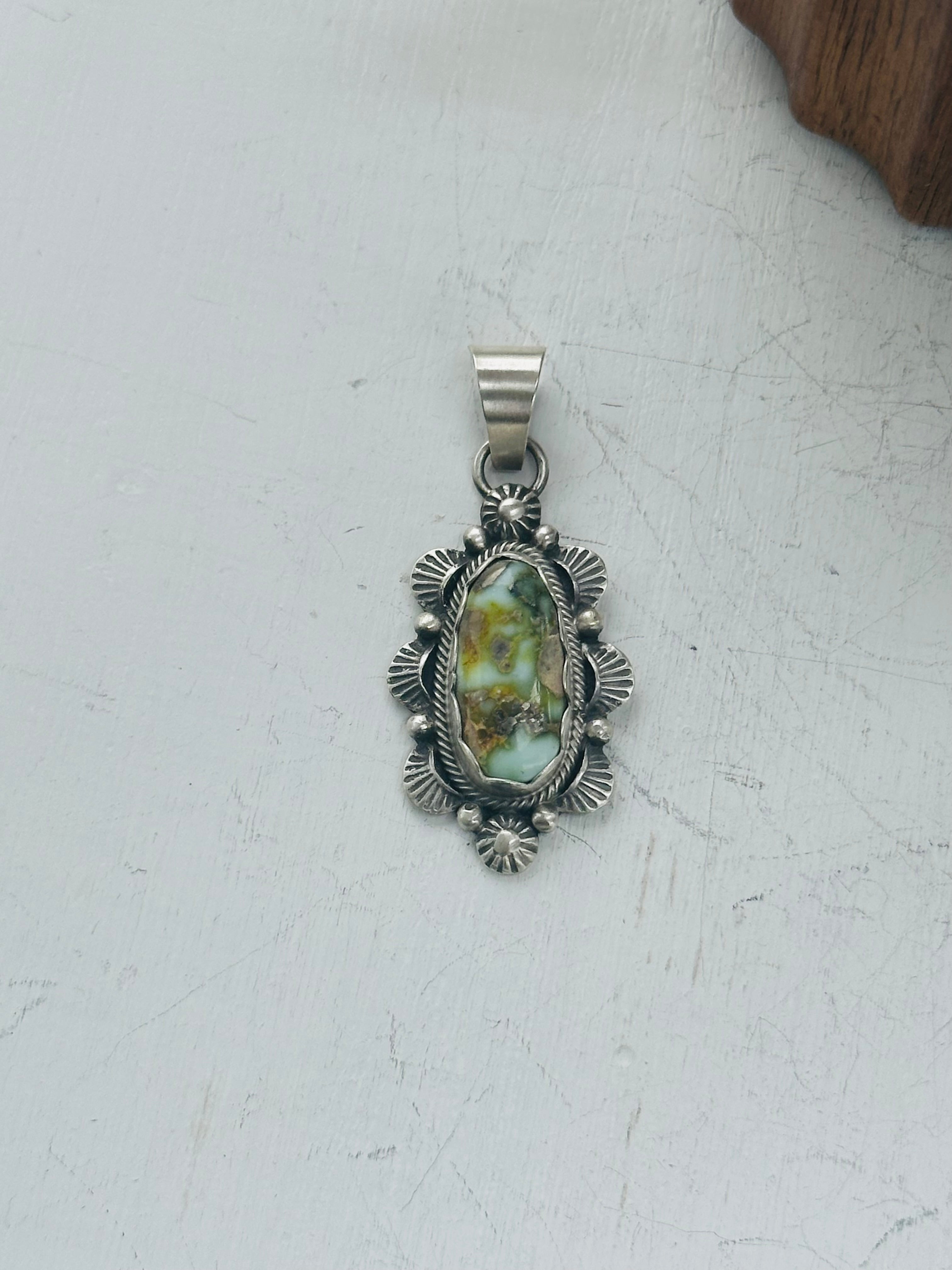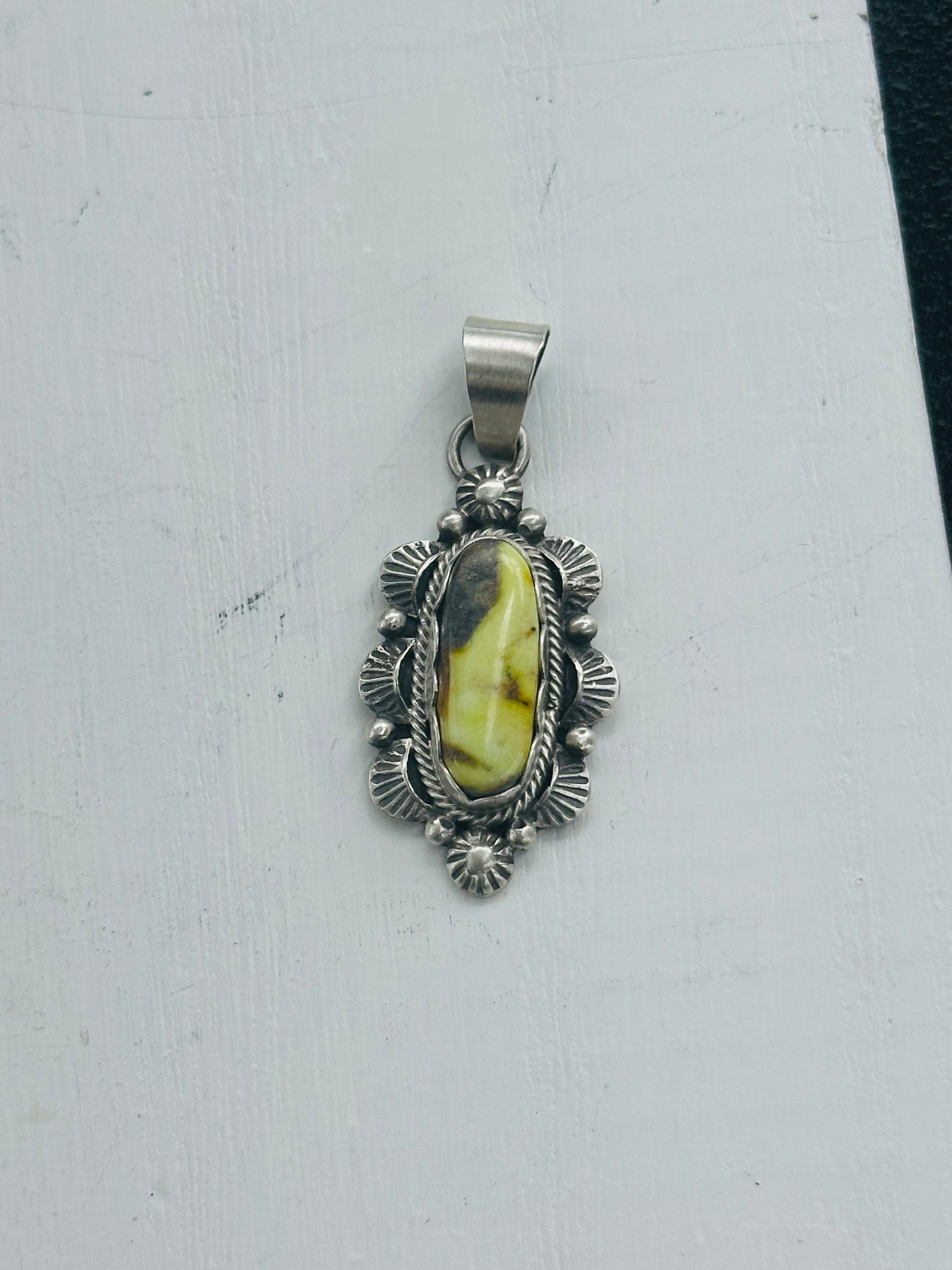 Beautiful Necklace. Ester Sam Palomino Variscite & Sterling Silver Pendant. It measures 1 5/8 inches long and 3/4 of an inch wide. Signed by the artist and stamped sterling silver.