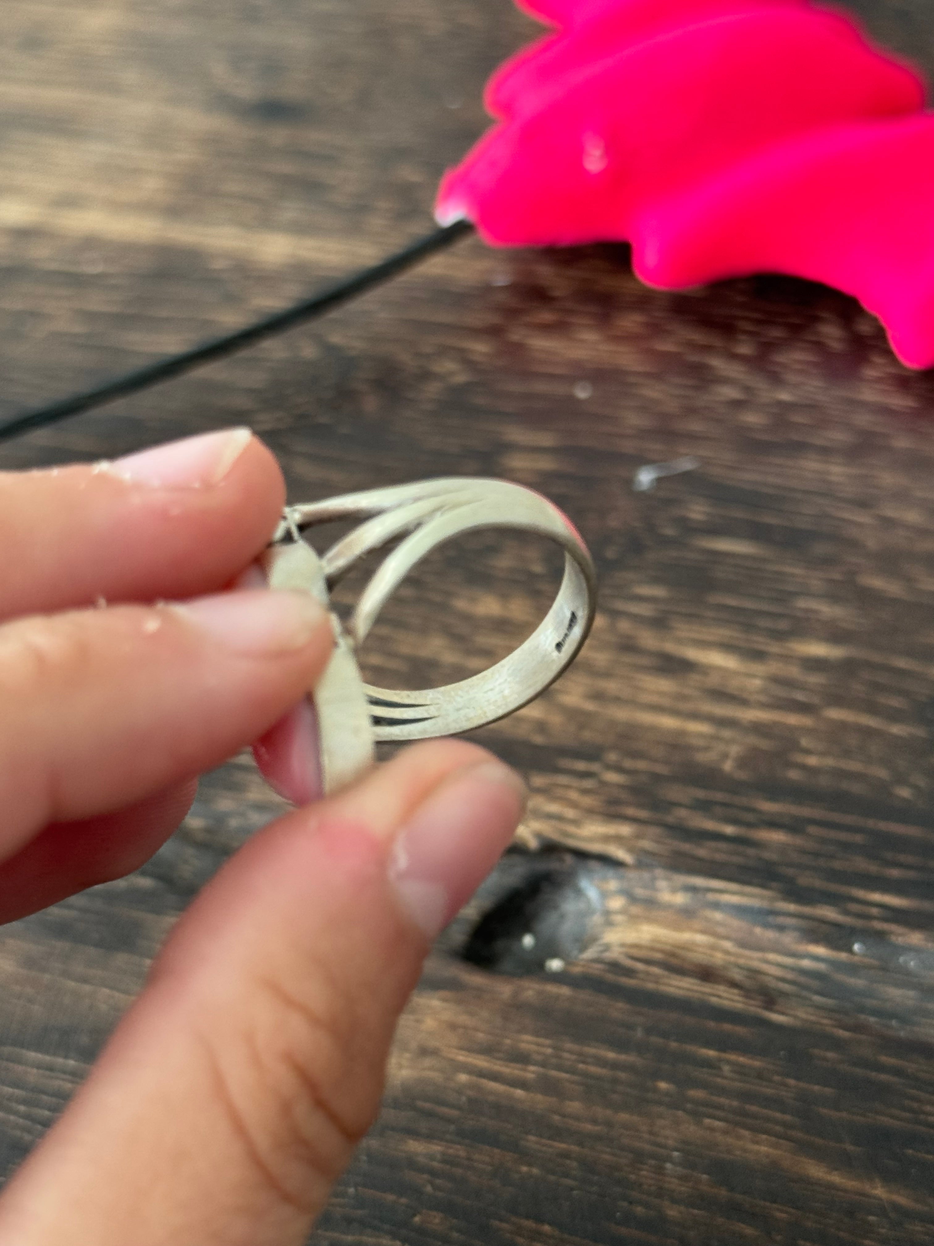 Beautiful ring. Navajo Made Pink Conch & Sterling Silver Heart Ring. It measures 1 3/8 inches long. Stamped sterling silver and signed. Stones will differ due to natural stones.