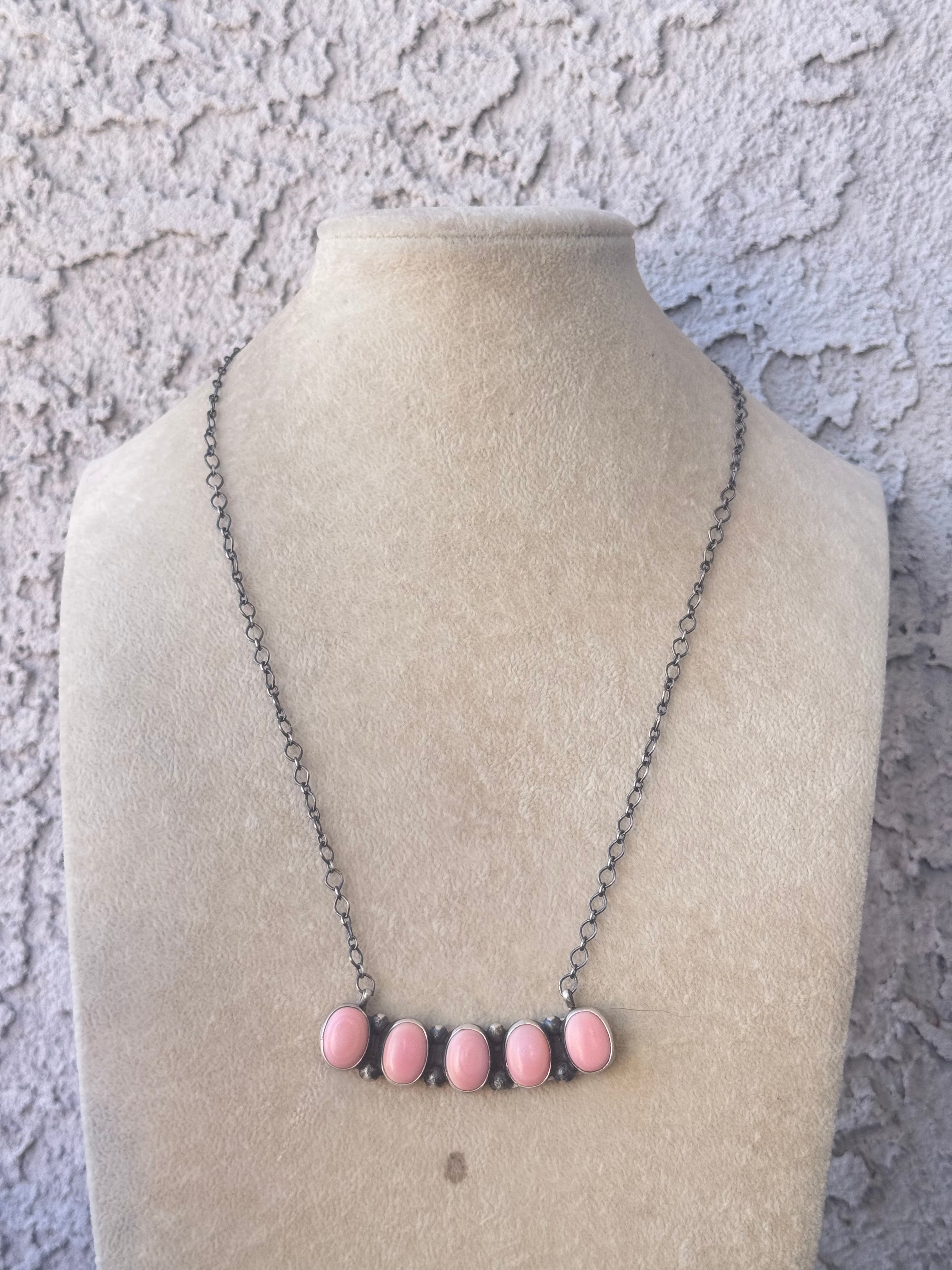 Eli Skeets Pink Conch & Sterling Silver Cluster Necklace. It measures 20 inches long with hang while the chain measures 19 inches long. Signed by the artist and stamped sterling silver. Stones will slightly differ due to natural stones.