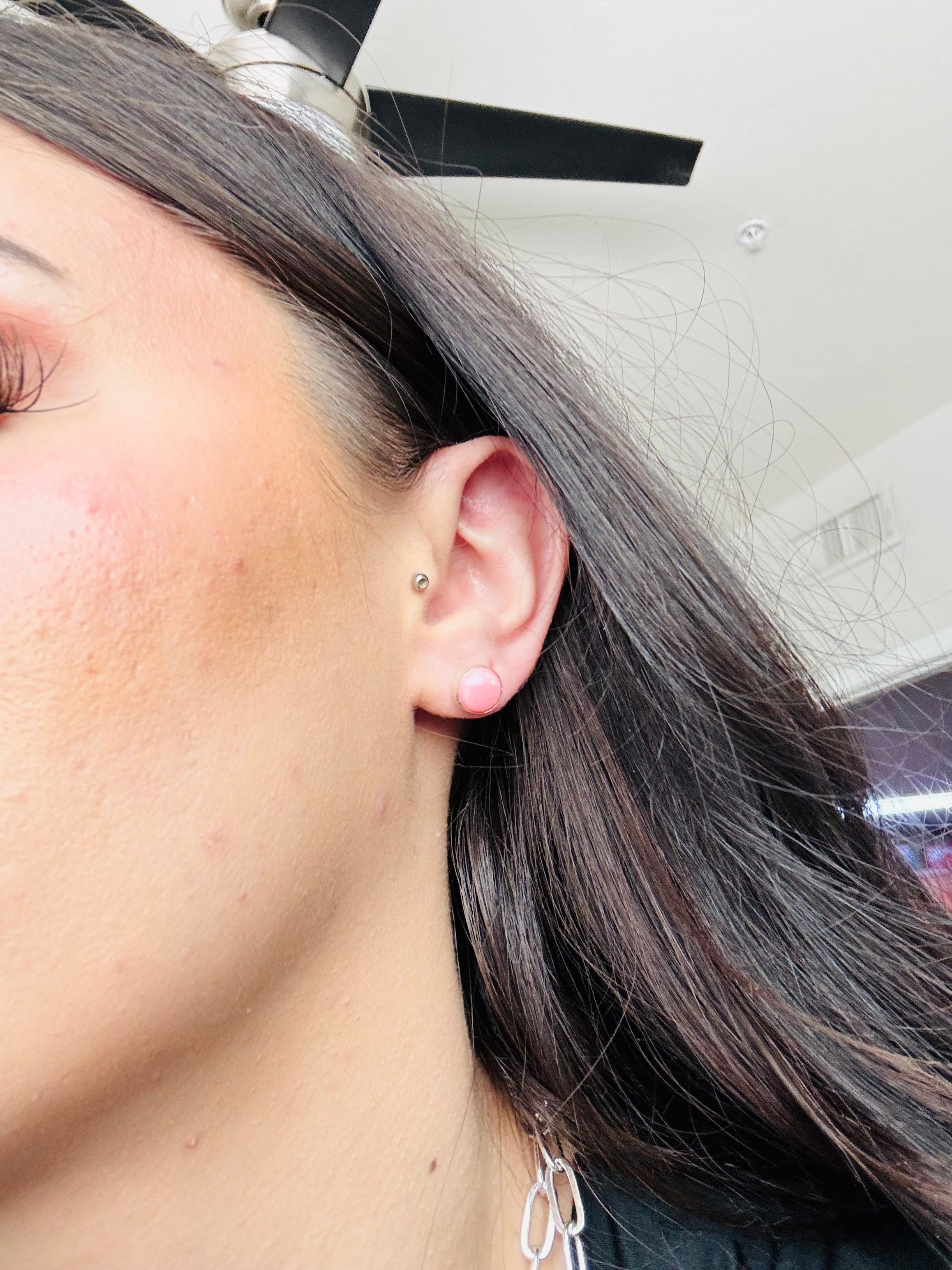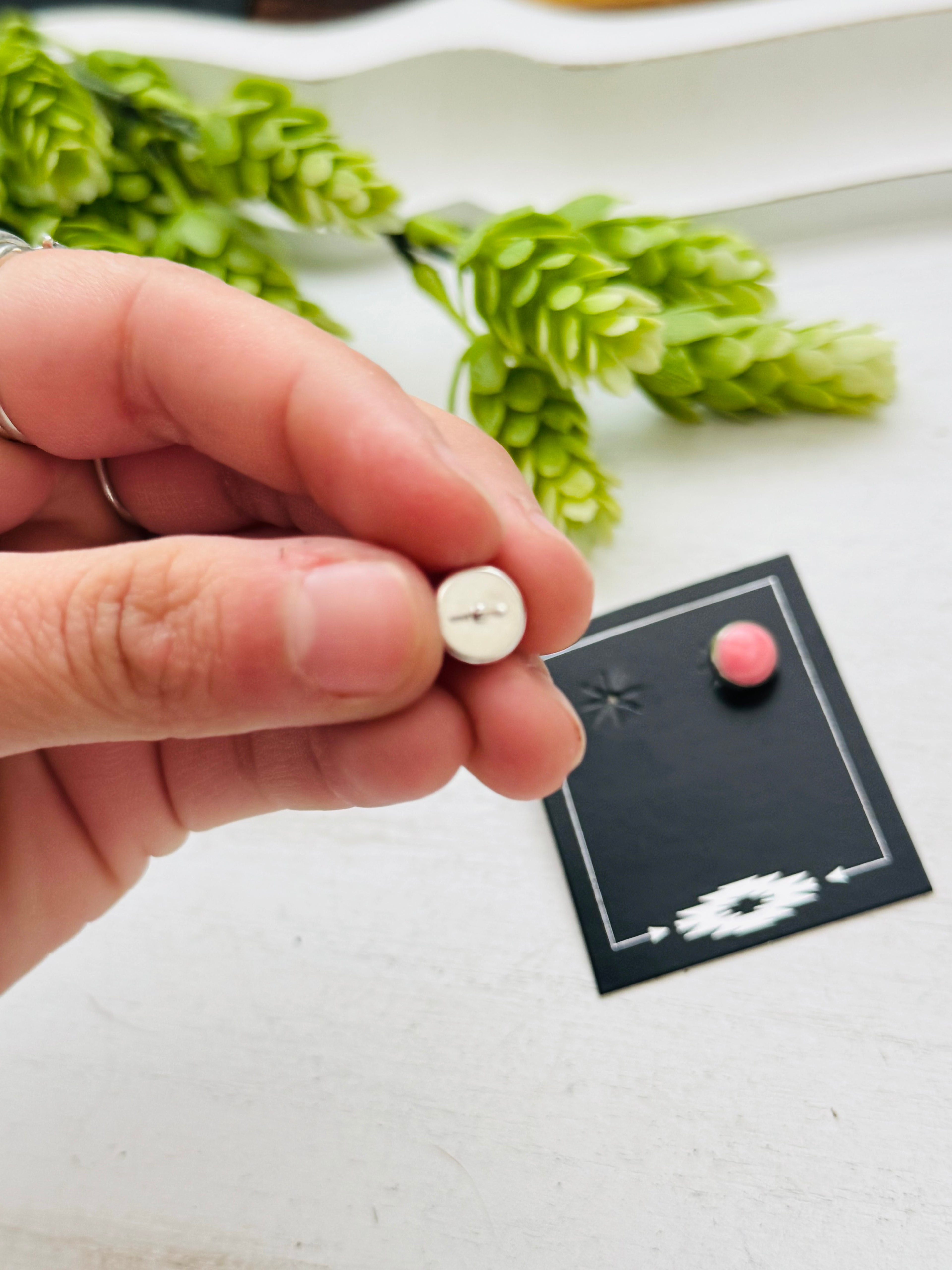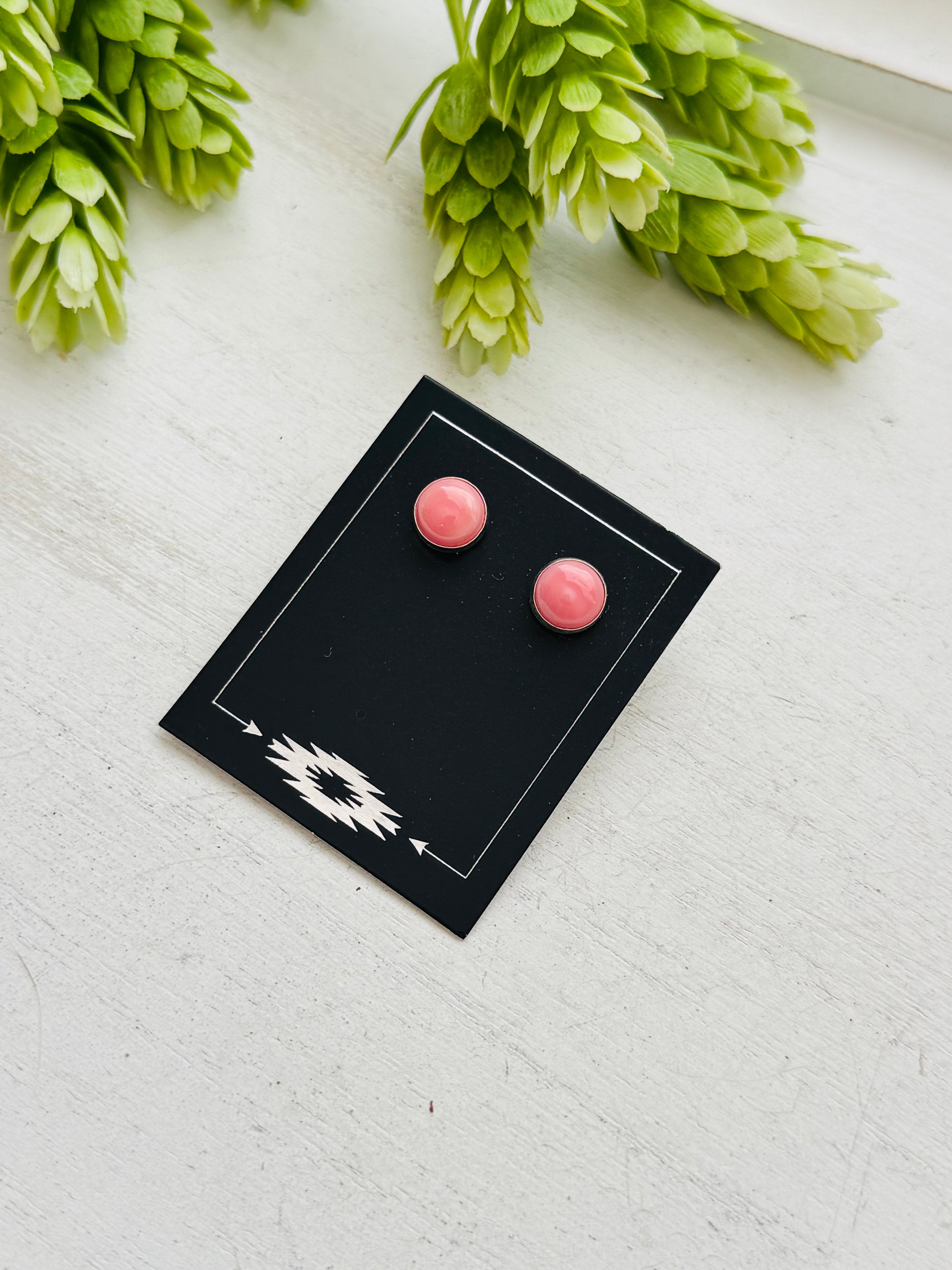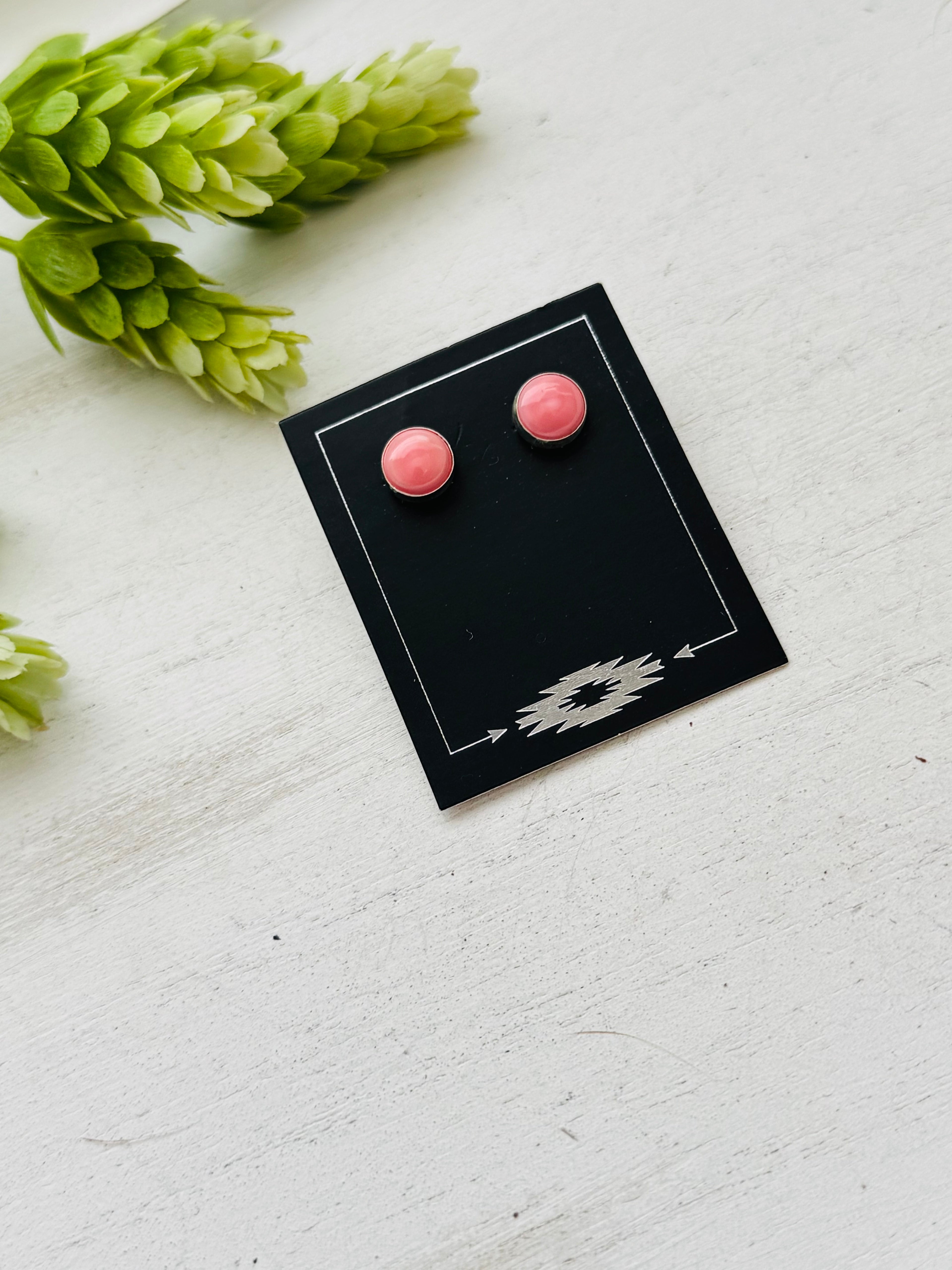 A beautiful Earrings. Navajo Made Pink Conch & Sterling Silver Post Earrings. It measures 3/8 of an inch round. Signed by the artist and stamped sterling silver.
