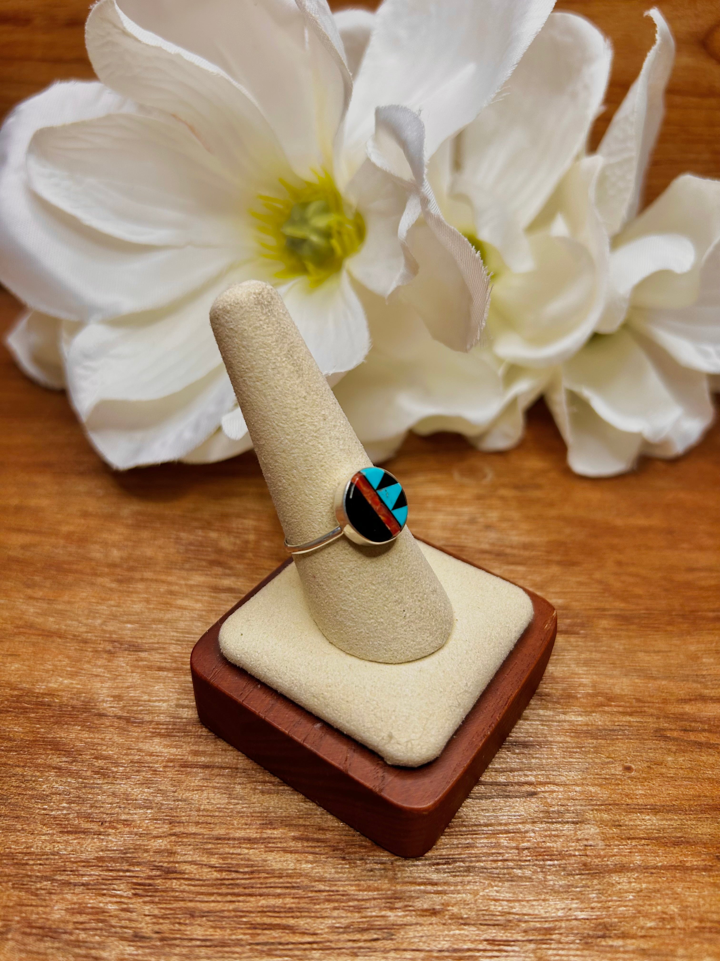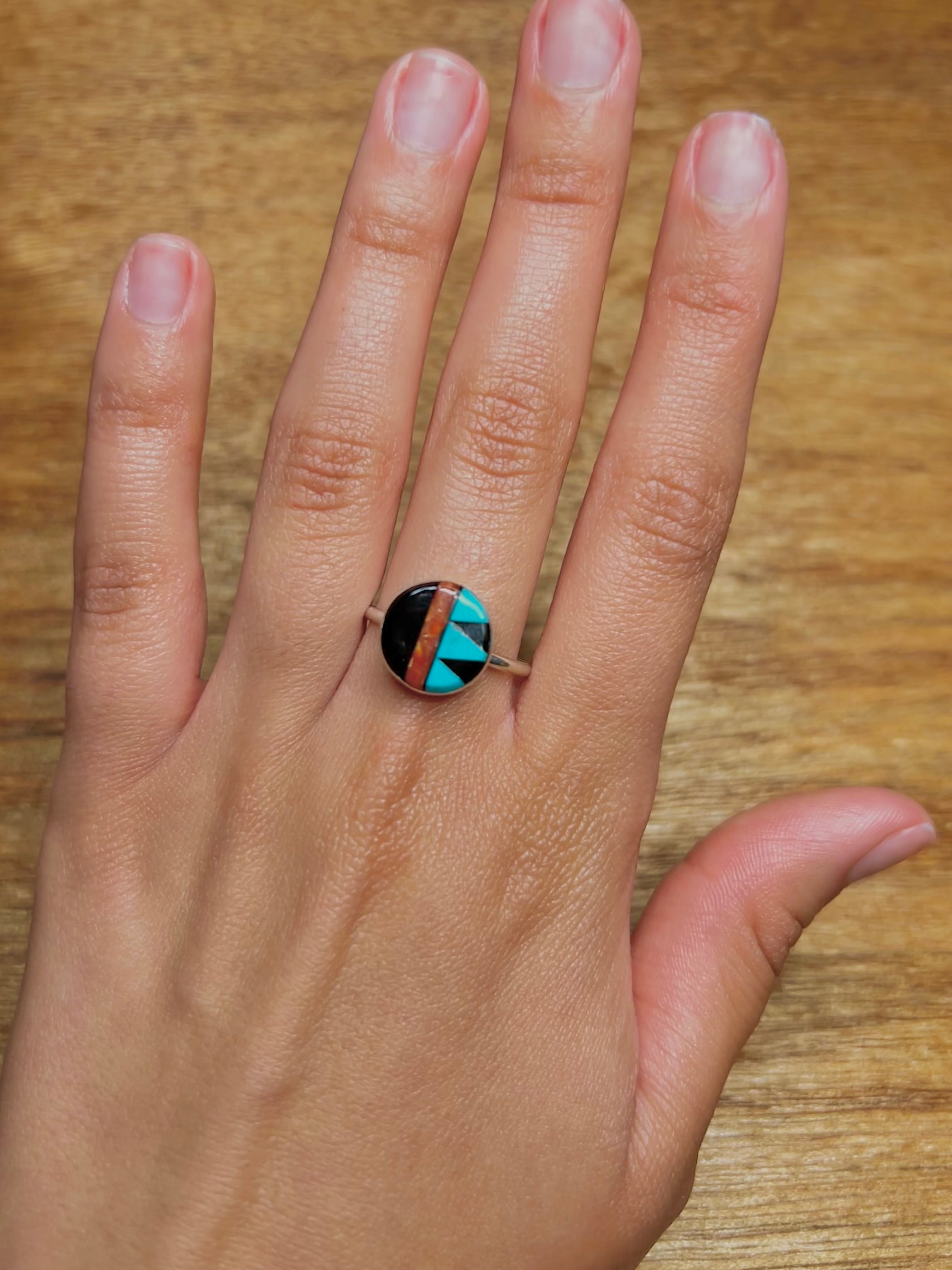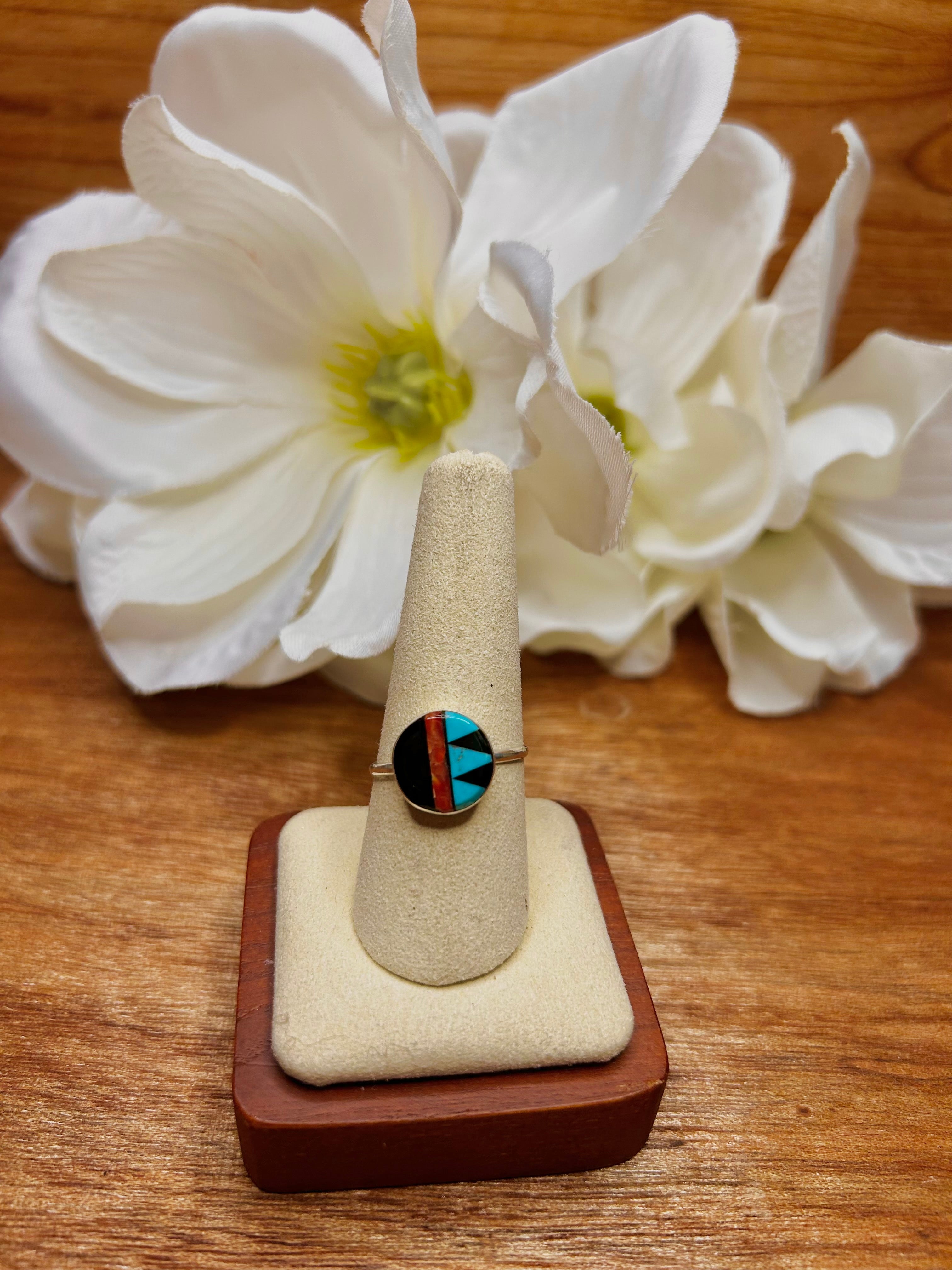 Zuni Navajo Made Multi Stone Inlay & Sterling Sliver Cluster Ring. It measures 1/2 of an inch long and 1/2 of an inch wide. Signed by the artist and stamped sterling silver.