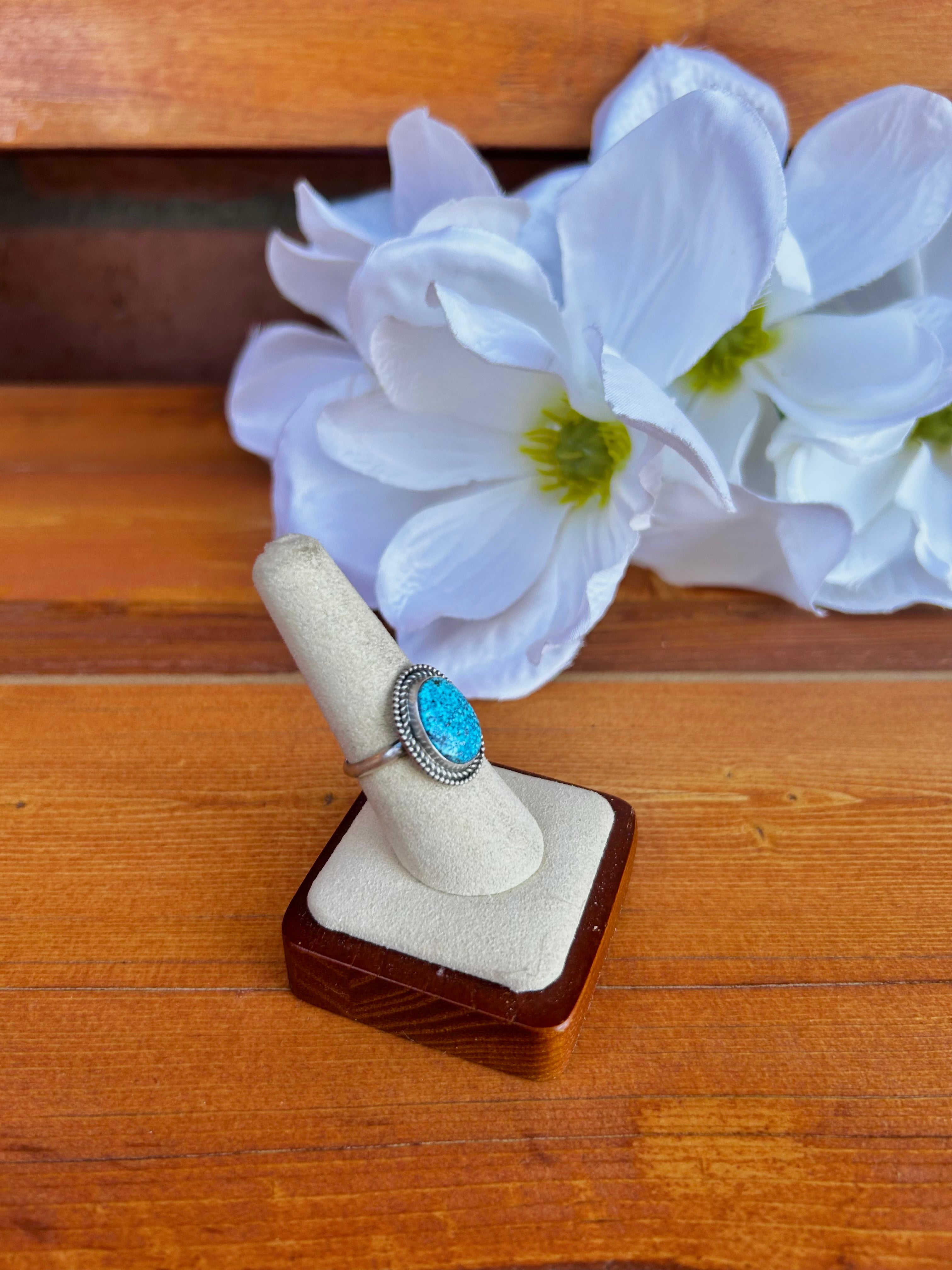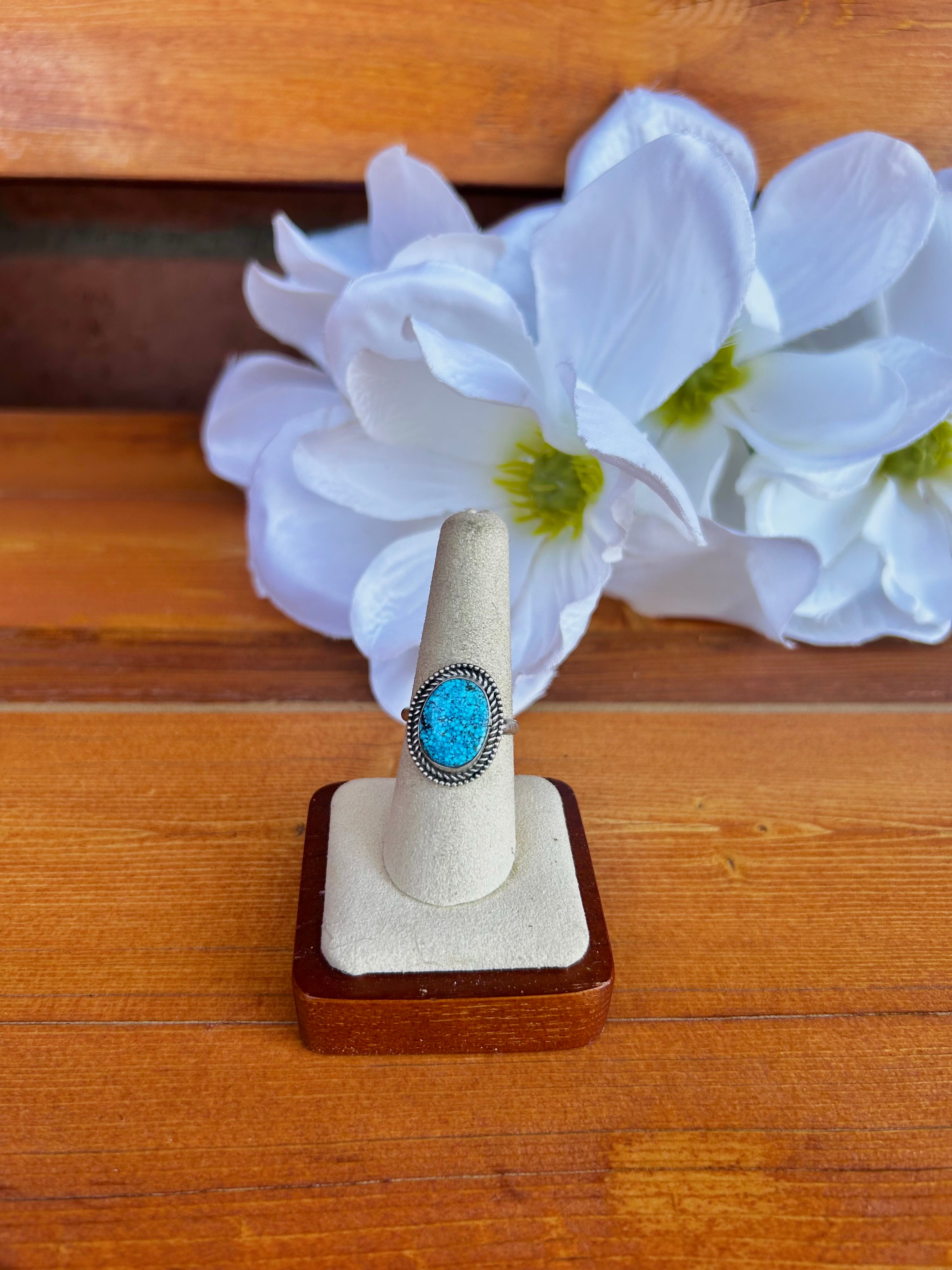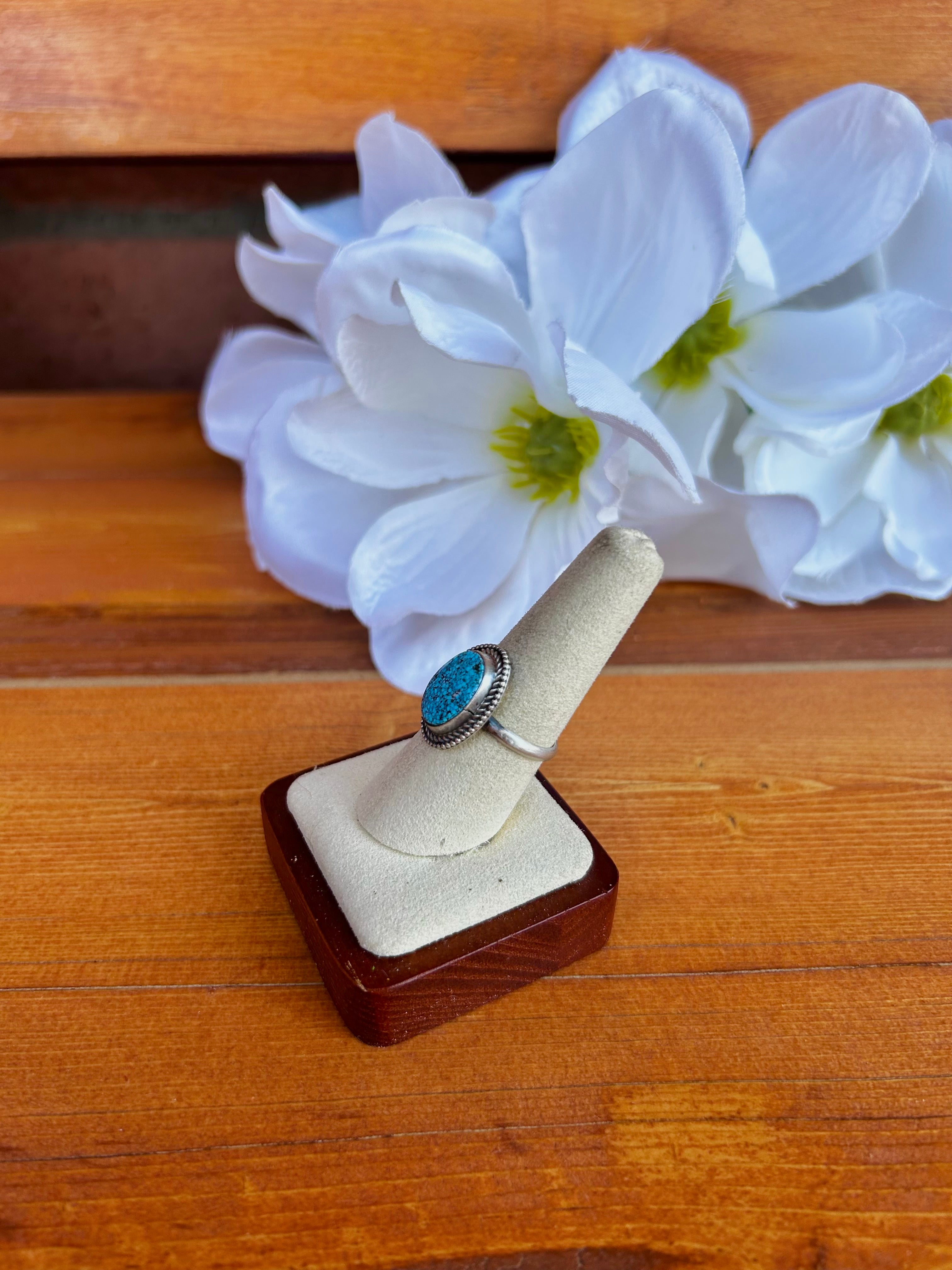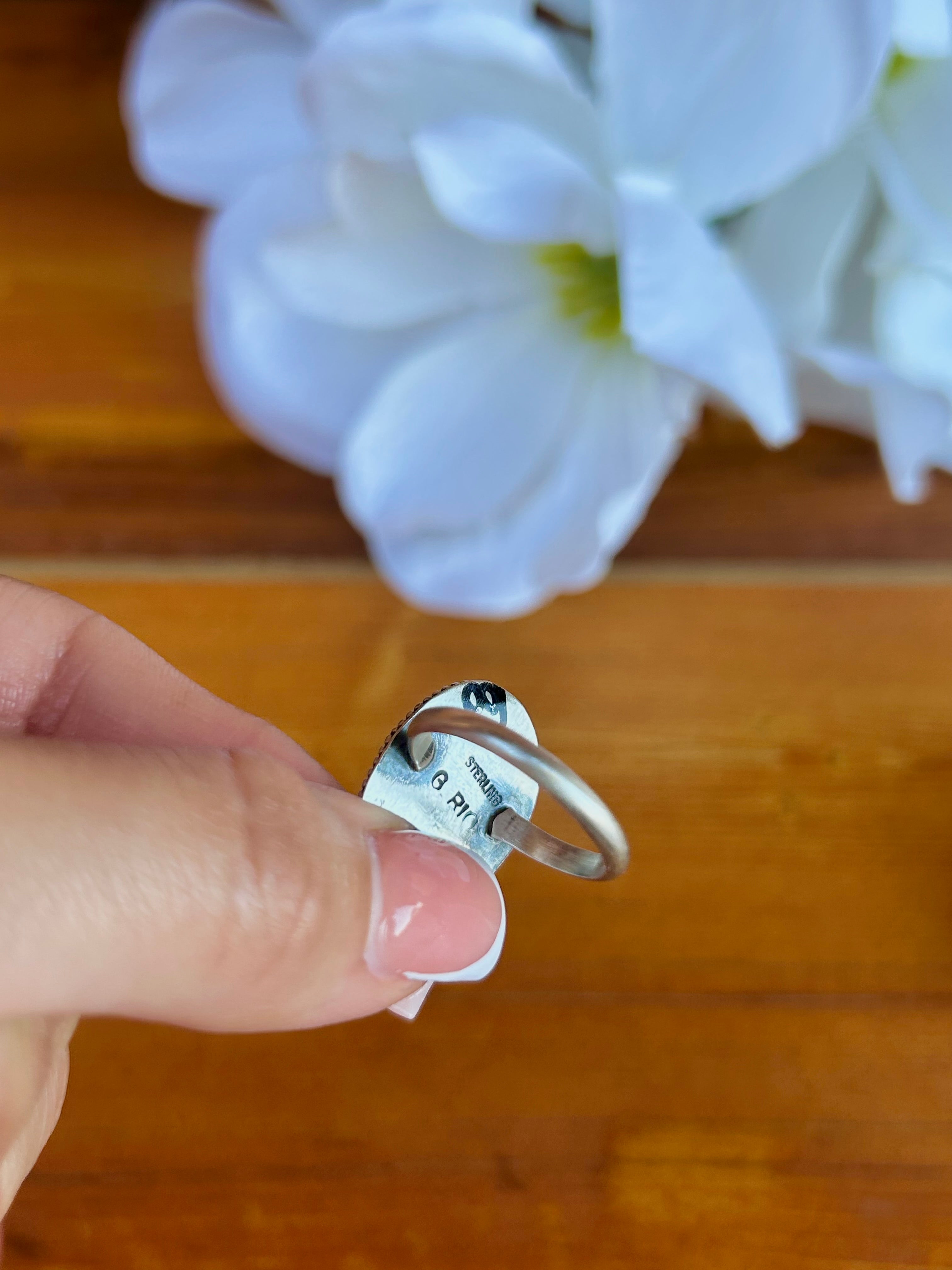 Navajo Made Black Spider-Web Kingman Turquoise & Sterling Silver Ring Size 8.25. It measures 3/4 of an inch long and 5/8 of an inch wide. Signed by the artist and stamped sterling silver.