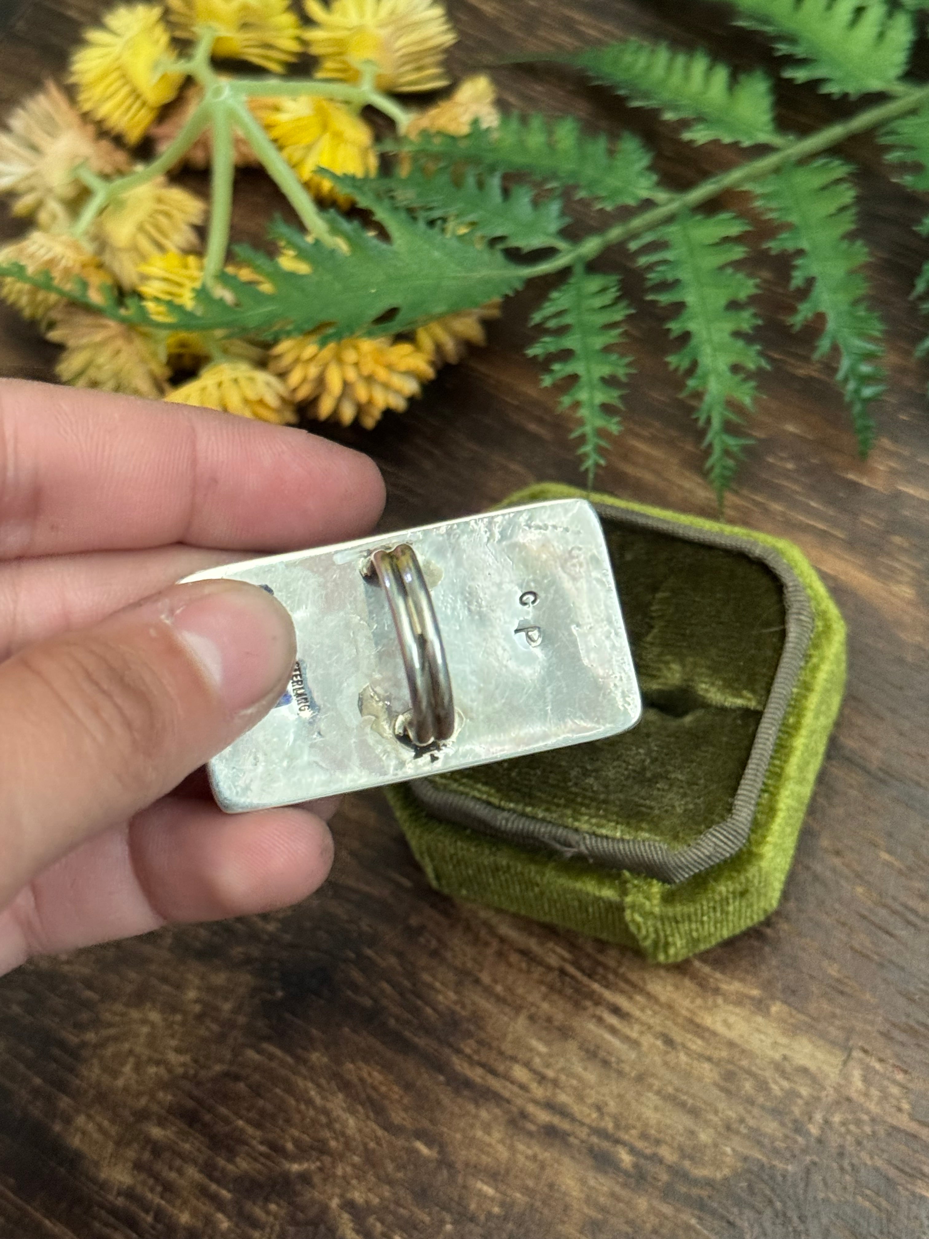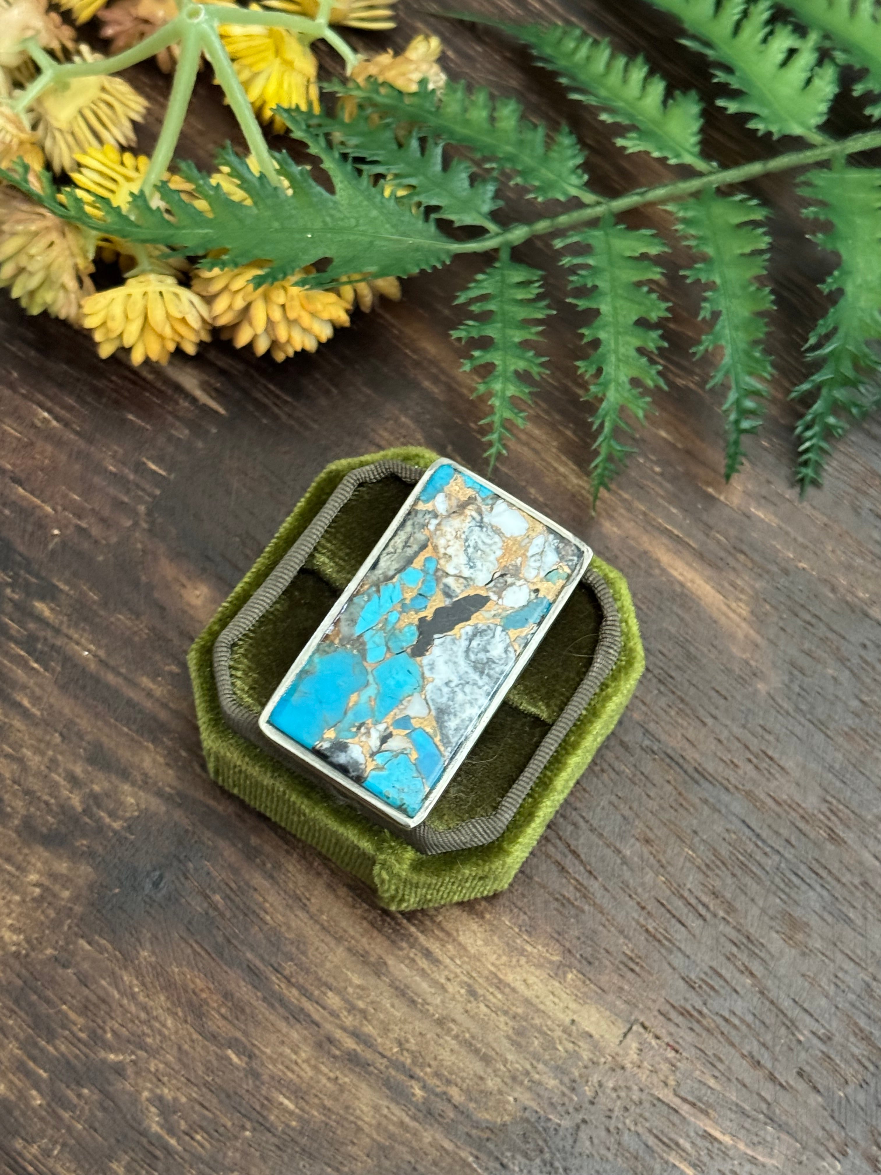 Navajo Made Mohave Turquoise & Sterling Silver Ring Size 5. It measures 1 3/4 inches long and 1 inch wide. Signed by artist and stamped sterling silver.