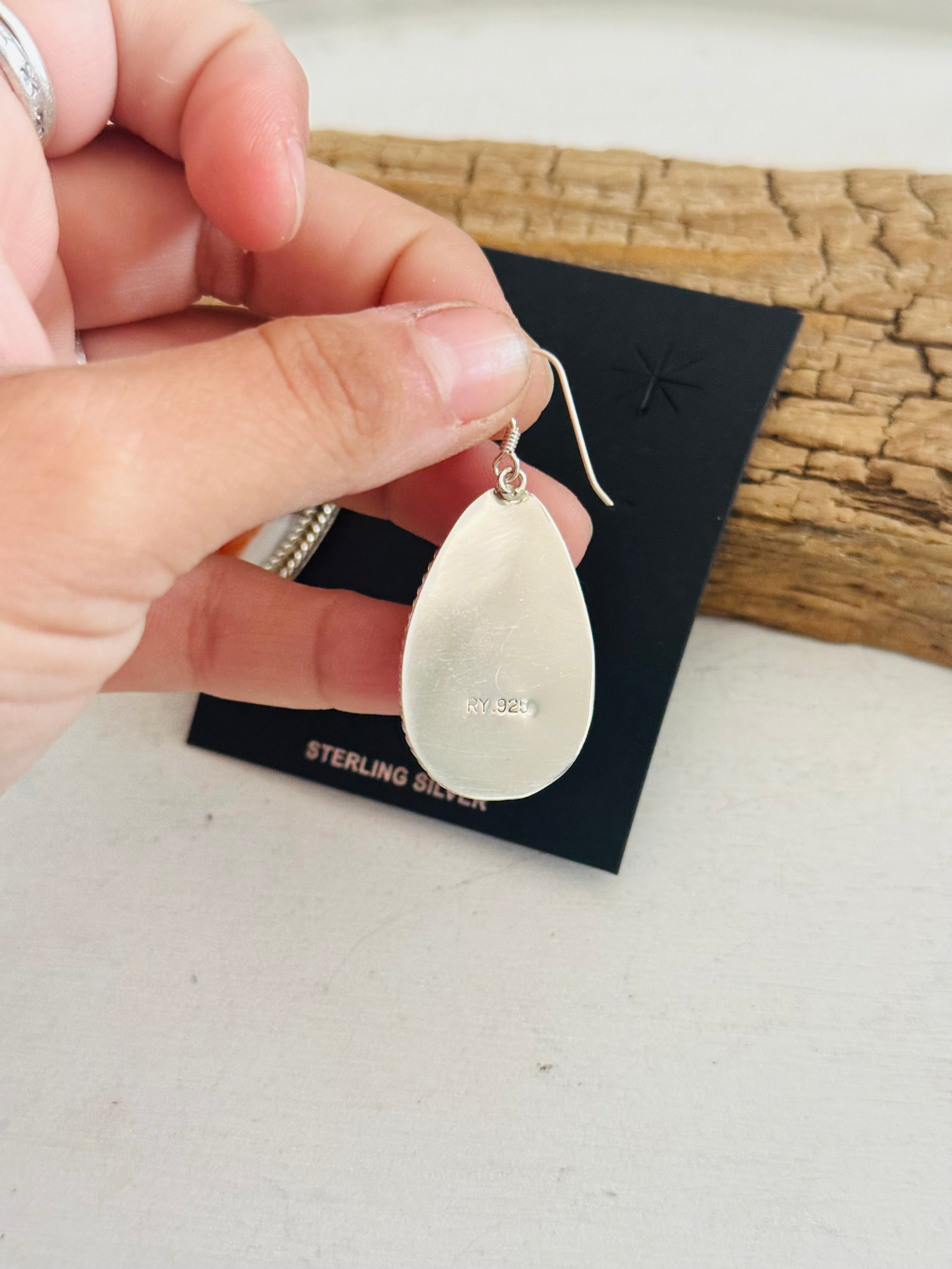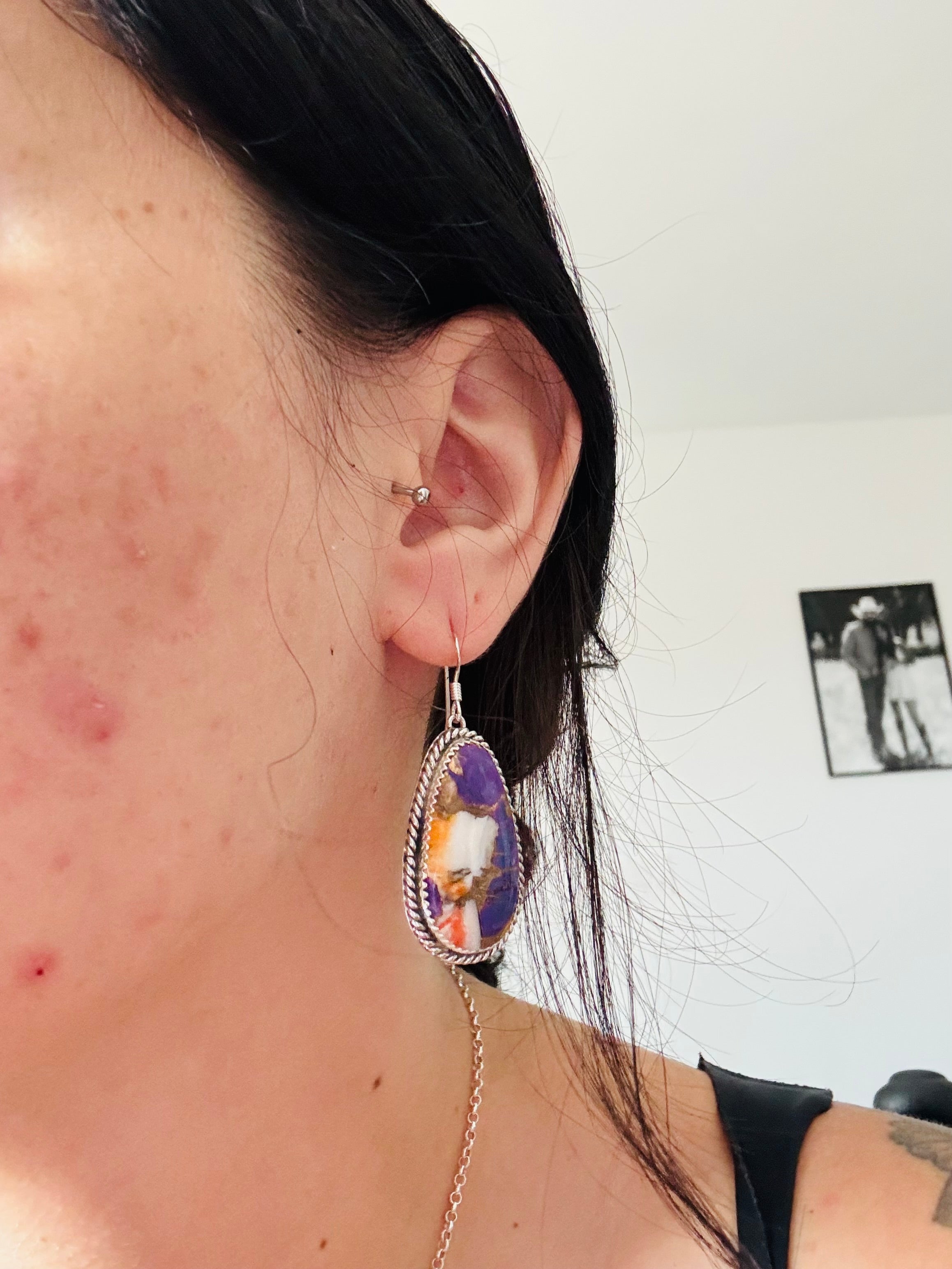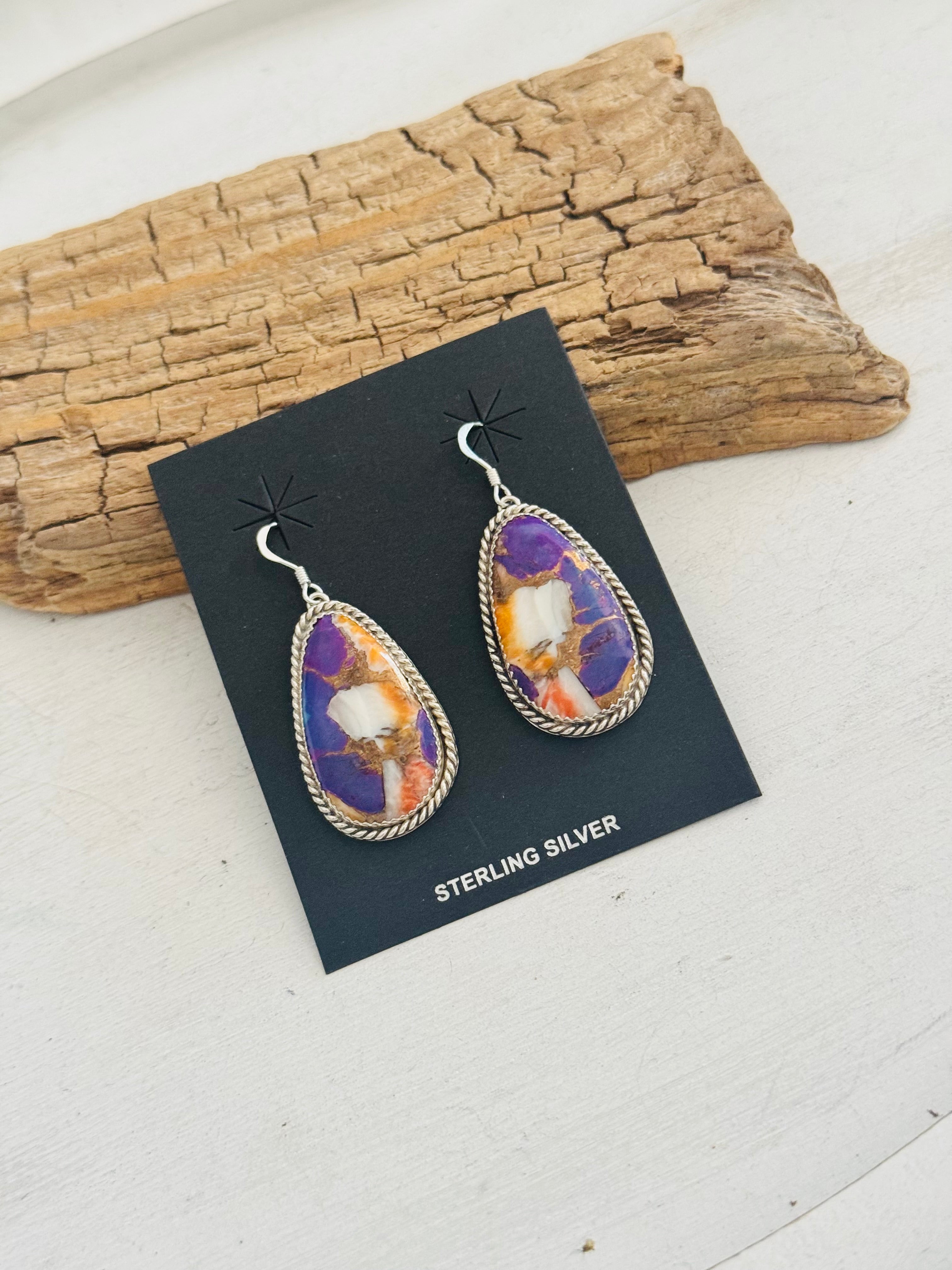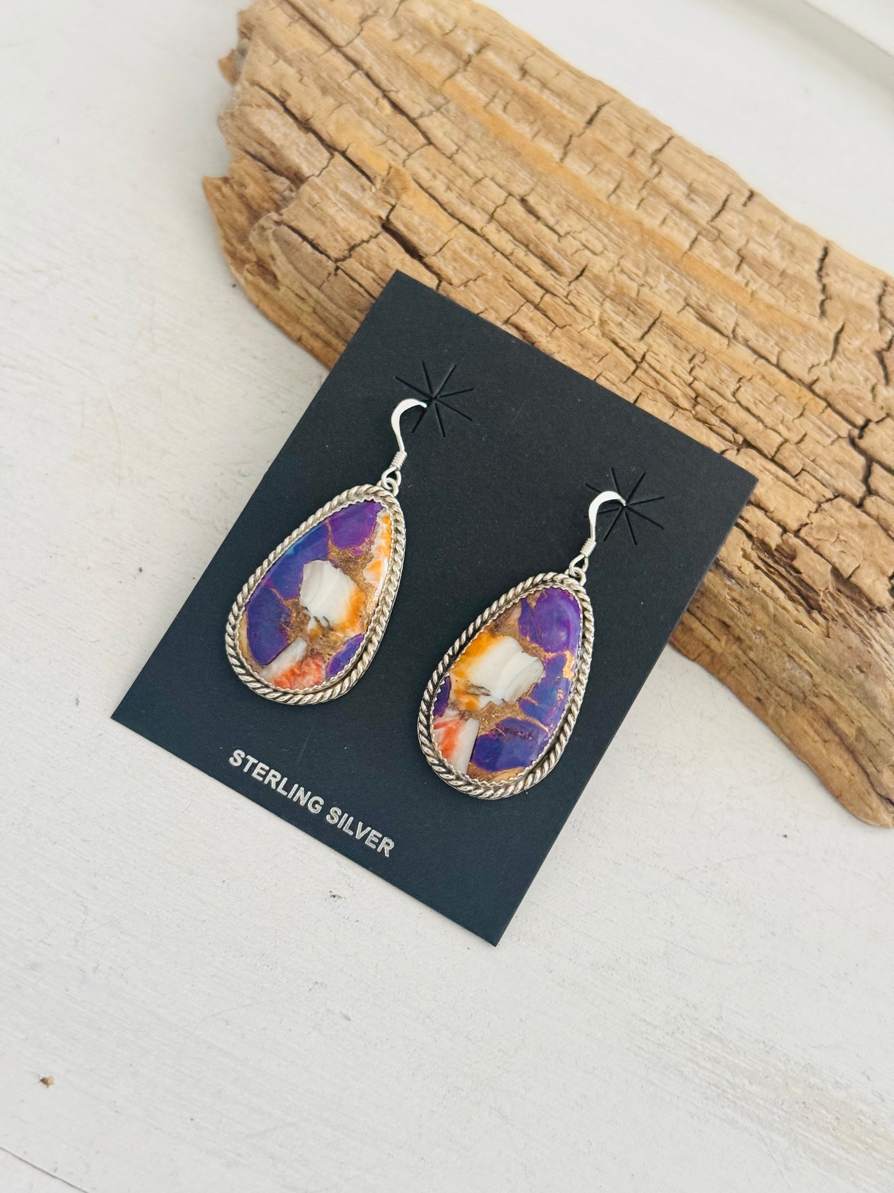 Navajo Made Purple Mohave Turquoise & Sterling Silver Dangle Earrings. They measure 1 7/8 inches long and 7/8 of an inch wide. Signed by the artist and stamped sterling silver.