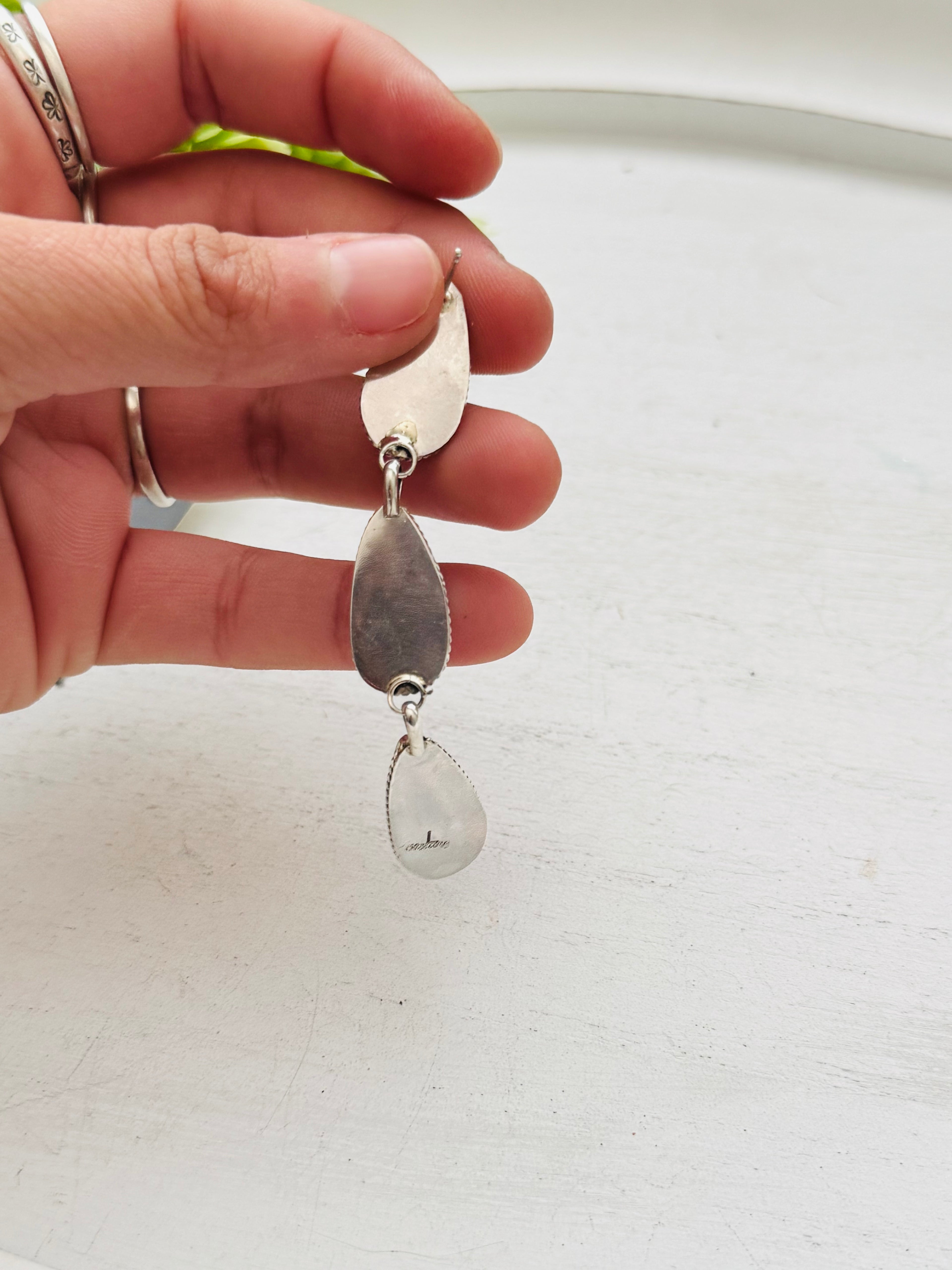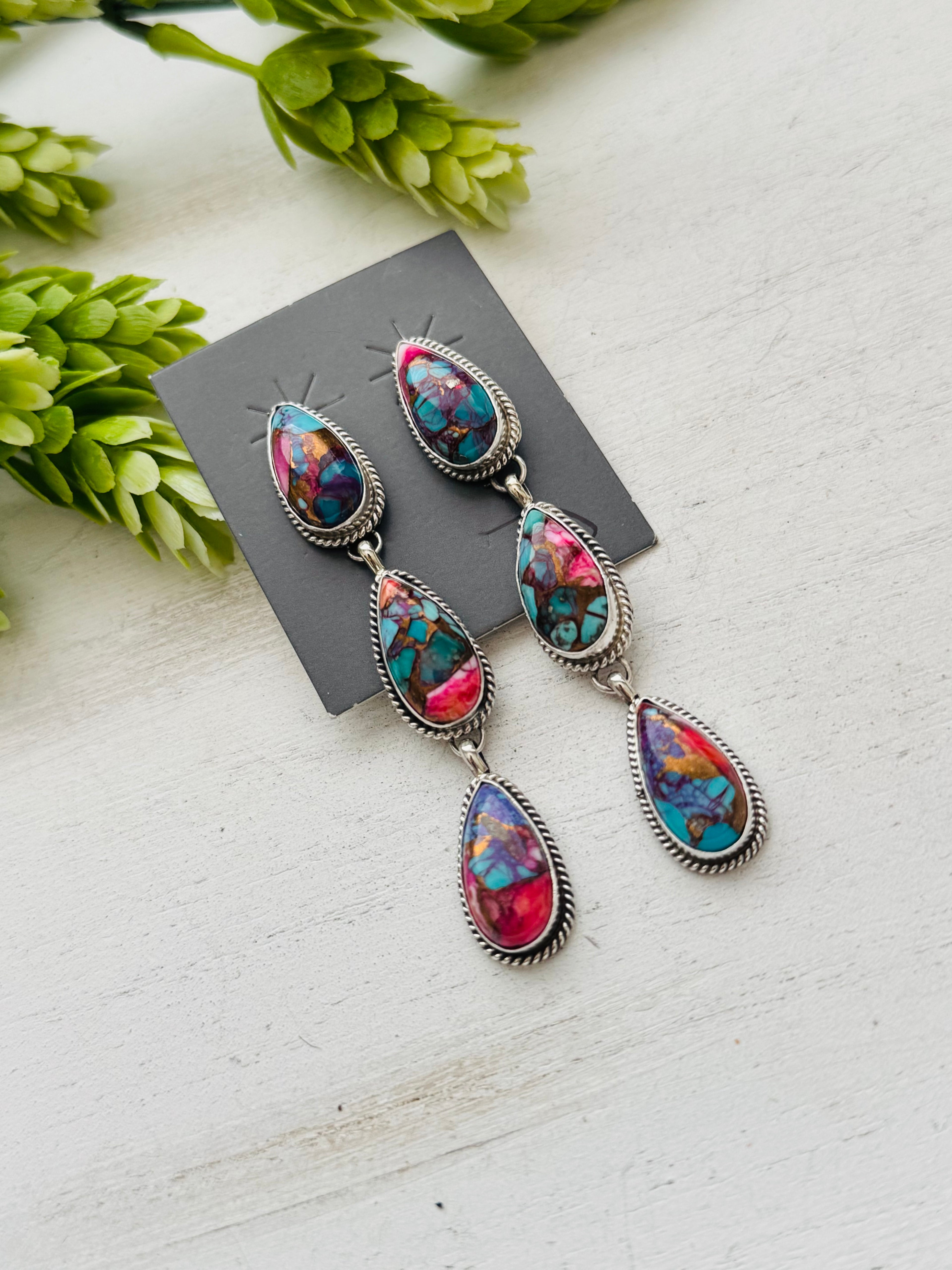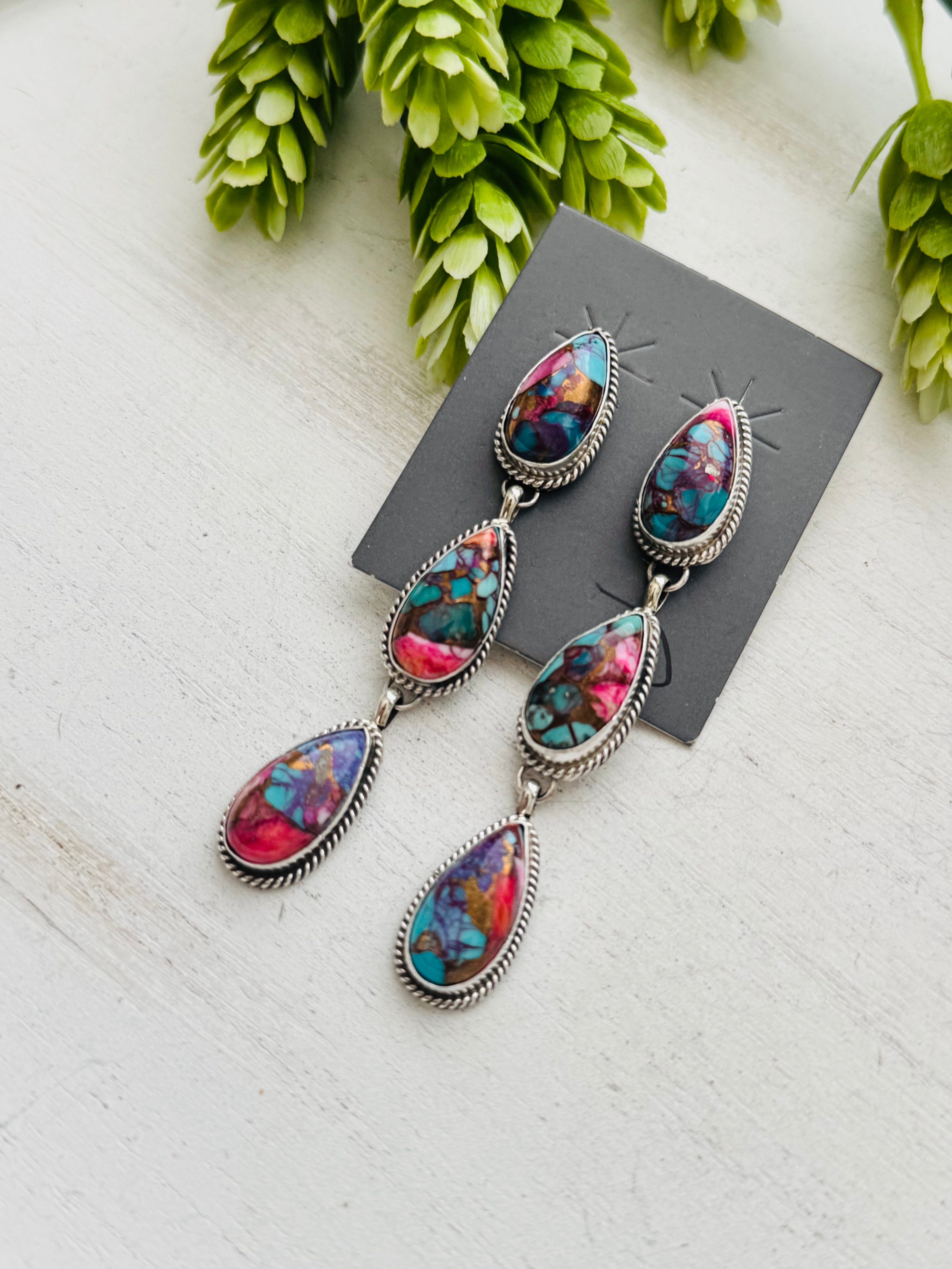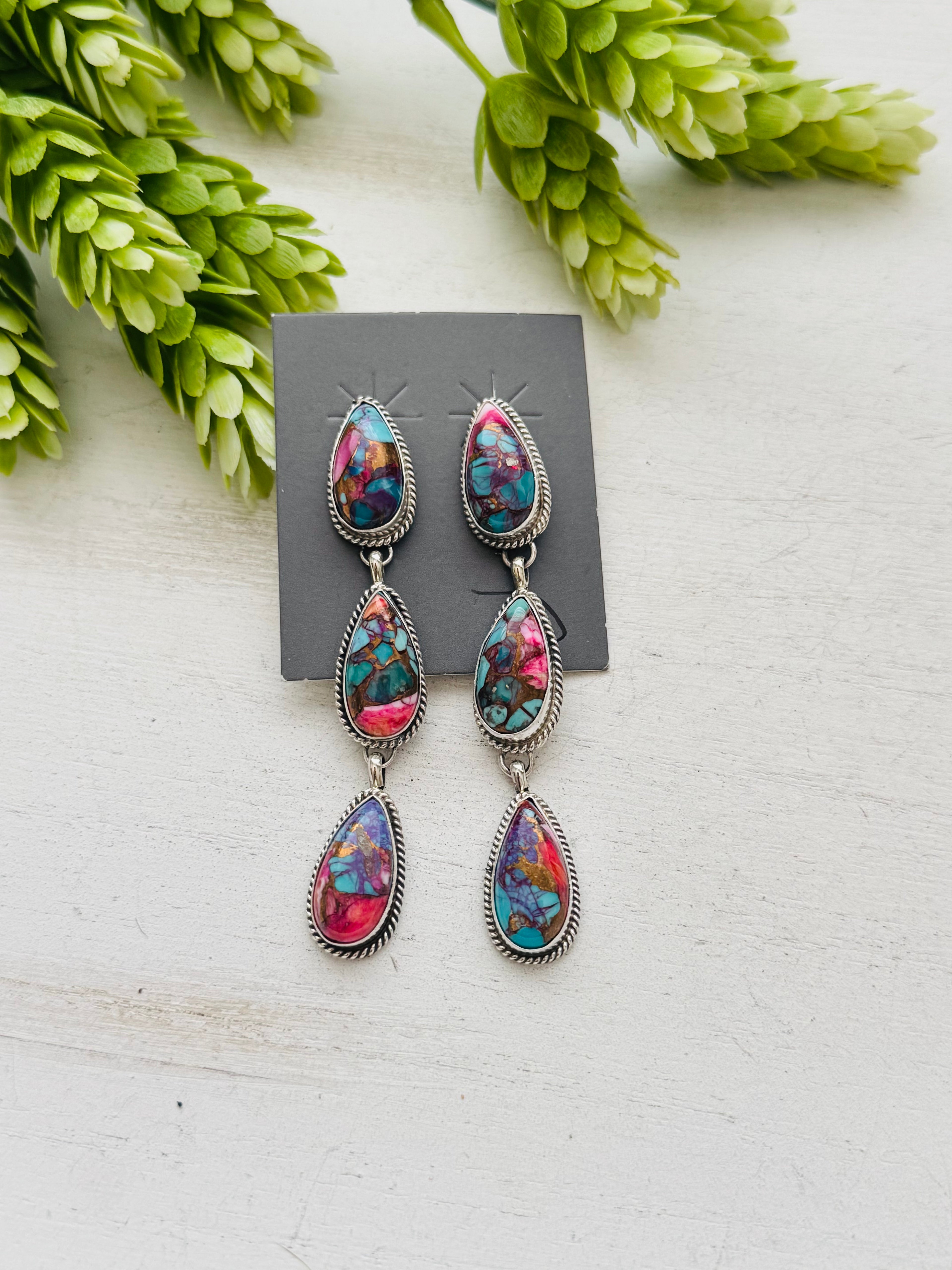 Navajo Made Purple Mohave Turquoise & Sterling Silver Post Earrings. They measure 3 inches long and just under 1/2 of an inch wide. Signed by the artist and stamped sterling silver.