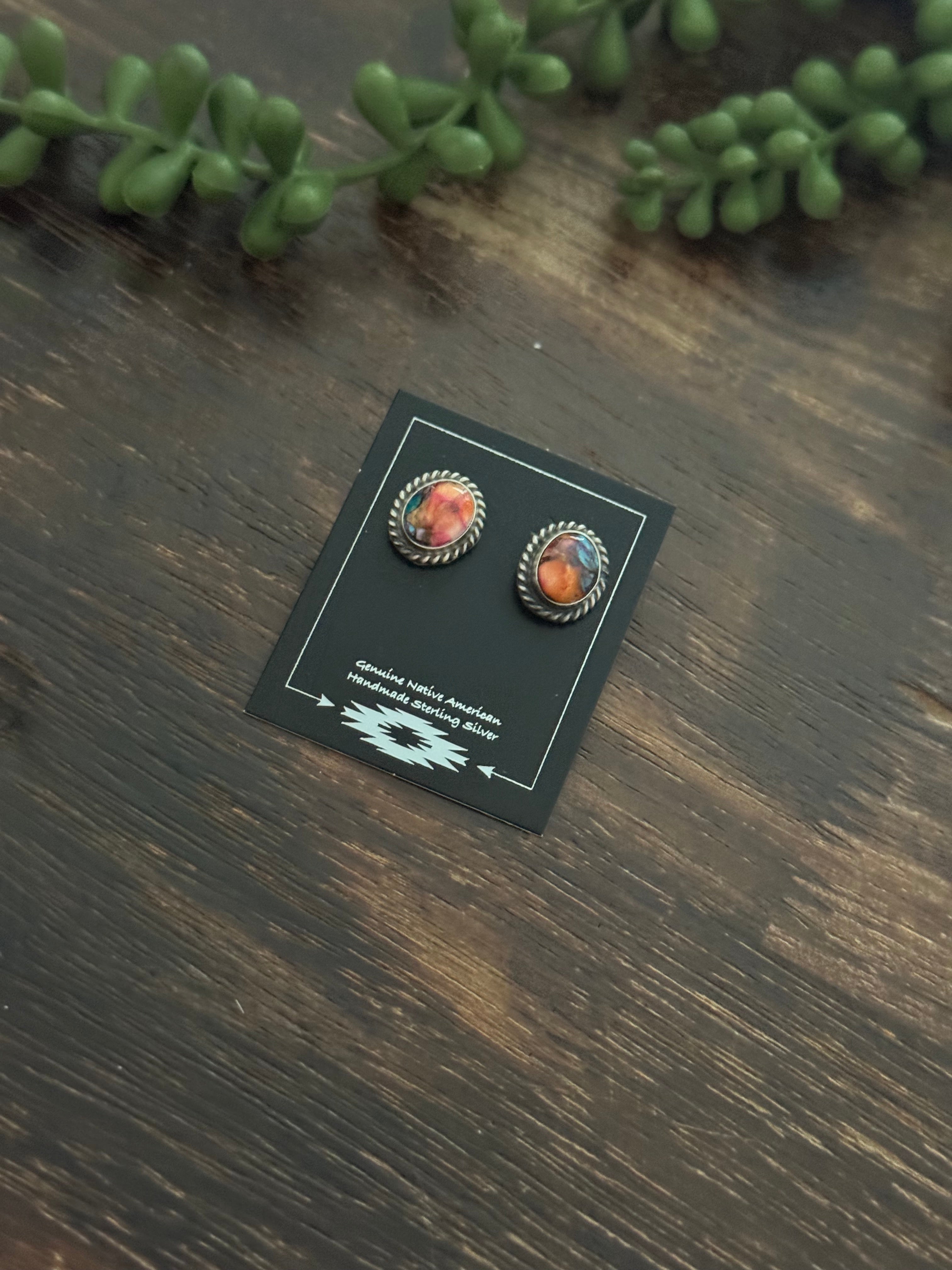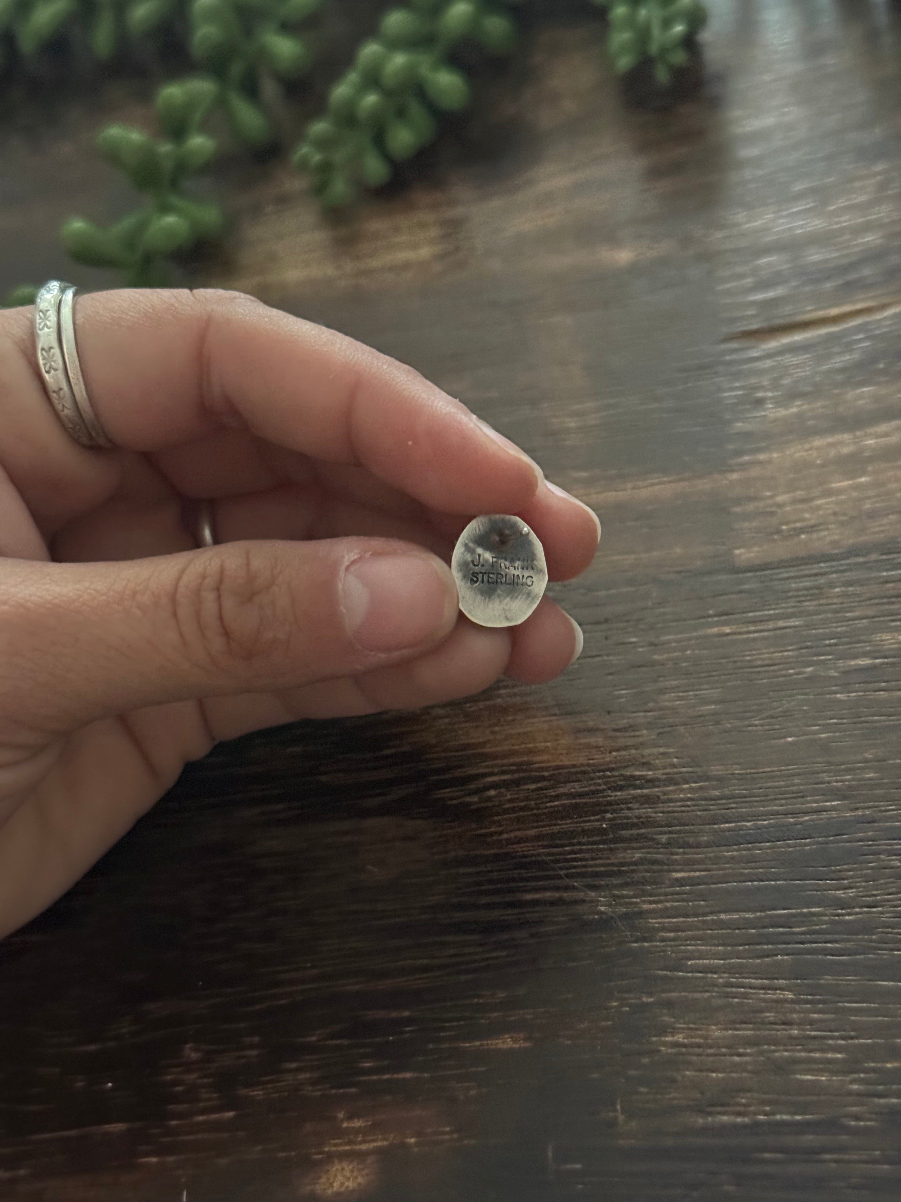 Navajo Made Pink Mohave Turquoise & Sterling Silver Post Earrings. They measure 1/2 of an inch long and just under it 1/2 of an inch wide. Signed by the artist and stamped sterling silver.