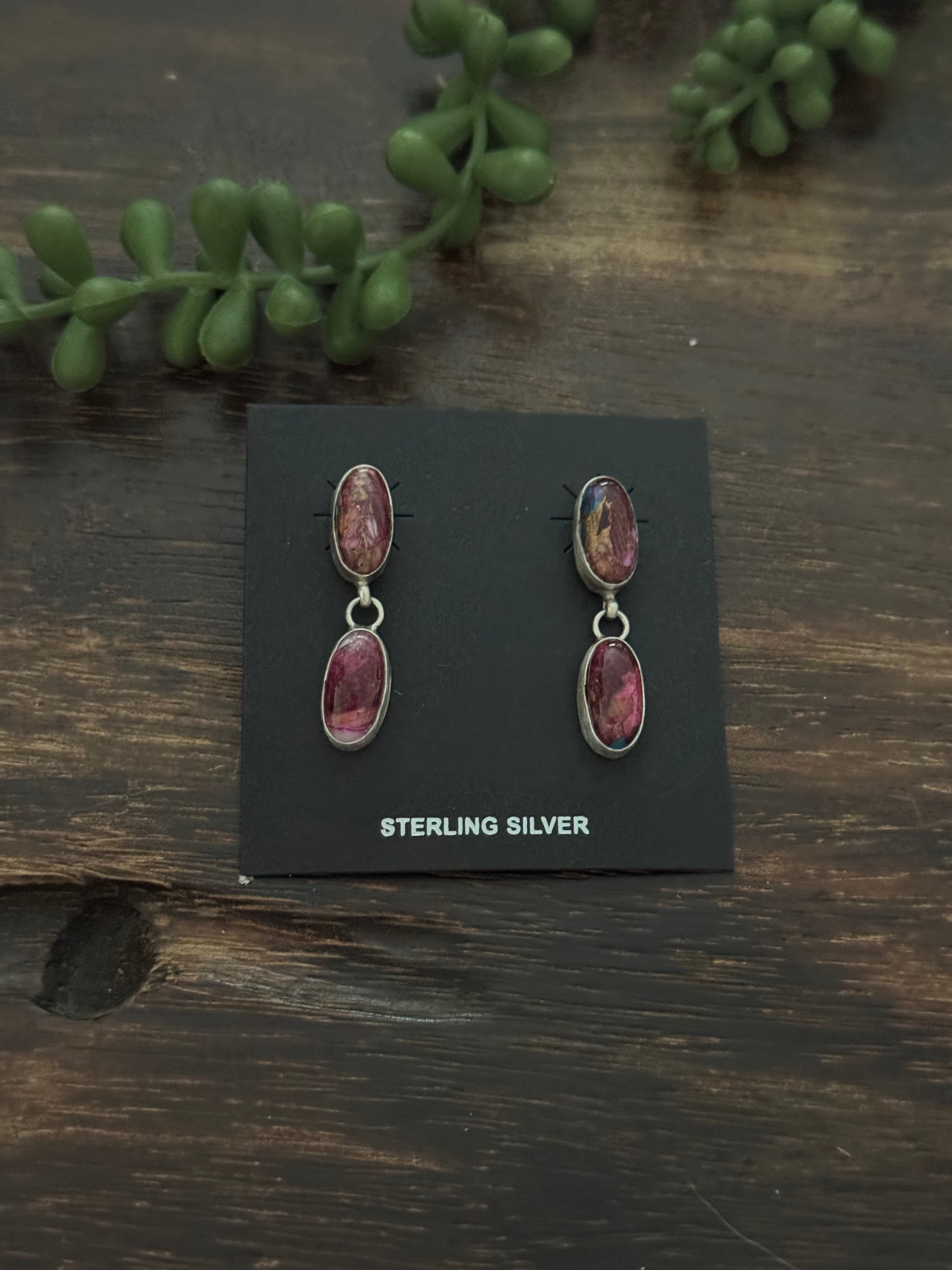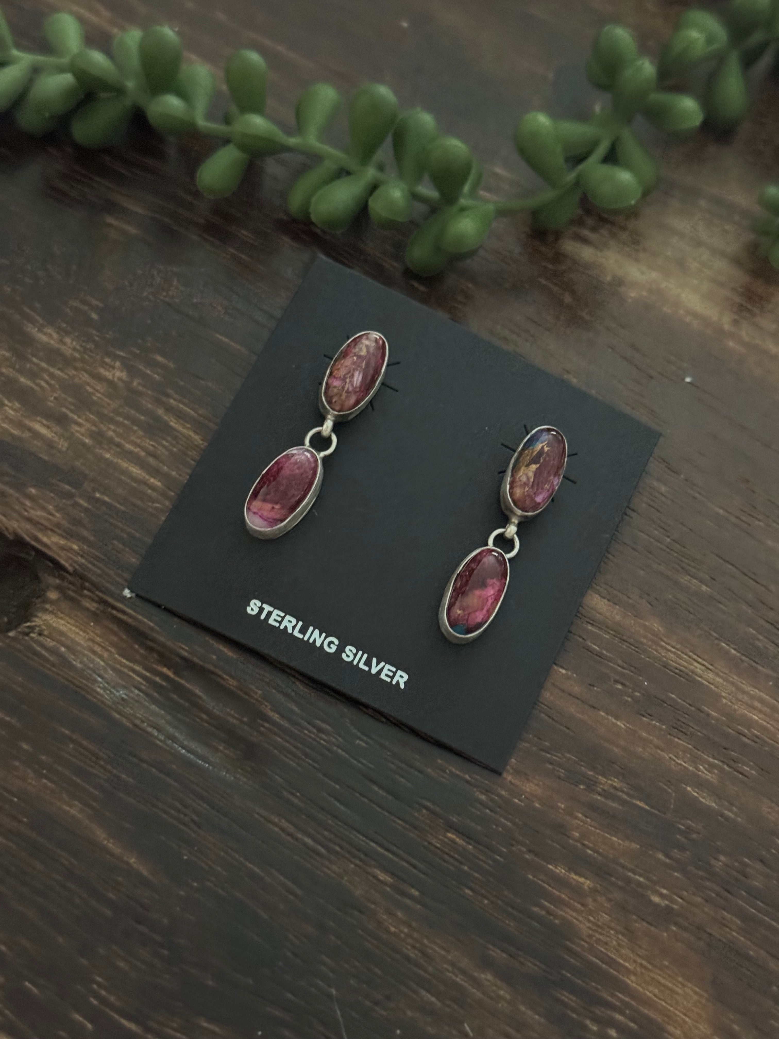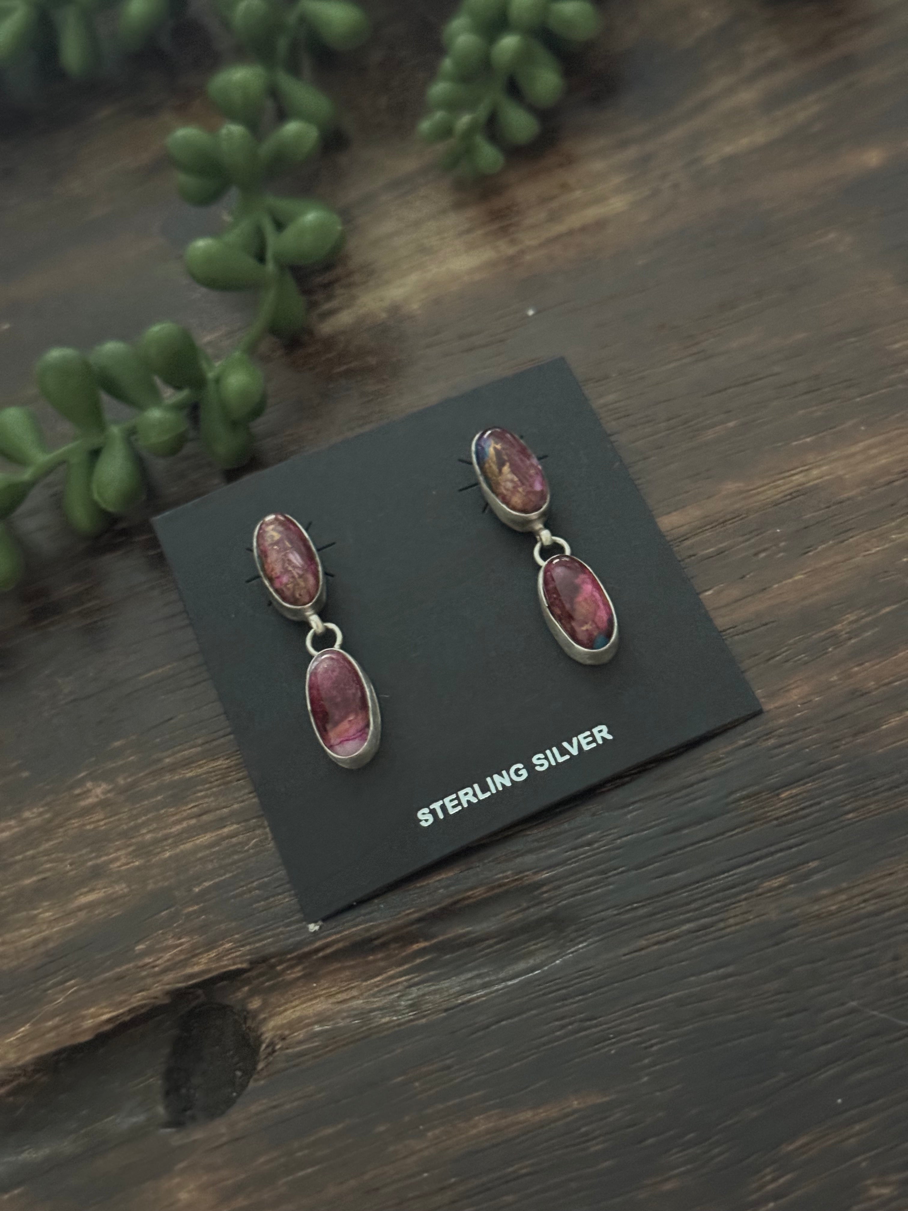 Navajo Made Purple Mohave Turquoise & Sterling Silver Post Dangle Earrings. They measure 1 3/8 inches long and just under it 3/8 of an inch wide. Signed by the artist and stamped sterling silver.