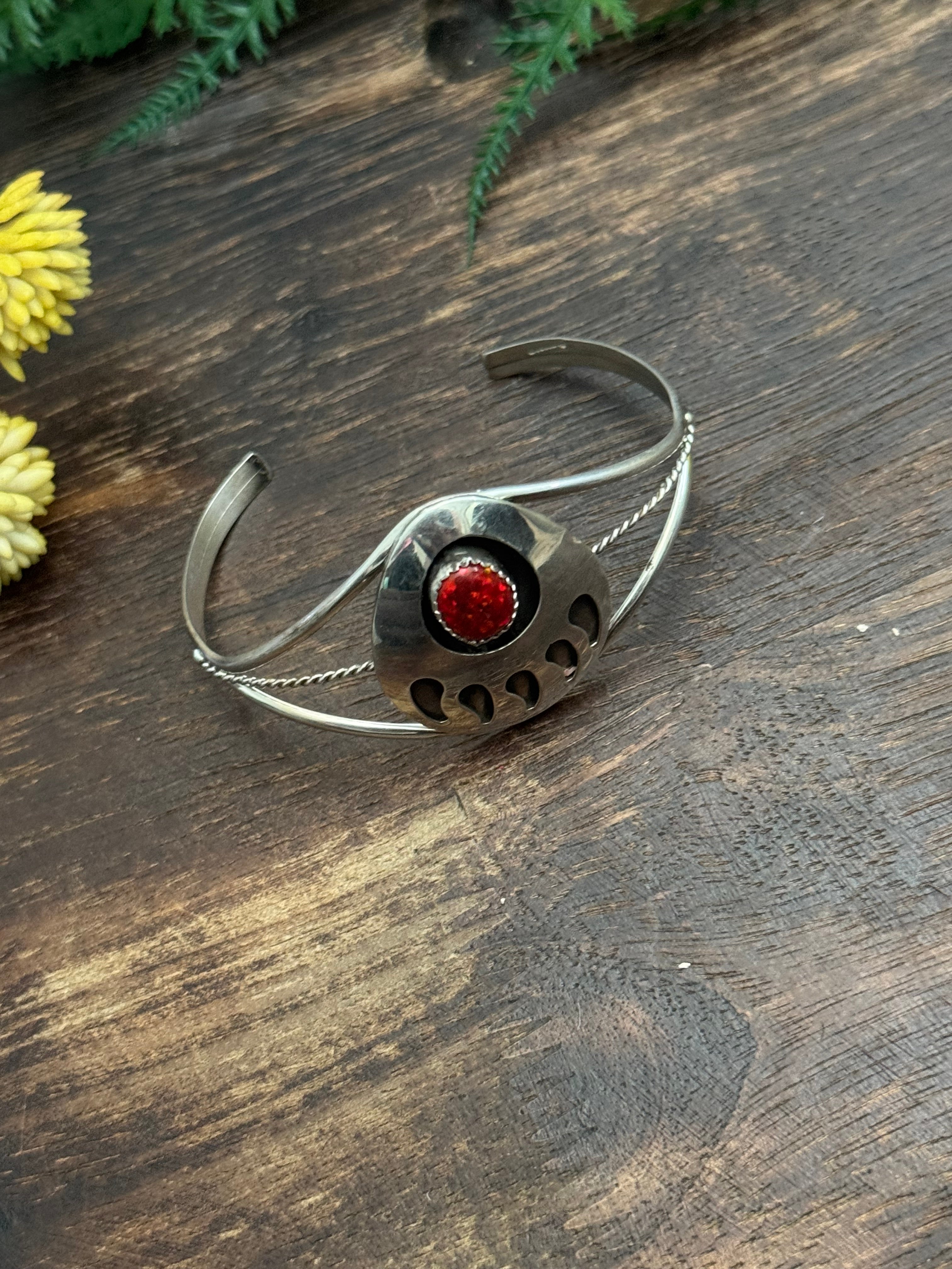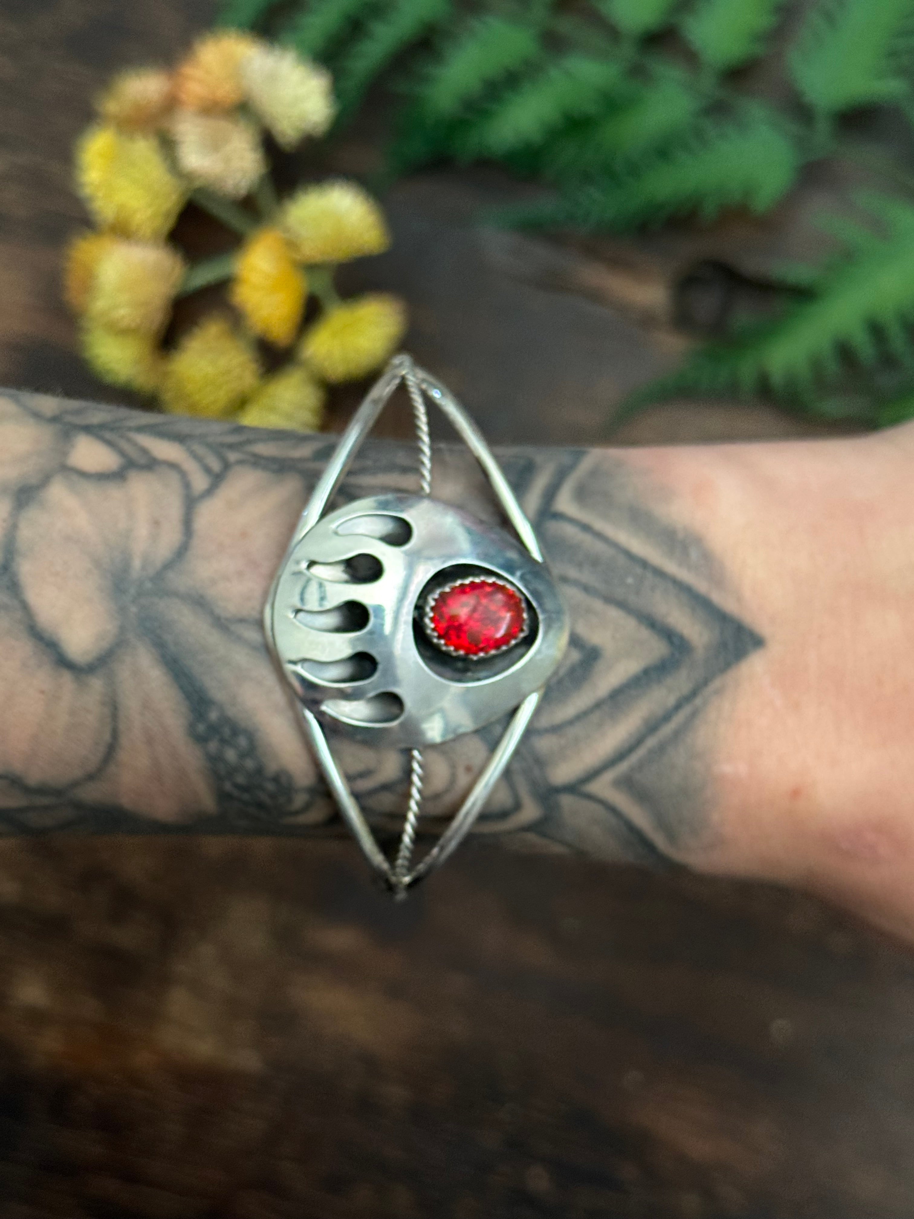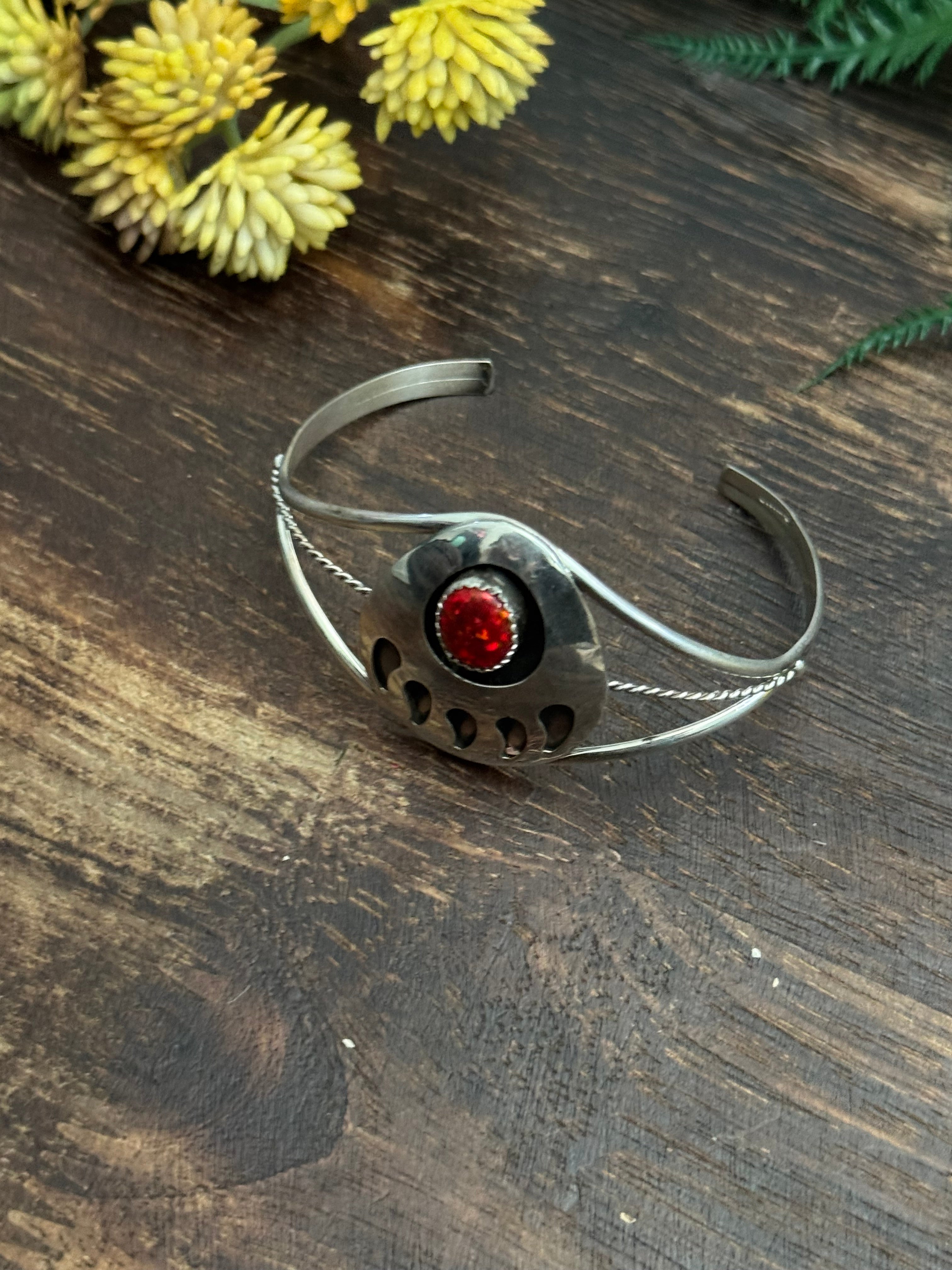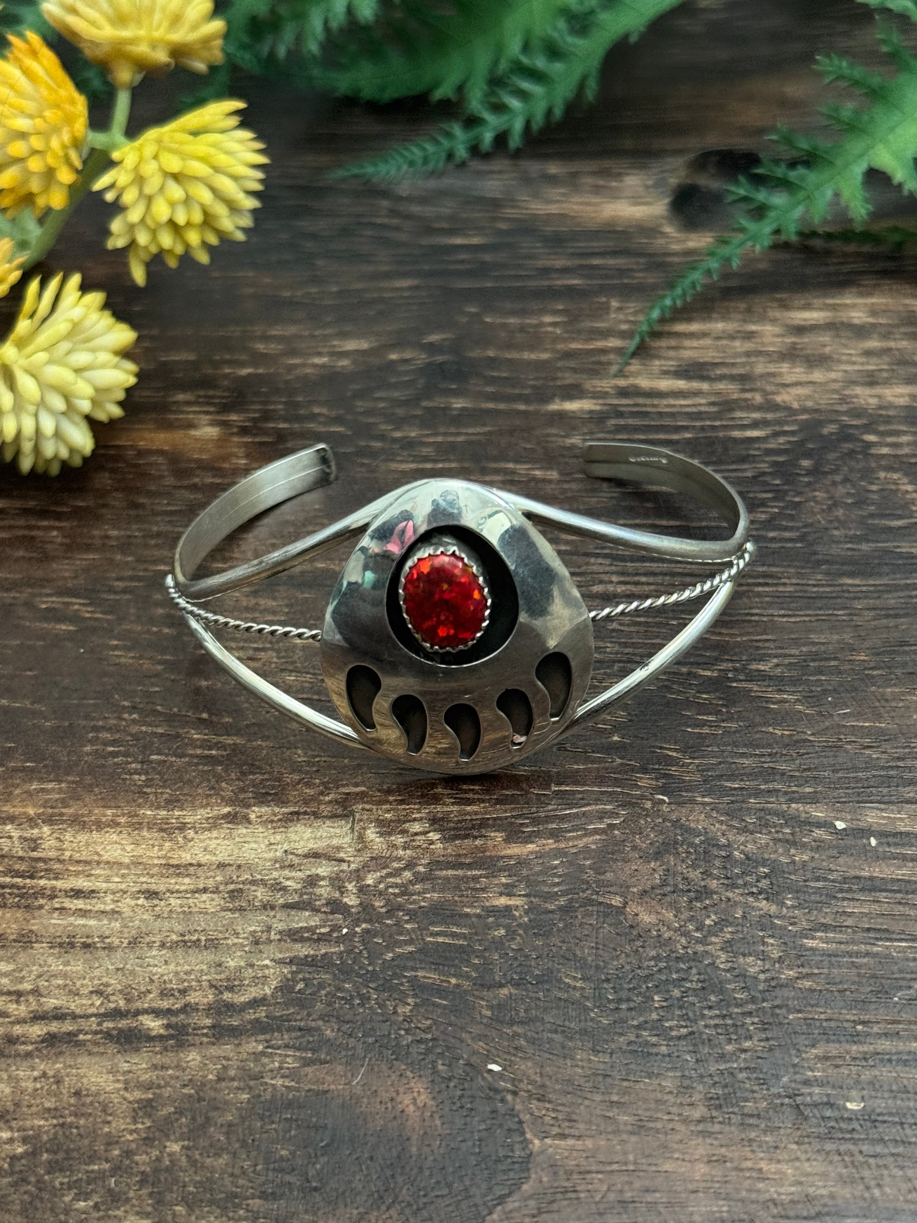 Navajo Made Red Opal (Man Made) Sterling Silver Bear Claw Cuff Bracelet