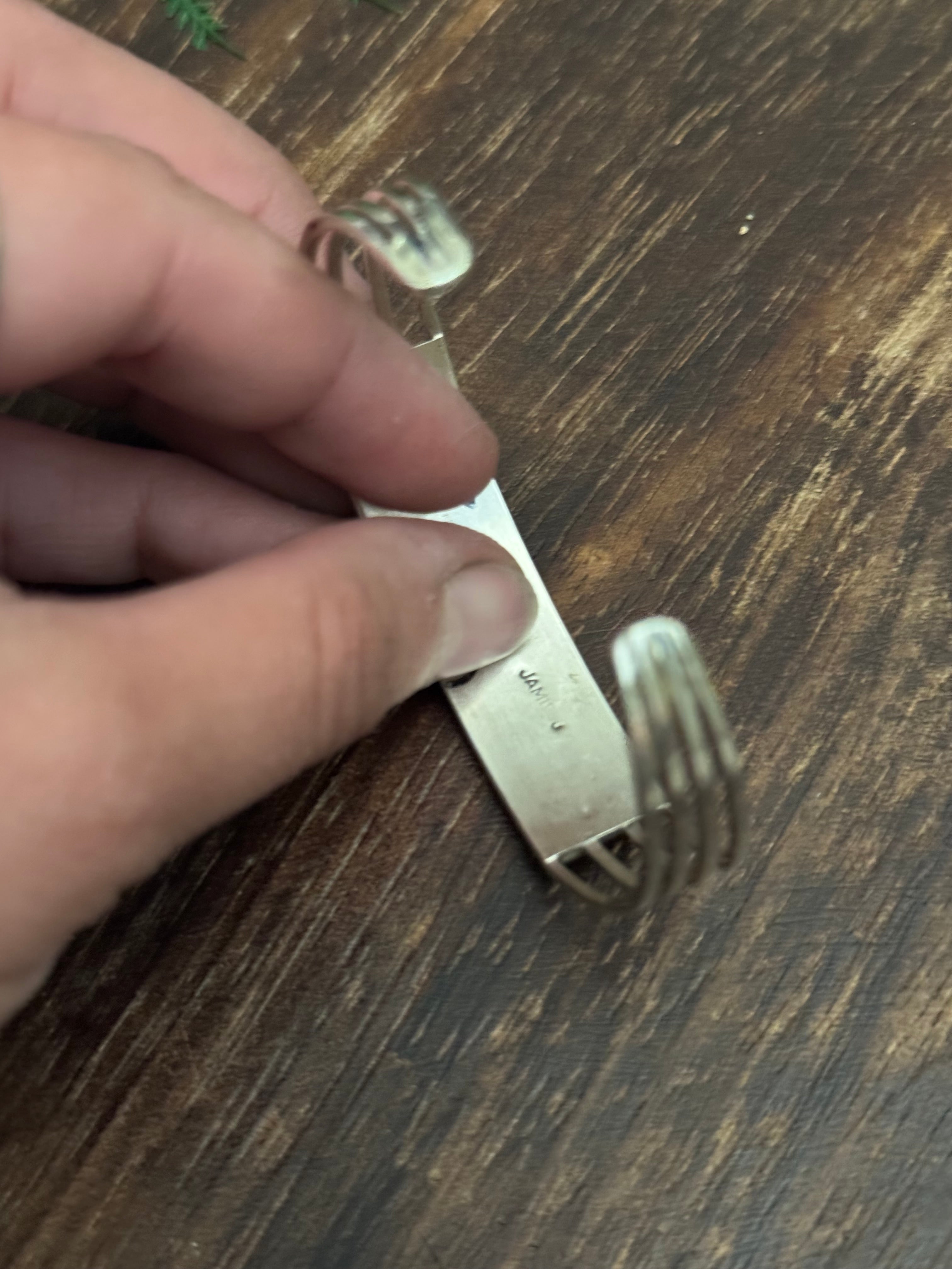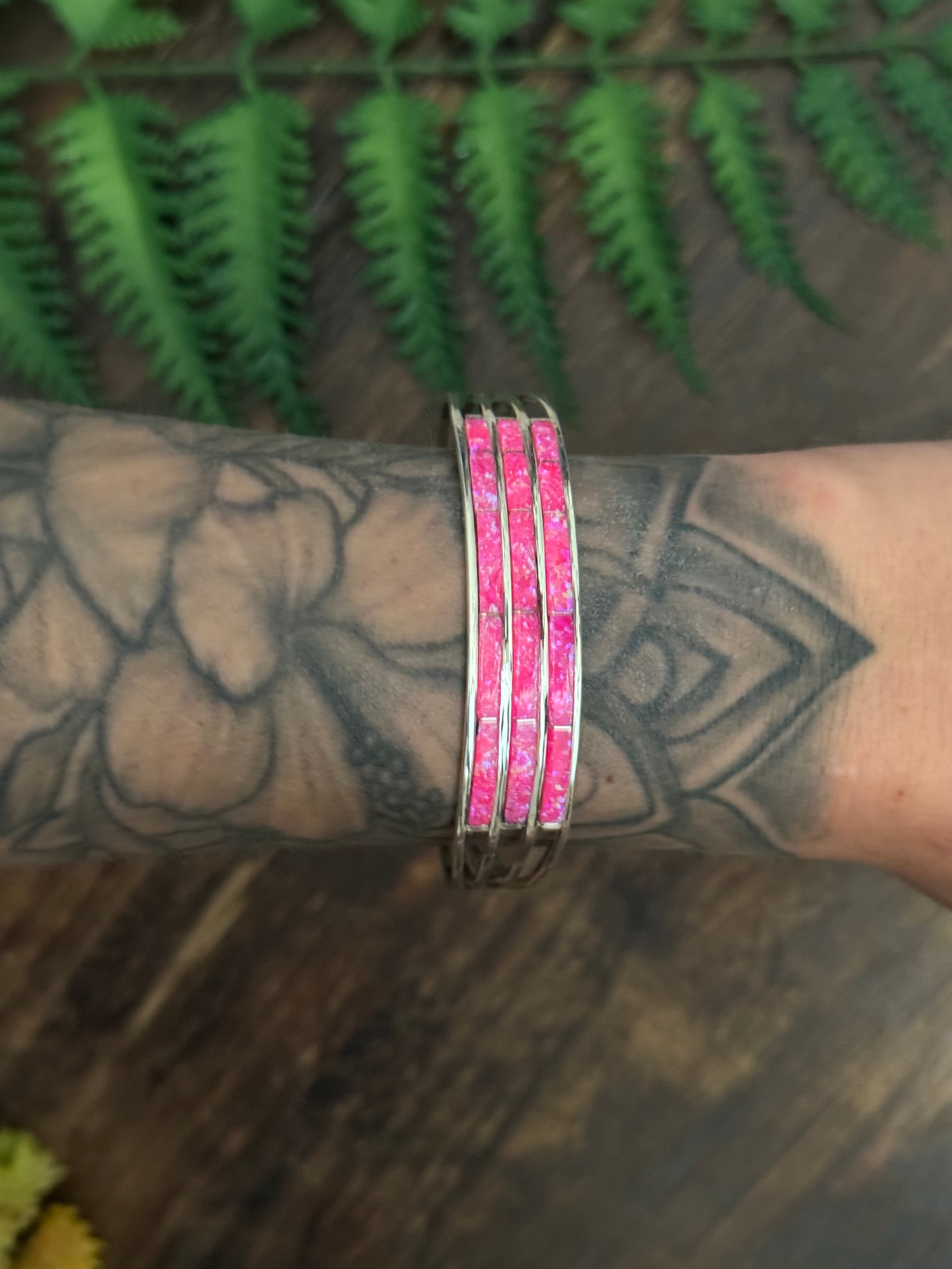 Navajo Made Pink Opal (Man-Made) & Sterling Silver Cuff Bracelet. It measures 1/2 of an inch wide with an inside circumference of 5 1/4 inches and a gap of 1 1/8 inches. Signed by the artist and stamped sterling silver.