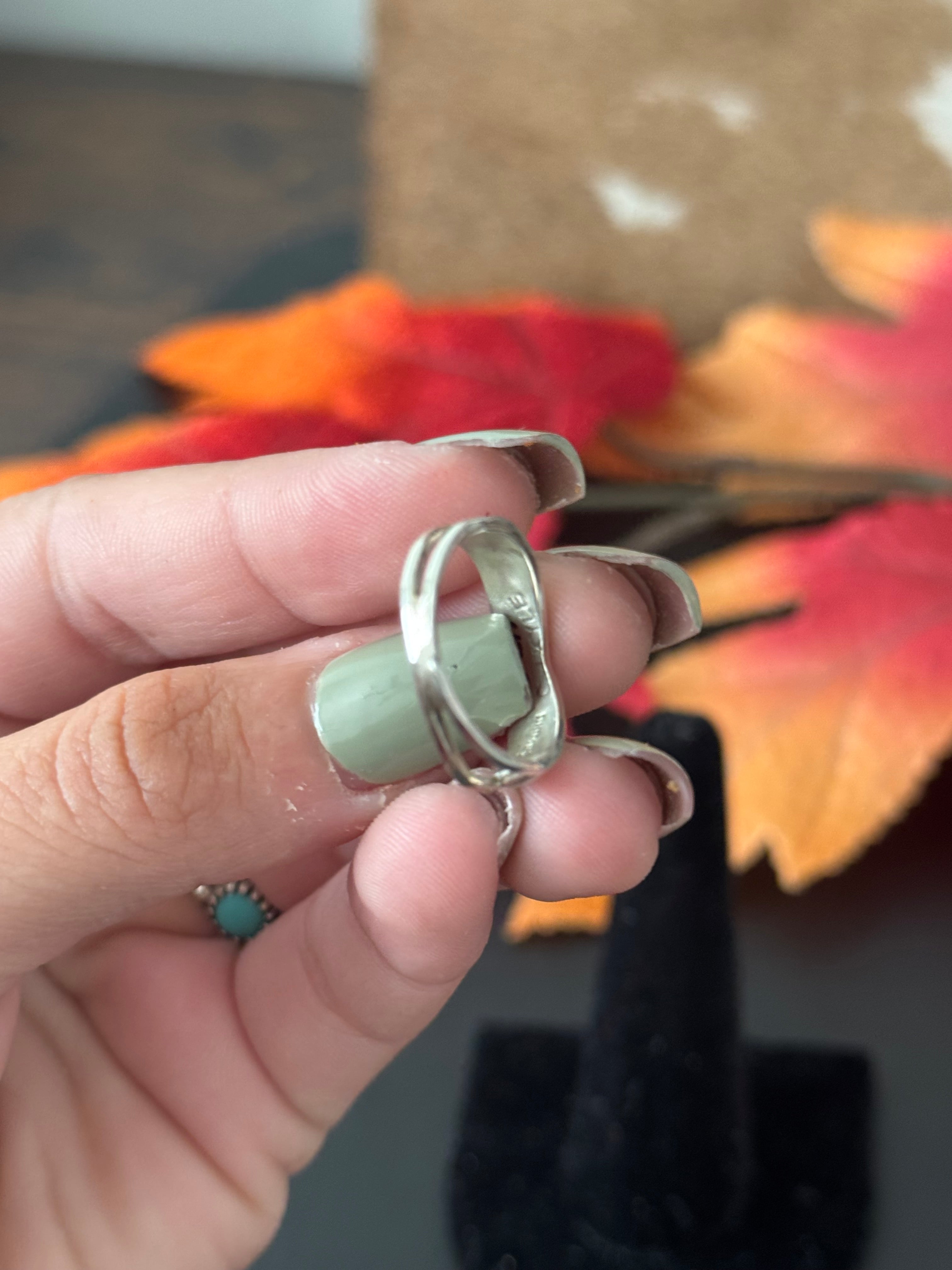 Navajo Made Pink (Man-Made) & Sterling Silver Ring. It measures just under 1/4 of an inch long. Signed by the artist and stamped sterling silver.