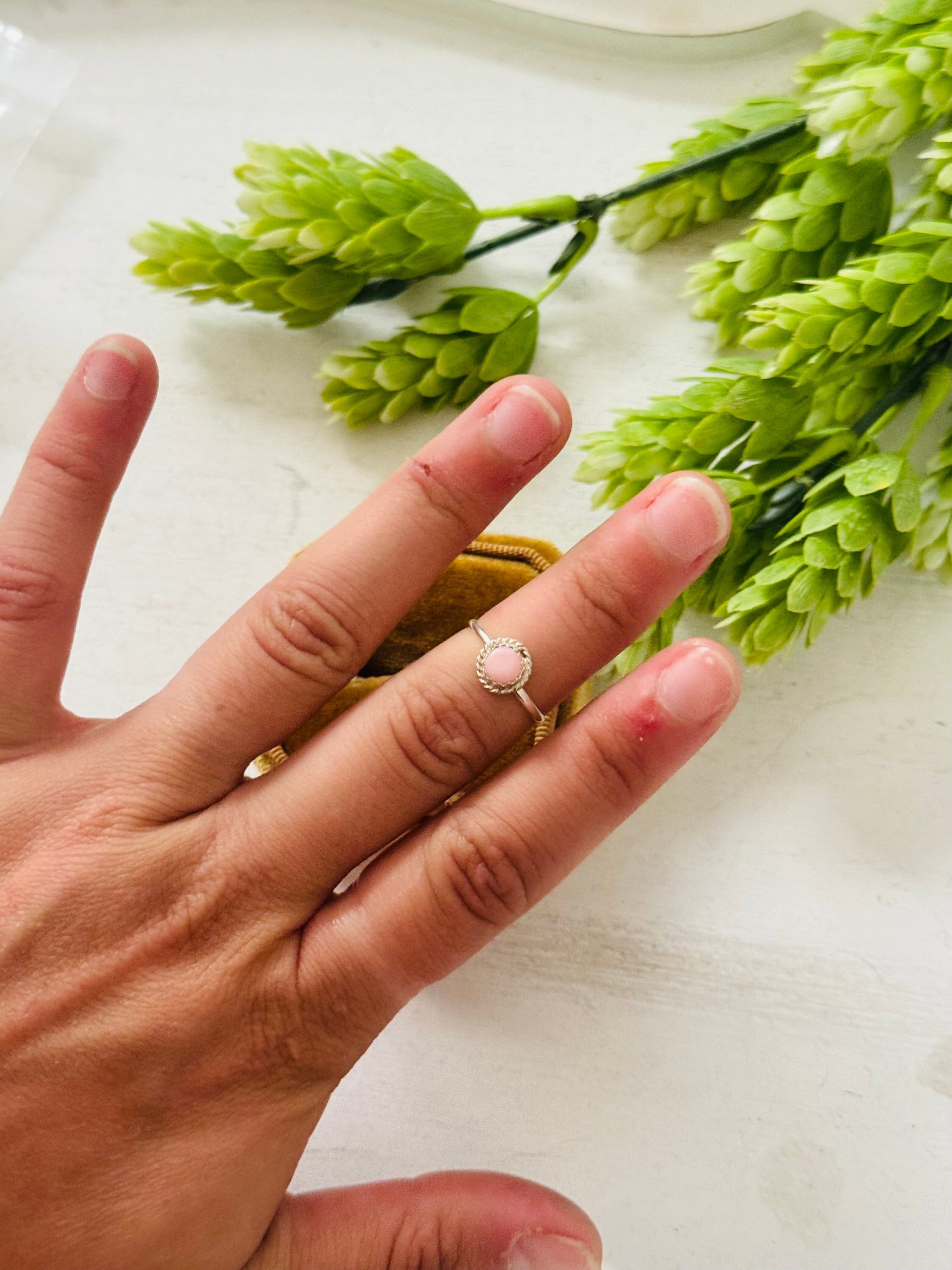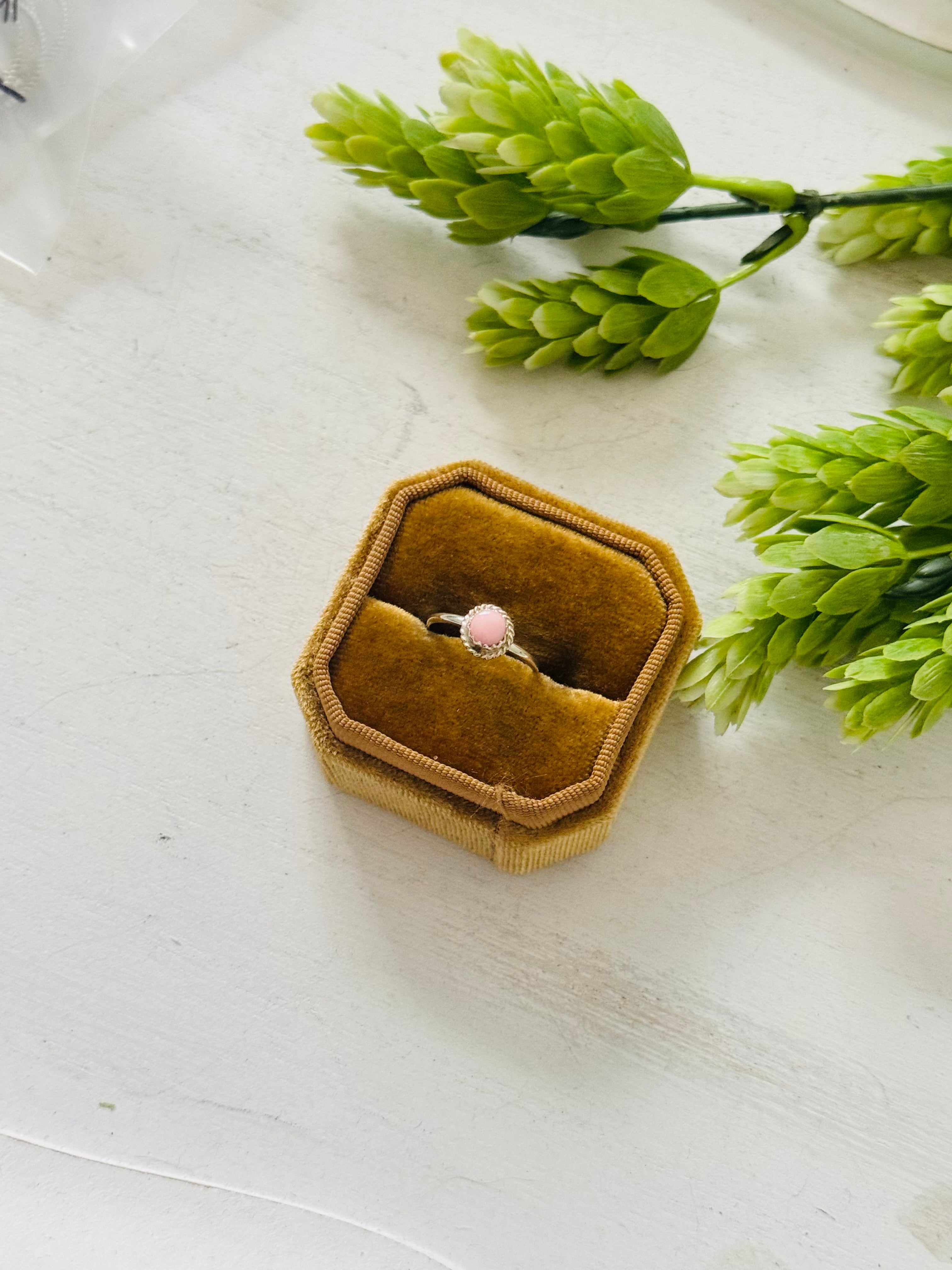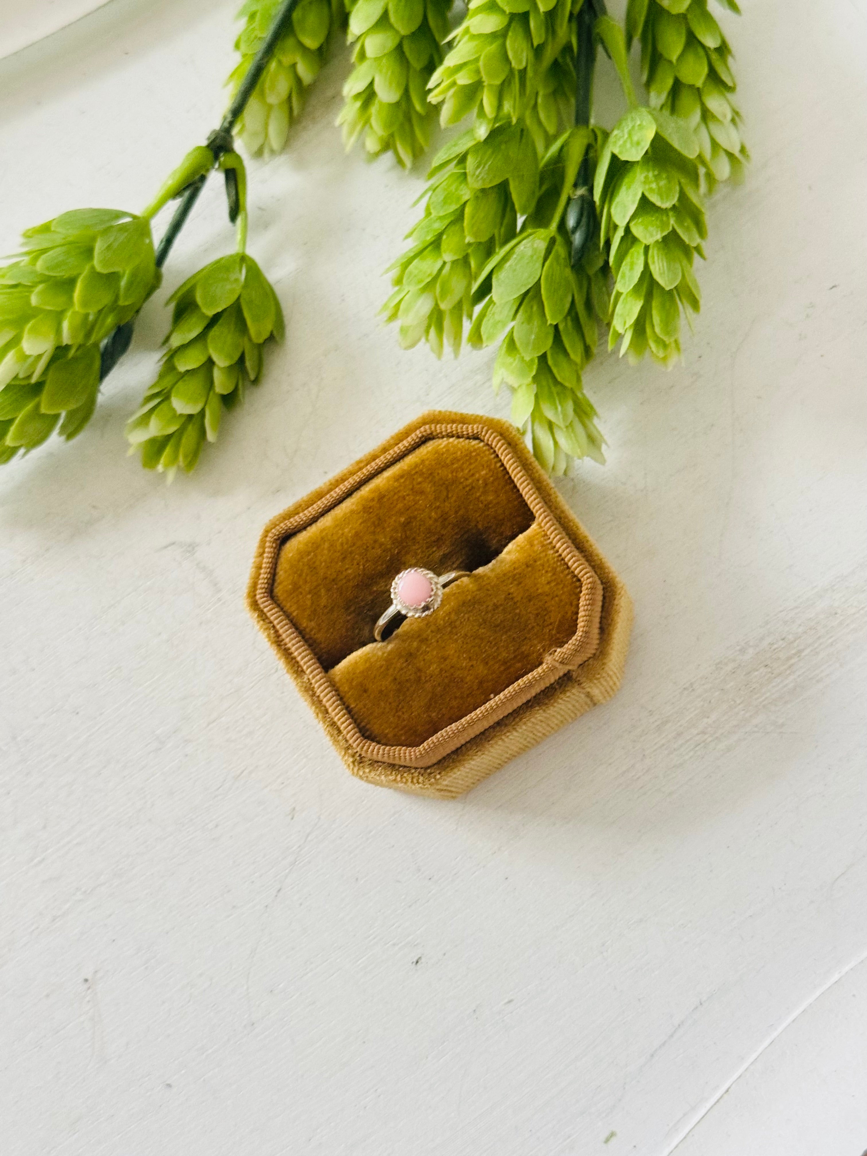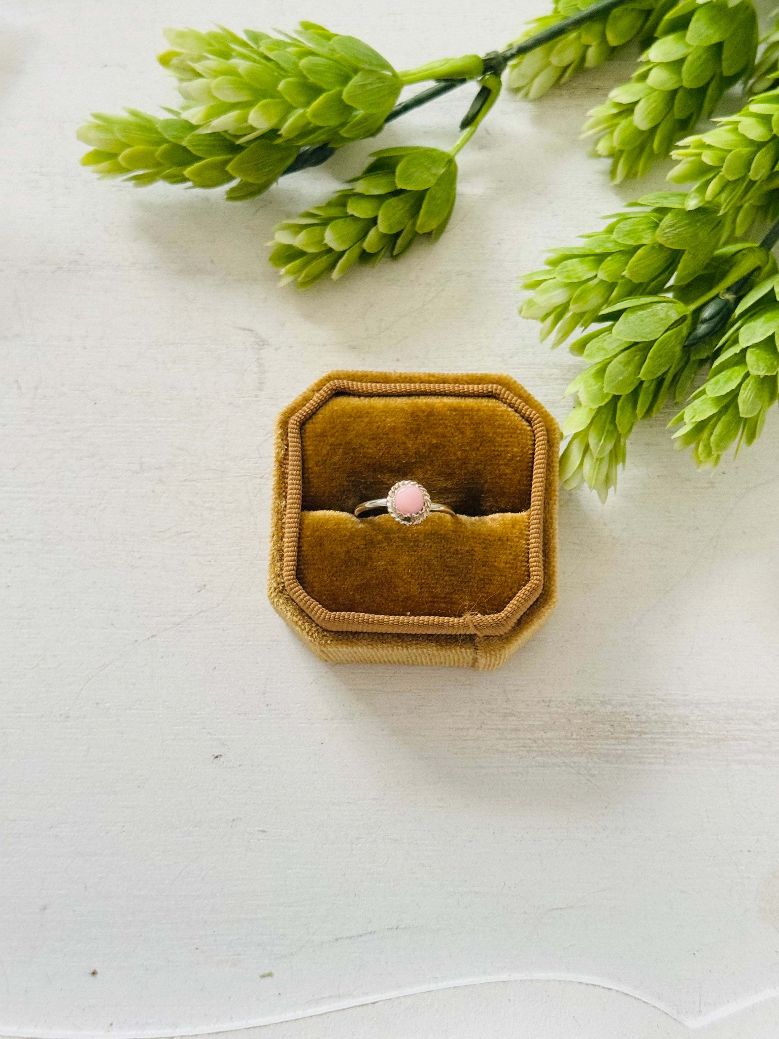 Navajo Made Pink Conch & Sterling Silver Ring. It measures 1/4 of an inch round. Stamped sterling silver.