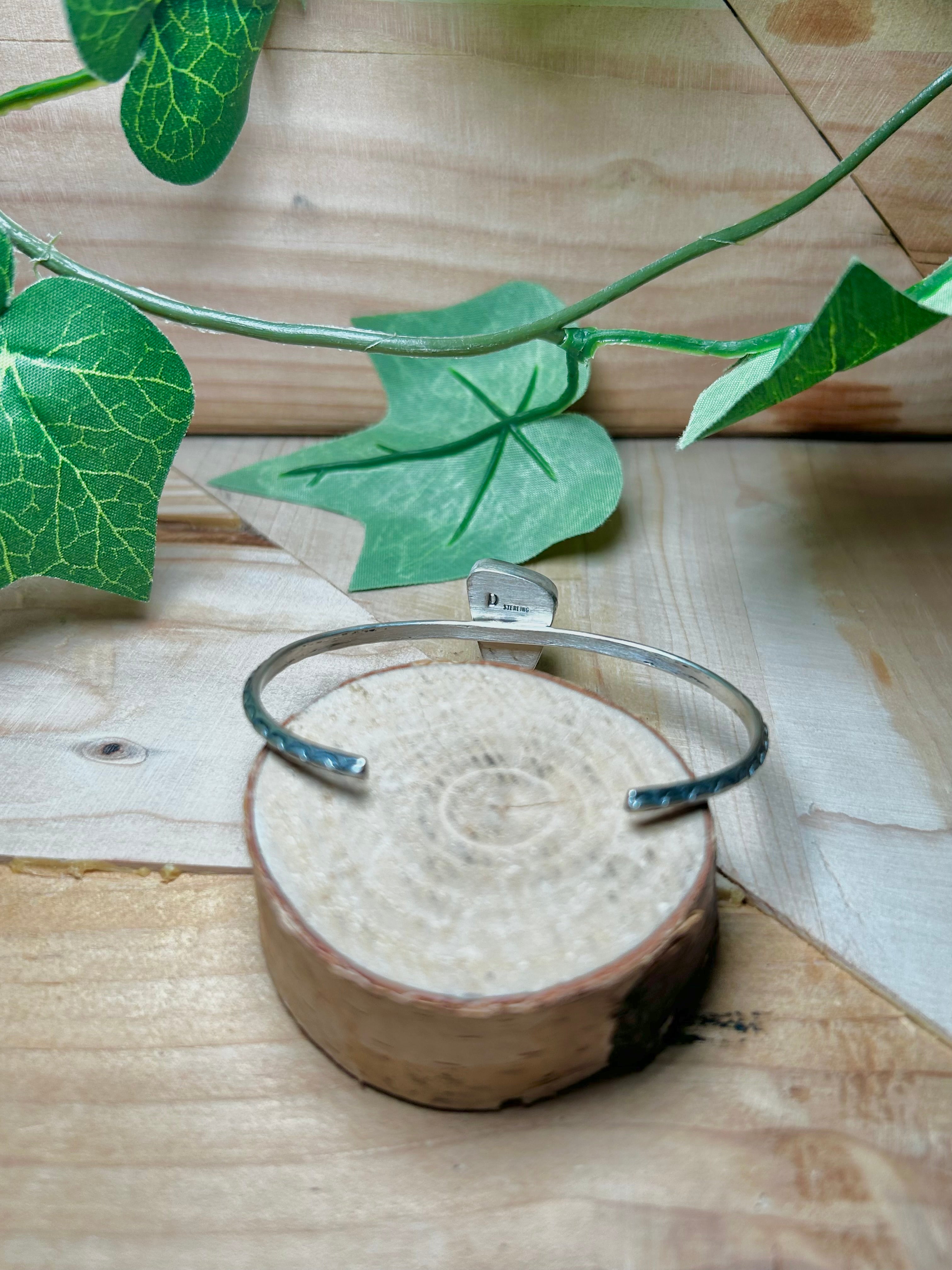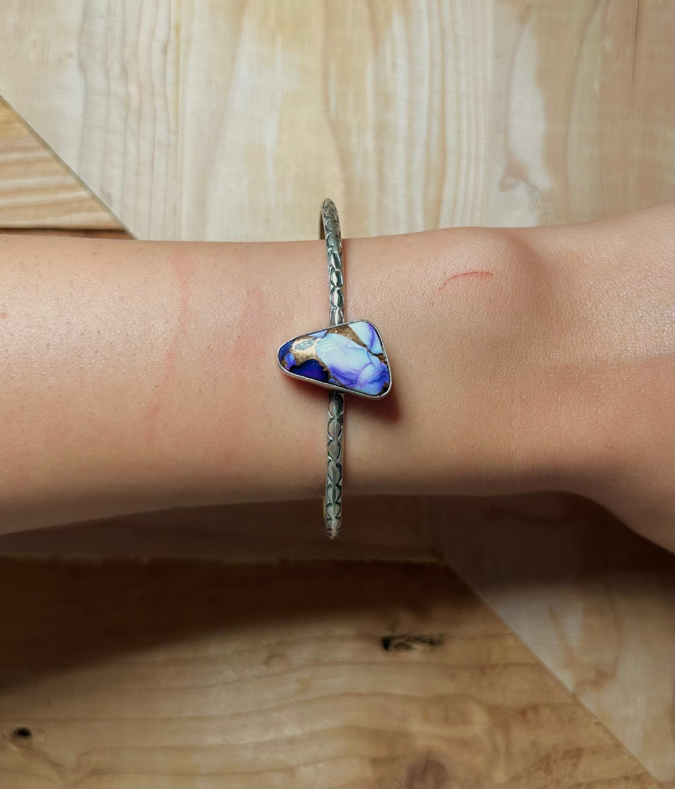 Navajo Made Purple Mohave Turquoise & Sterling Silver Cuff Bracelet. It measures 1/2 of an inch wide with an inside circumference of 5 3/8 inches and a gap of 1 1/2 inch. Signed by the artist and stamped sterling silver.