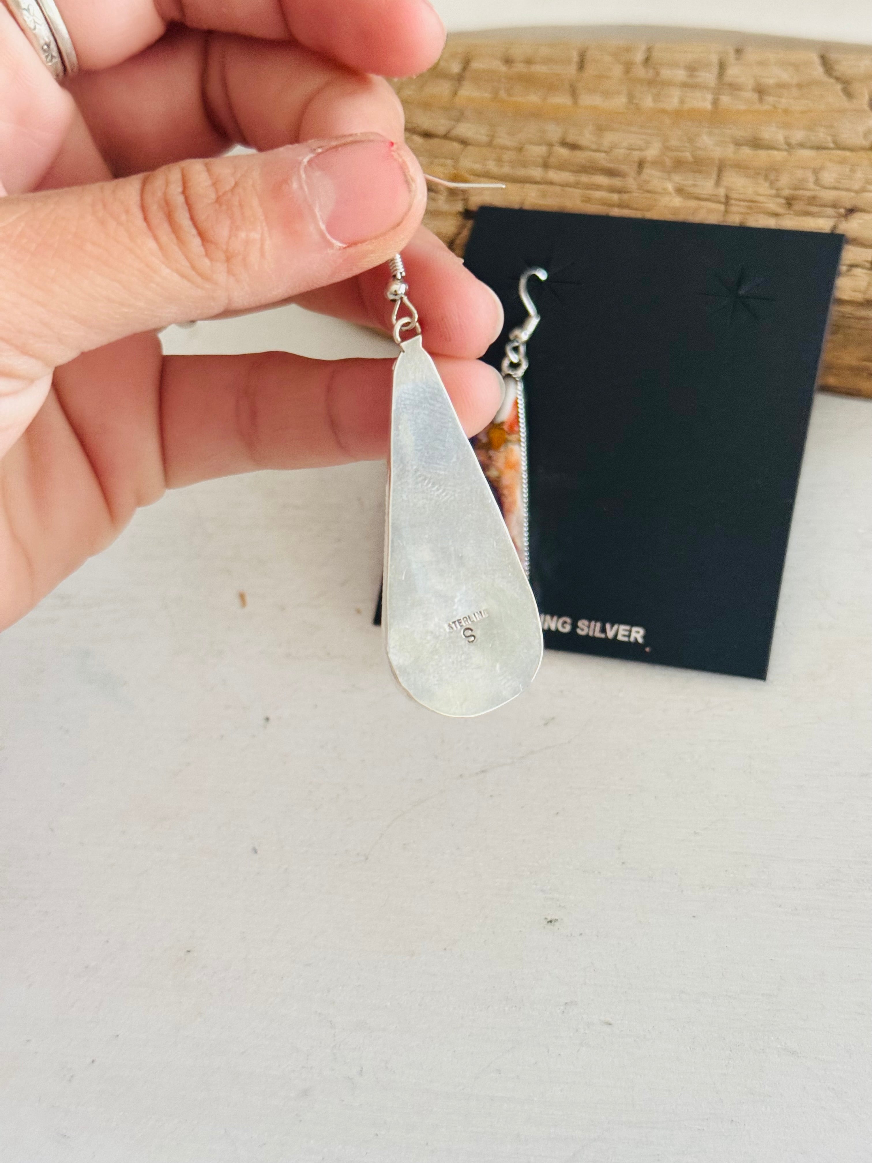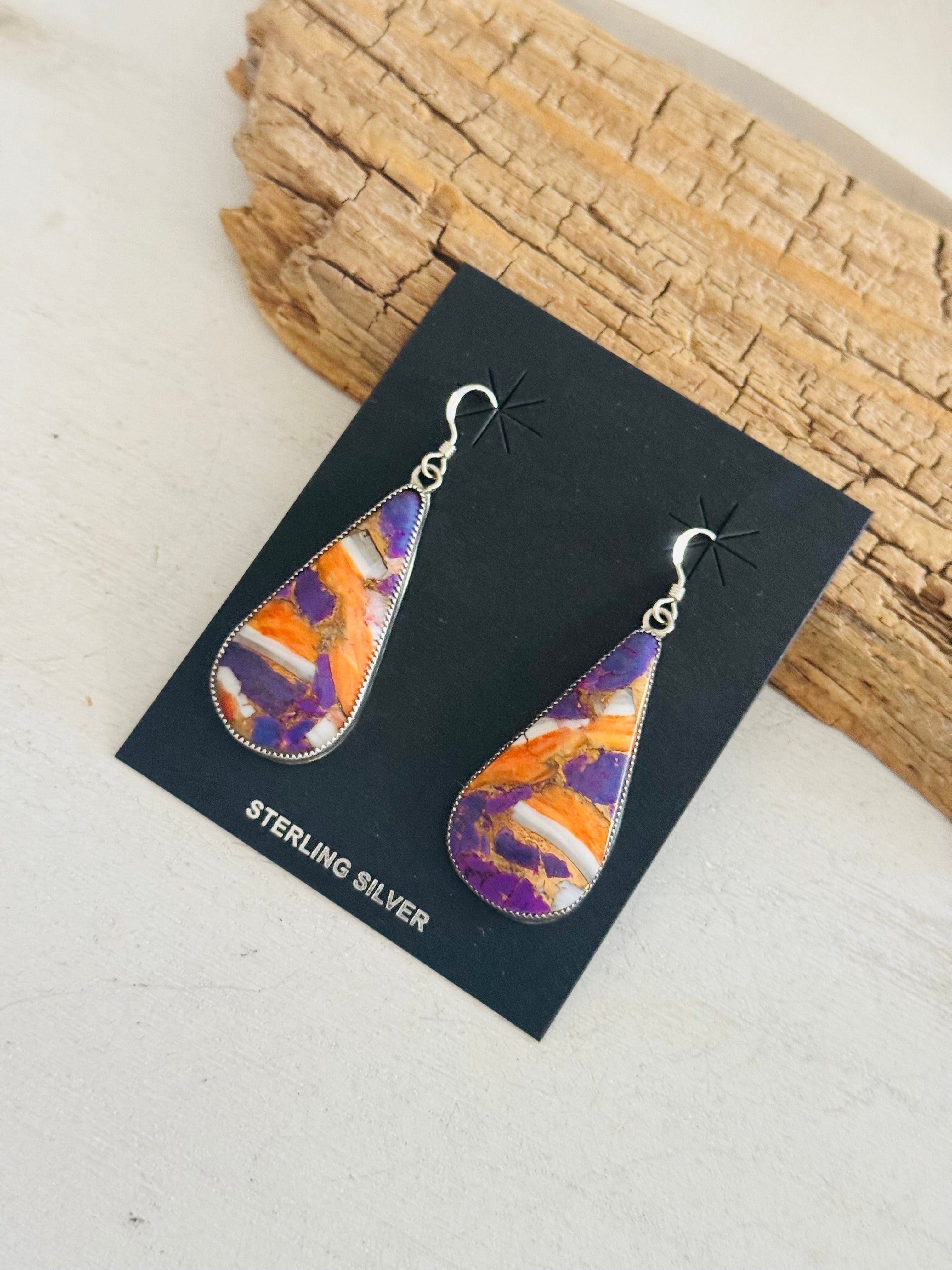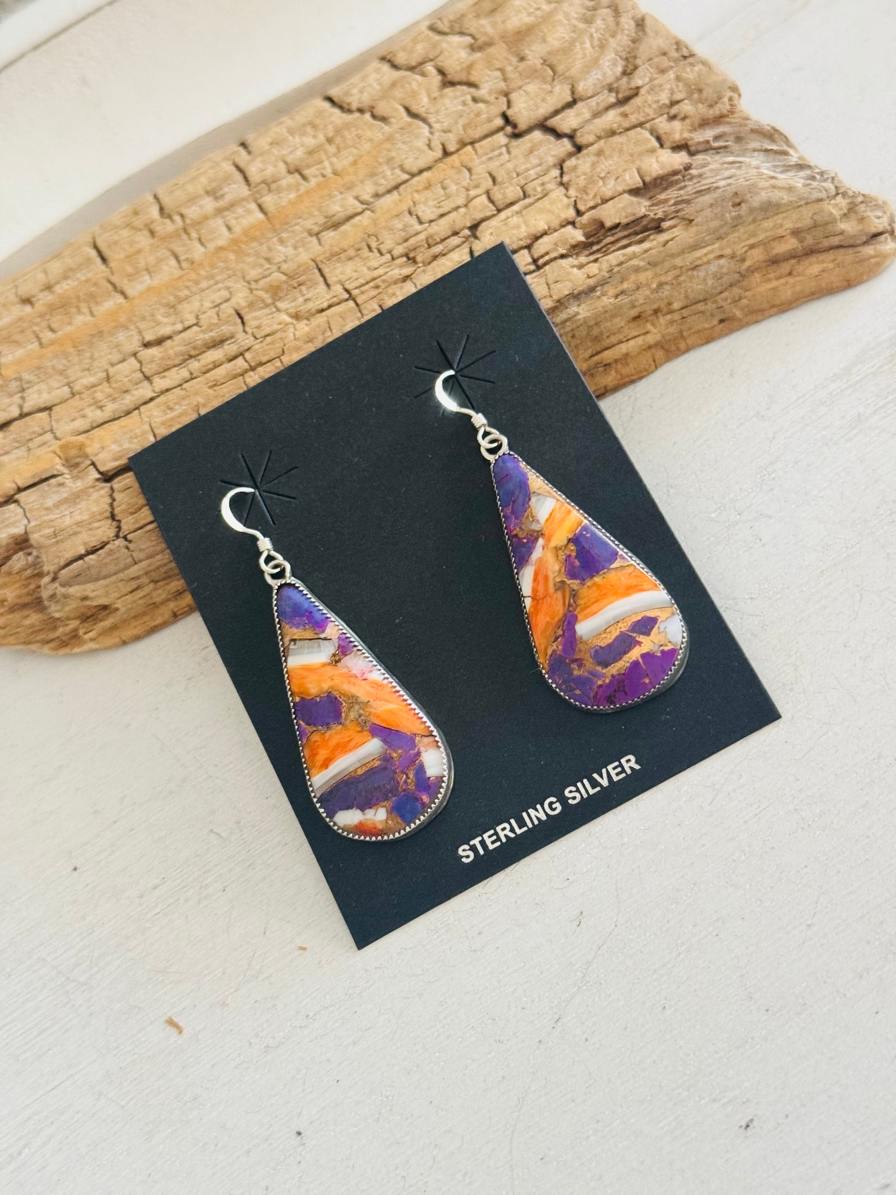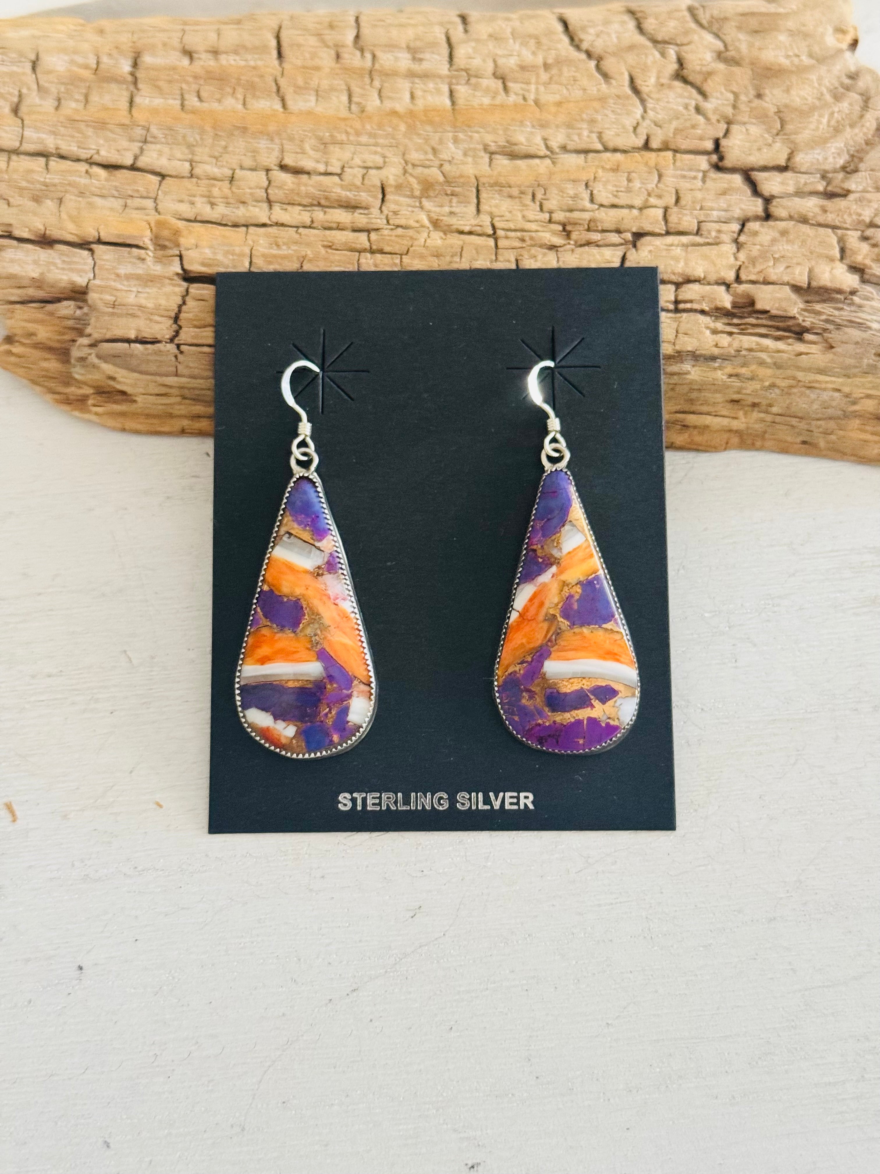 Navajo Made Purple Mohave Turquoise & Sterling Silver Dangle Earrings. They measure 2 1/8 inches long and 3/4 of an inch wide. Signed by the artist and stamped sterling silver.